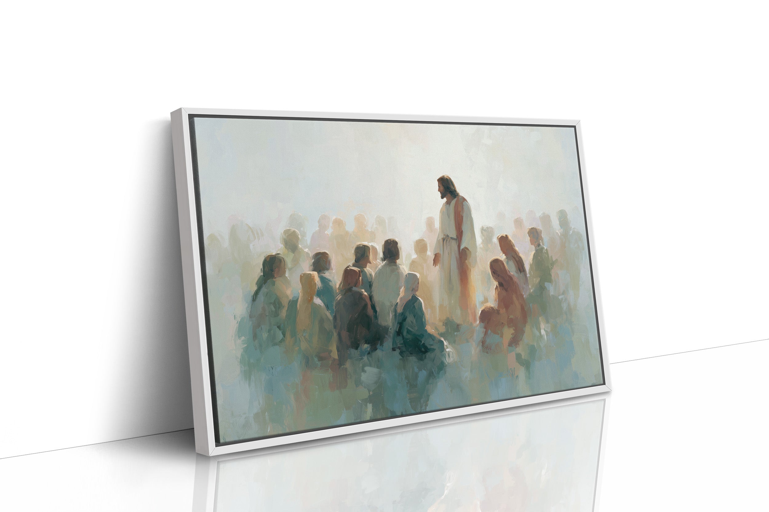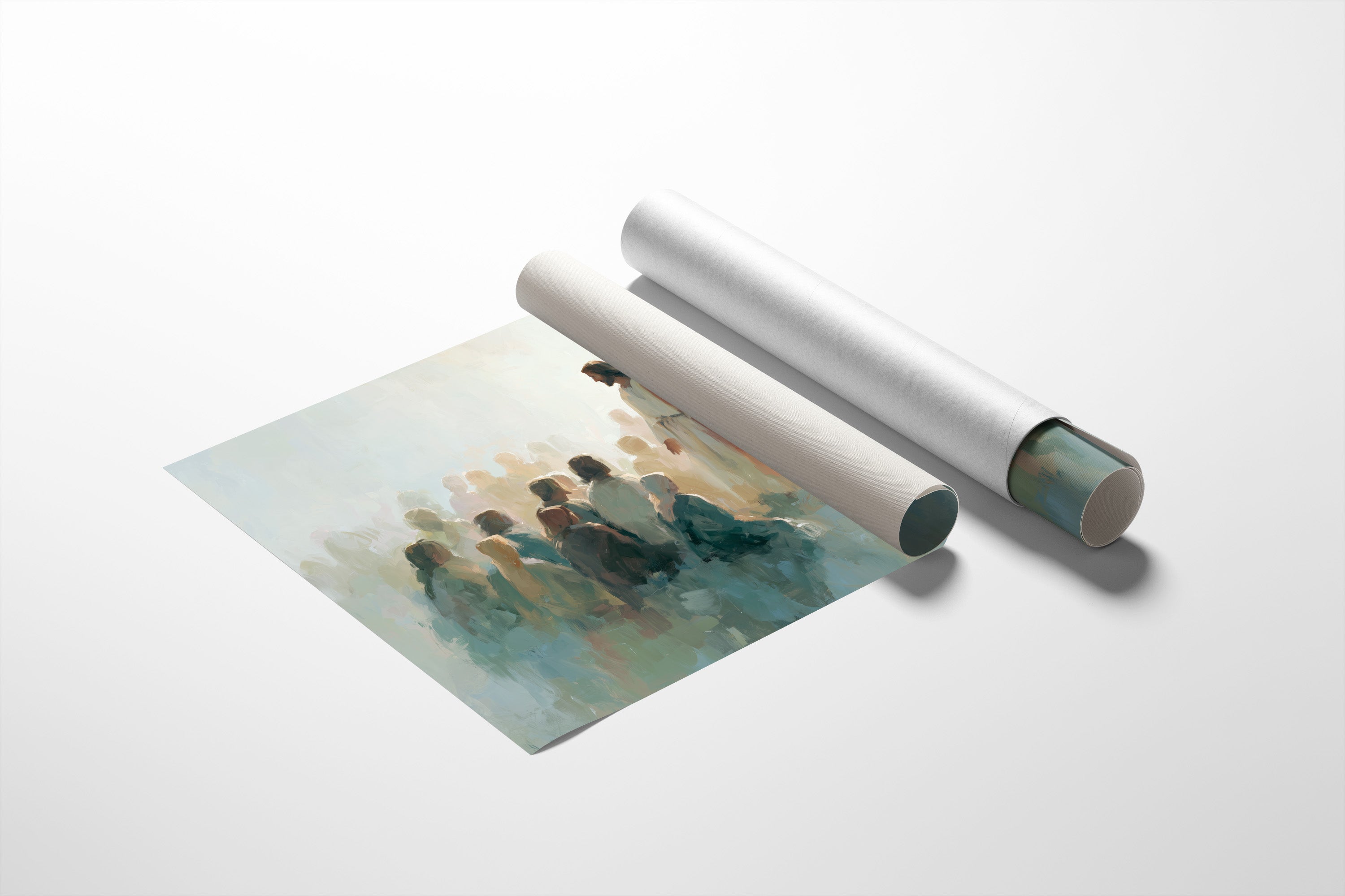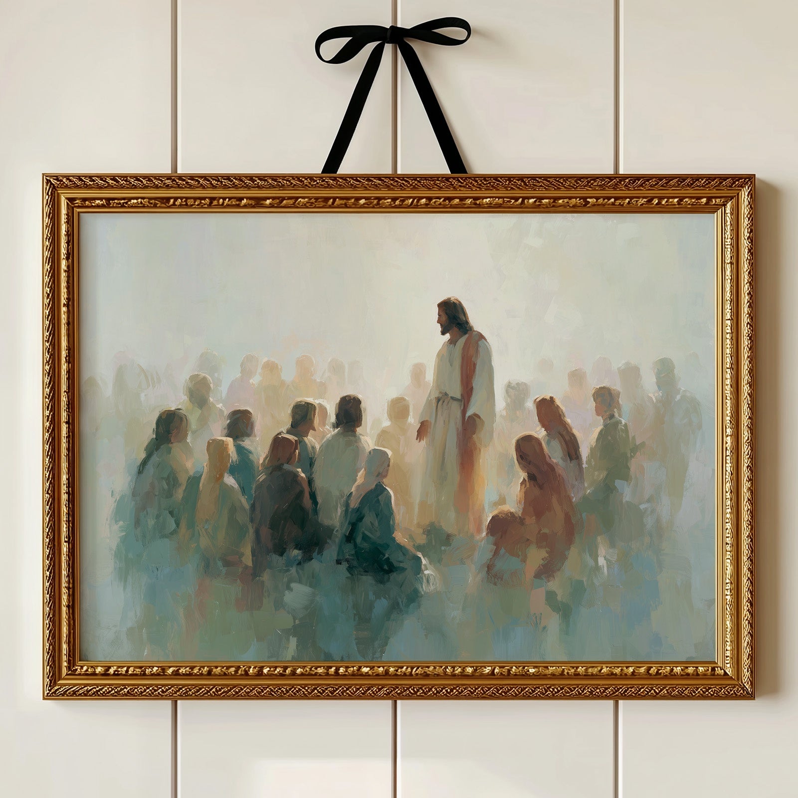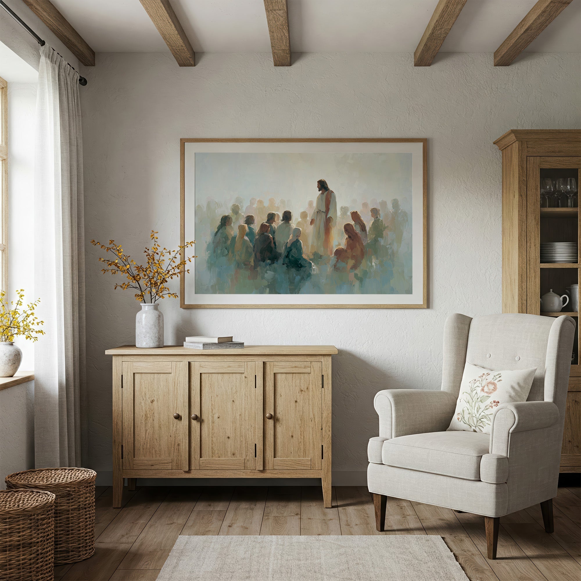 A gentle haze surrounds the central figure as they stand before a gathered crowd, rendered in delicate watercolor washes of blue, cream, and soft coral. The ethereal quality of the brushwork creates an atmosphere of reverence and timelessness, with figures dissolving into mist at their edges. This contemplative piece brings warmth and spiritual depth to a home library or reading nook, creating a peaceful focal point amid collected wisdom.