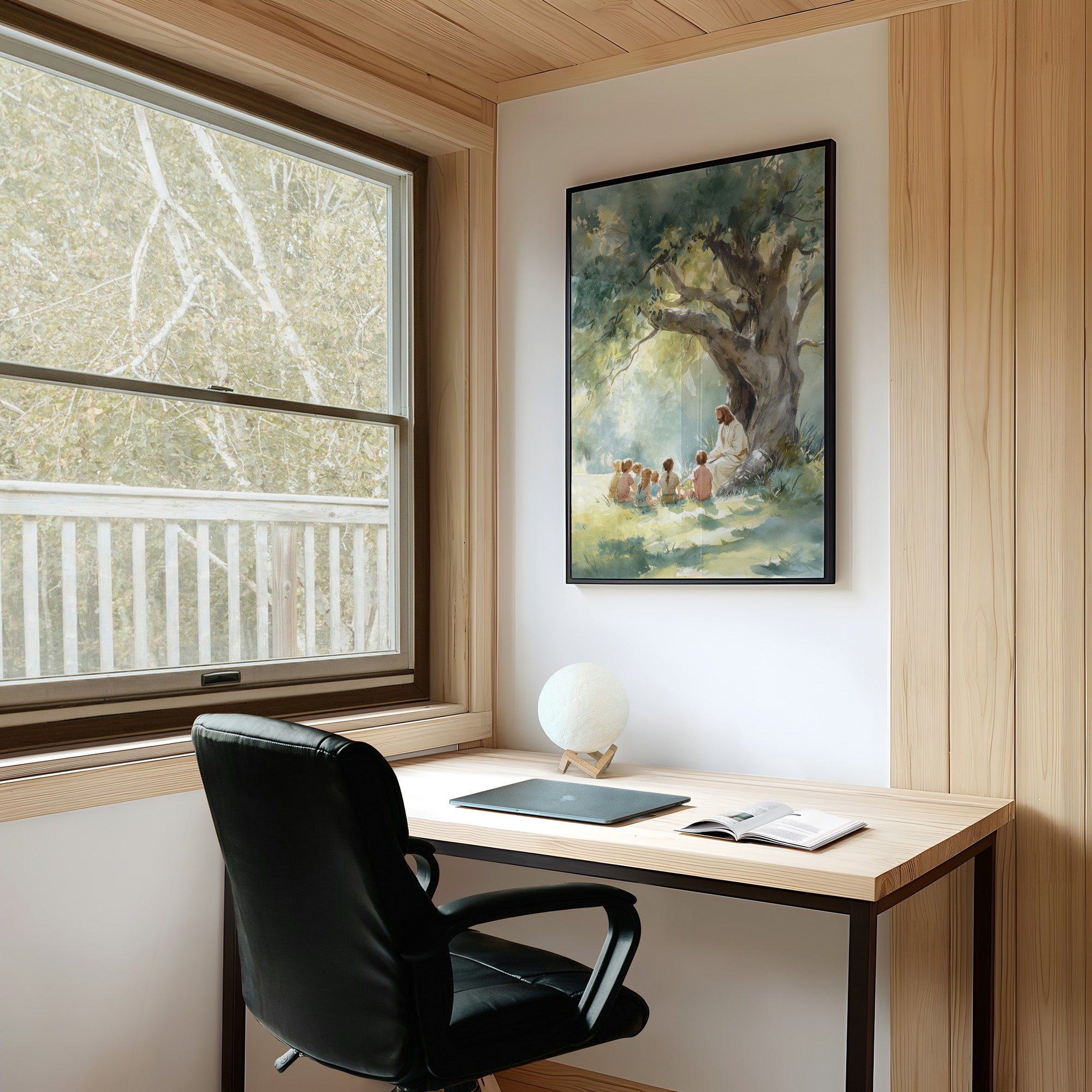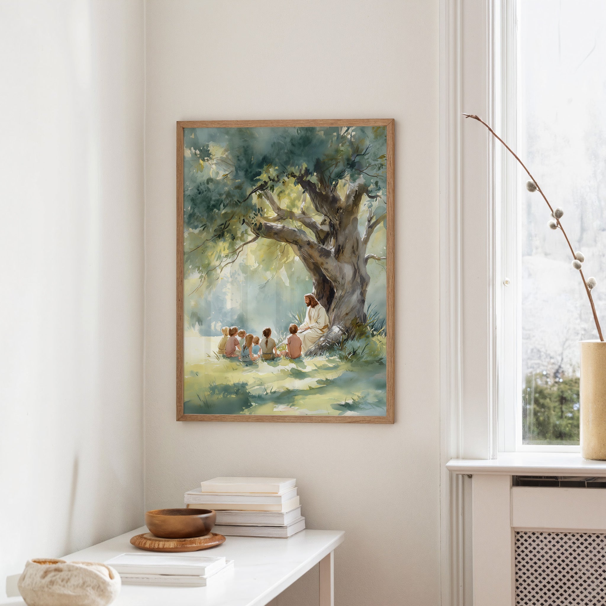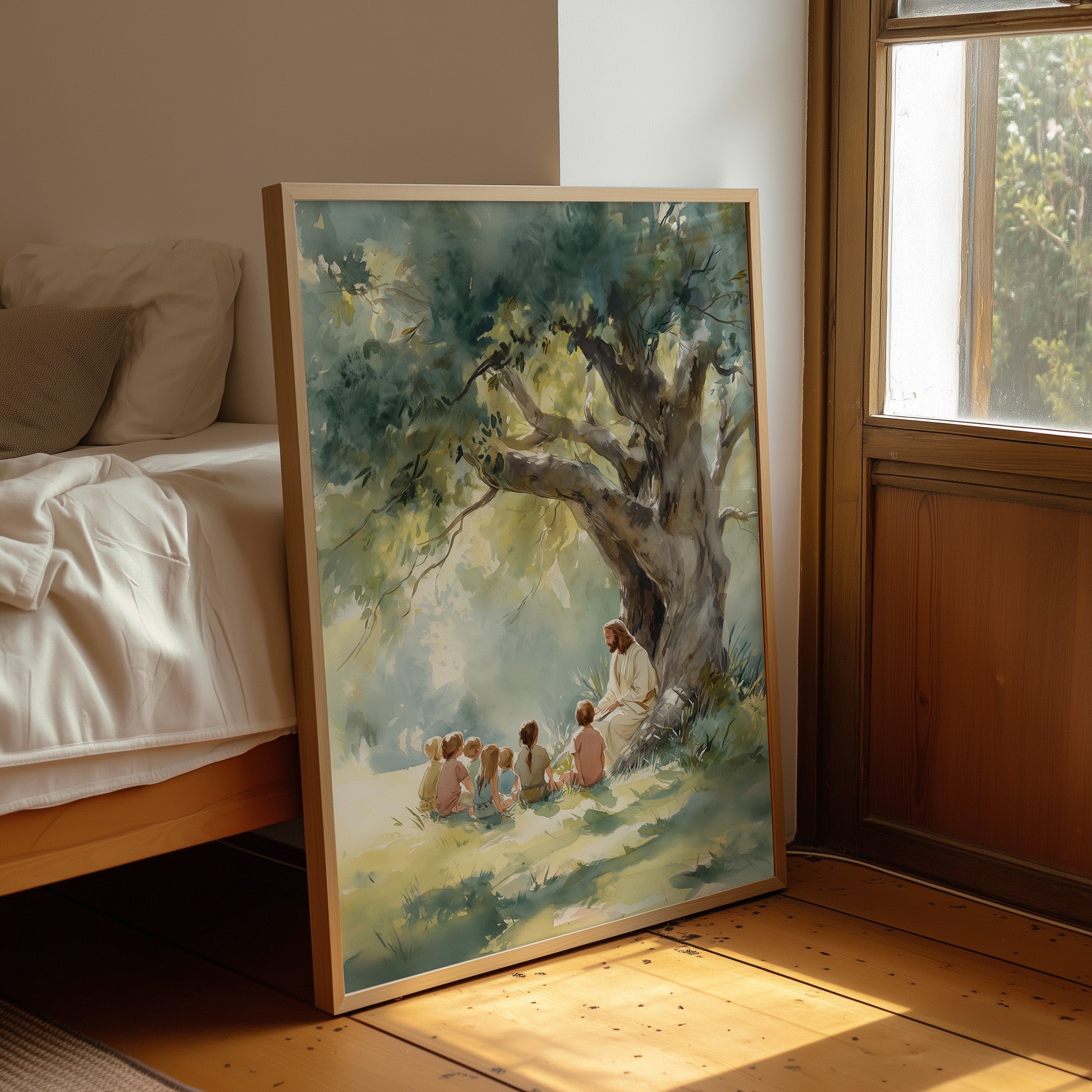 Sunlight filters through leaves, casting gentle patterns across a moment of connection and teaching. The soft watercolor captures the tender scene of figures seated beneath a mighty oak, its weathered trunk standing as a silent witness to wisdom being shared. The artist's delicate brushwork brings warmth to the muted palette of greens, blues, and earthy tones, creating an atmosphere of peaceful contemplation and spiritual communion. This piece brings a sense of serenity and reflection to a home office, reading nook, or any space where quiet inspiration is welcomed.