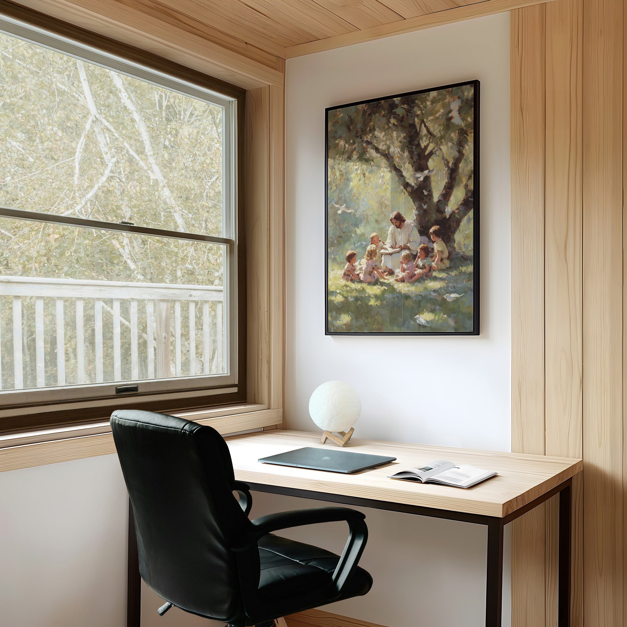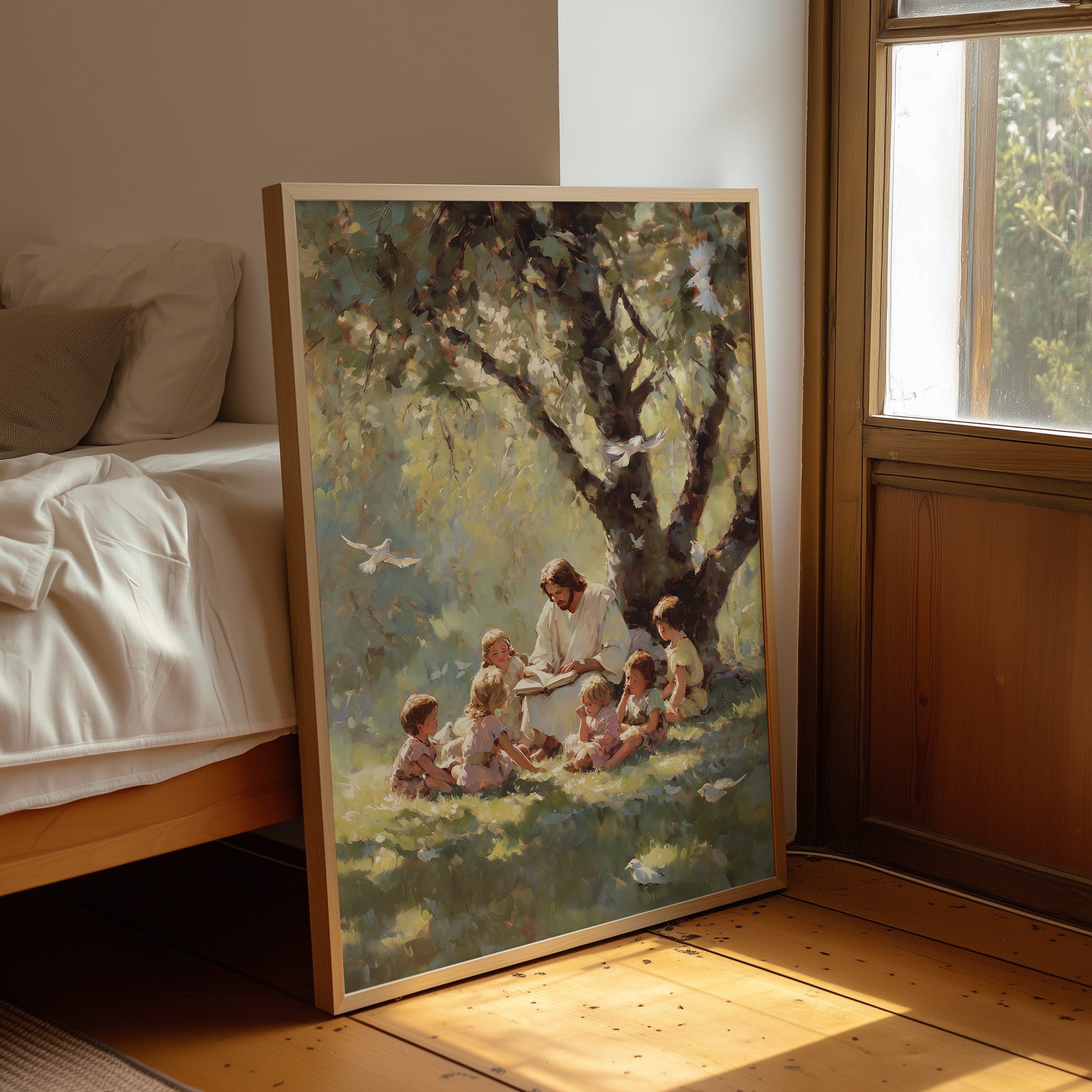 Sunlight filters through leaves, casting gentle patterns across a moment of connection and learning. The soft brushstrokes capture a serene gathering beneath the sprawling branches, where dappled light plays across the lush grass and attentive faces. Rich greens and warm earth tones blend harmoniously, creating a sanctuary where stories unfold and wisdom is shared in quiet reverence.