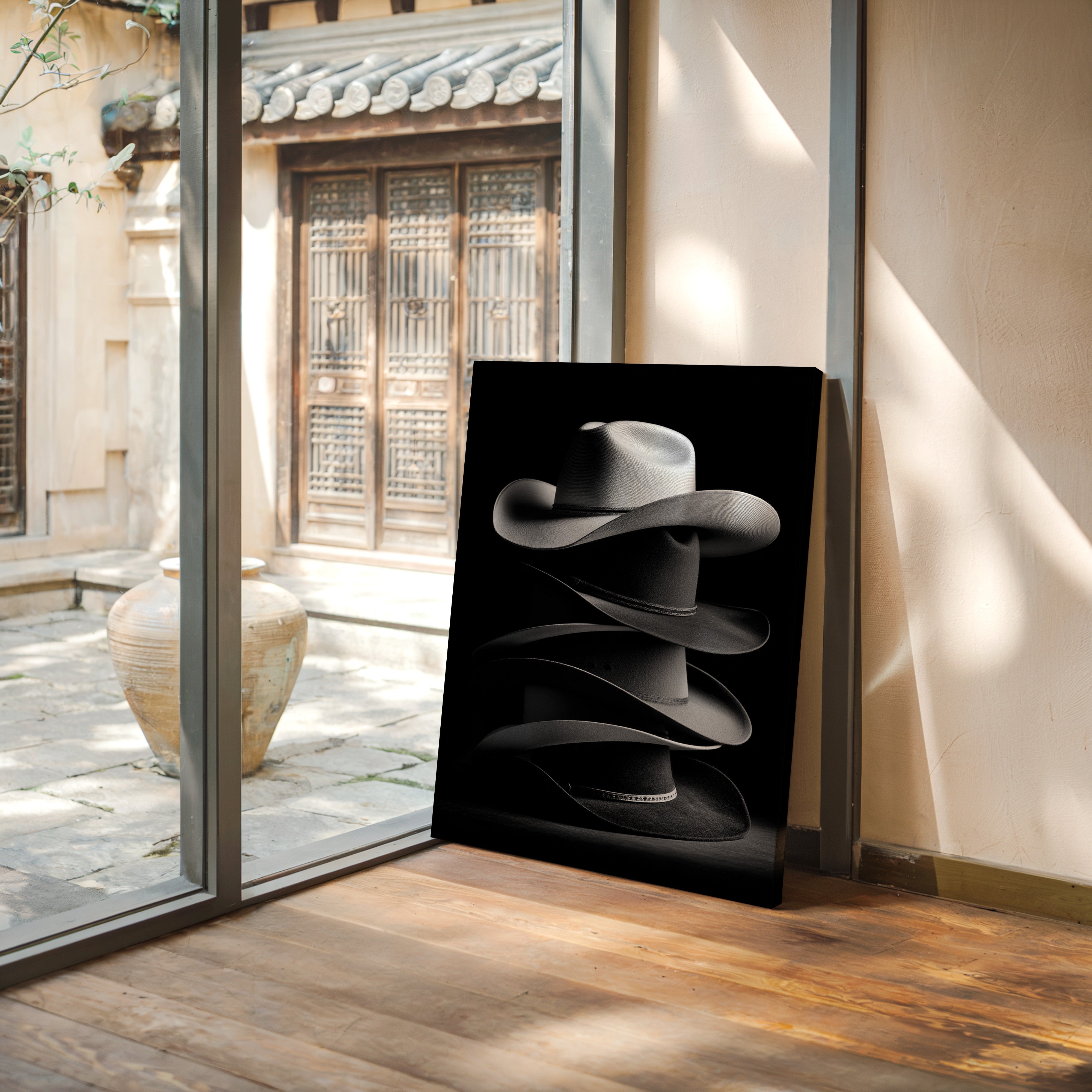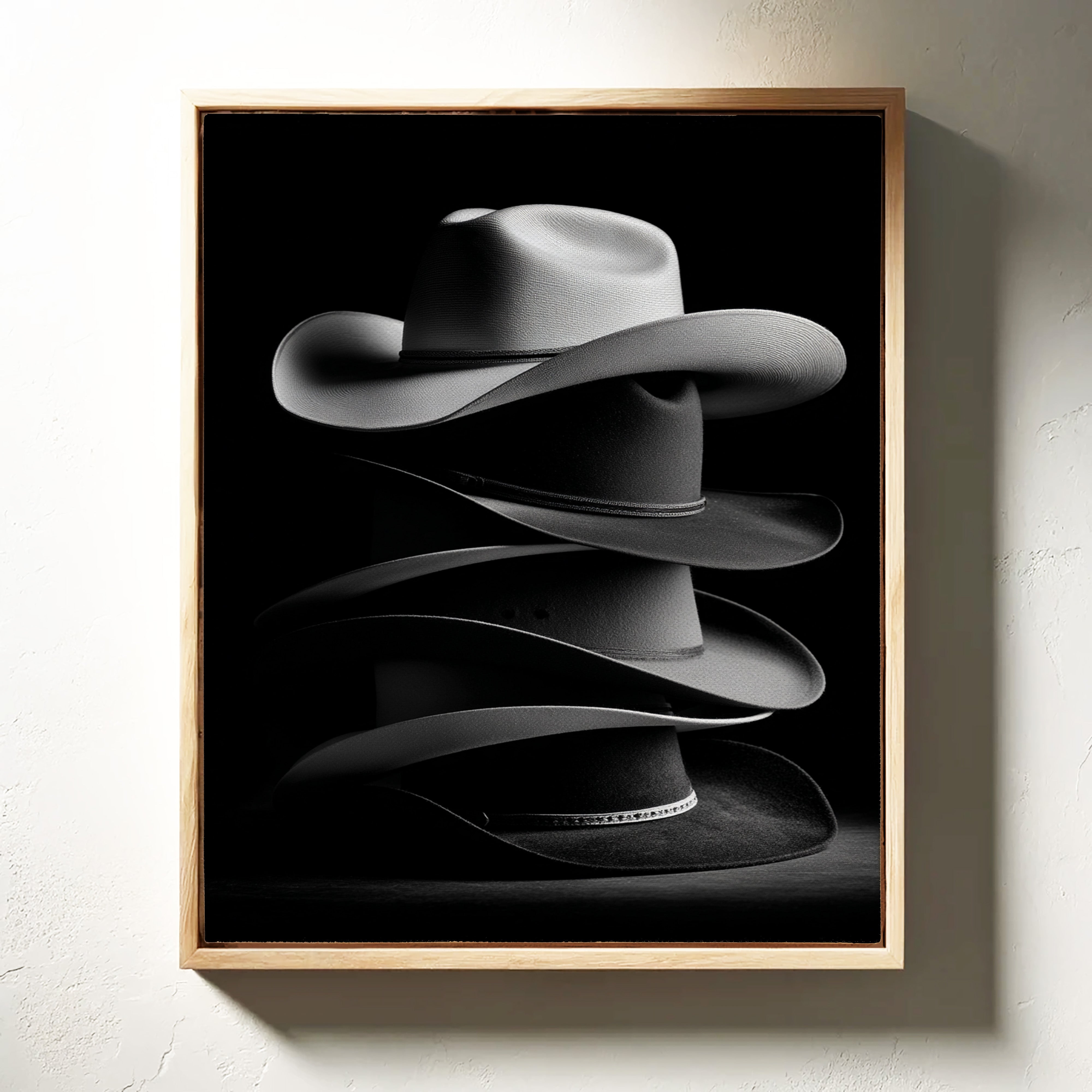 In the interplay of light and shadow, four generations of cowboy hats tell the story of the American West—each crown shaped by different hands, each brim curved by different storms, each band holding memories of different trails. This is more than a collection; it's a legacy stacked in felt and leather.