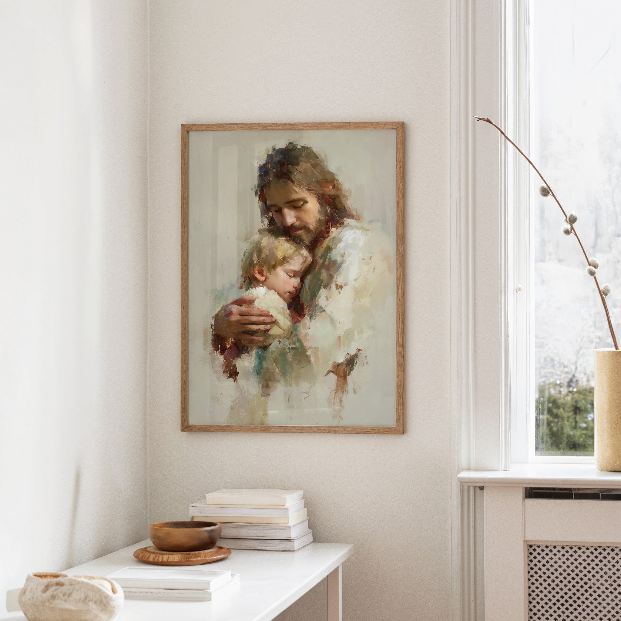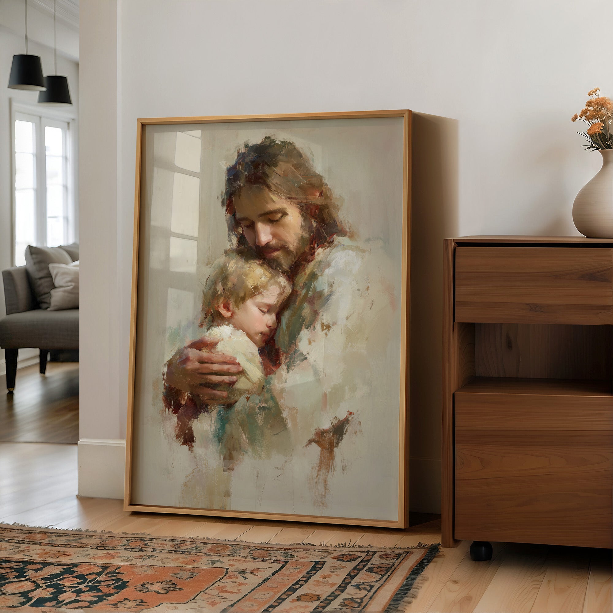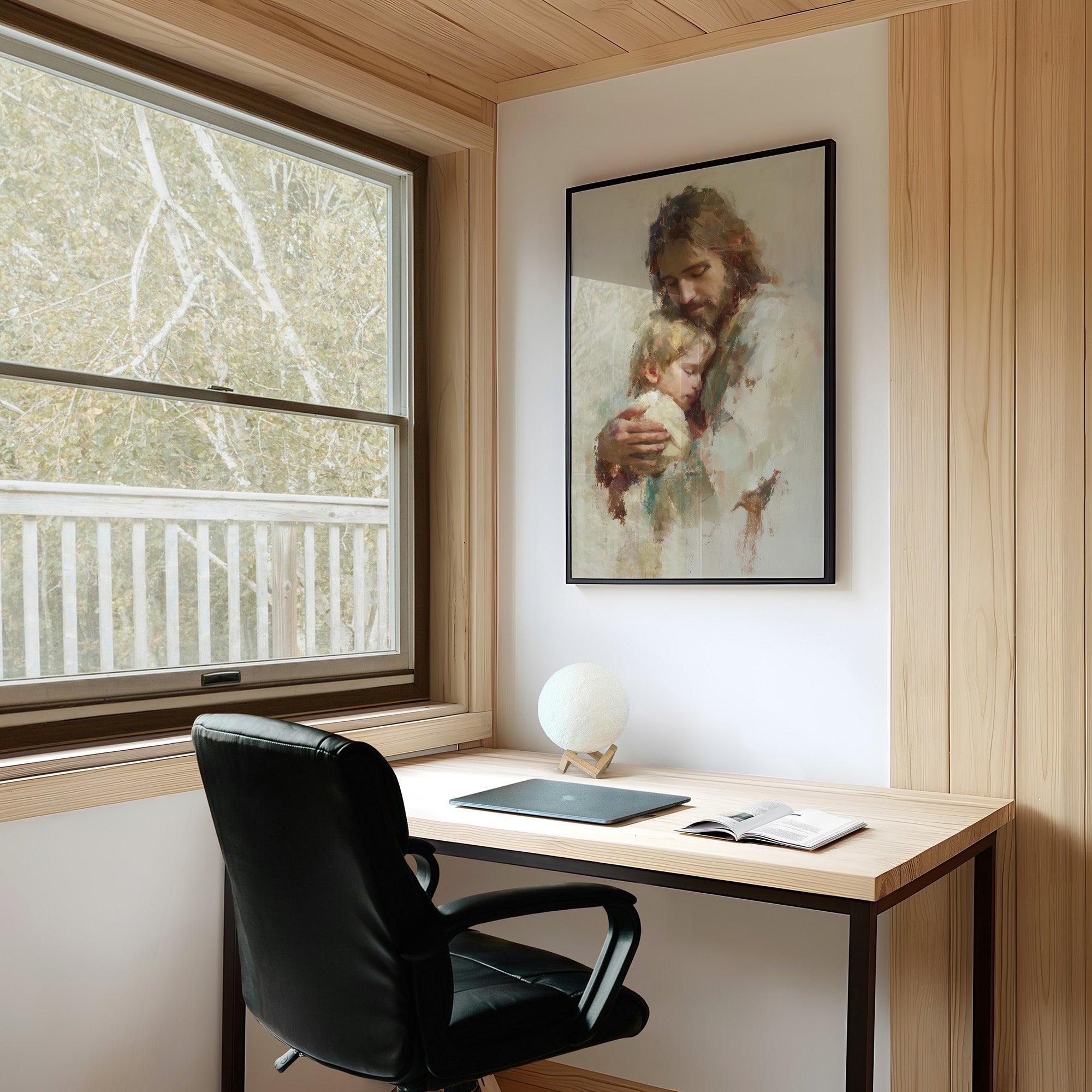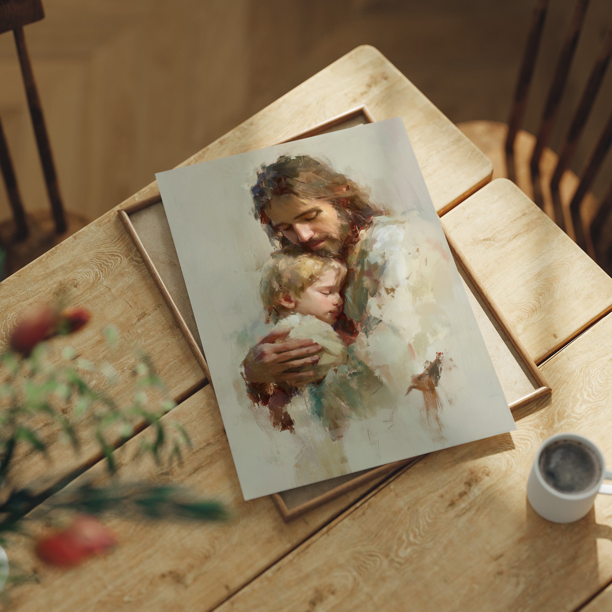Warm light bathes a tender moment captured in impressionistic brushstrokes. The soft palette of creams, browns, and subtle blues creates a sanctuary of calm, where protective arms cradle with infinite gentleness against a minimalist background. Each brushstroke conveys emotion rather than detail, allowing the viewer to feel the profound connection between the figures in this intimate portrait of care and devotion. This piece brings serenity to living spaces where quiet contemplation matters most.