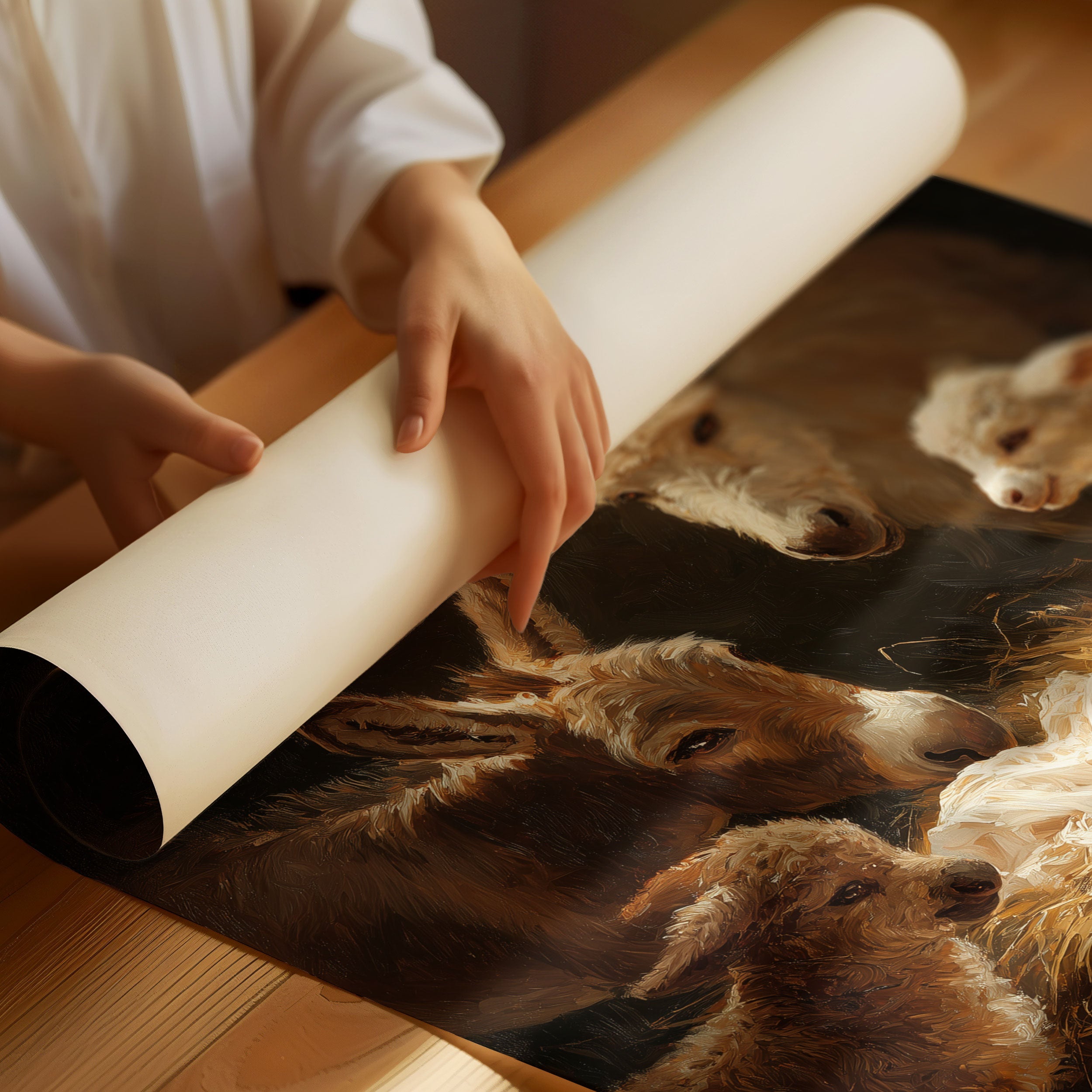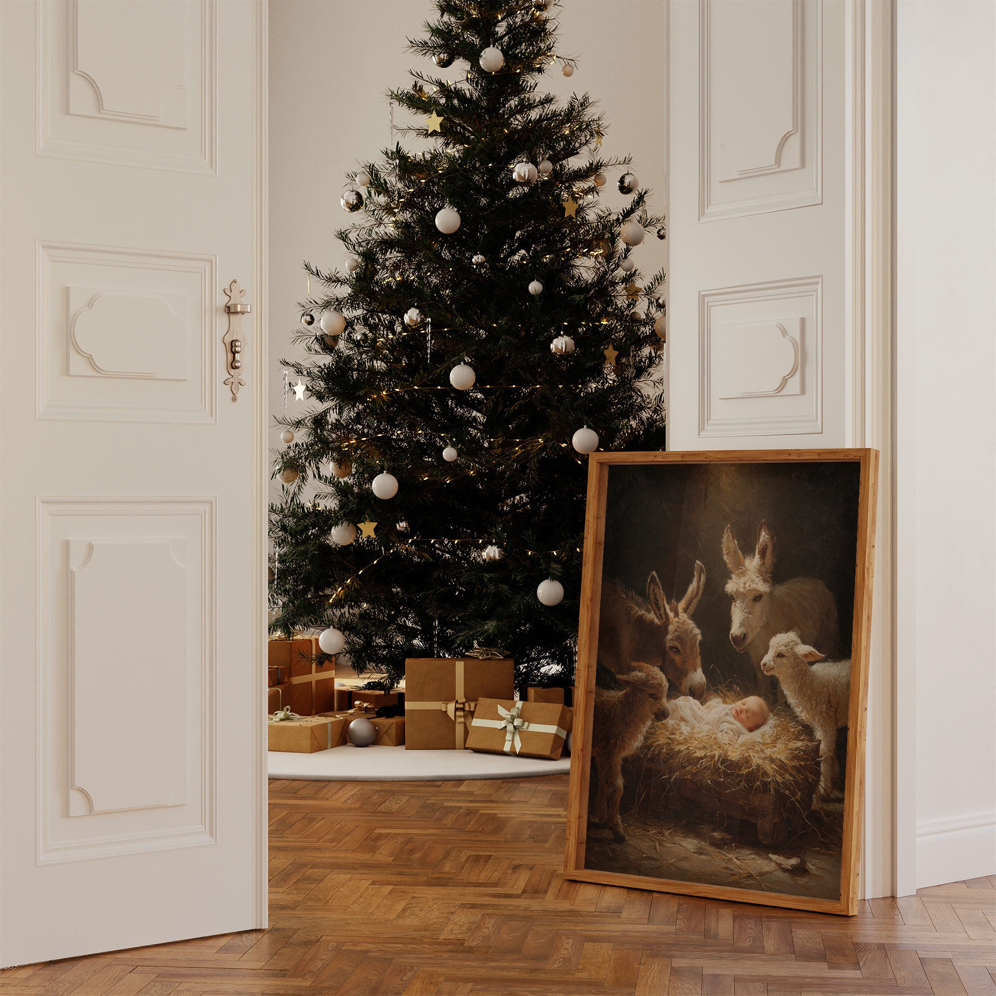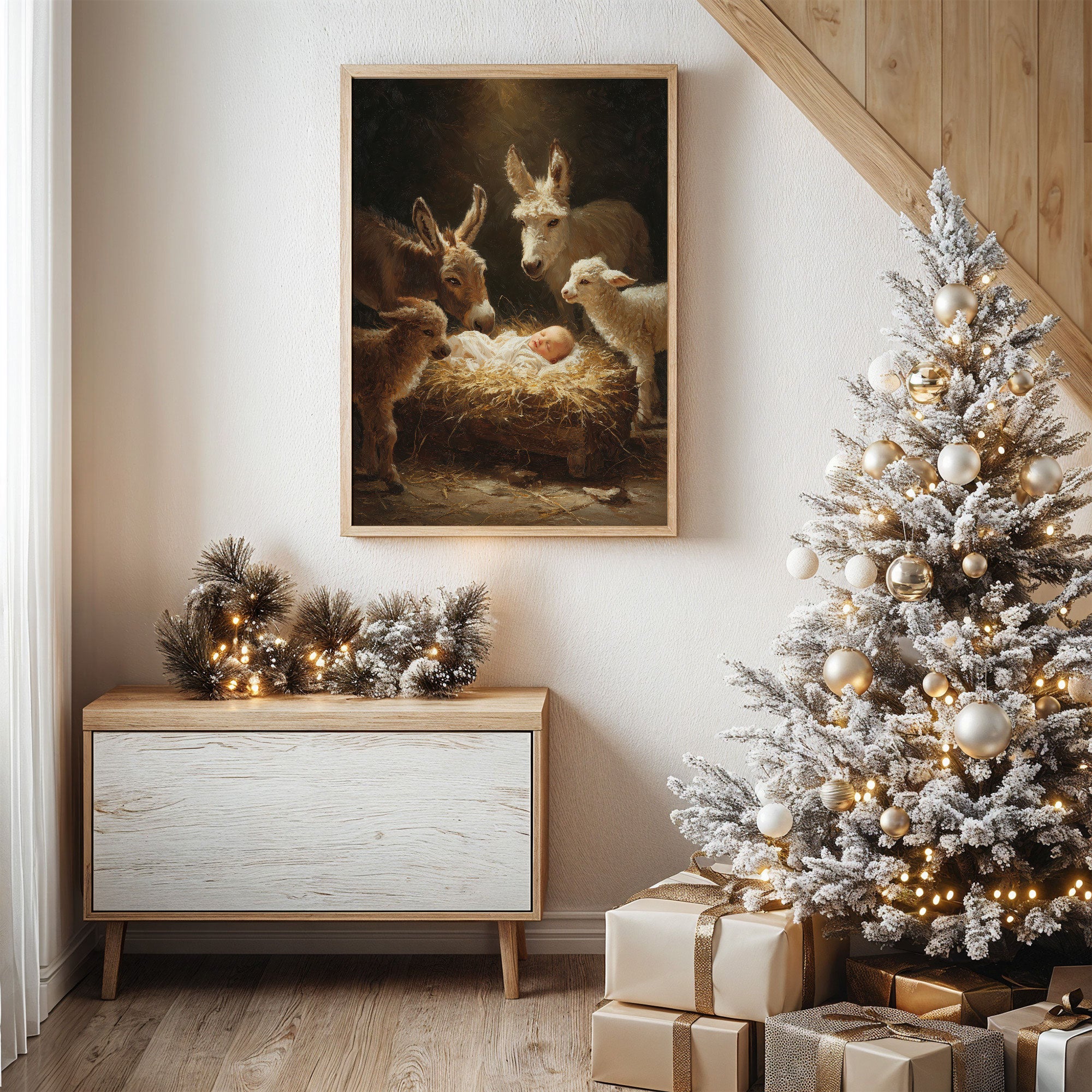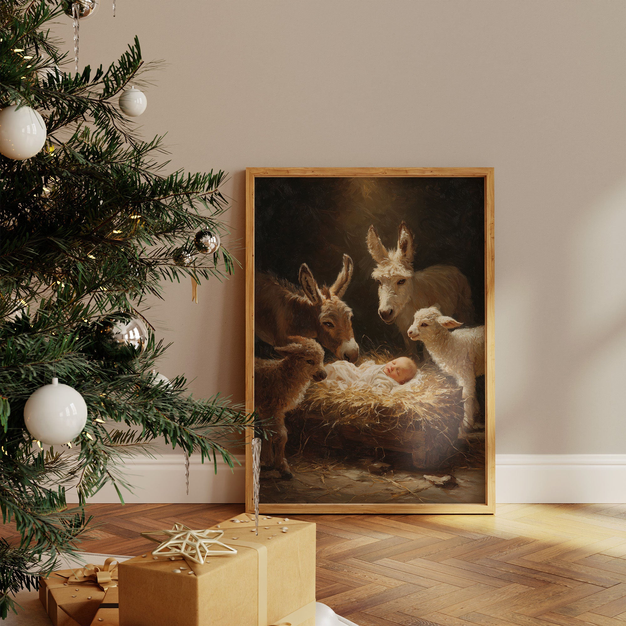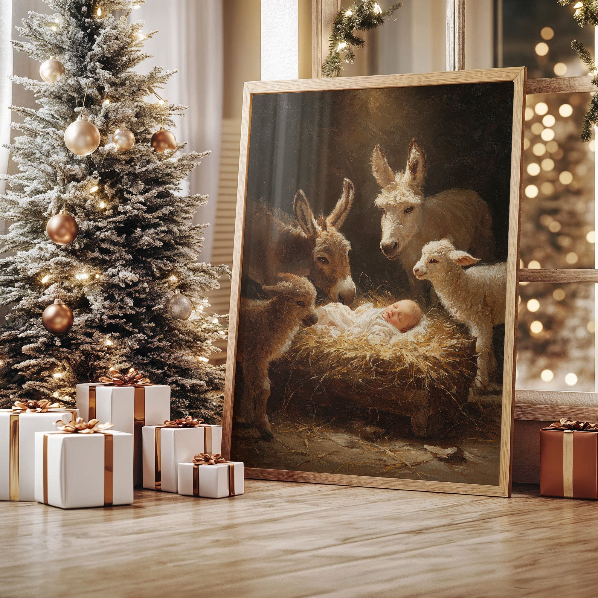 In the warm glow of divine light, farm animals gather with tender curiosity around a sleeping infant nestled in golden hay. The scene captures a moment of pure wonder as donkeys, sheep, and gentle creatures lean in with peaceful reverence. Rich browns and luminous highlights create an otherworldly atmosphere, while maintaining the humble beauty of a barn setting. This classic nativity scene brings warmth to any holiday decor, perfectly suited for a living room or entryway during the Christmas season.