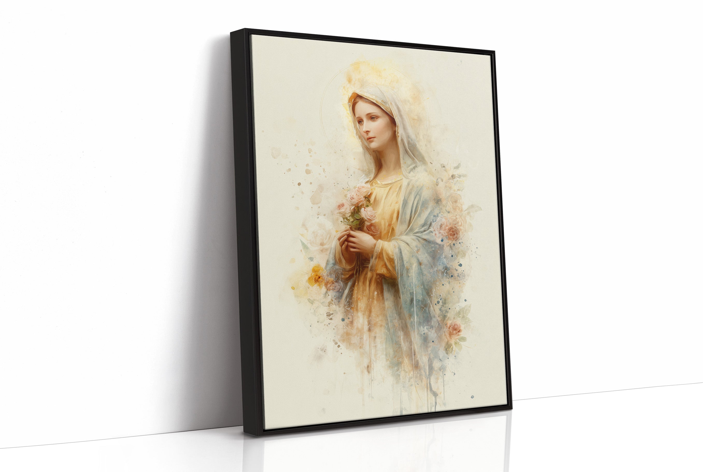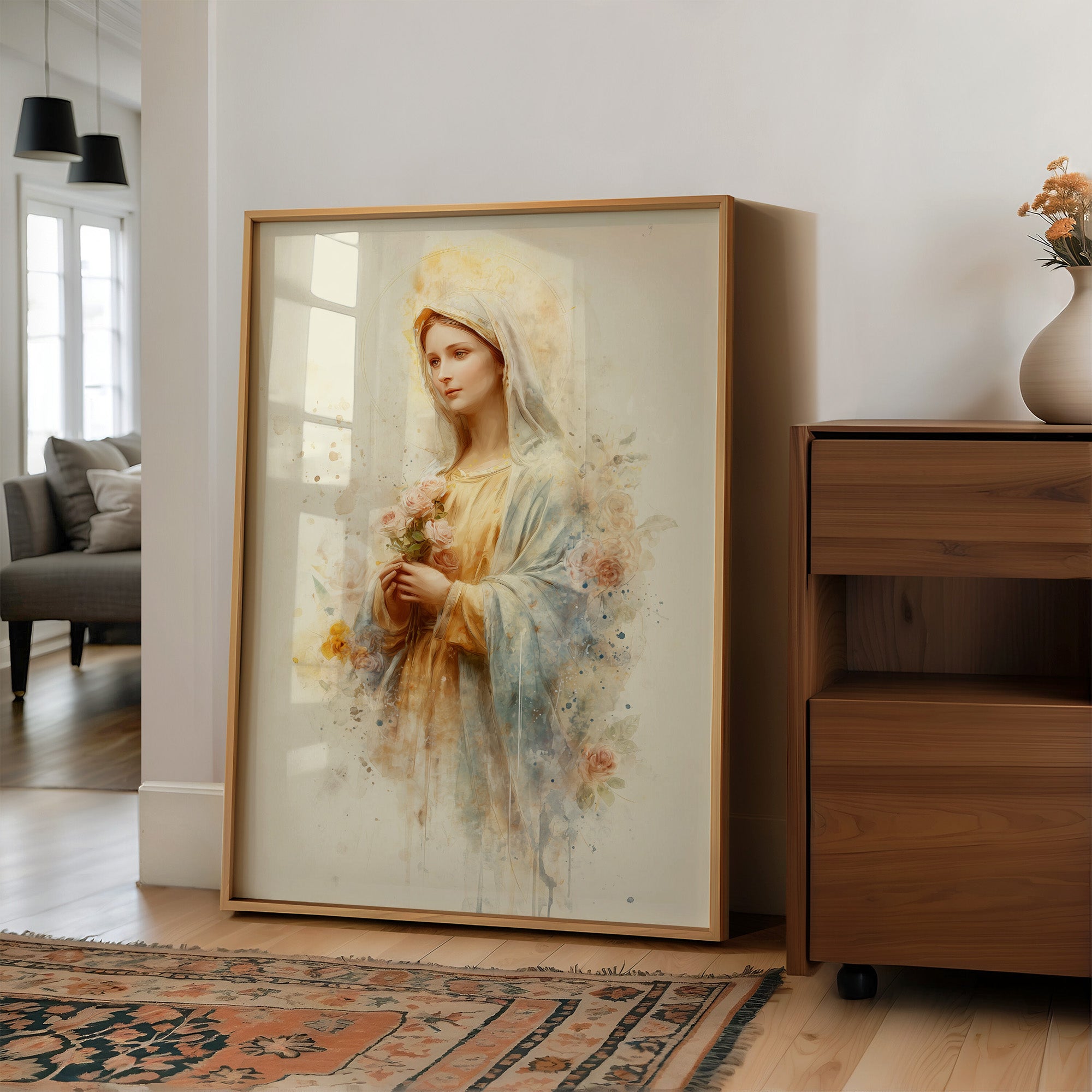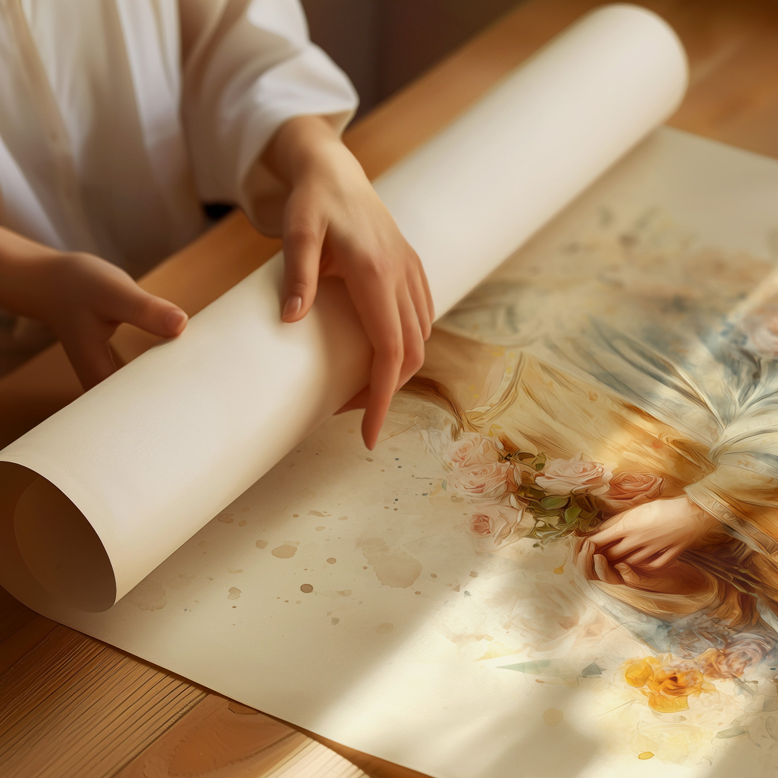 Sunlight spills across a wooden table, illuminating a delicate watercolor portrait resting in quiet contemplation. The soft golden and blue hues blend seamlessly into floral accents, creating an ethereal quality that transcends the paper it's painted on. The gentle brushstrokes capture a serene presence, with subtle splashes of color blooming around the edges like thoughts yet to be fully formed. This tranquil scene feels like a moment paused between morning coffee and afternoon dreams.