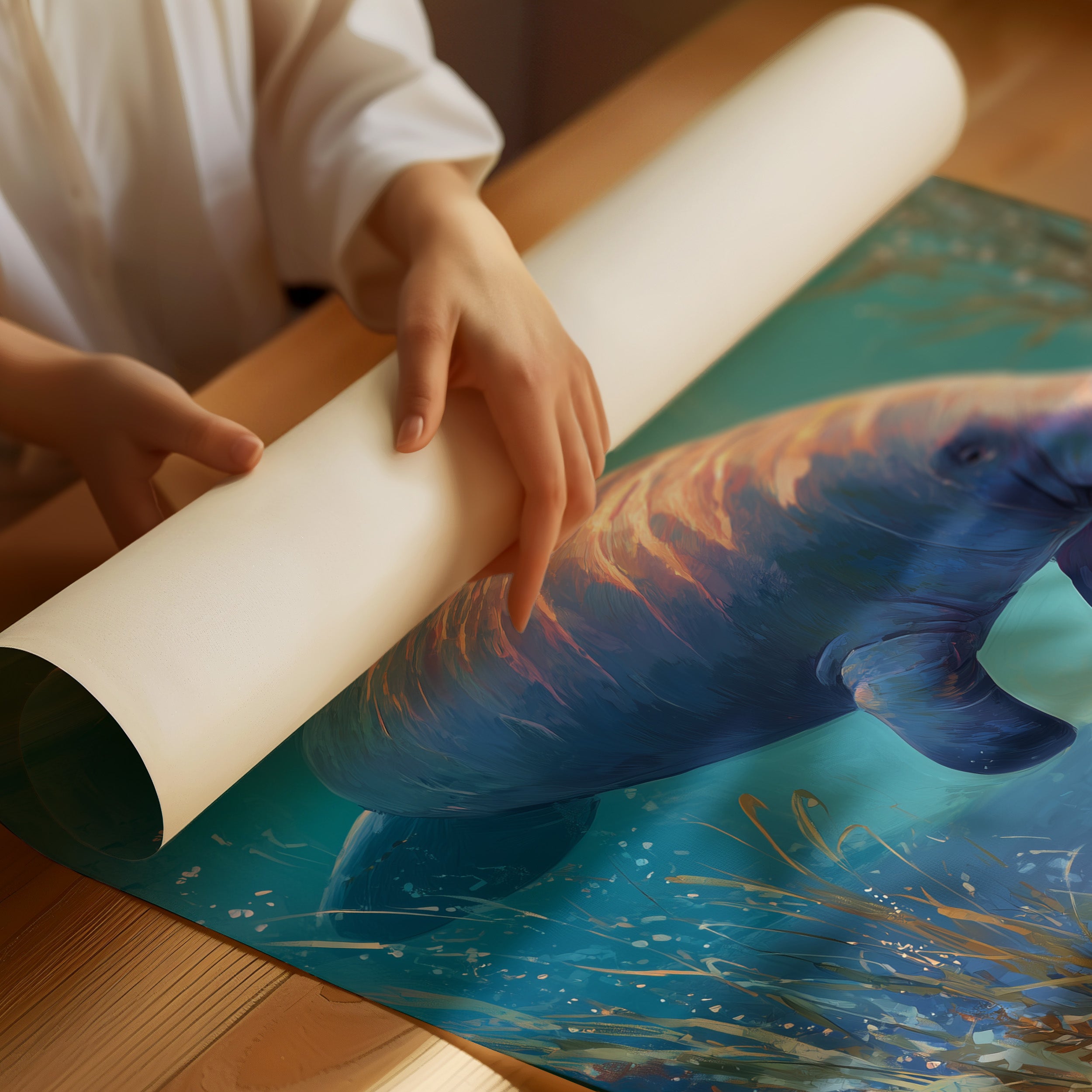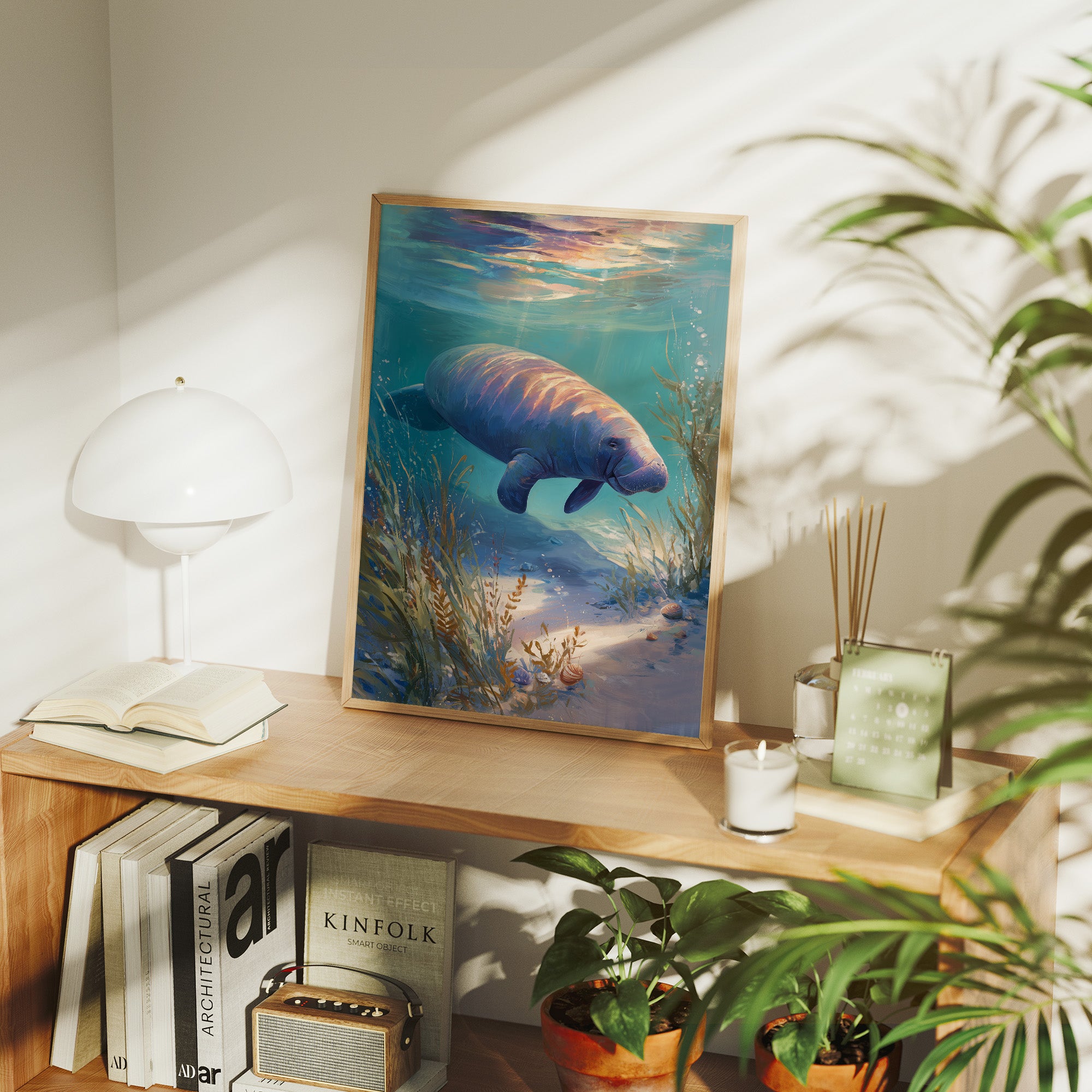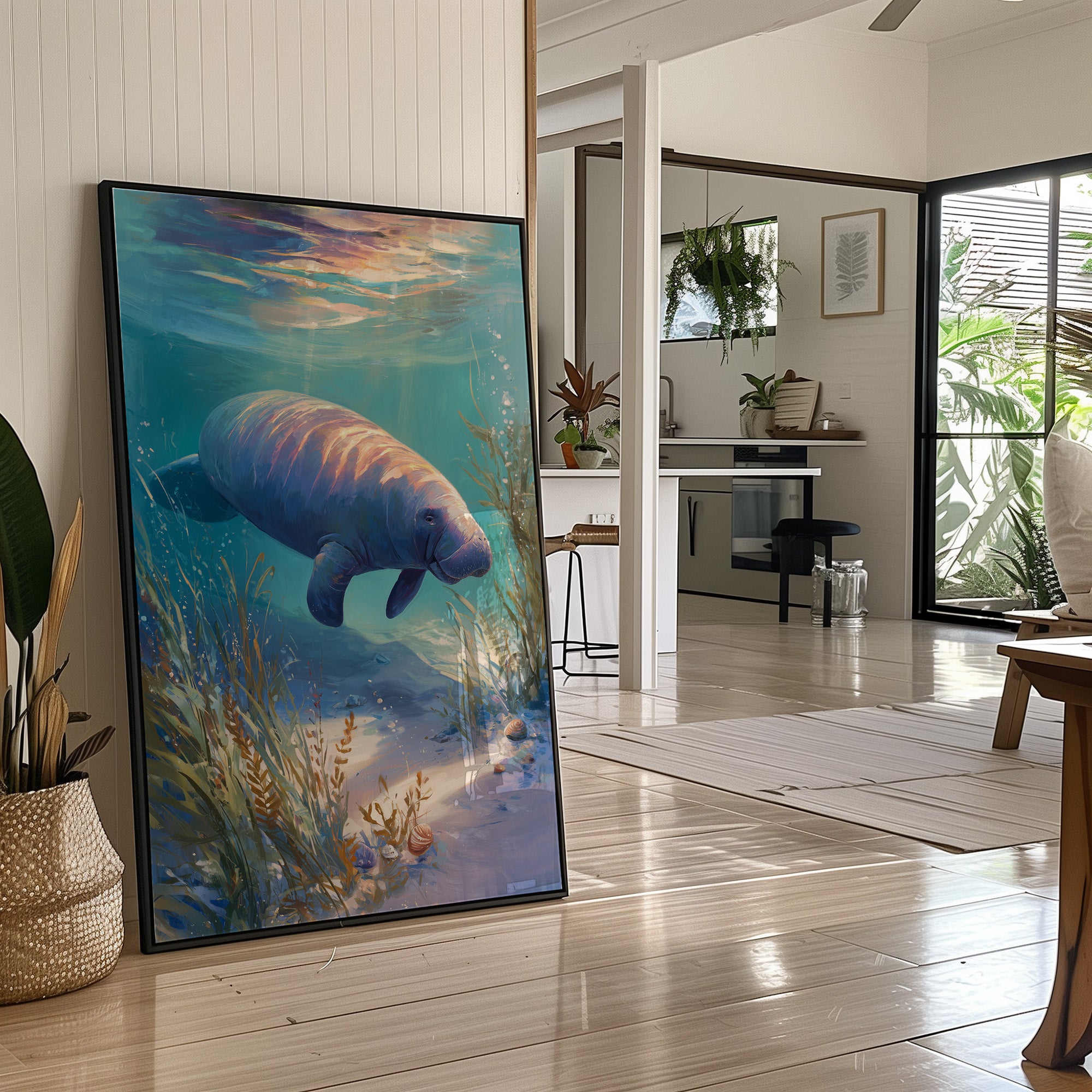 A serene underwater scene depicting a manatee gracefully swimming through turquoise waters. Sunlight filters down from the surface, creating a dreamlike quality as it illuminates the gentle marine mammal's body with hints of purple and gold. Swaying seagrass and coral formations while bubbles dance upward through the tranquil scene.