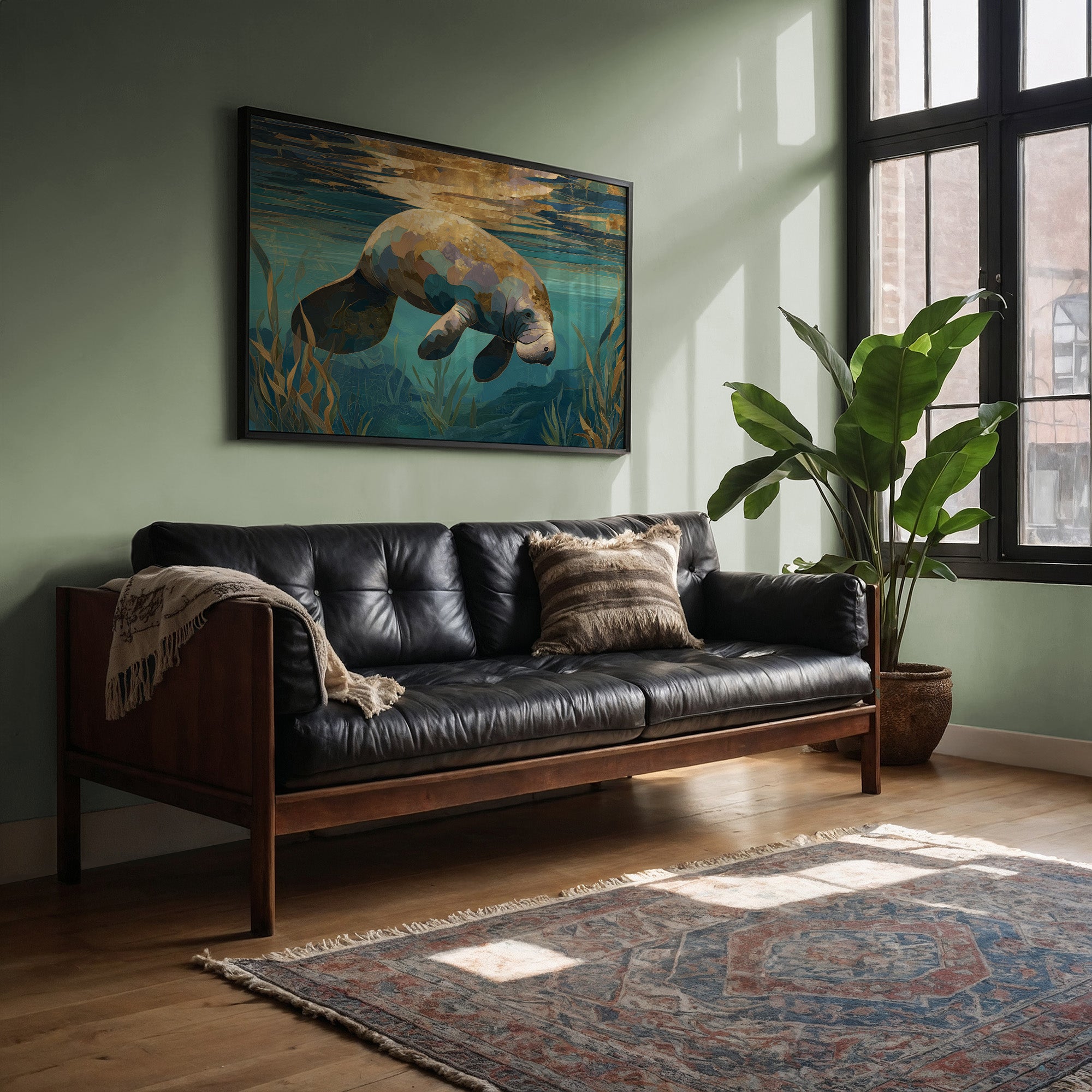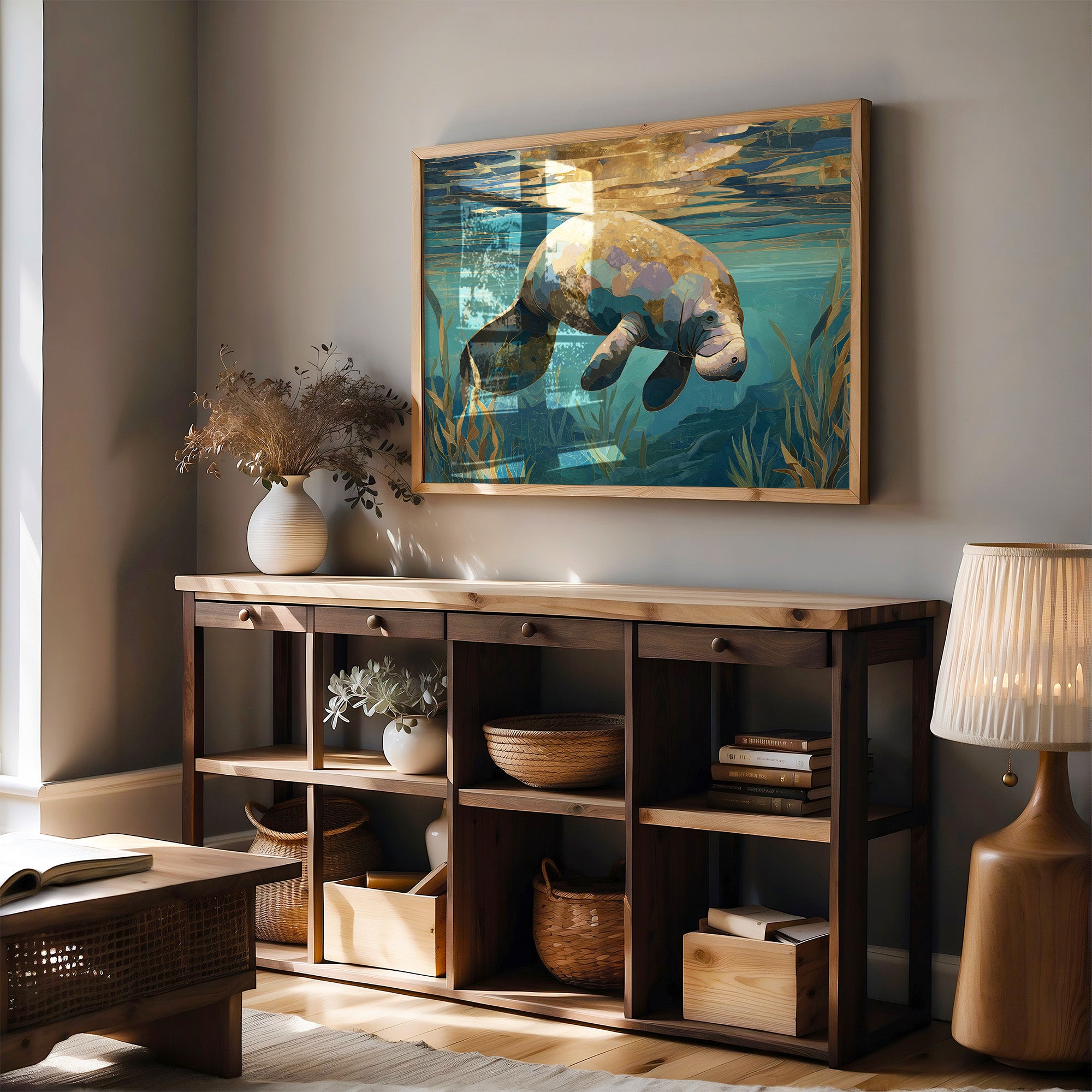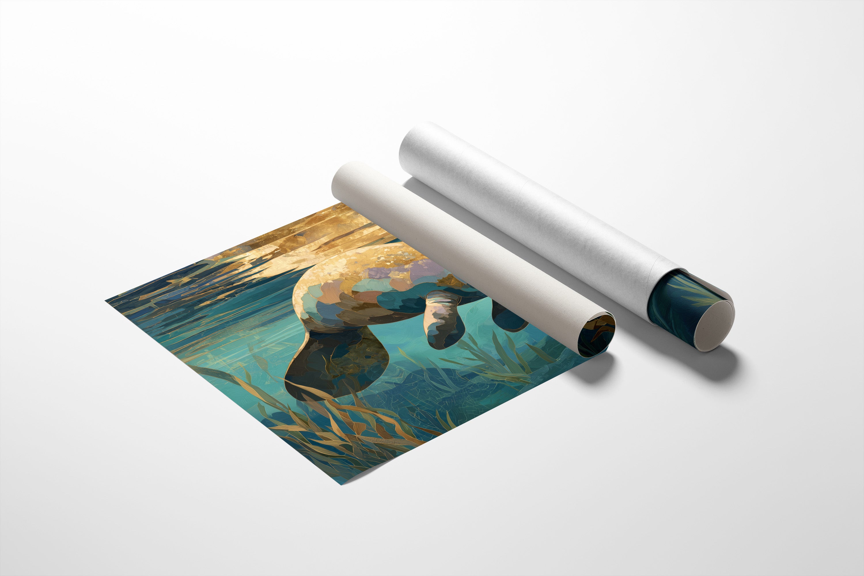 Sunlight dances across the surface as a manatee glides through crystalline waters, peaceful and unhurried. Golden light filters through the aquamarine depths, illuminating the gentle creature's dappled skin in hues of amber, teal, and lavender against swaying seagrass. This serene underwater moment captures the quiet grace of marine life, transforming an everyday scene into something magical and meditative.