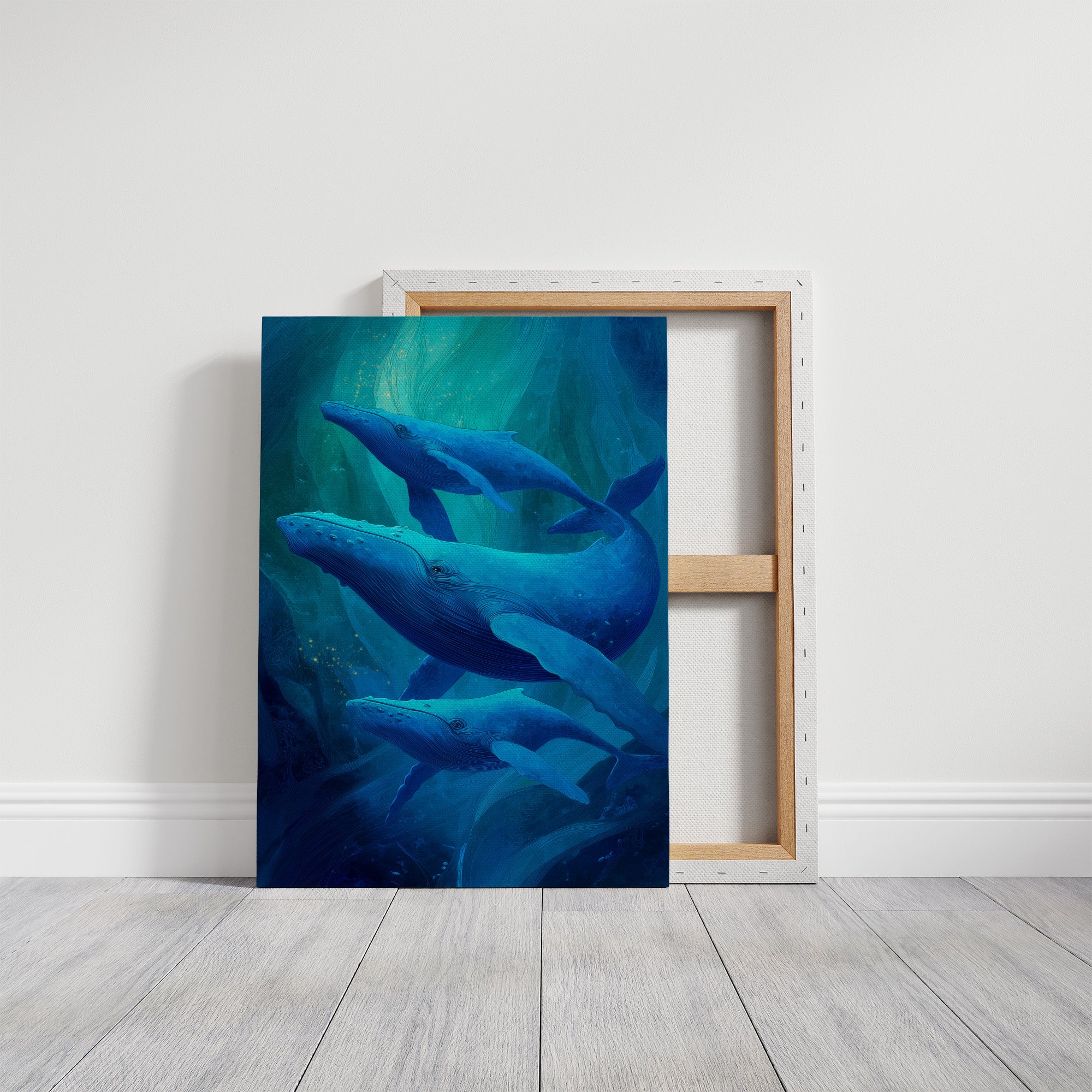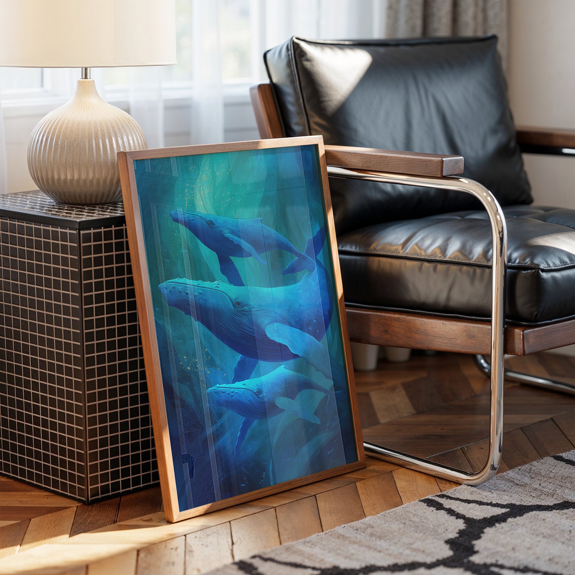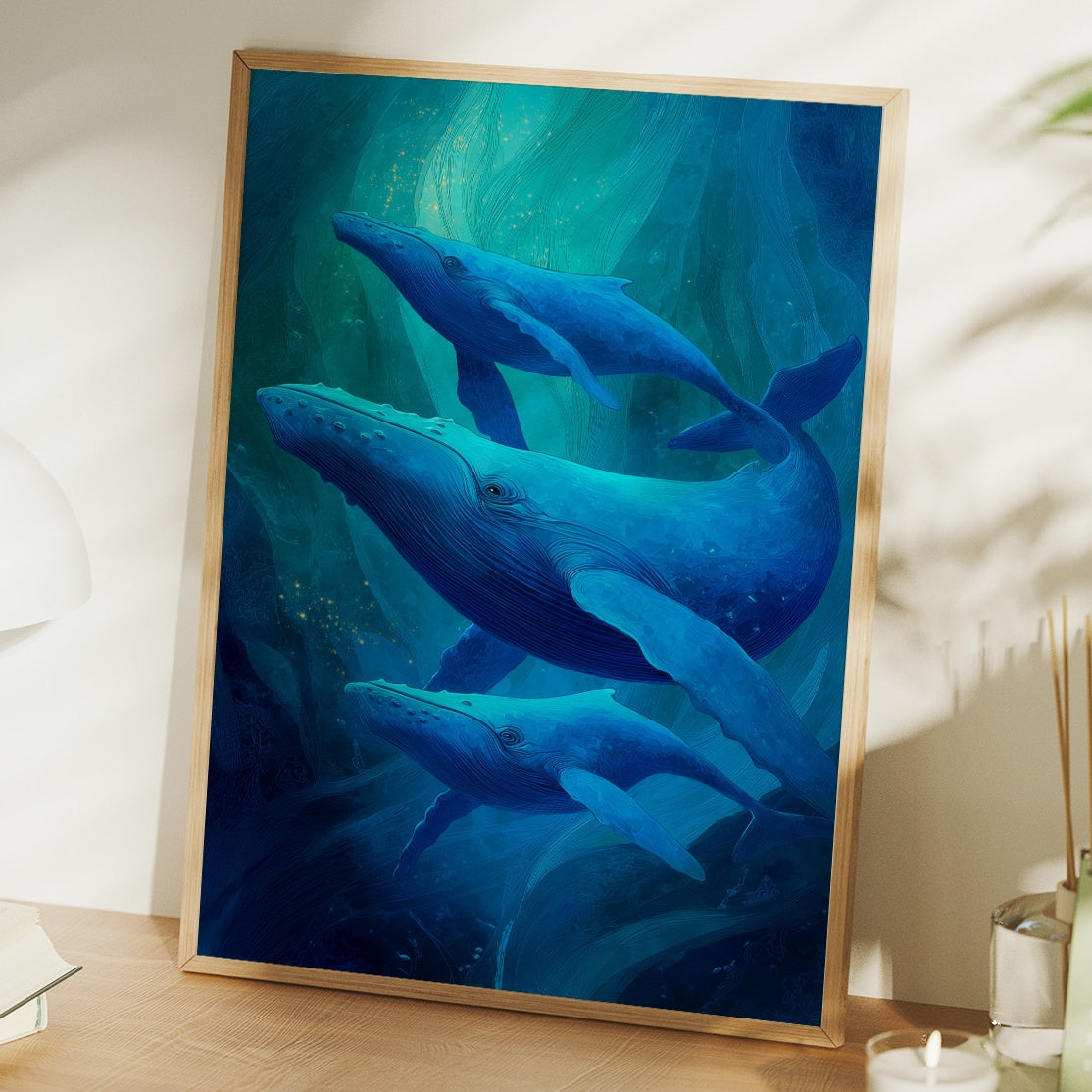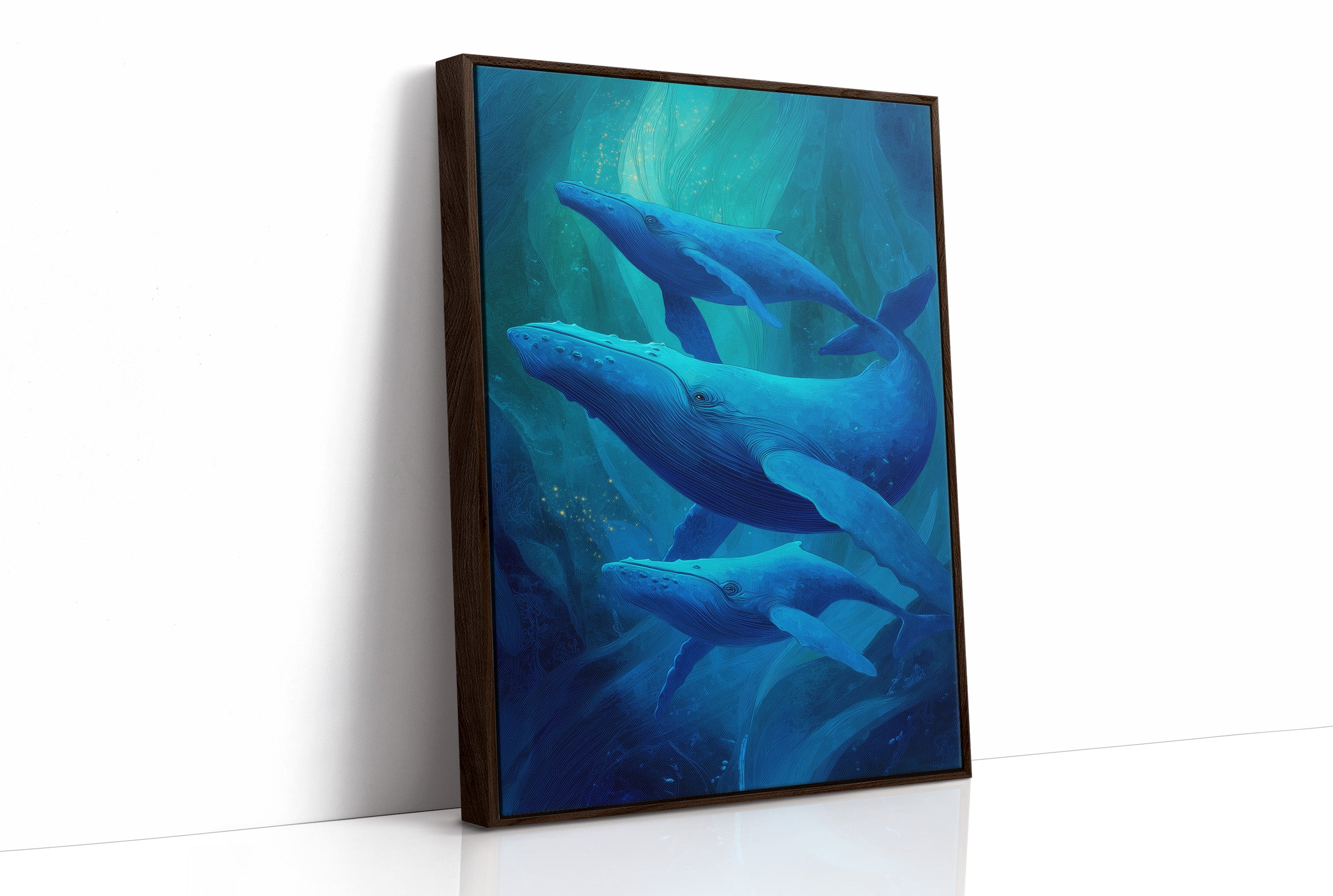 Sunlight spills across wooden floors where deep blue whales glide through an ethereal underwater world. The artwork captures the majestic marine mammals in their silent ballet, suspended in layers of translucent turquoise that evoke the mysterious depths of the ocean. The wooden frame complements the natural beauty of these magnificent creatures, creating a harmonious bridge between land and sea. This piece brings tranquil ocean energy to a modern living room, perfect for spaces seeking both serenity and a touch of wonder.