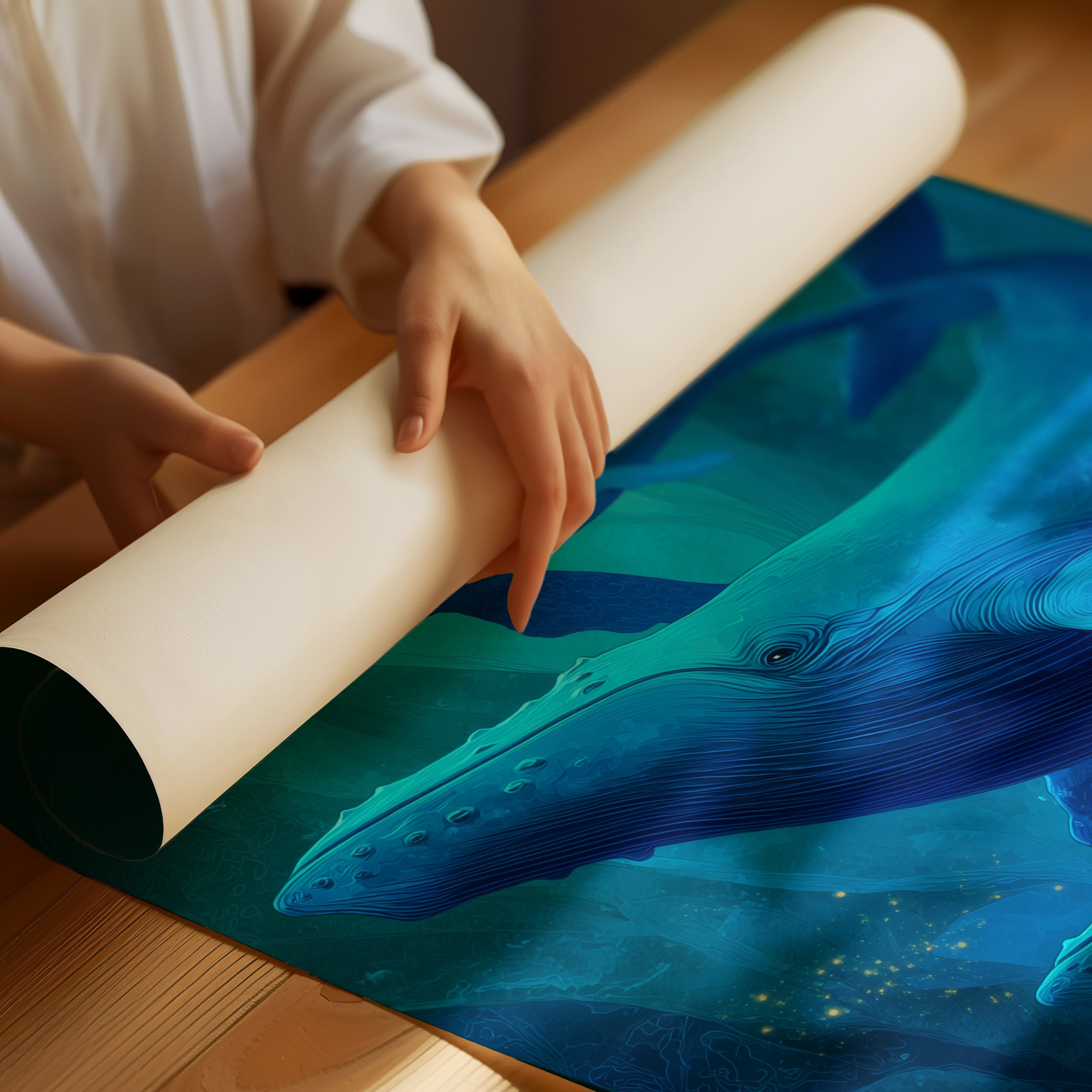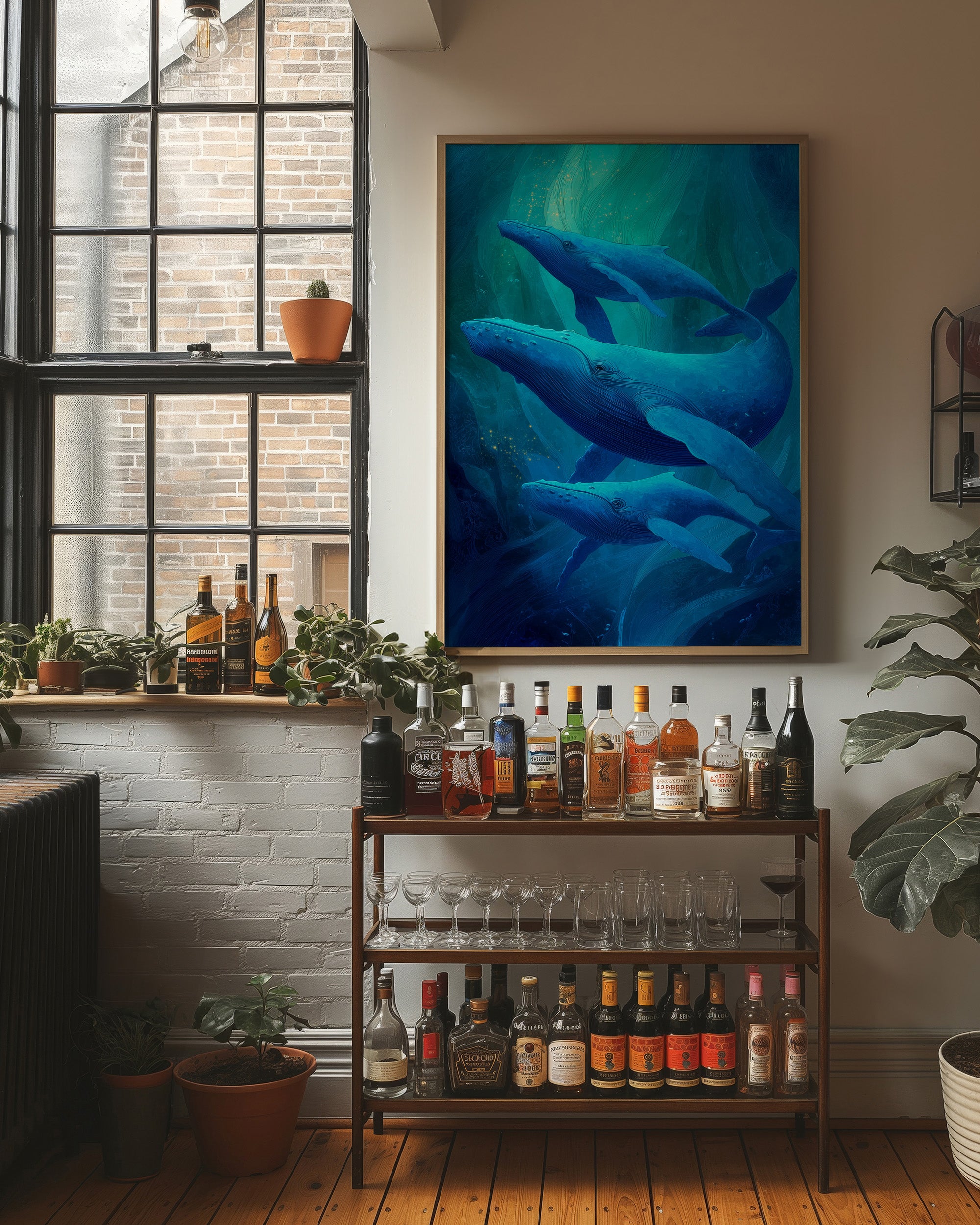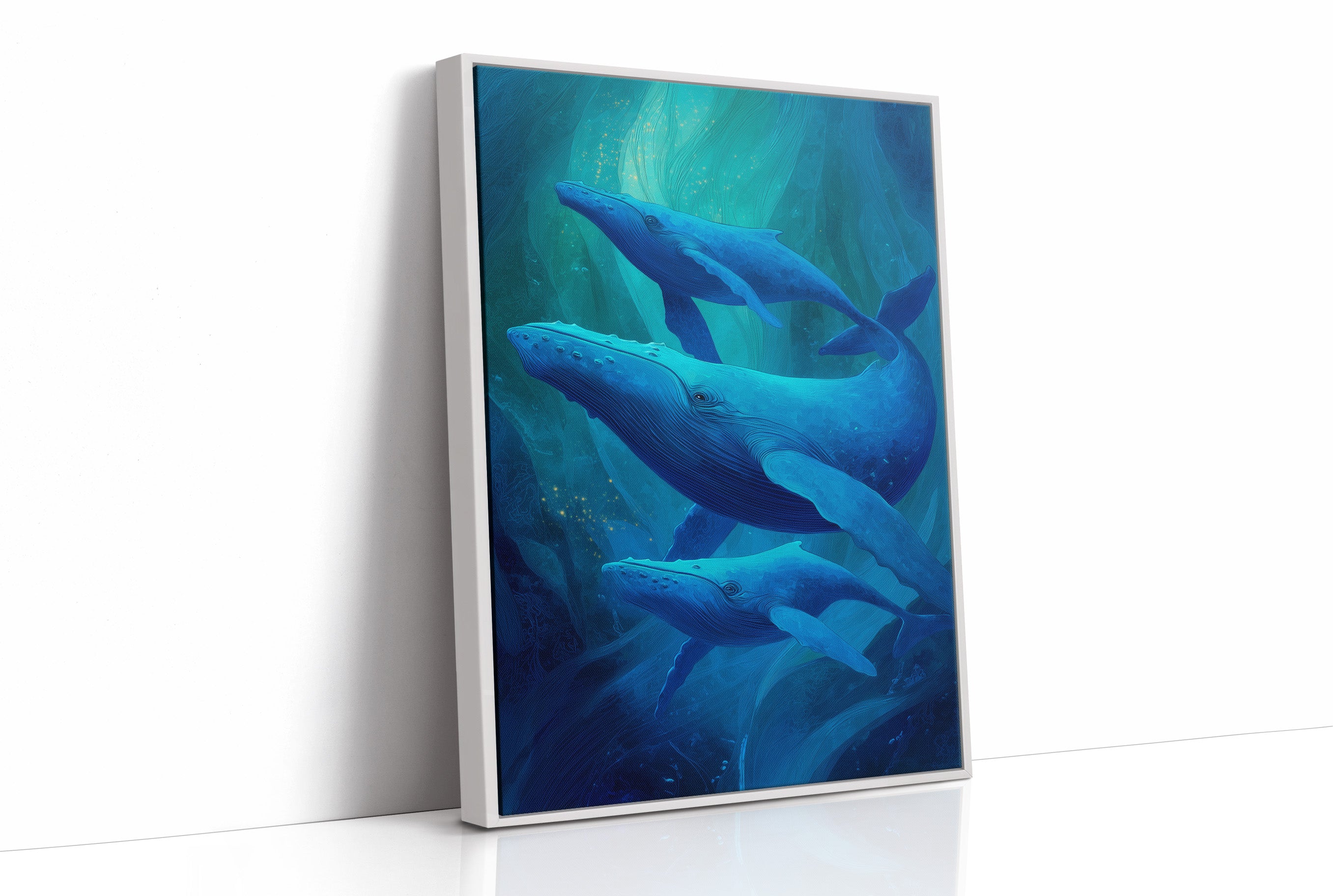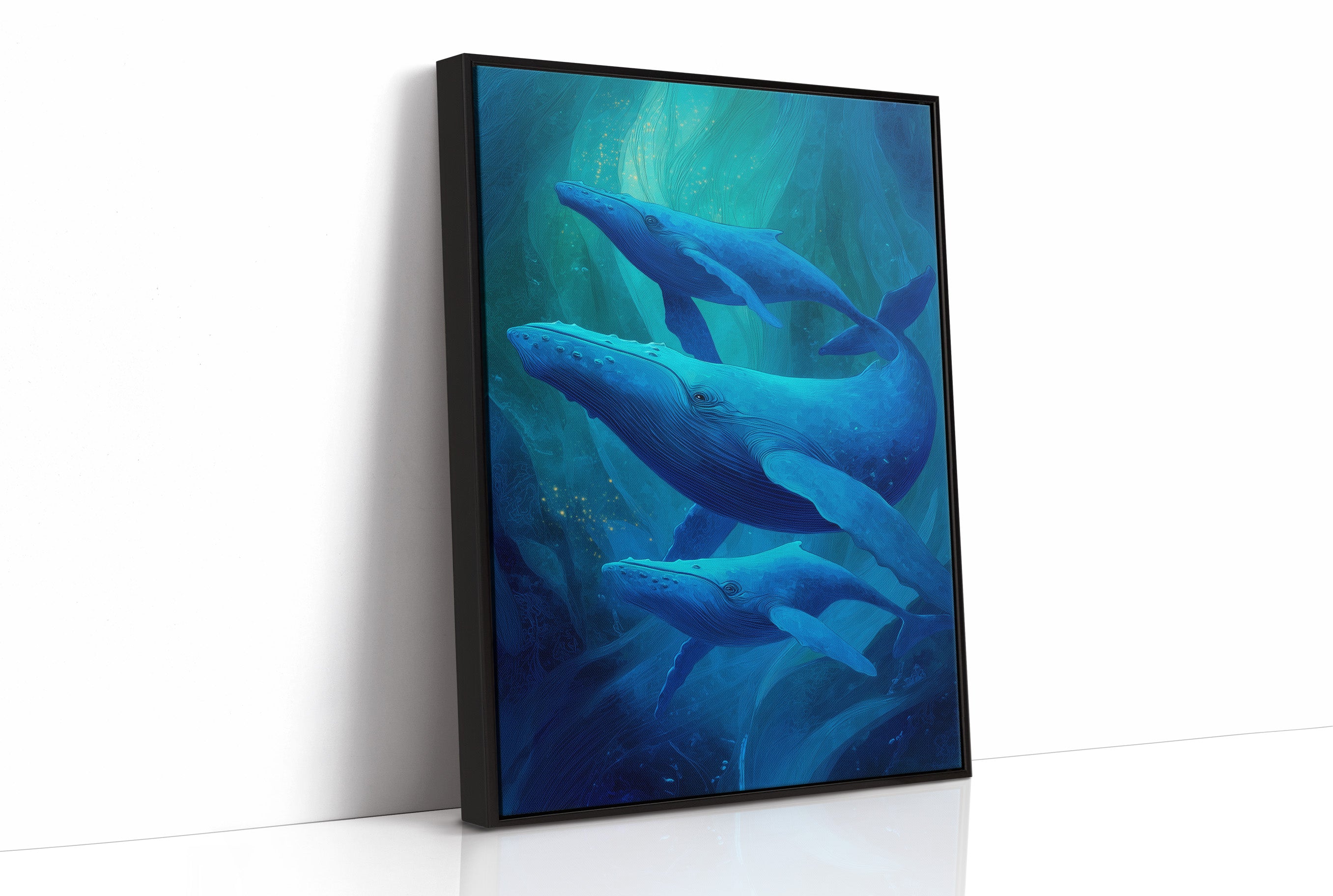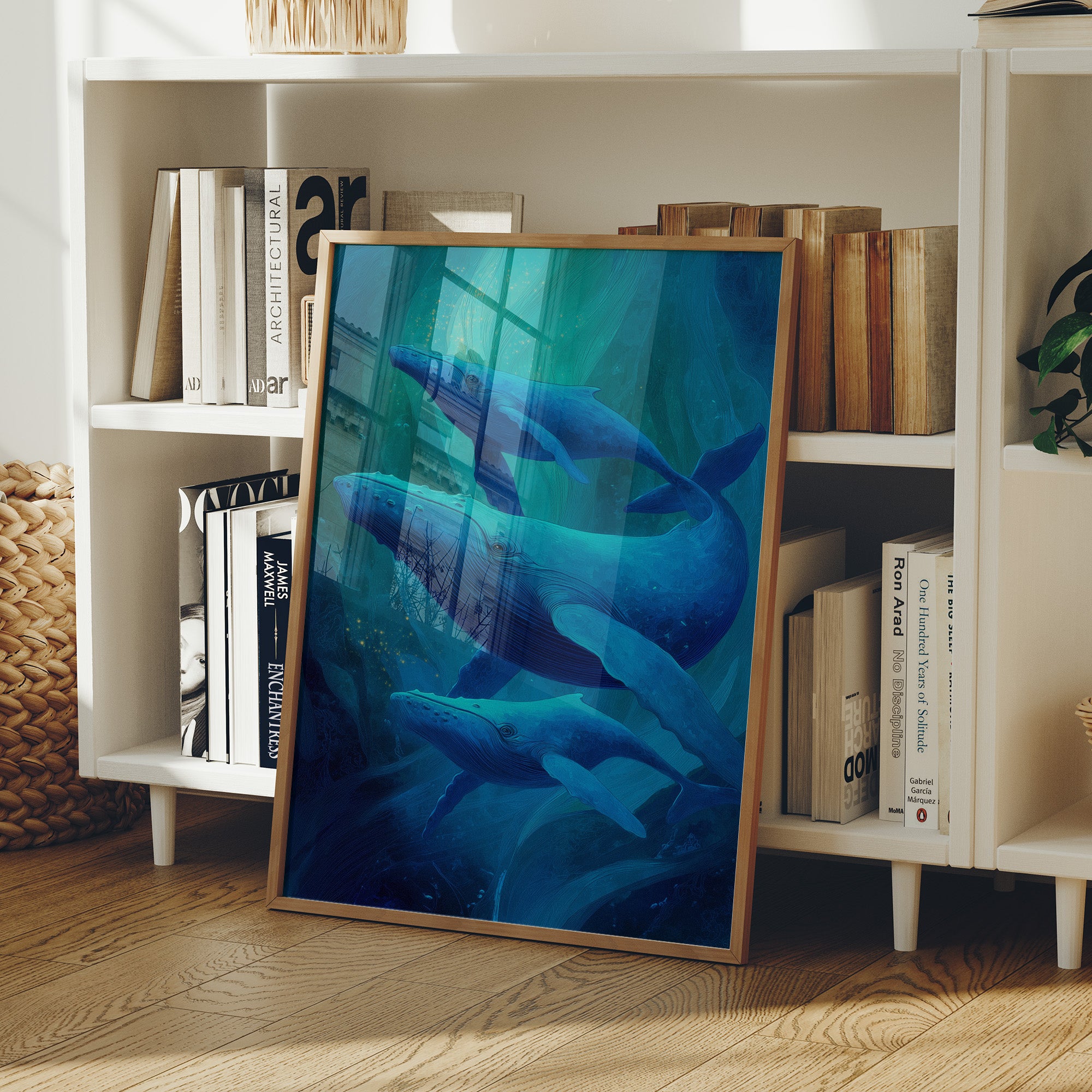 Sunlight spills across wooden floors where deep blue whales glide through an ethereal underwater world. The artwork captures the majestic marine mammals in their silent ballet, suspended in layers of translucent turquoise that evoke the mysterious depths of the ocean. The wooden frame complements the natural beauty of these magnificent creatures, creating a harmonious bridge between land and sea. This piece brings tranquil ocean energy to a modern living room, perfect for spaces seeking both serenity and a touch of wonder.