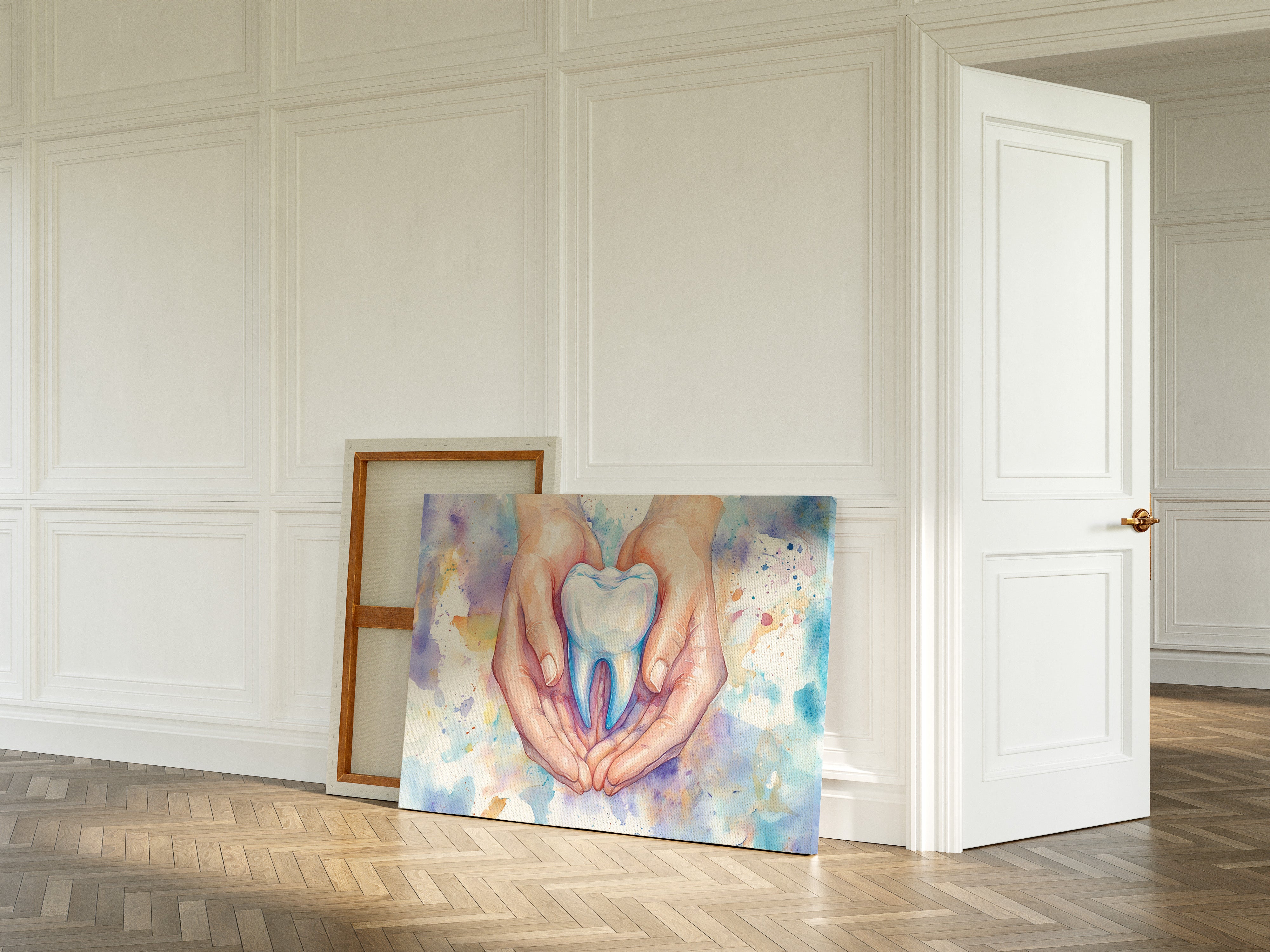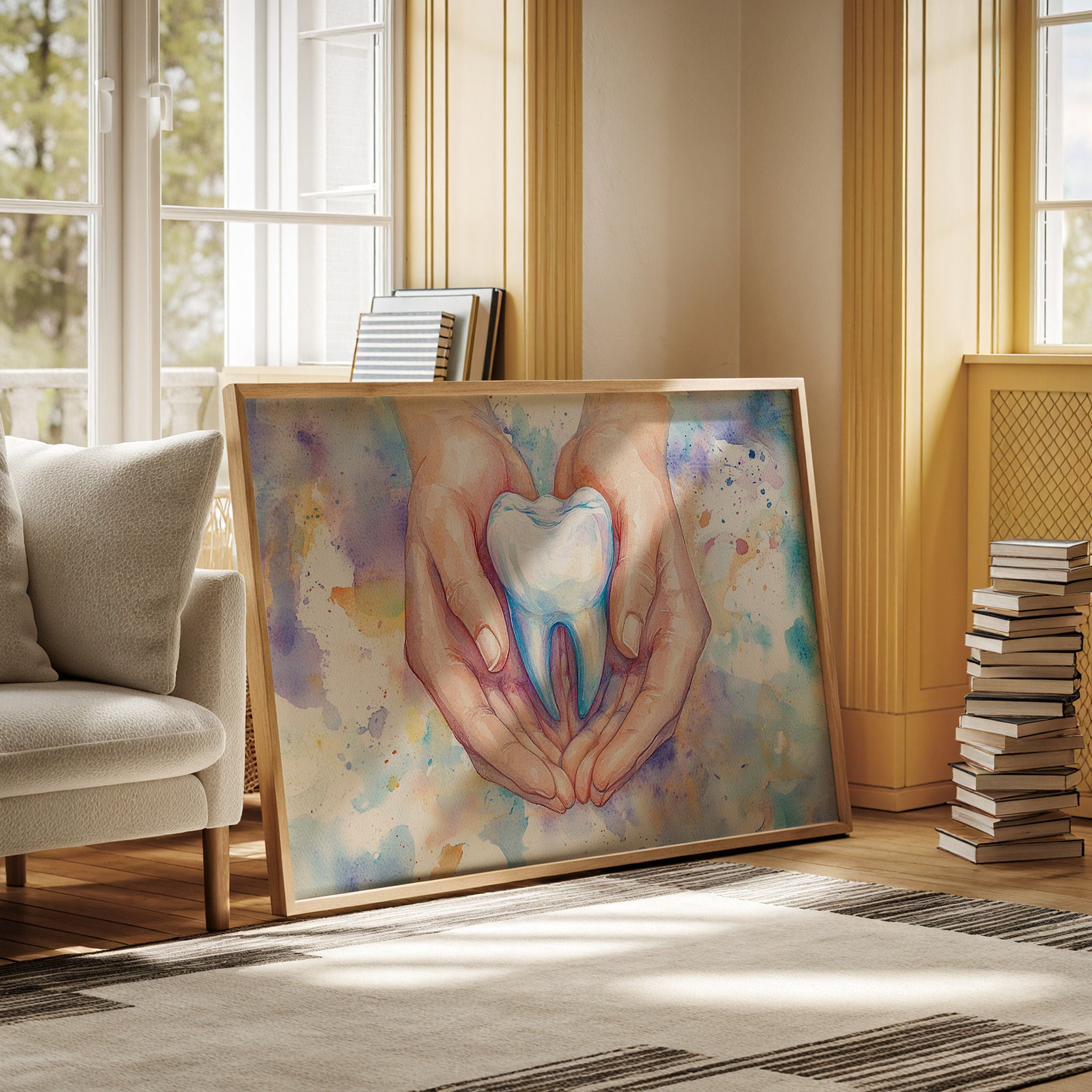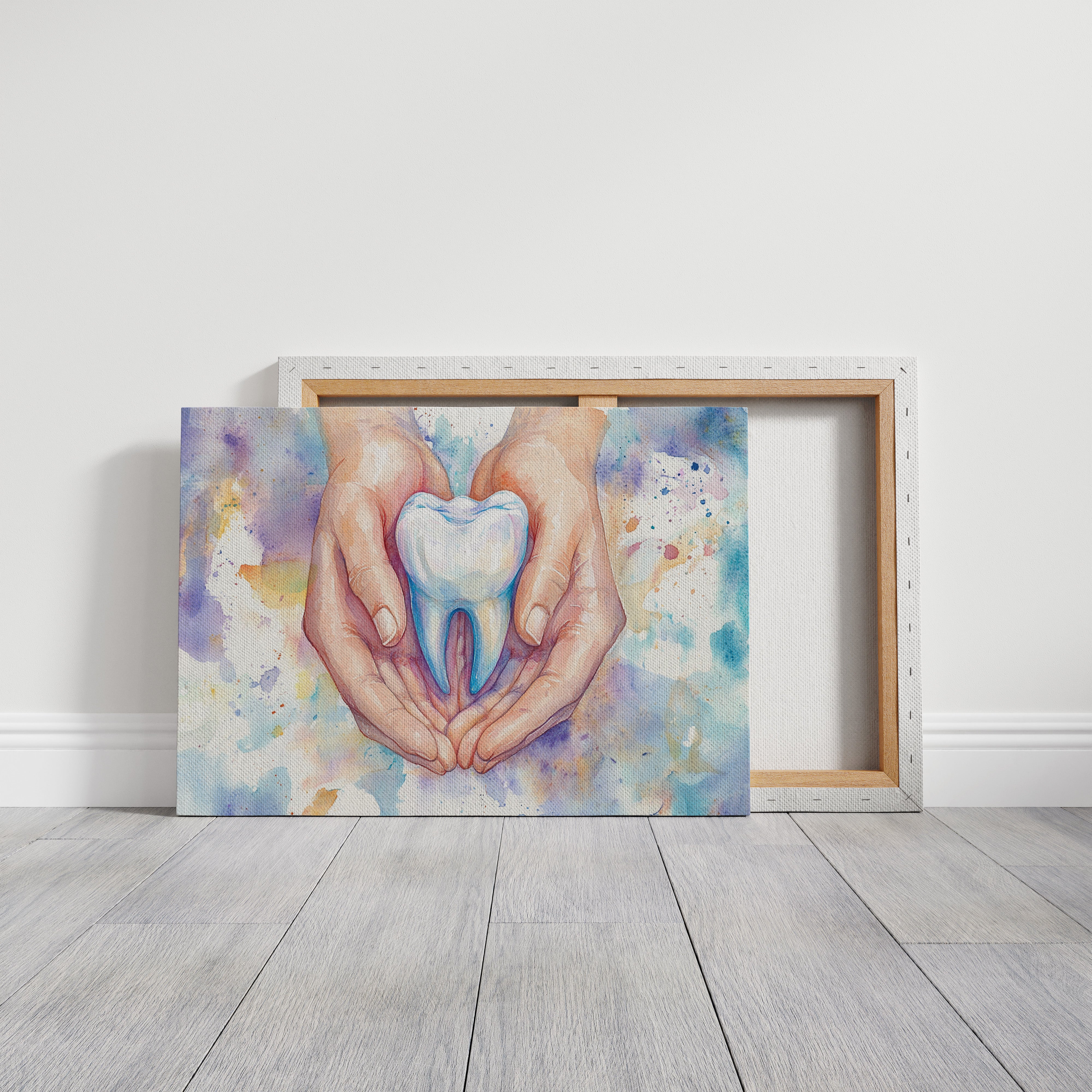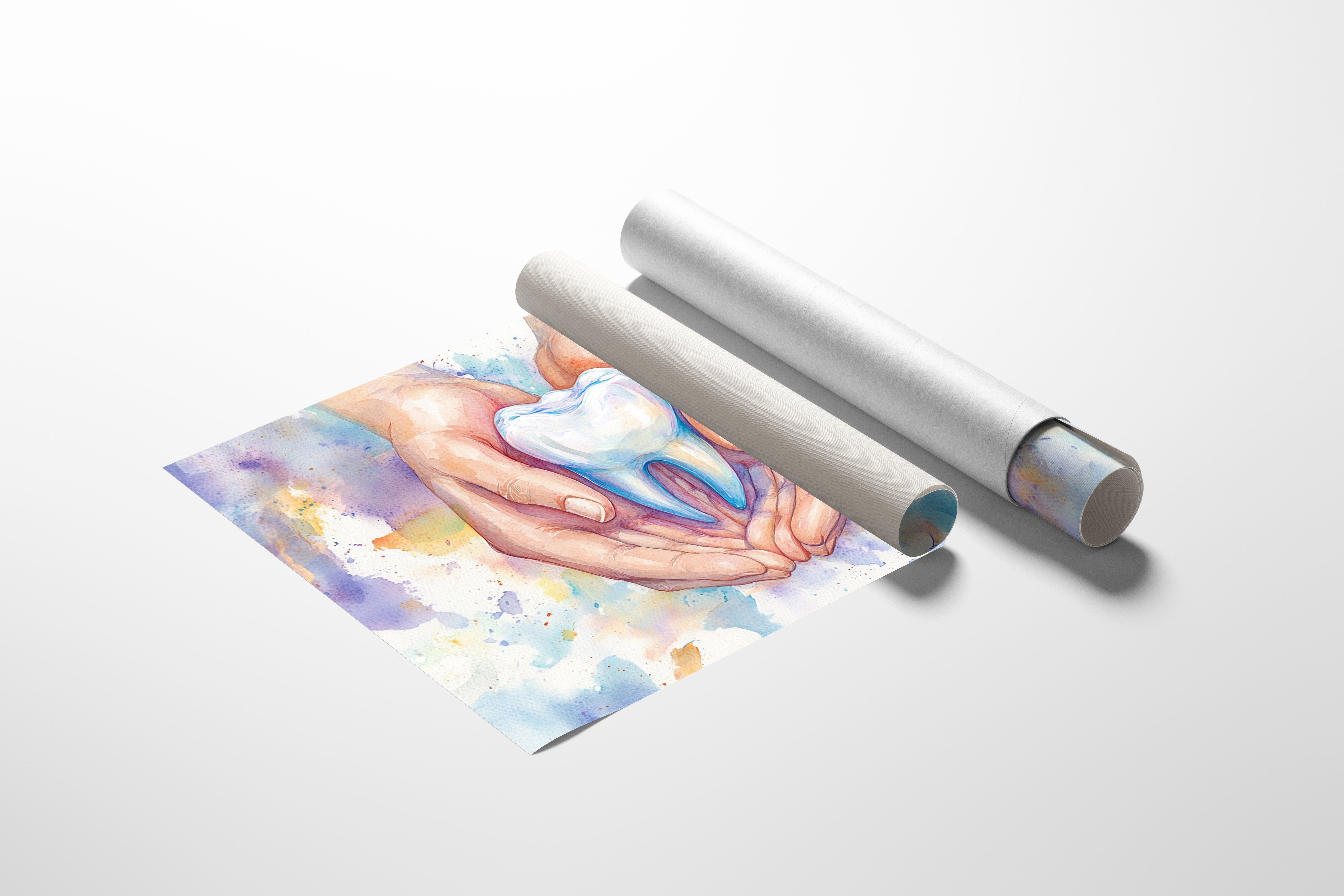 A delicate watercolor captures the tender moment of caring hands cradling a luminous tooth, symbolizing the gentle touch of healing. The soft flesh tones of the hands contrast beautifully with the pristine white and cool blue hues of the molar, while splashes of purple, yellow, and turquoise dance in the background like distant stars. The artistic rendering transforms a clinical subject into something deeply human and nurturing, with careful attention to anatomical detail and ethereal watercolor techniques. This piece would bring a perfect balance of professionalism and artistry to a dental office waiting room or consultation space.