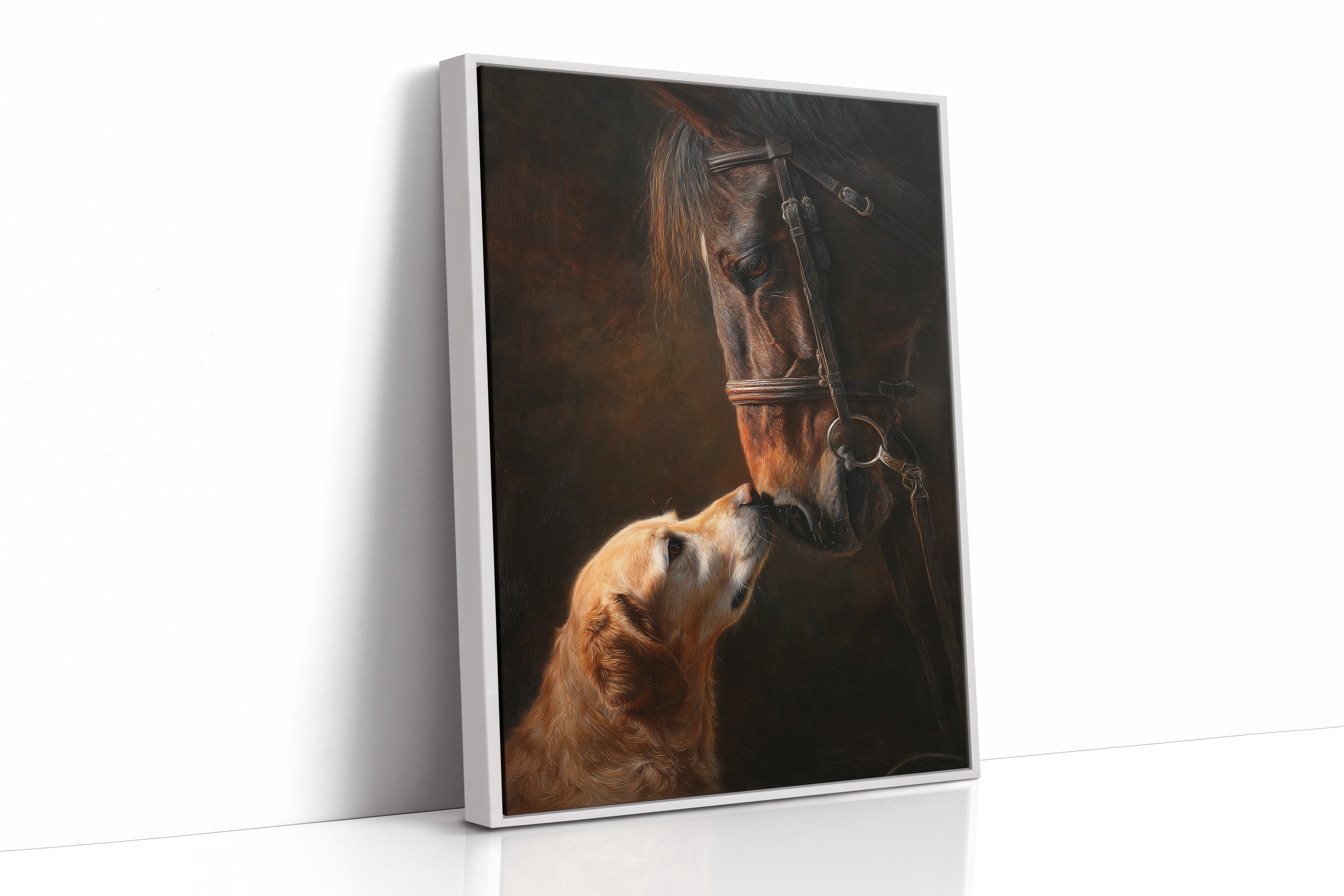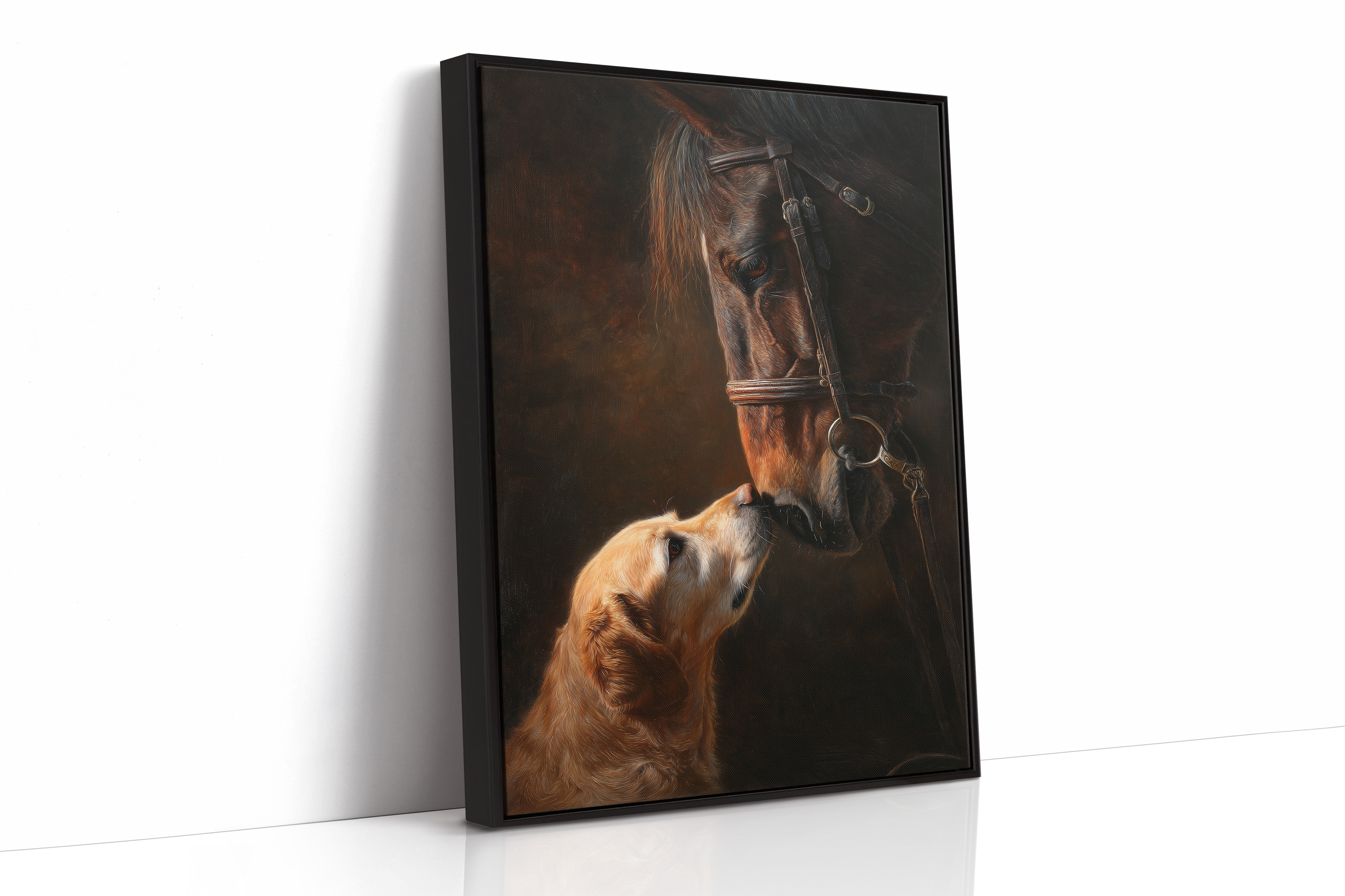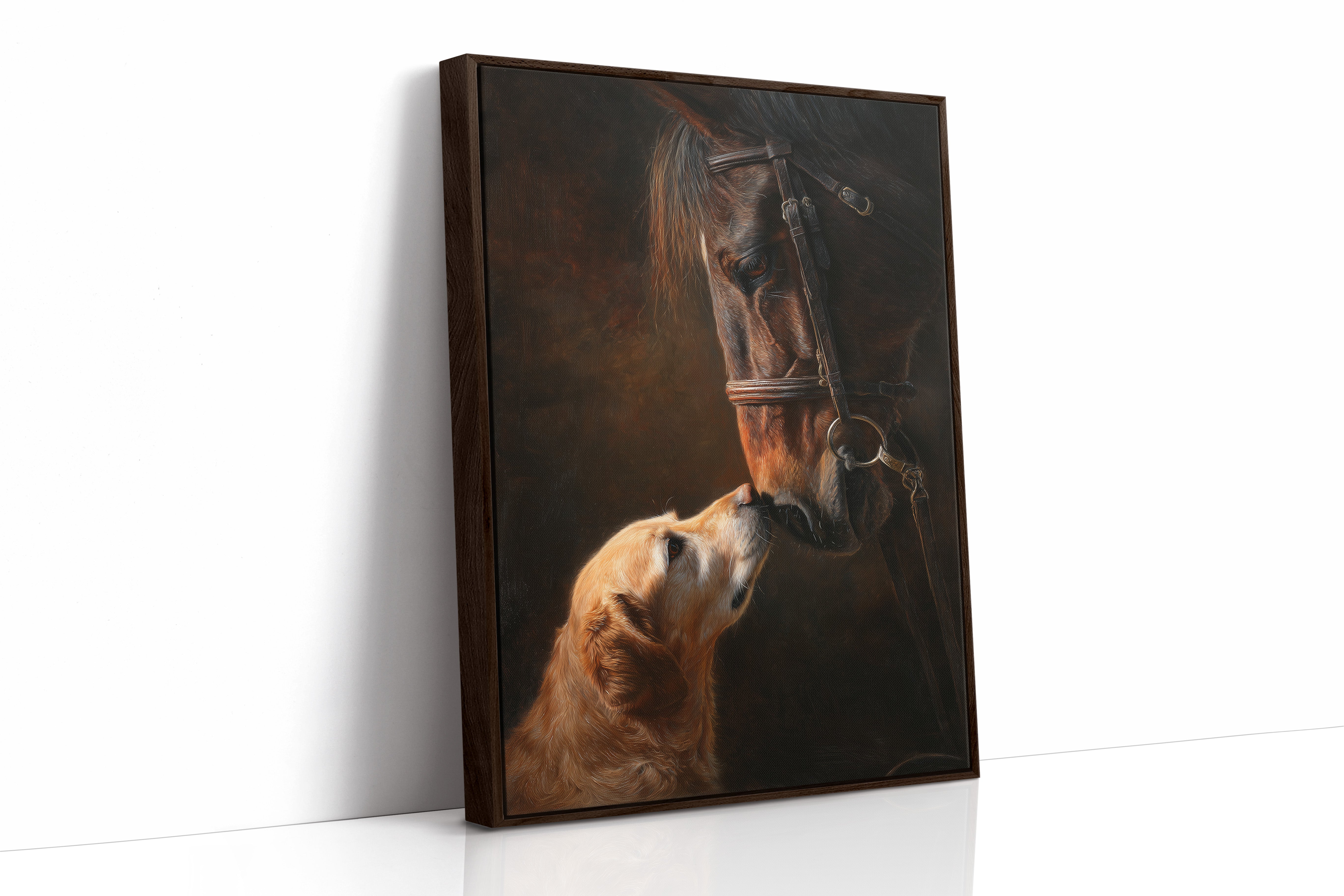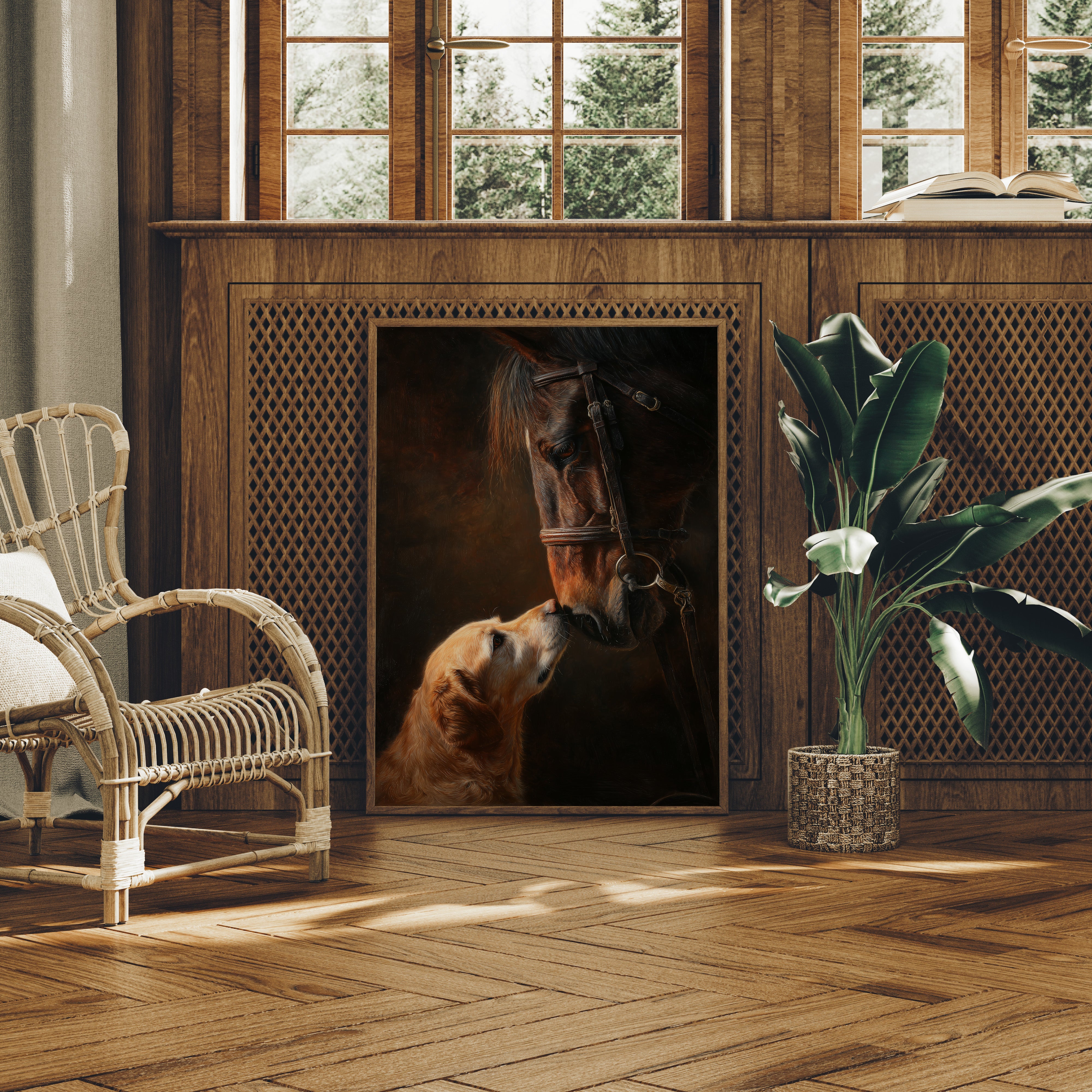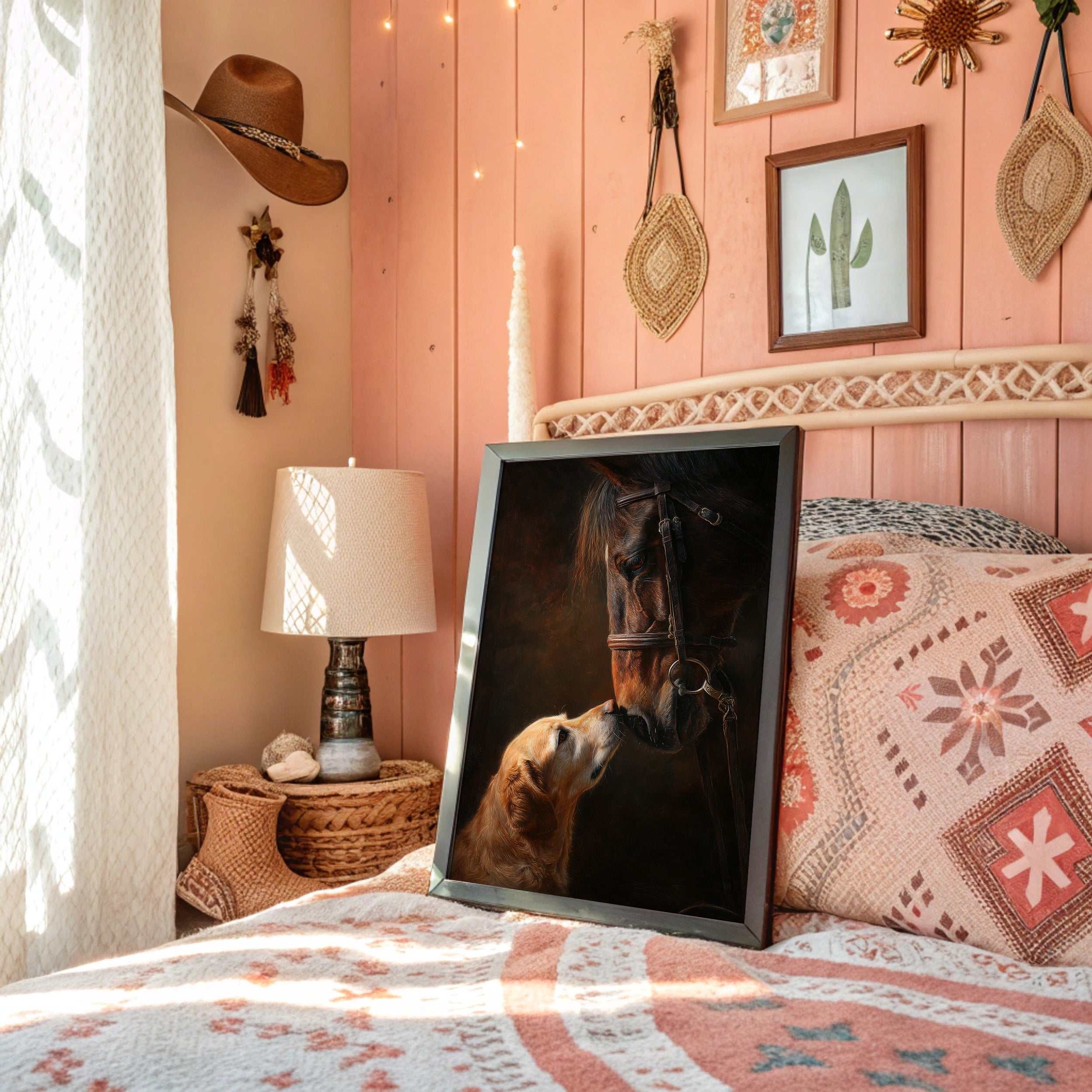In the depths of a moody portrait, two souls connect - a noble horse and faithful dog share an intimate moment against a rich dark background. The warm chestnut and golden tones create a striking contrast, while the careful composition captures the gentle trust between these ranch companions. The scene speaks of loyalty, friendship, and the timeless bond between working animals. This striking piece brings rustic elegance to a modern ranch house, contemporary farmhouse, or any space celebrating the spirit of the American West.
