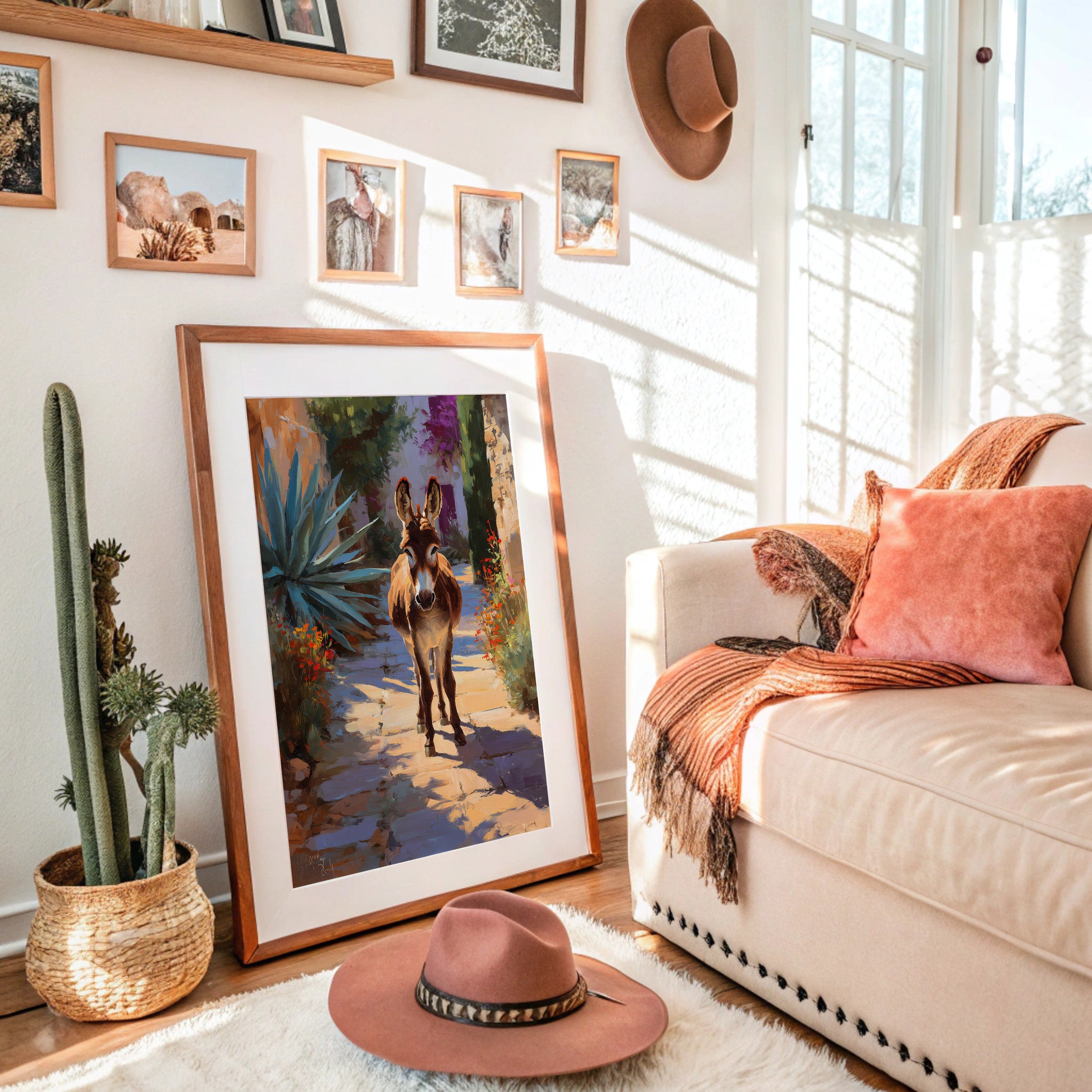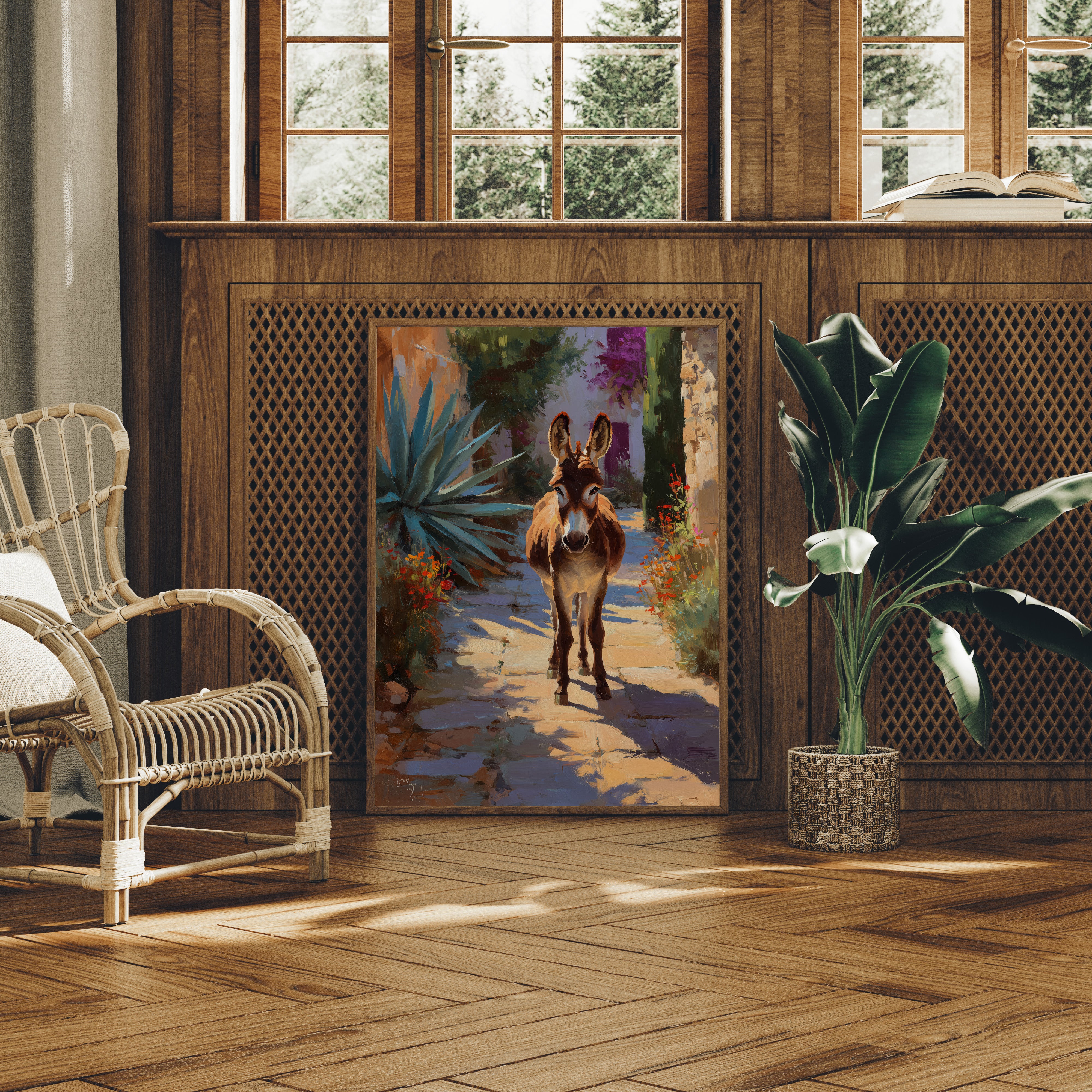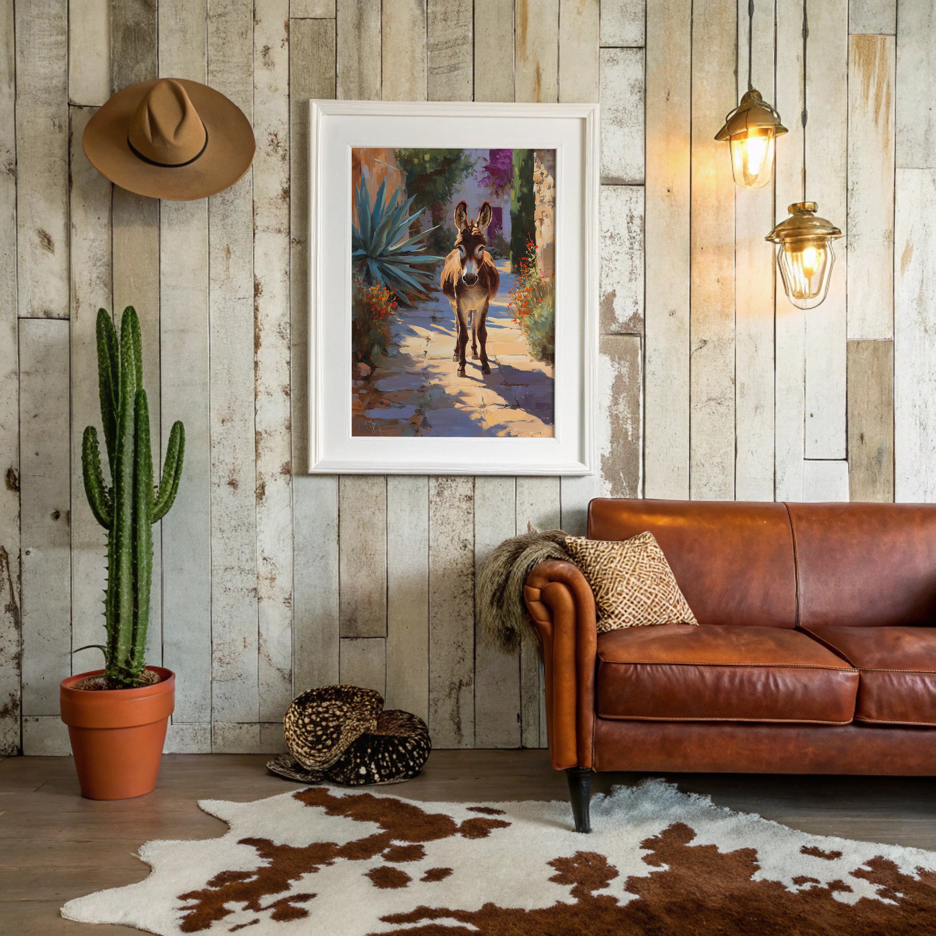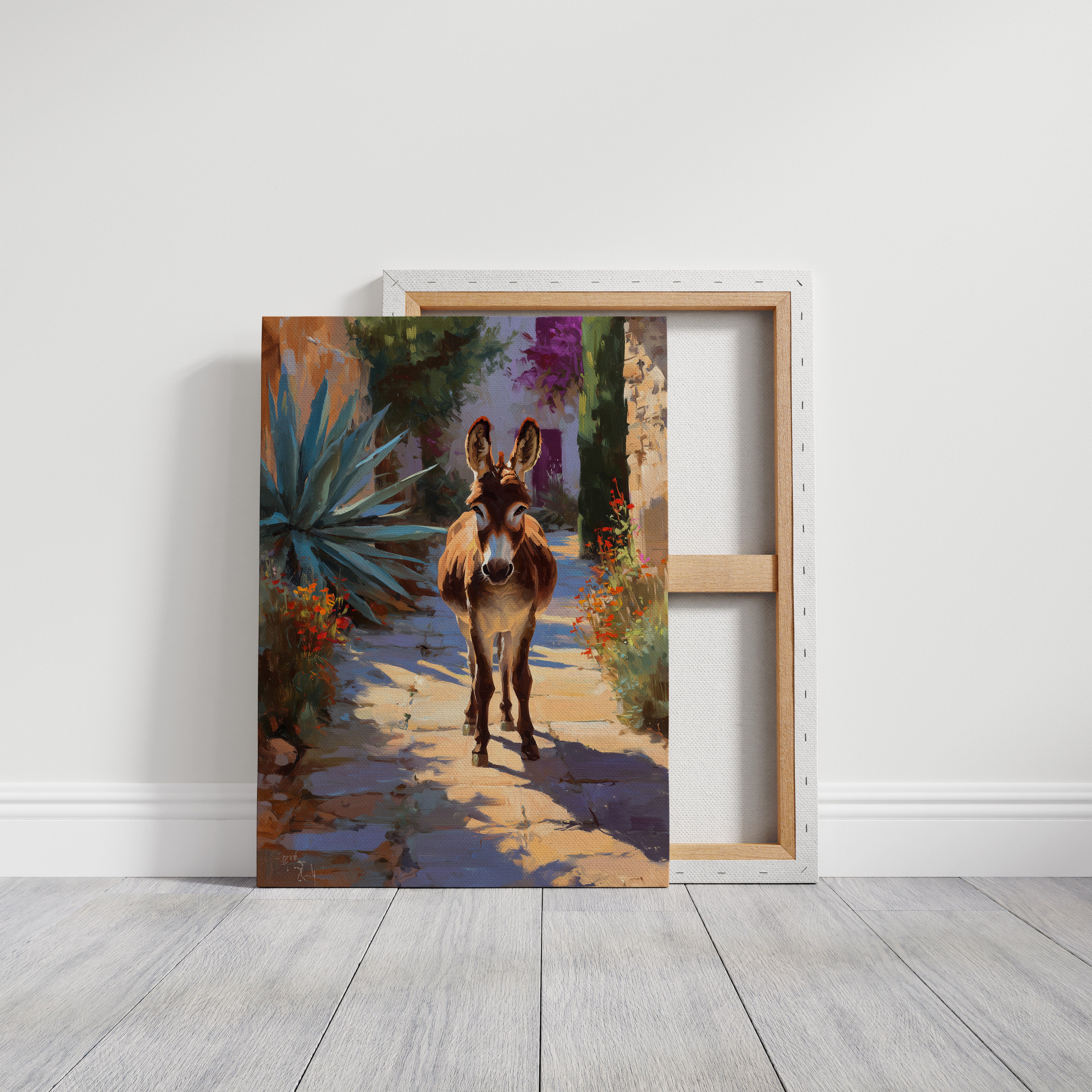 A sun-dappled path winds through a vibrant garden, where a curious donkey ambles forward with gentle determination. Agave plants stretch their blue-green arms alongside splashes of purple and orange wildflowers, creating a secret garden feel in this desert oasis. The play of light and shadow dances across the sandy trail, while the donkey's warm brown coat catches the golden afternoon sun. This enchanting scene brings a touch of rustic charm and whimsical storytelling to any room. Perfect for a southwestern-inspired living space or a cozy reading nook where tales of desert adventures come to life.