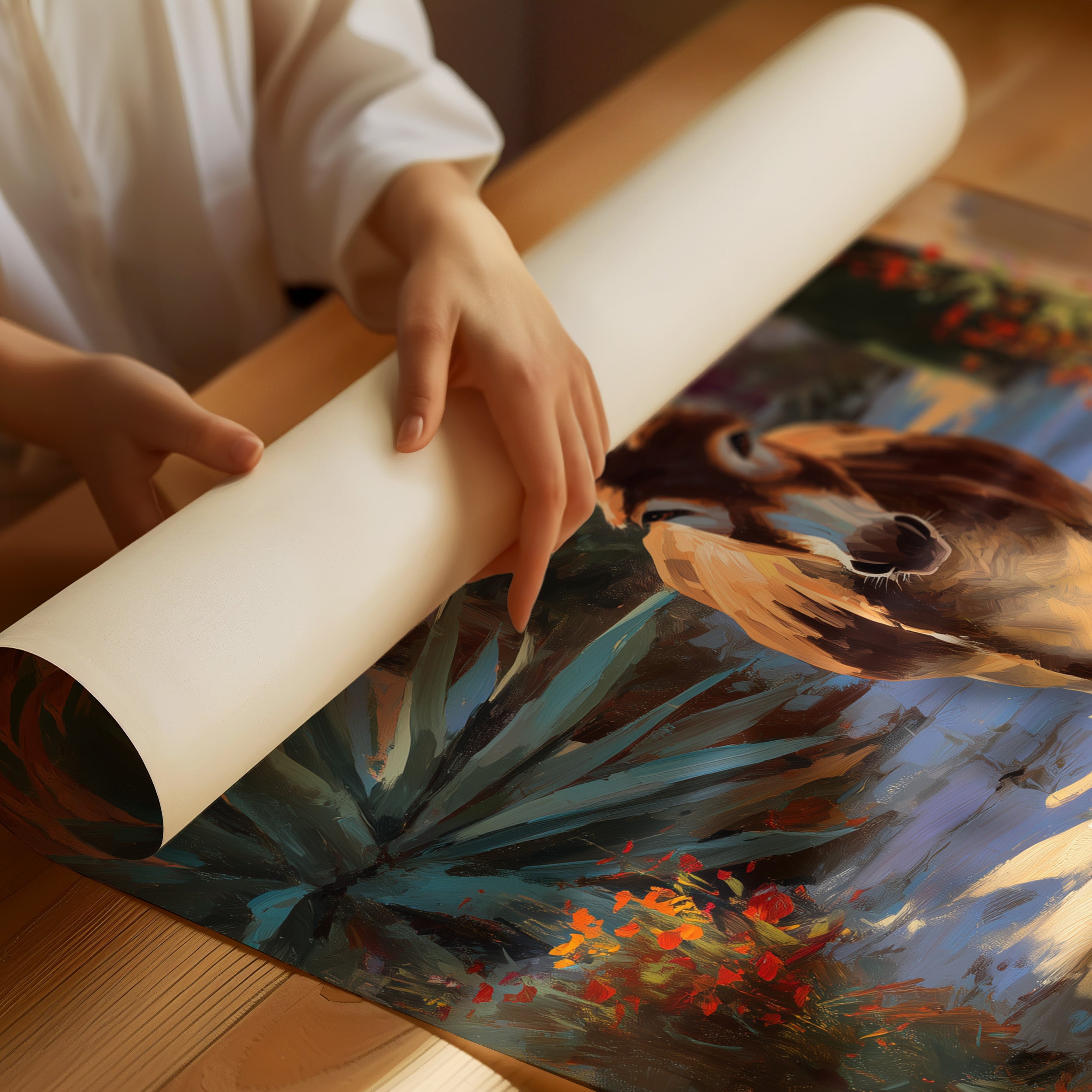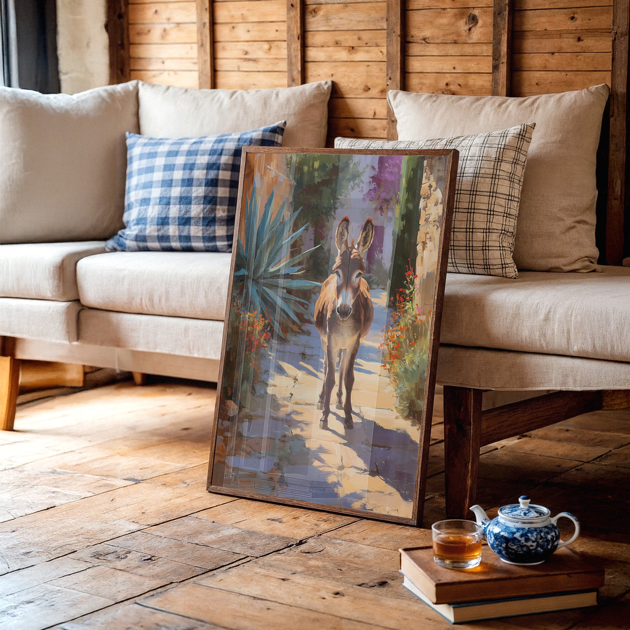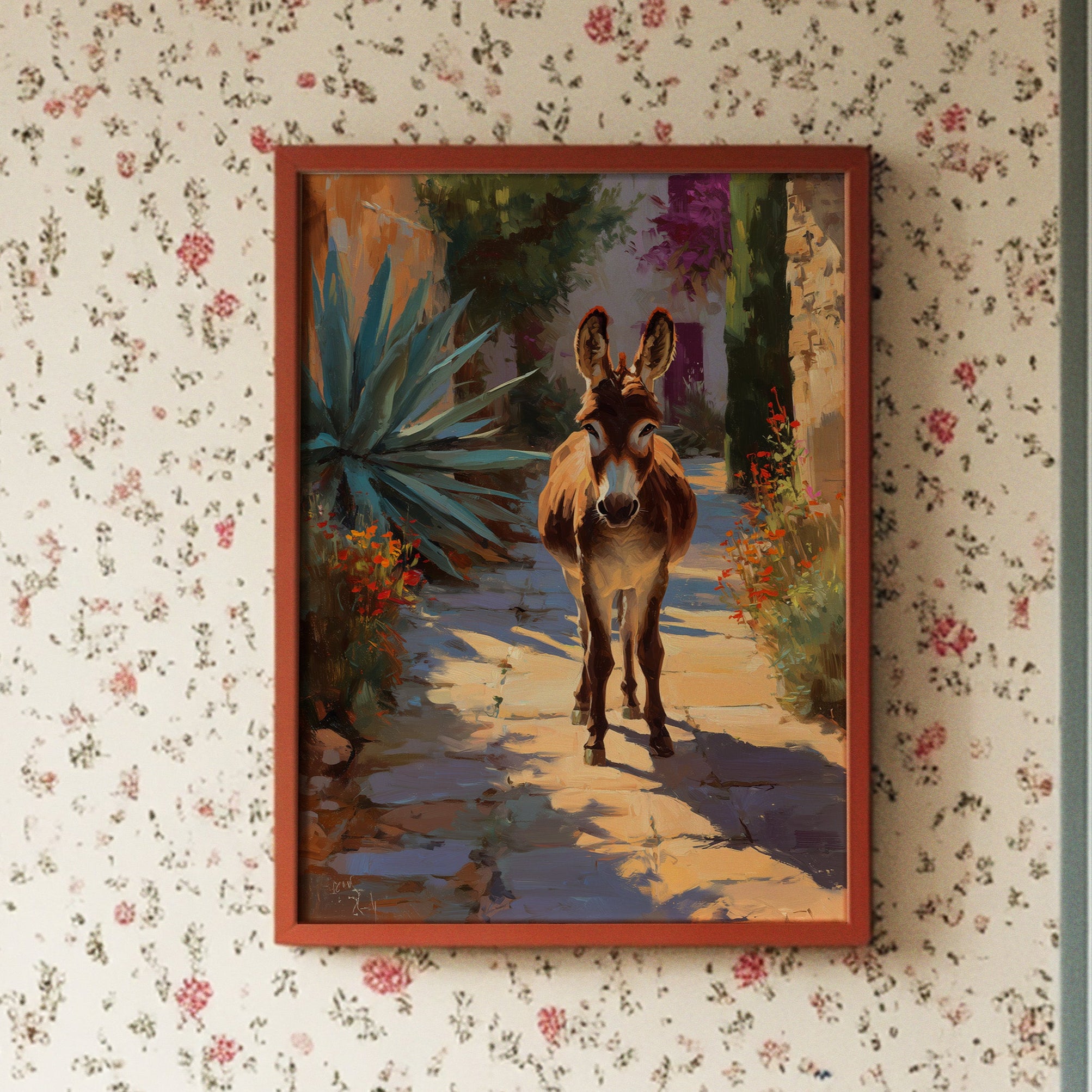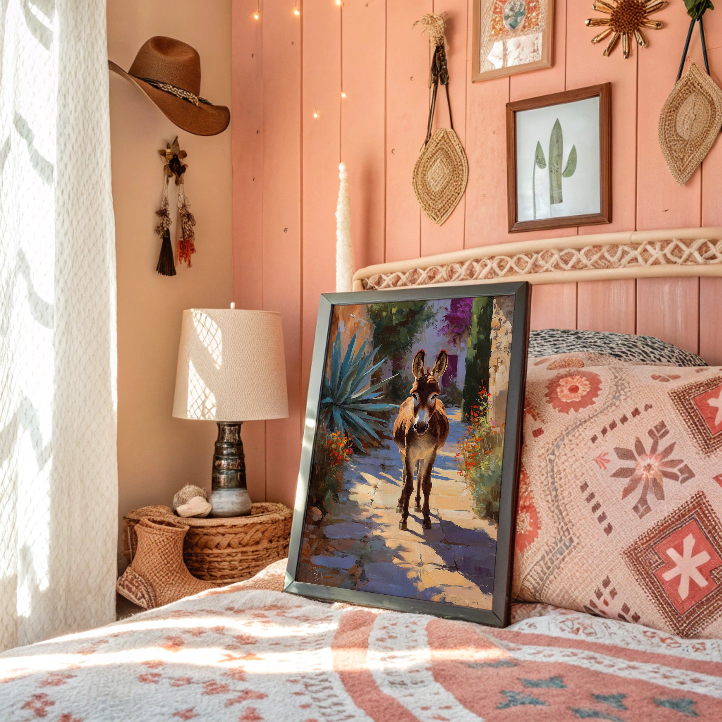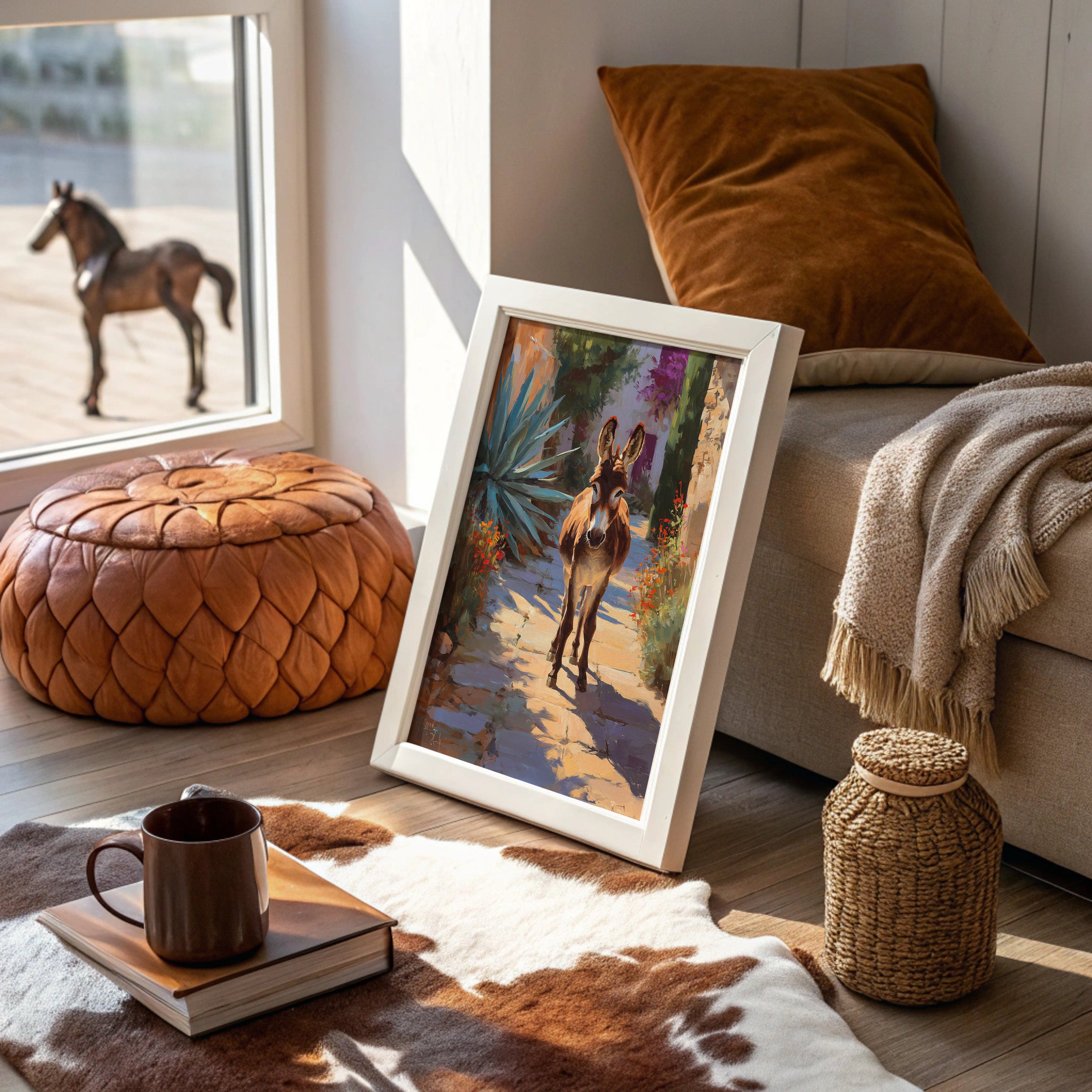 A sun-dappled path winds through a vibrant garden, where a curious donkey ambles forward with gentle determination. Agave plants stretch their blue-green arms alongside splashes of purple and orange wildflowers, creating a secret garden feel in this desert oasis. The play of light and shadow dances across the sandy trail, while the donkey's warm brown coat catches the golden afternoon sun. This enchanting scene brings a touch of rustic charm and whimsical storytelling to any room. Perfect for a southwestern-inspired living space or a cozy reading nook where tales of desert adventures come to life.