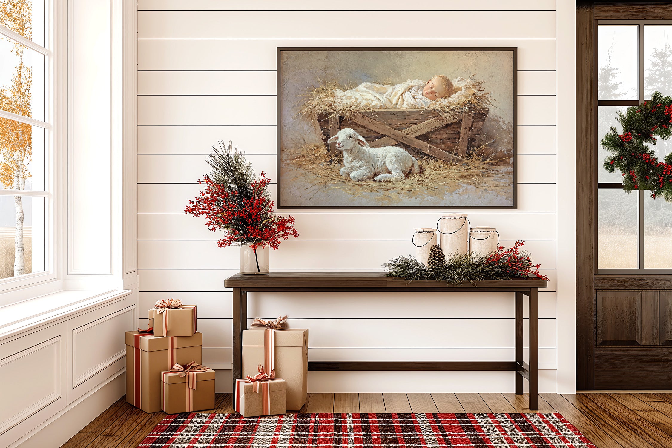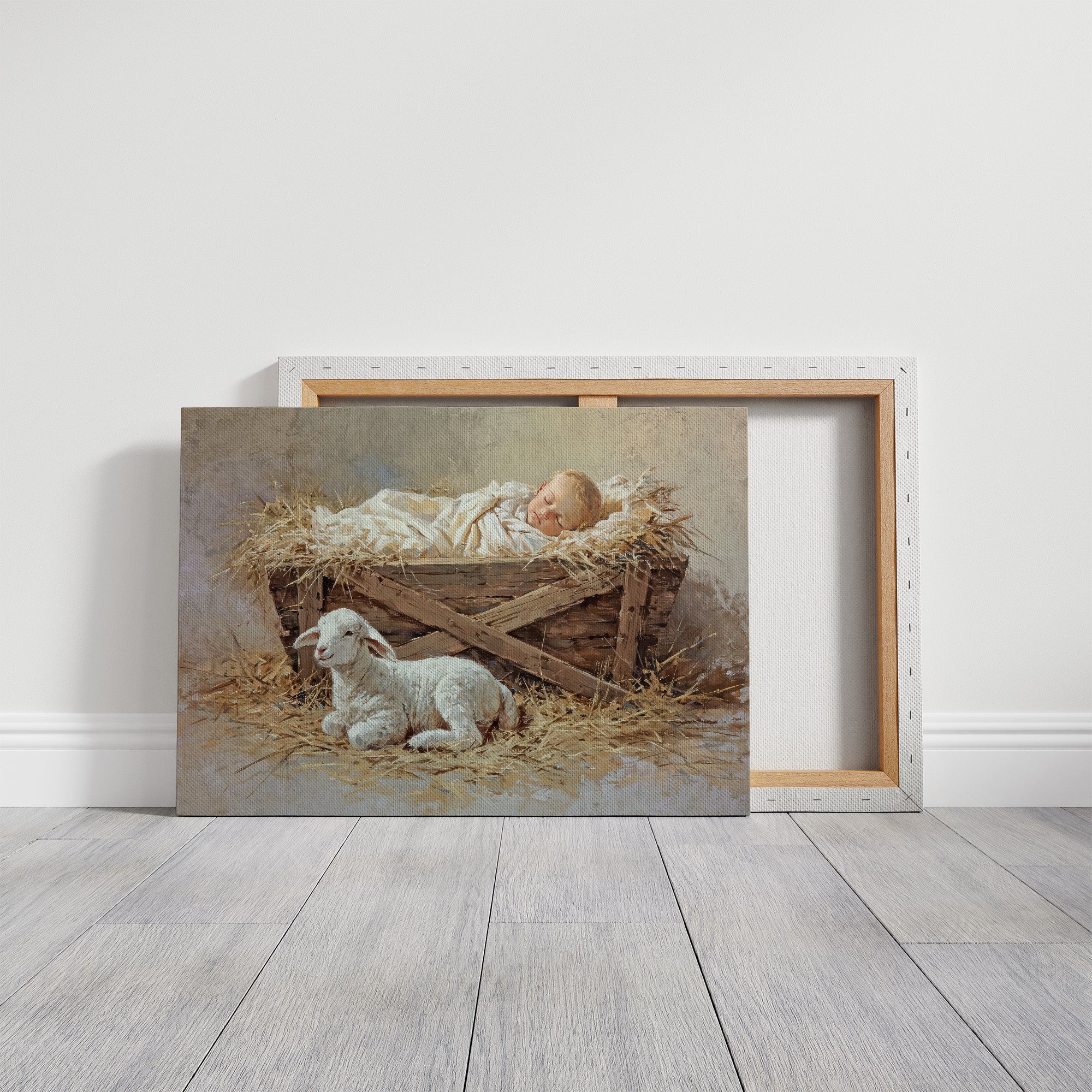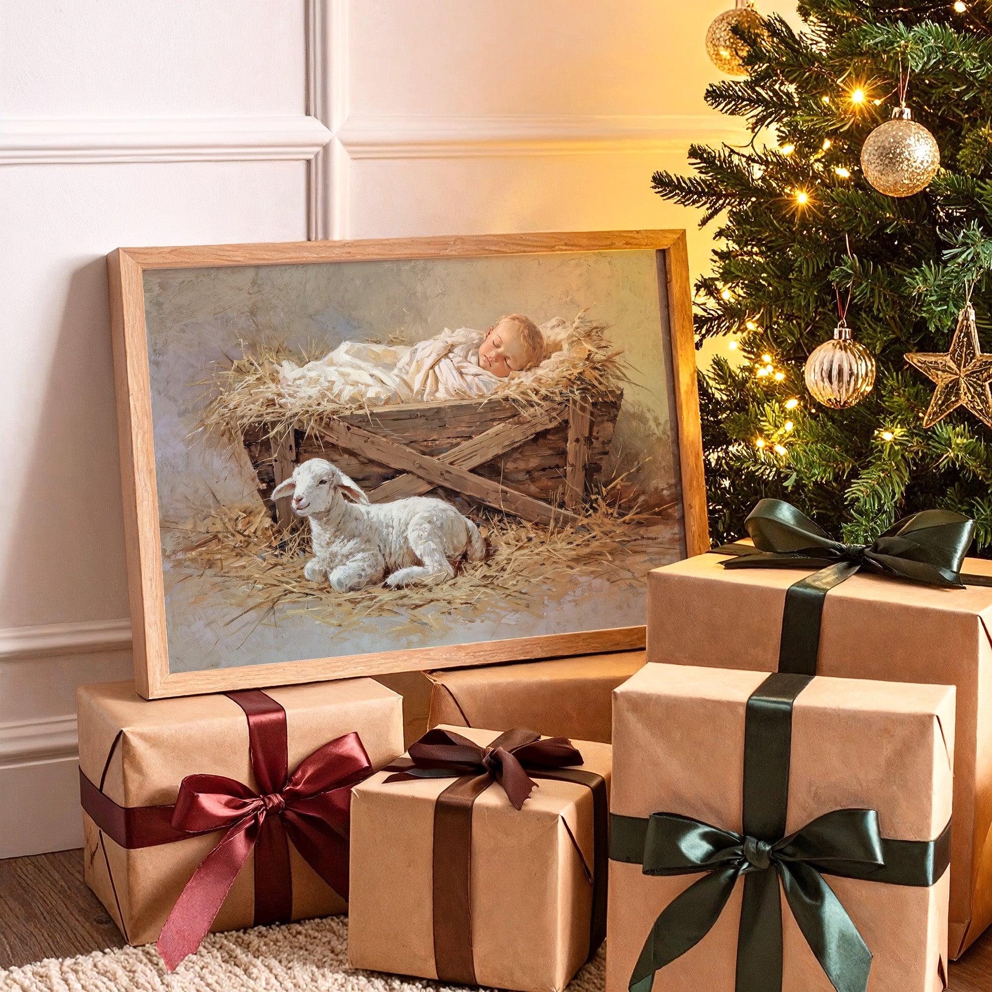 Soft winter light streams across a scene of pure serenity, where innocence finds rest in its simplest form. A sleeping infant lies peacefully in a rustic manger filled with golden straw, while a gentle lamb keeps faithful watch below. The artist's masterful brushstrokes create a tender atmosphere in muted tones of cream, wheat, and subtle blues, capturing a moment of divine tranquility. This heartfelt composition resonates with themes of protection, peace, and the pure beauty of new life. Perfect for bringing warmth and spiritual meaning to a nursery, living room, or any quiet space seeking a touch of grace during the holiday season.