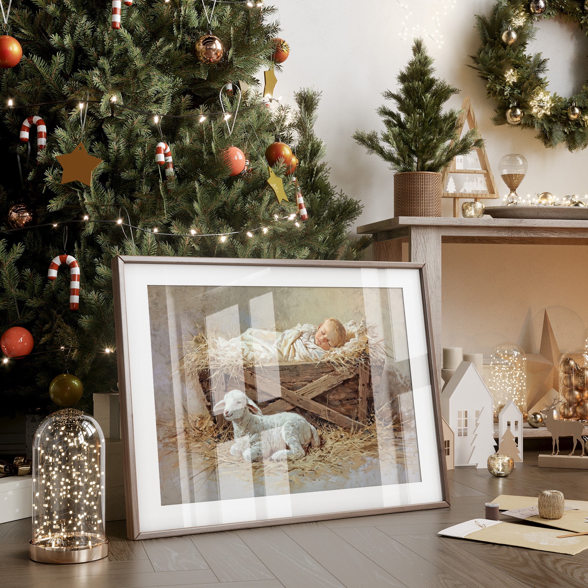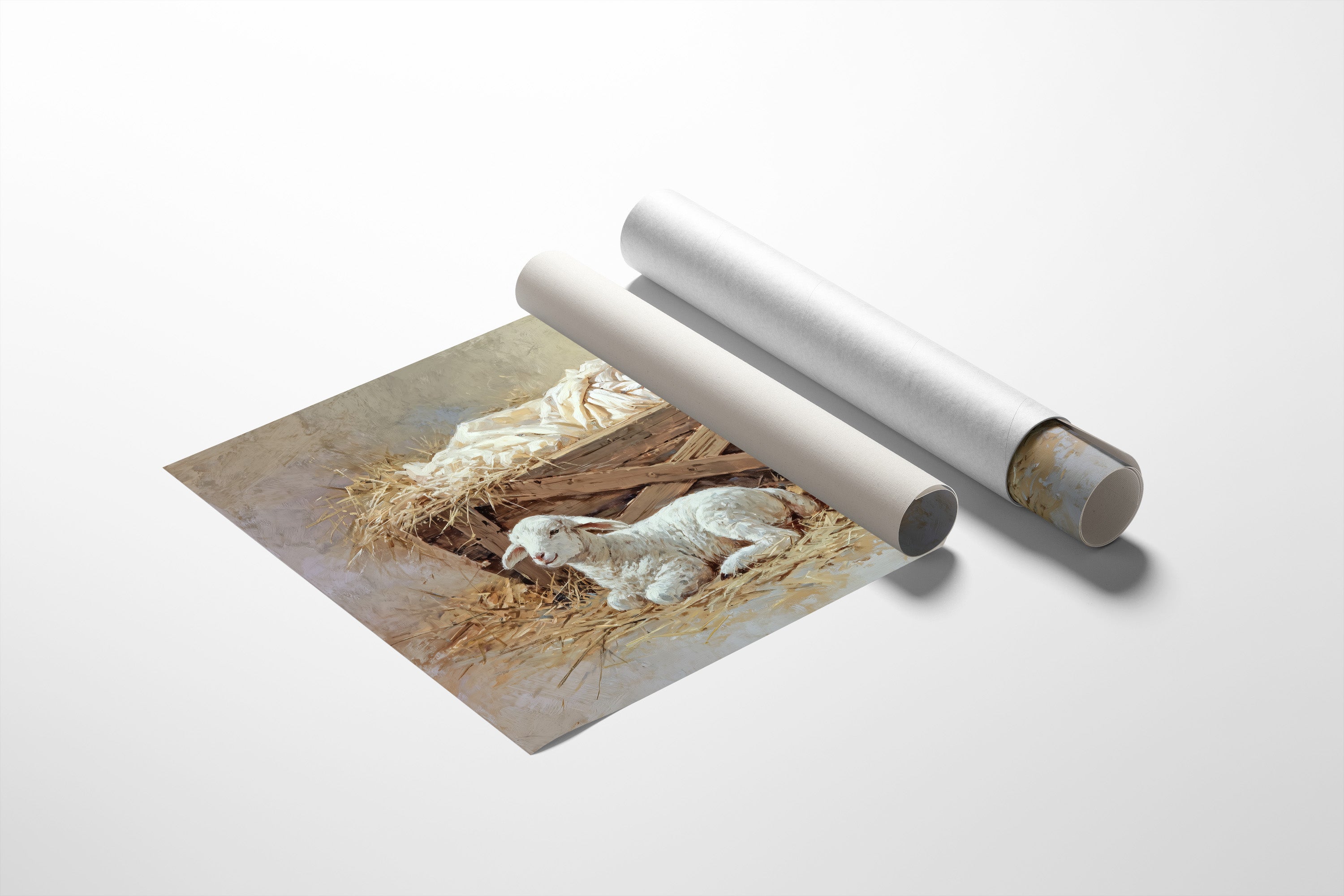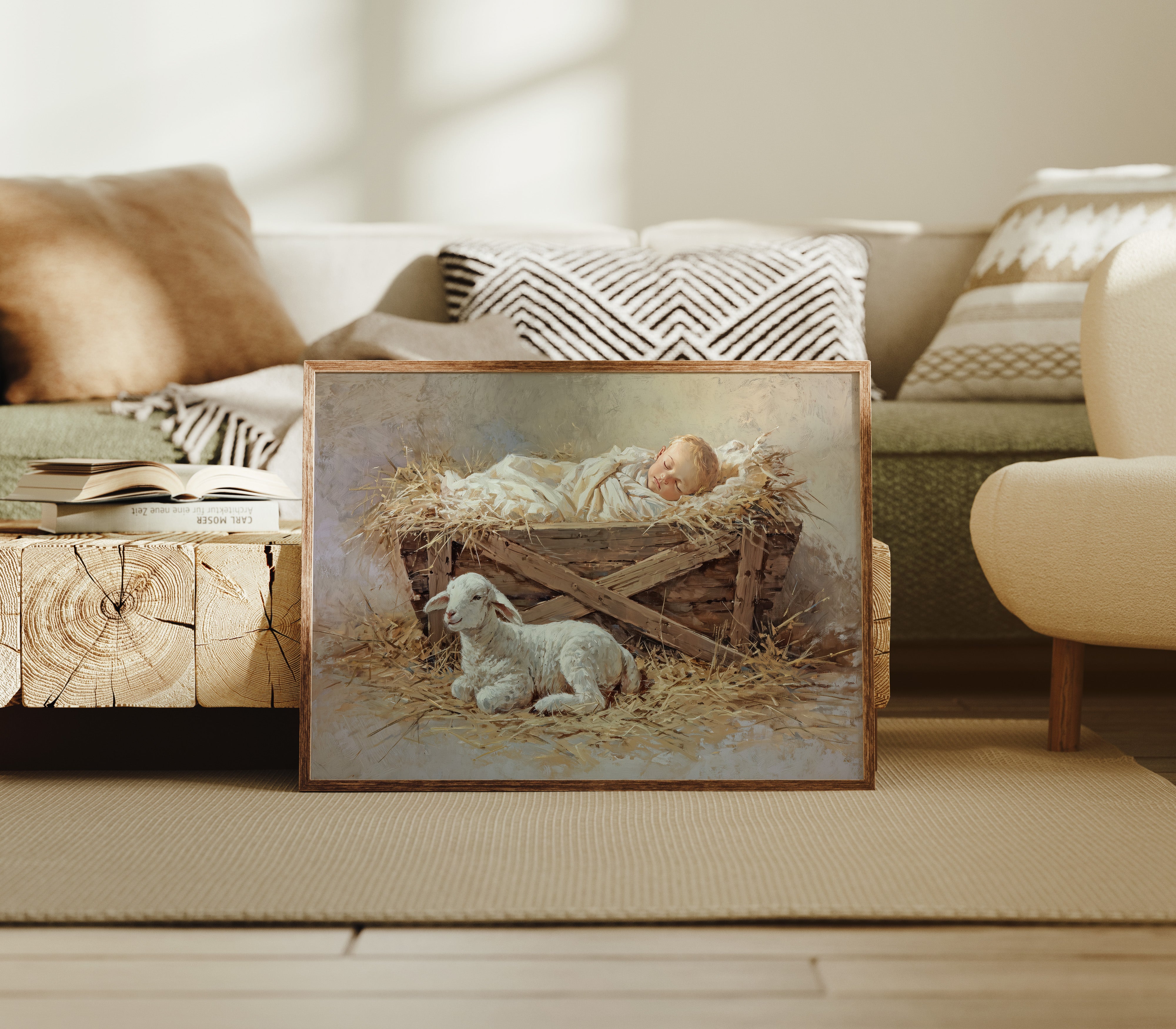 Soft winter light streams across a scene of pure serenity, where innocence finds rest in its simplest form. A sleeping infant lies peacefully in a rustic manger filled with golden straw, while a gentle lamb keeps faithful watch below. The artist's masterful brushstrokes create a tender atmosphere in muted tones of cream, wheat, and subtle blues, capturing a moment of divine tranquility. This heartfelt composition resonates with themes of protection, peace, and the pure beauty of new life. Perfect for bringing warmth and spiritual meaning to a nursery, living room, or any quiet space seeking a touch of grace during the holiday season.