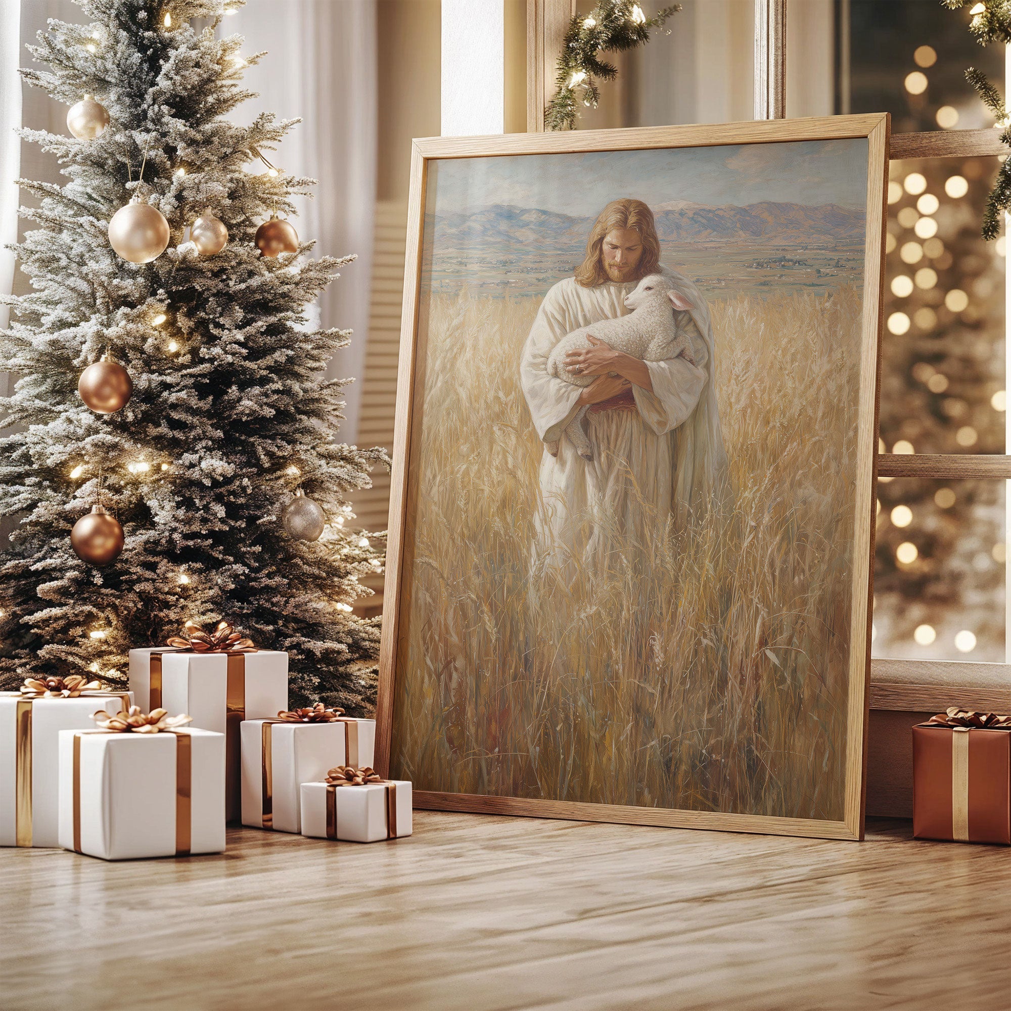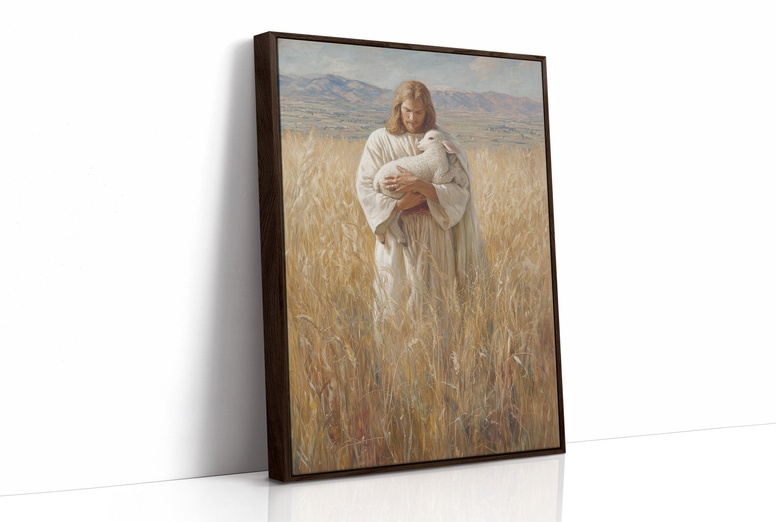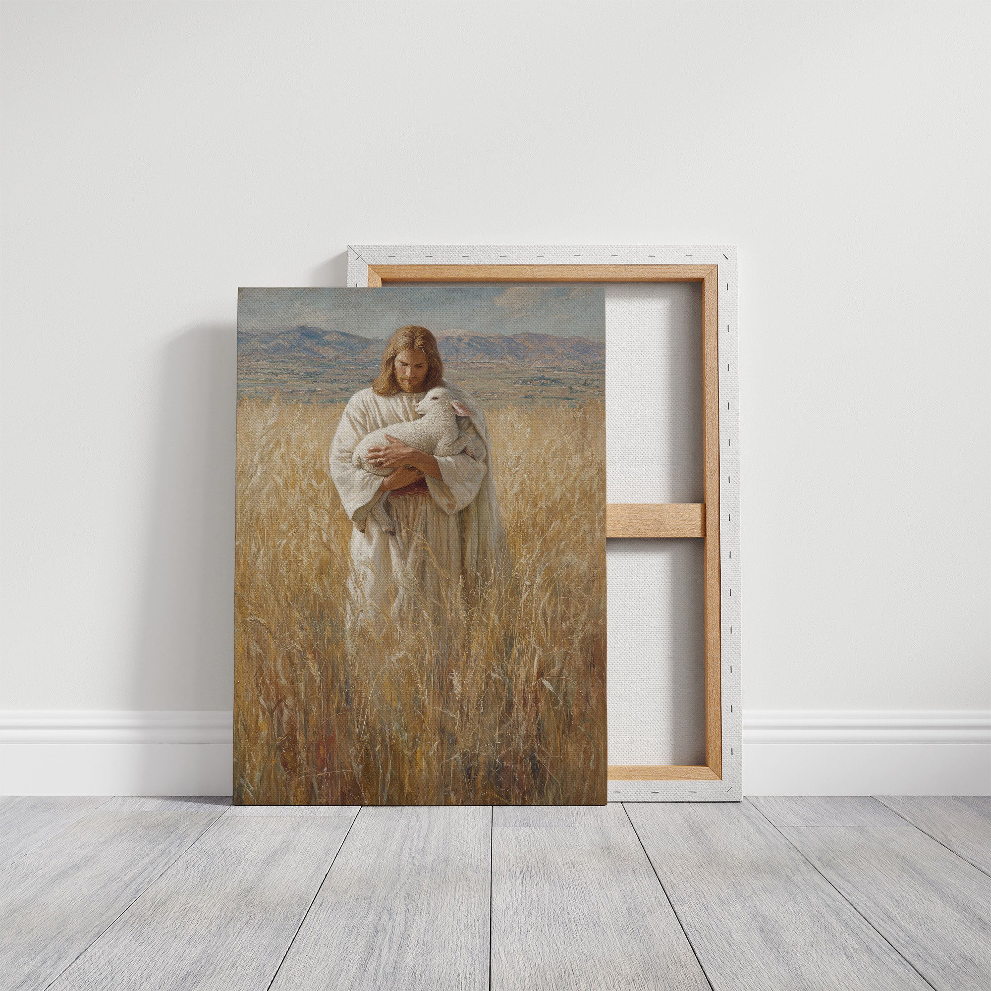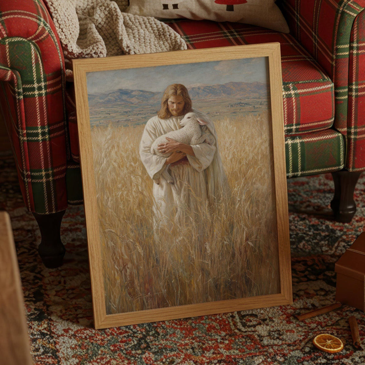 Warm golden wheat sways beneath mountains painted in soft morning light. The scene captures a tender moment of compassion and care, set against nature's expansive canvas. Gentle brushstrokes bring the wheat field to life, while distant mountains fade into misty blues and purples, creating depth and serenity. The natural wood frame complements the earthy palette, enhancing the painting's organic warmth. This piece resonates with both traditional and contemporary spaces, bringing a sense of peace and contemplation to any room. Perfect for a quiet reading nook or meditation space where its calming presence can be fully appreciated.