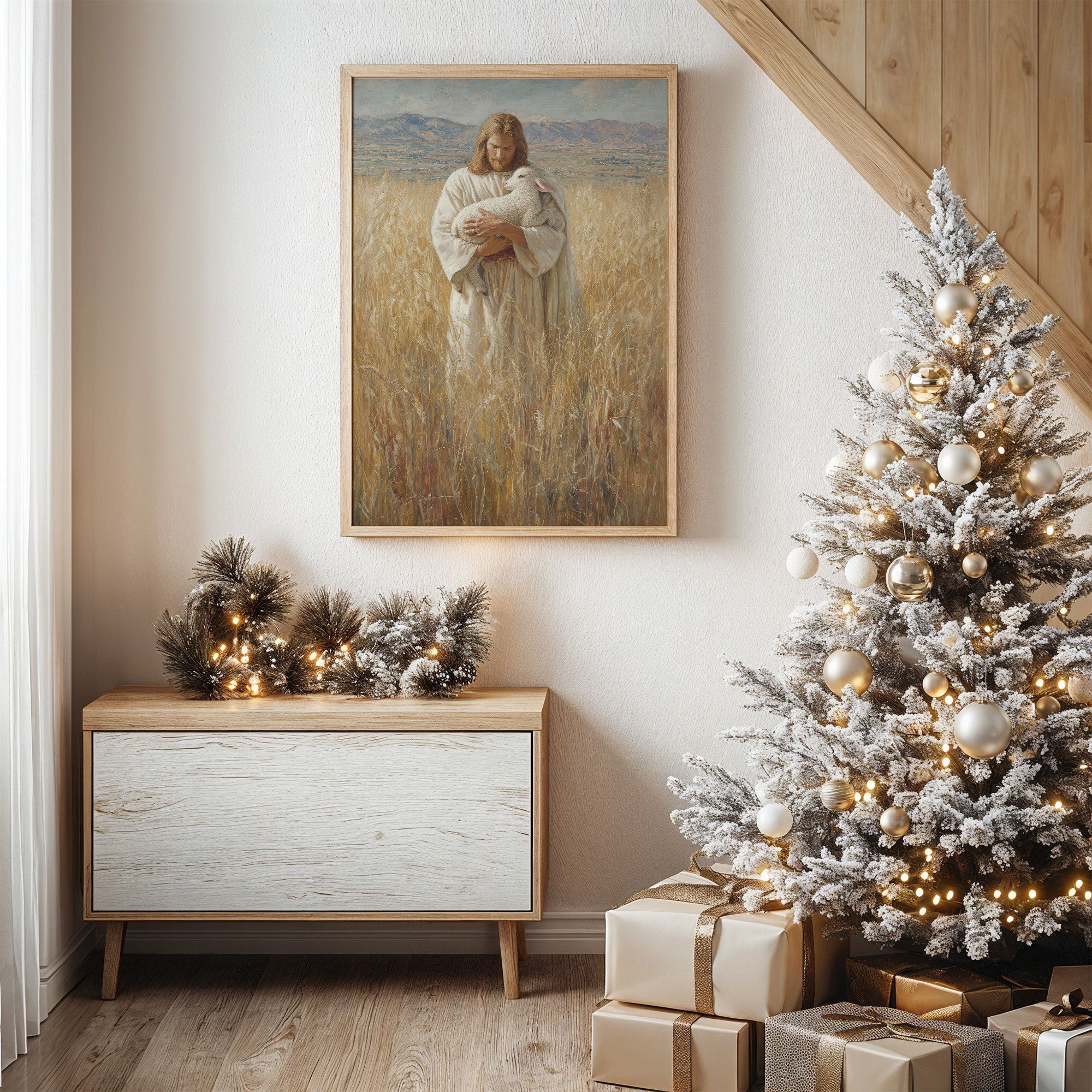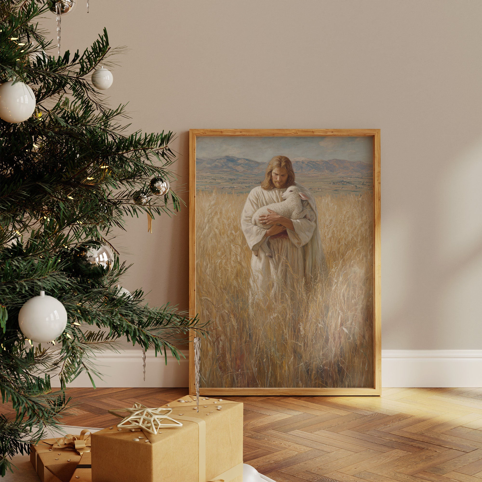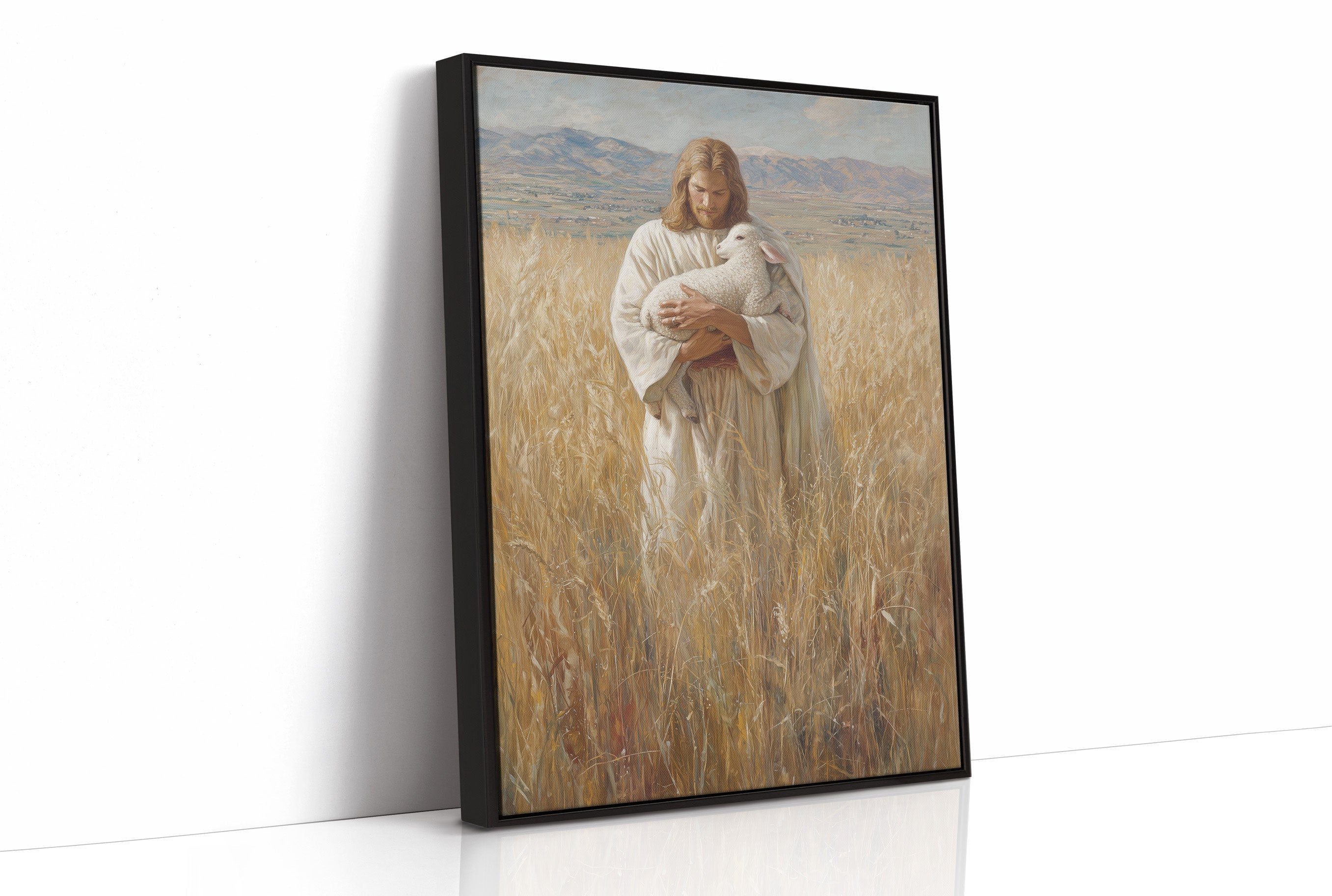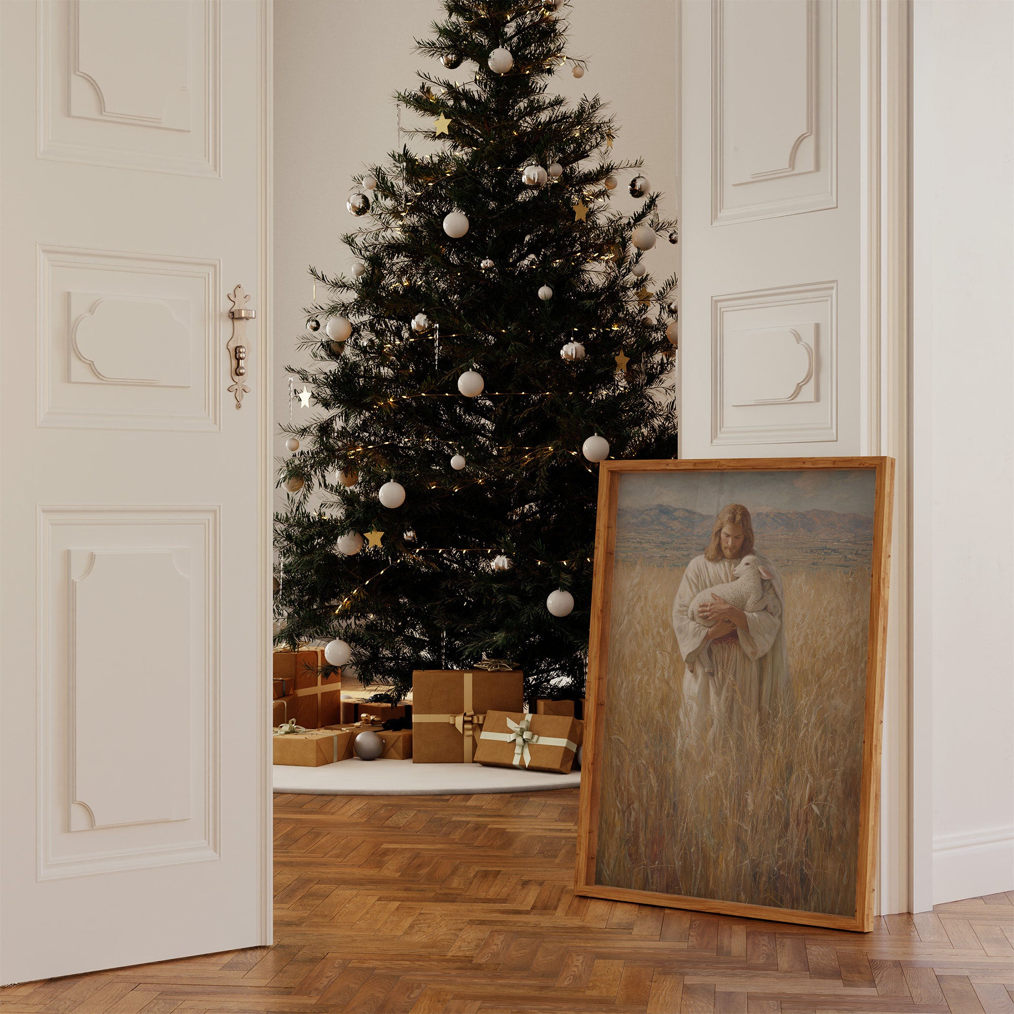 Warm golden wheat sways beneath mountains painted in soft morning light. The scene captures a tender moment of compassion and care, set against nature's expansive canvas. Gentle brushstrokes bring the wheat field to life, while distant mountains fade into misty blues and purples, creating depth and serenity. The natural wood frame complements the earthy palette, enhancing the painting's organic warmth. This piece resonates with both traditional and contemporary spaces, bringing a sense of peace and contemplation to any room. Perfect for a quiet reading nook or meditation space where its calming presence can be fully appreciated.