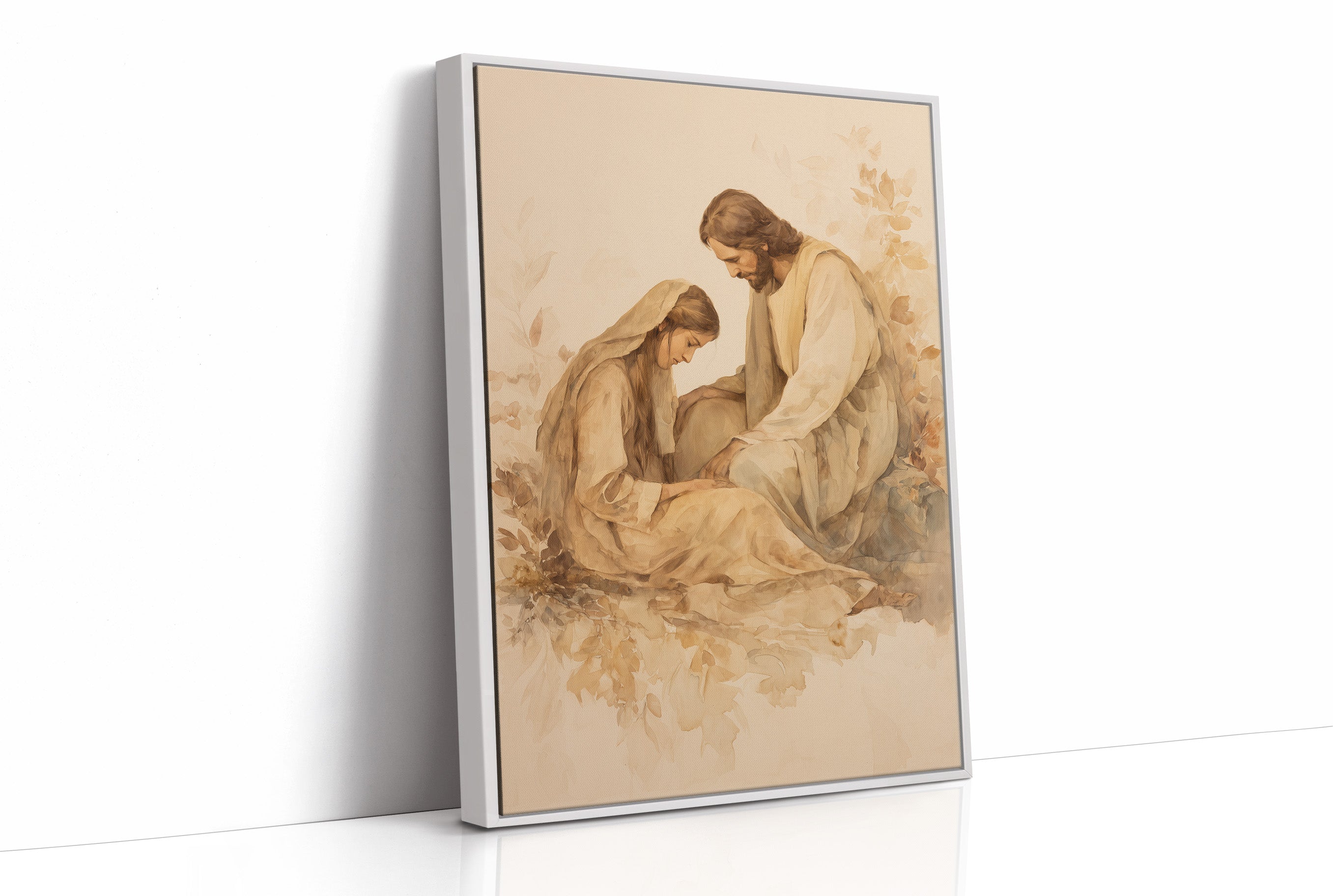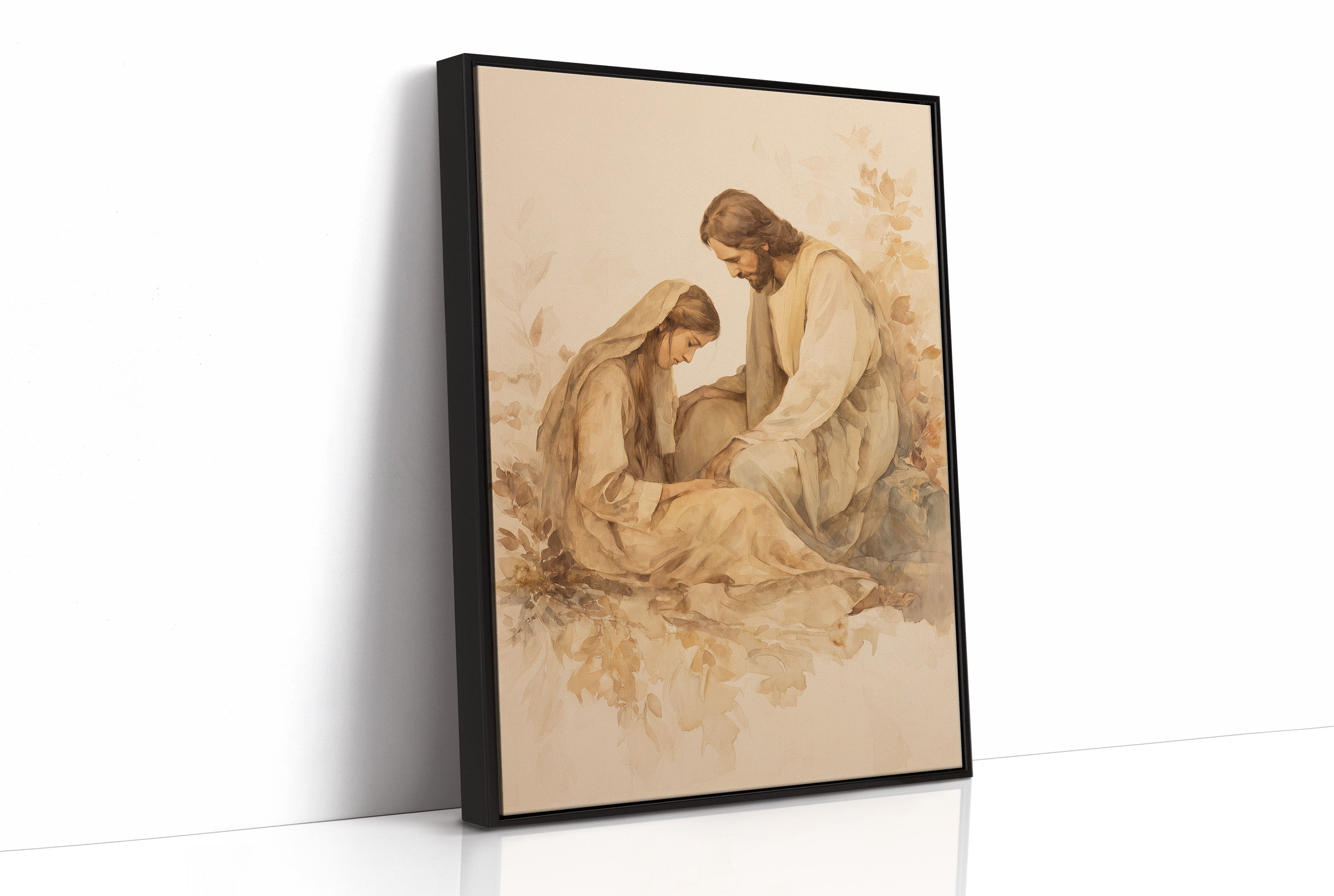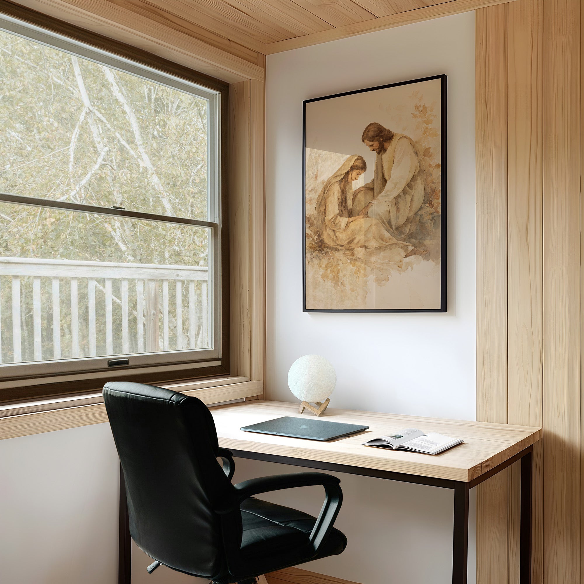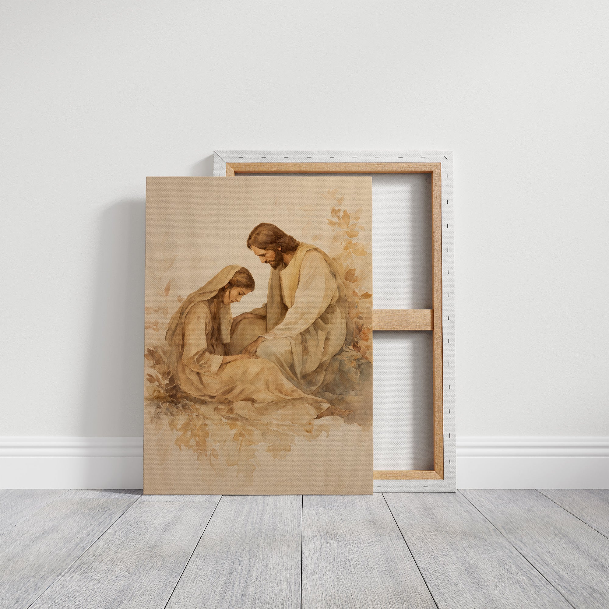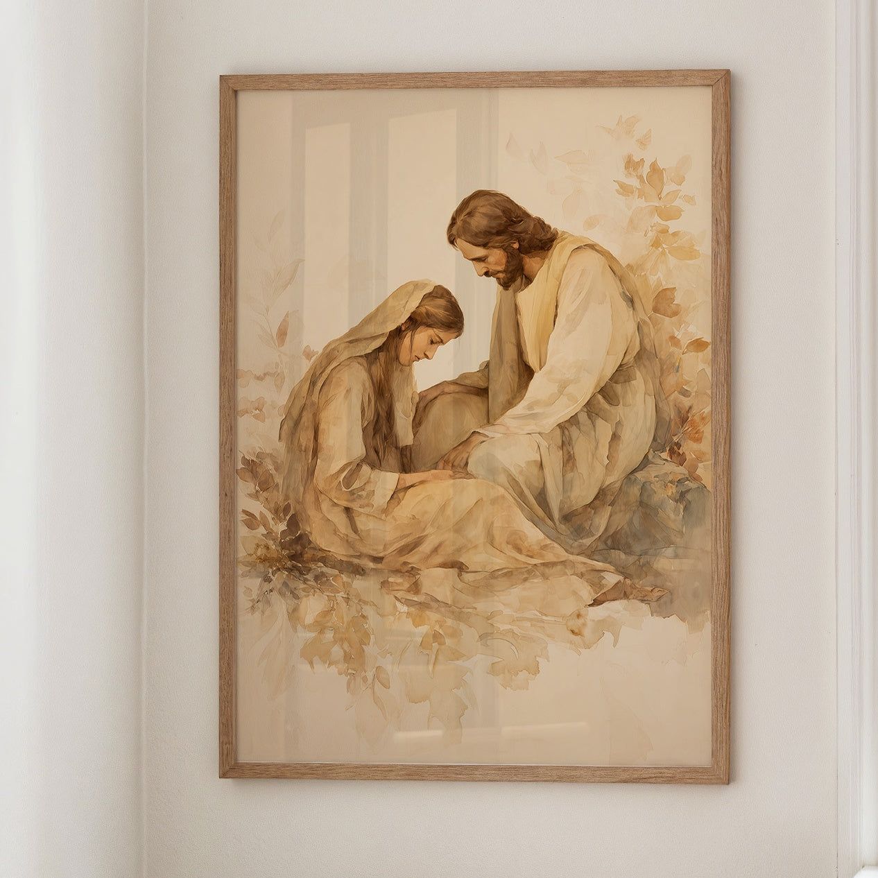 Watercolor warmth spills across the scene, capturing a tender interaction bathed in soft sepia tones. The delicate brushstrokes reveal figures in repose, their flowing garments and gentle postures creating a narrative of compassion against a backdrop of subtle autumn foliage. The artwork rests on weathered wooden planks, surrounded by the quiet comfort of everyday objectsa small cup, greenery with hints of redadding layers of domestic tranquility to the spiritual scene.
