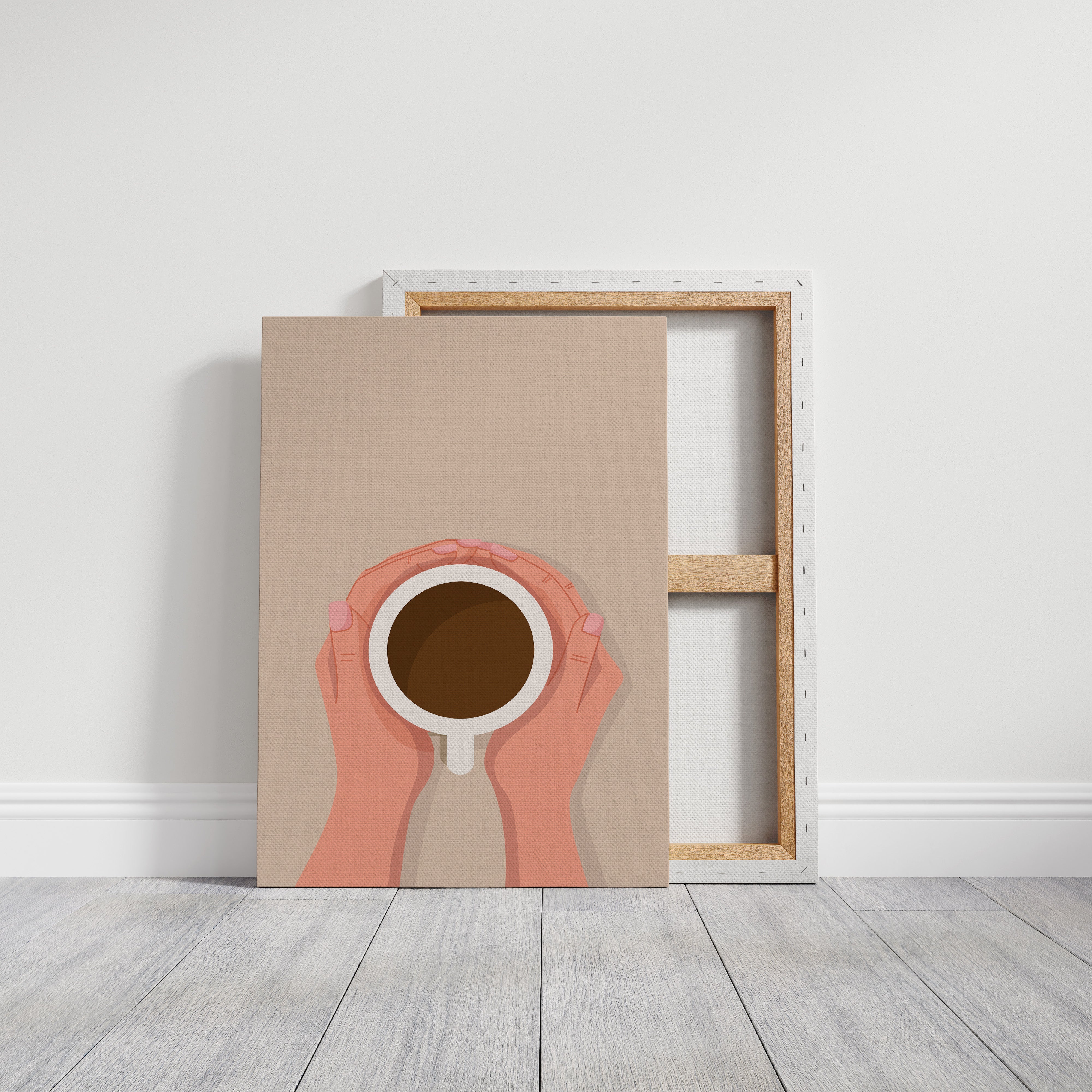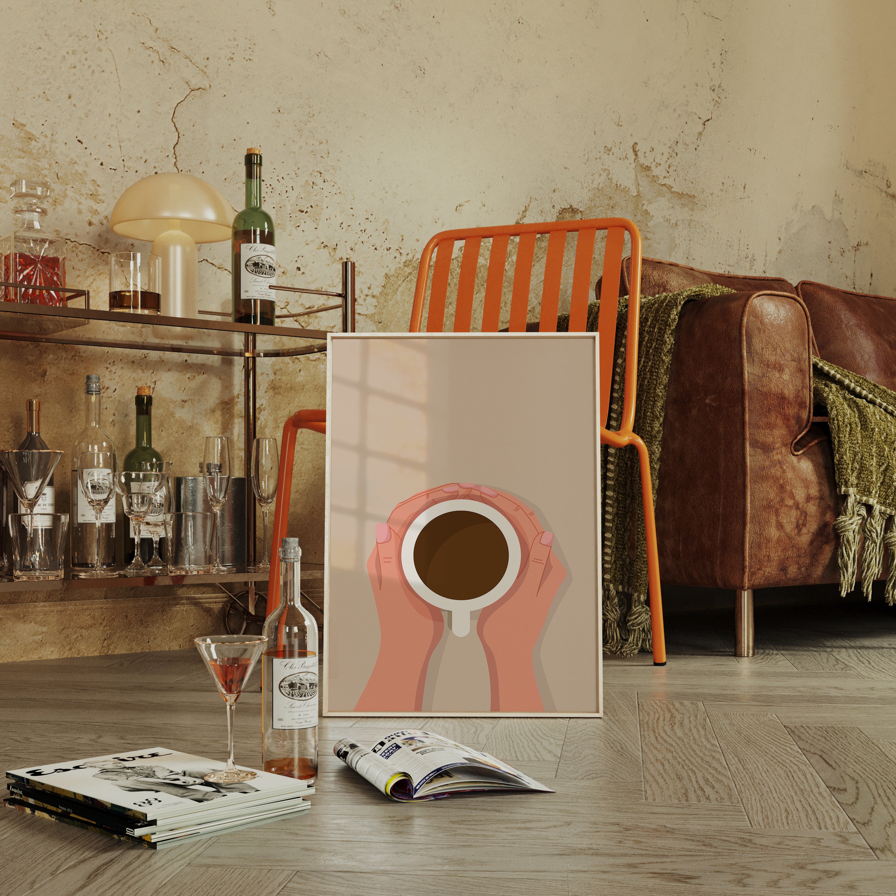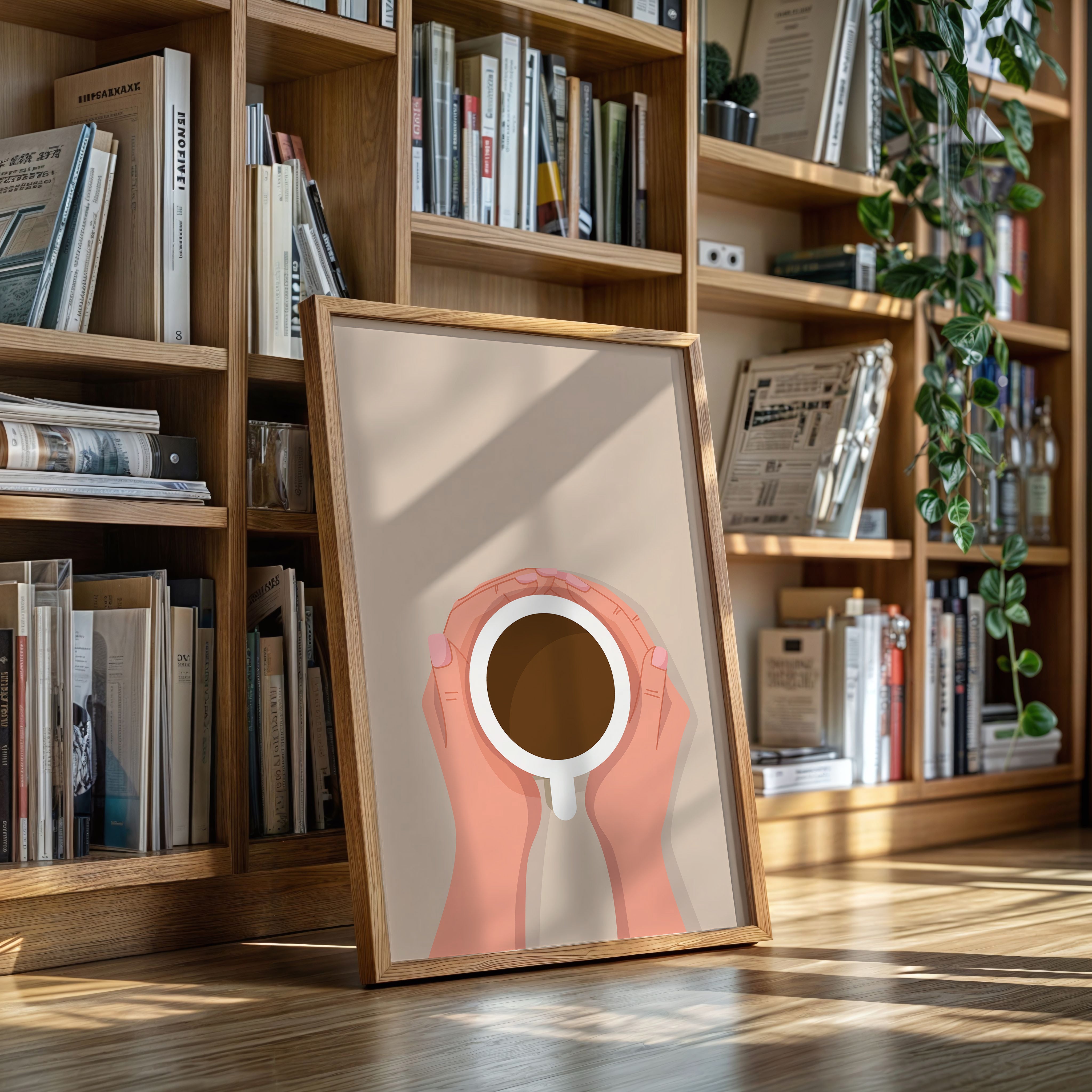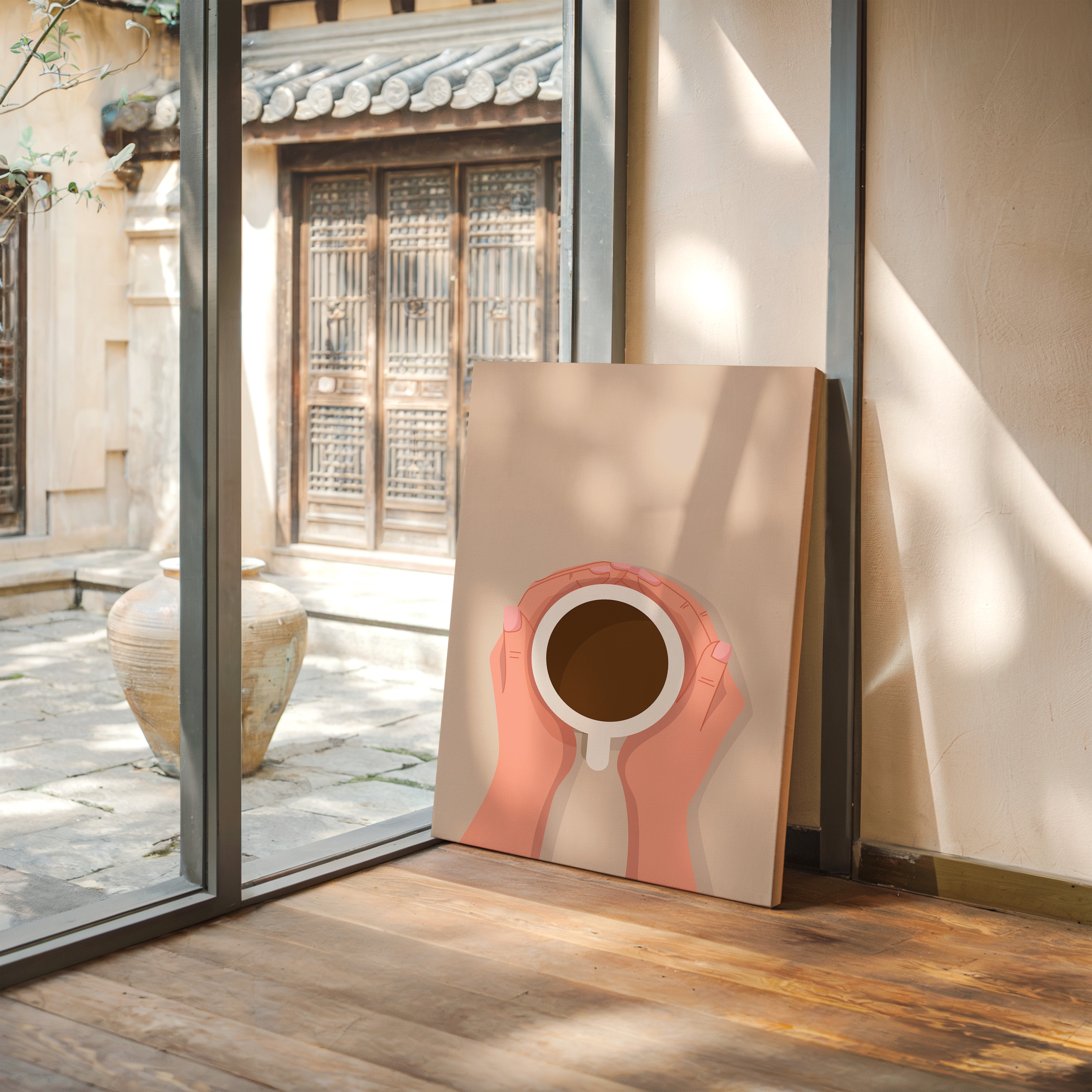 Warm hands cradle a perfect circle of comfort, steam rising like morning prayers into the soft air. This piece from our Contemporary collection captures the sacred ritual of daybreak moments. The minimalist illustration uses a gentle palette of coral pink and rich coffee brown, creating a composition that speaks to stillness and presence. The careful geometry of the cup against organic hands tells a story of human connection to daily ceremony. Perfect for kitchen spaces or cozy reading nooks where morning routines unfold with intention.