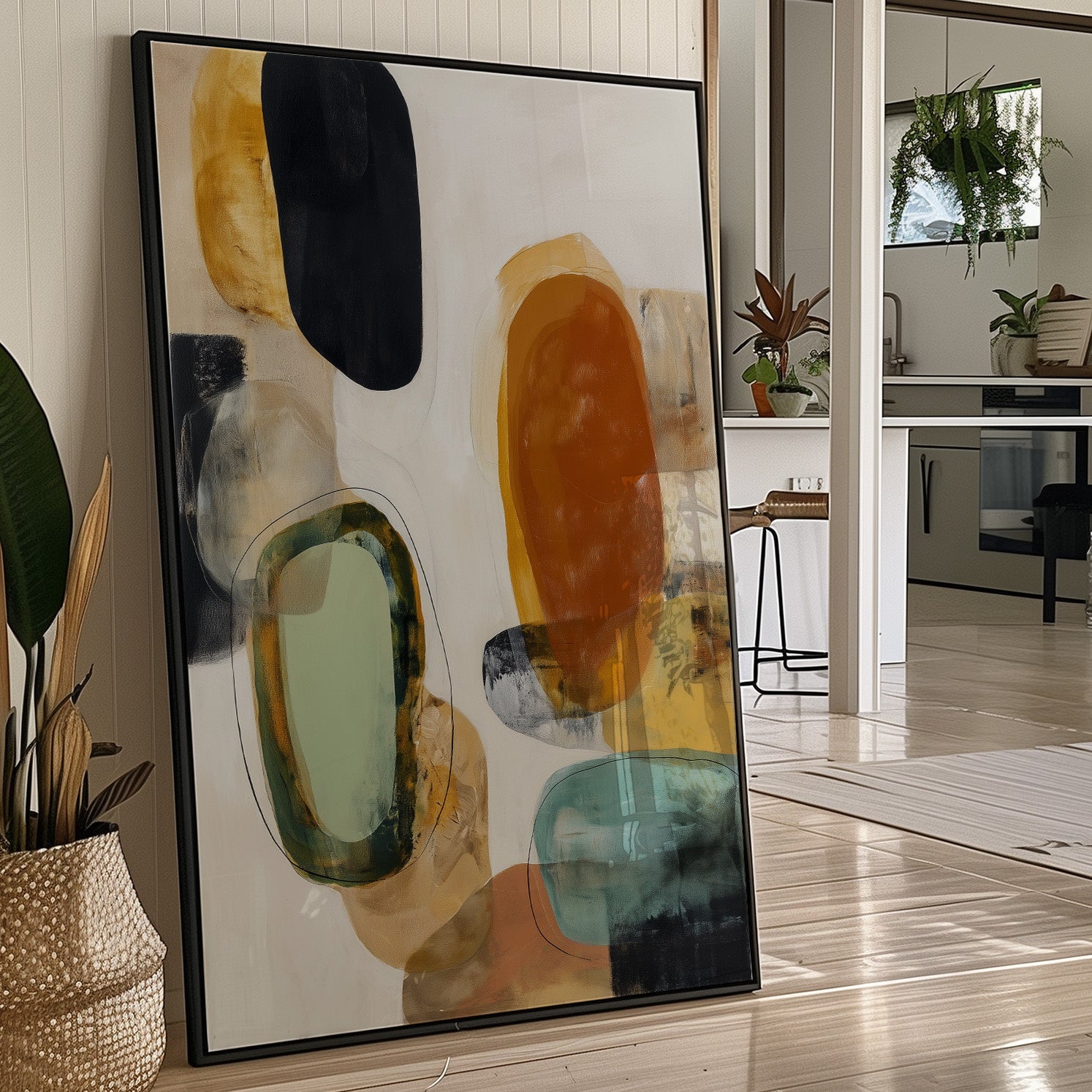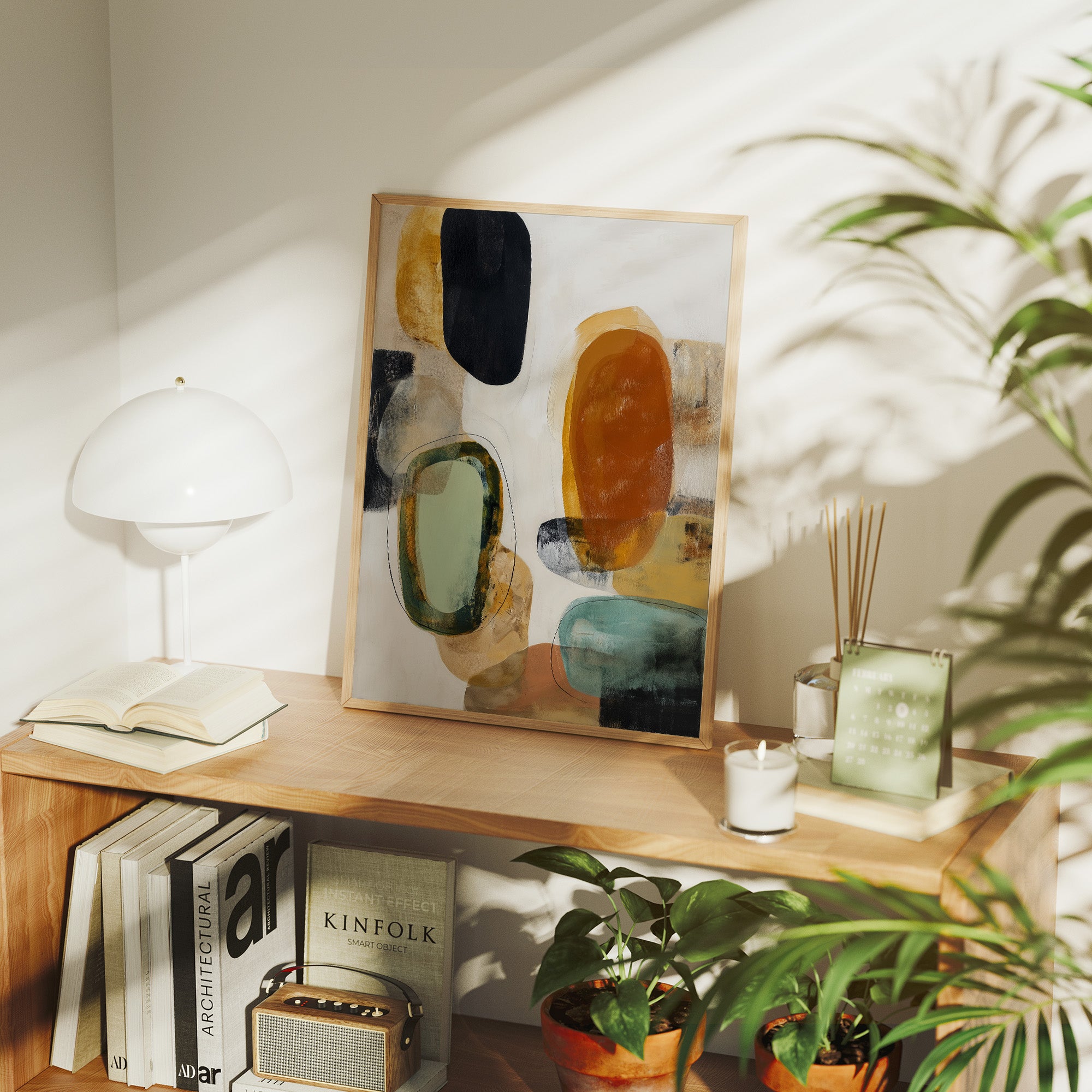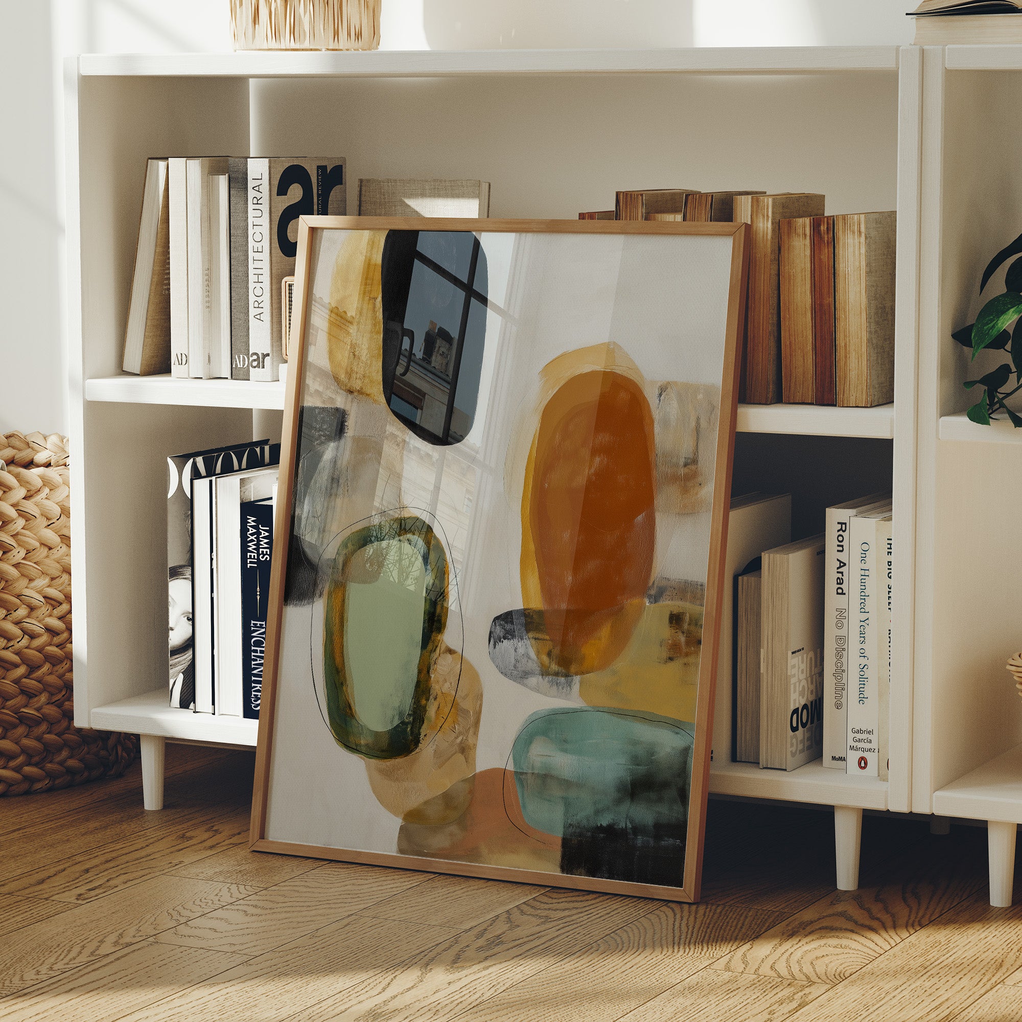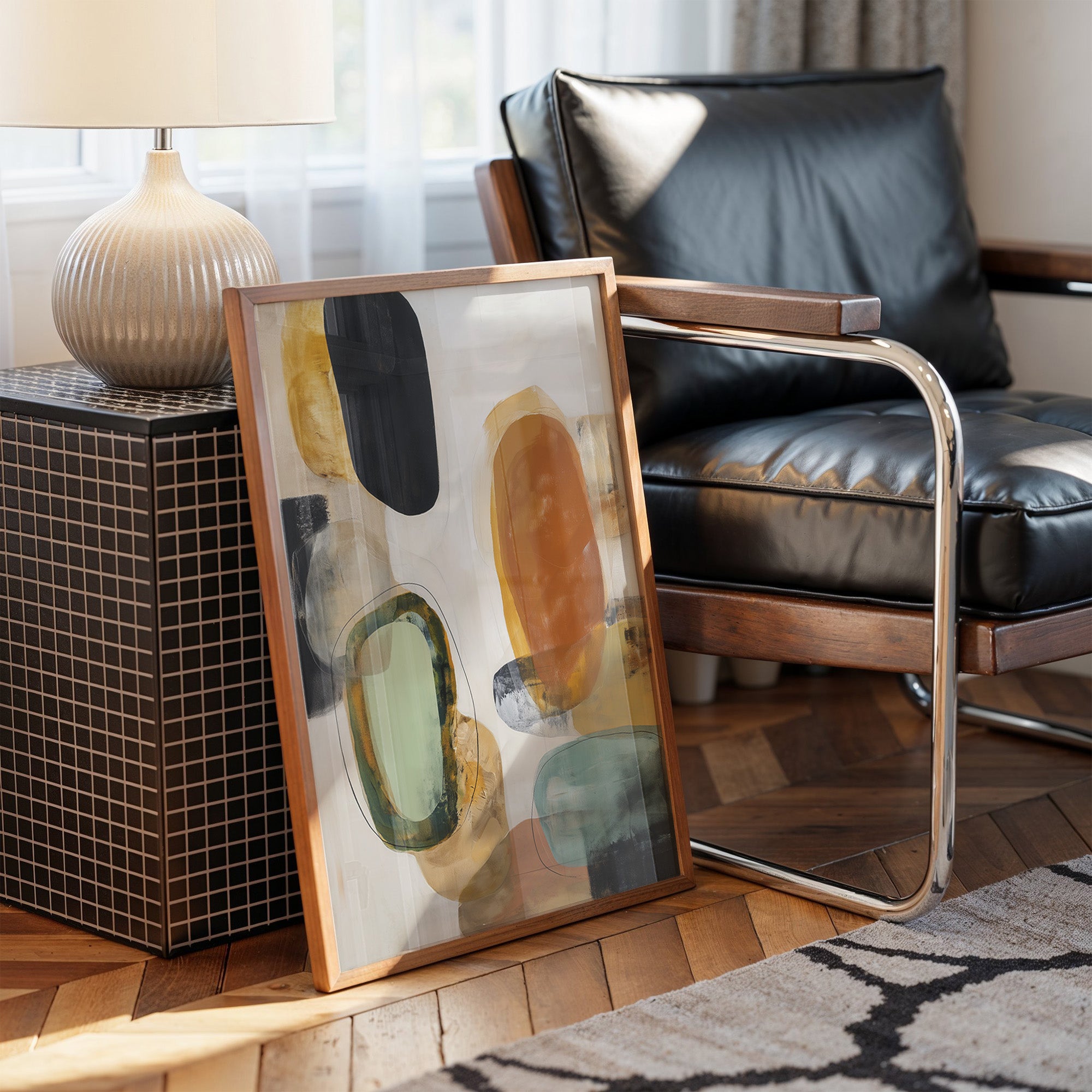 Soft sunlight streams through sheer curtains, casting warm highlights on an abstract composition of organic forms. Muted sage green, burnt orange, and deep navy shapes float weightlessly against a creamy canvas, their edges bleeding into one another like watercolors in motion. The wooden frame echoes the mid-century modern aesthetic of the leather chair beside it, creating a sophisticated dialogue between art and furniture. This piece would elevate a contemporary living room, home office, or meditation space where its calming presence can be fully appreciated.
