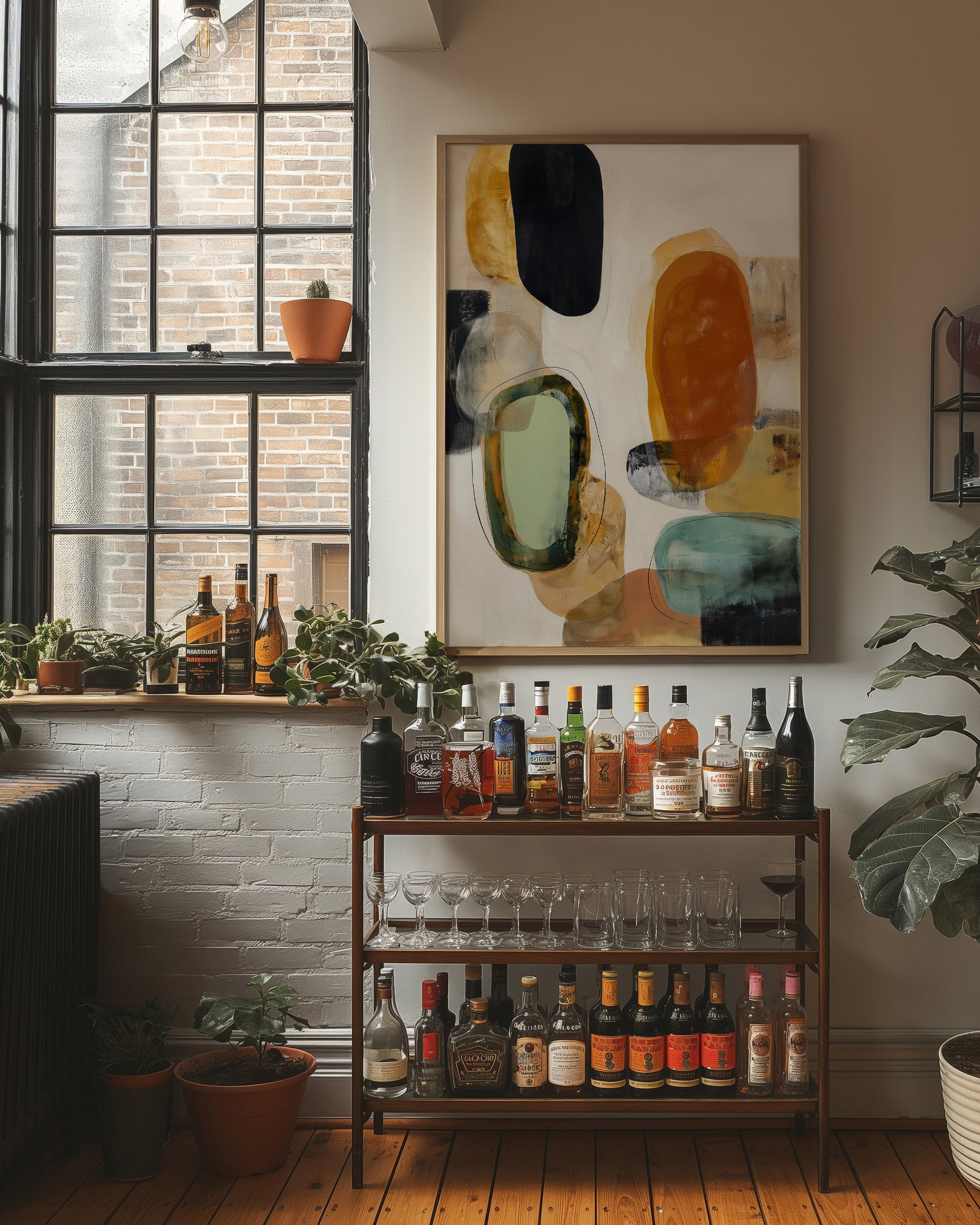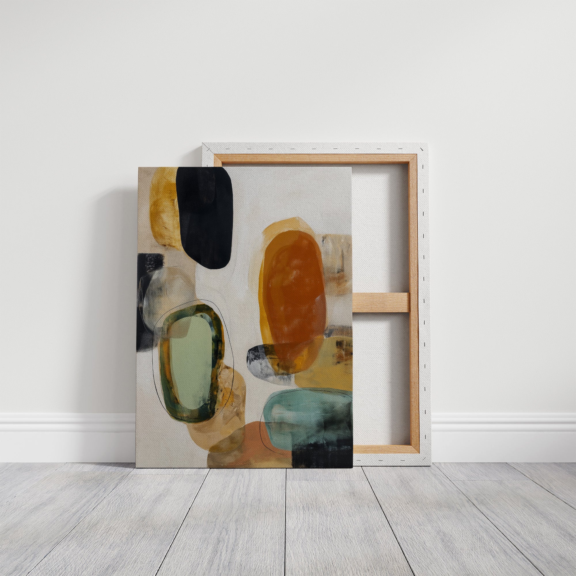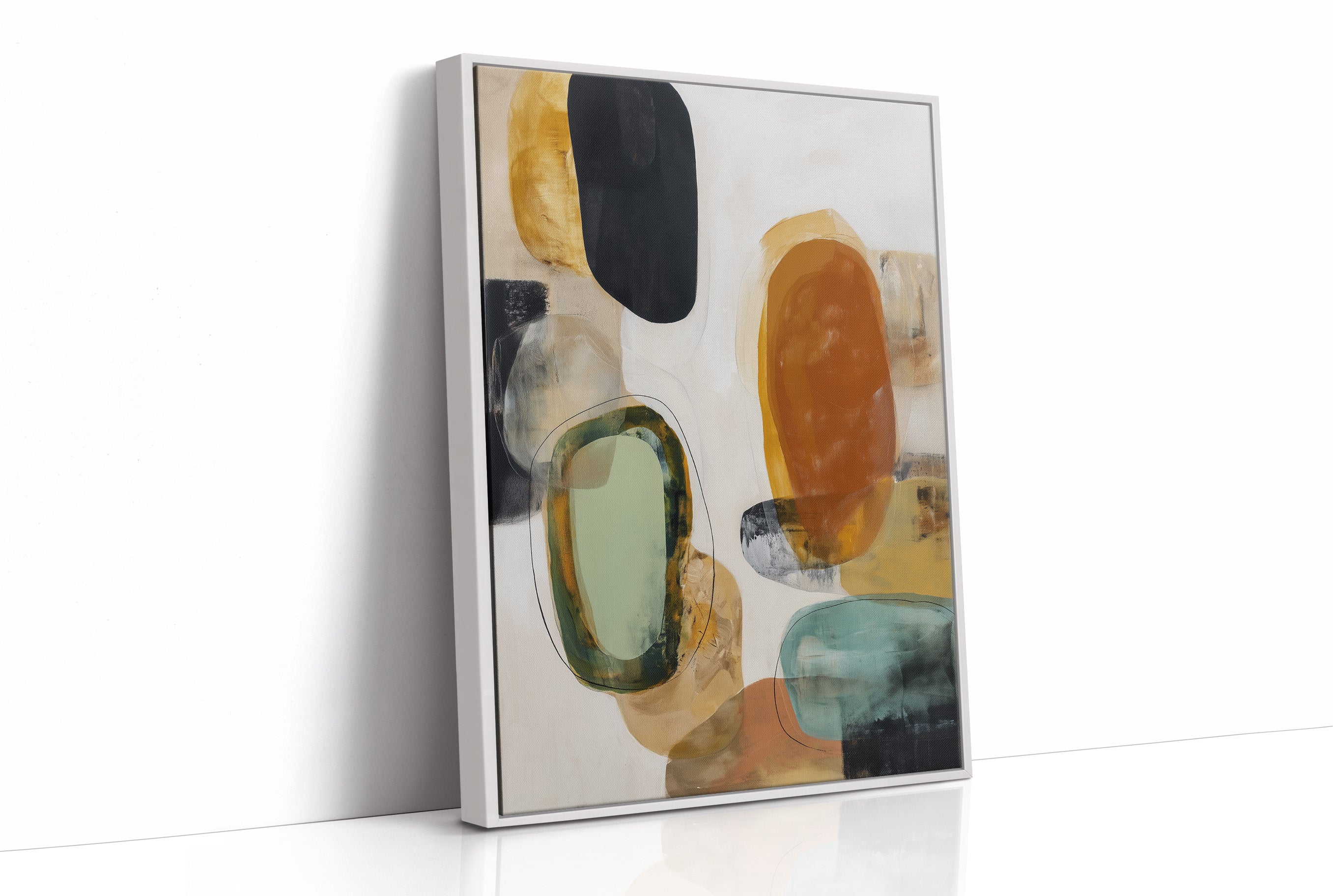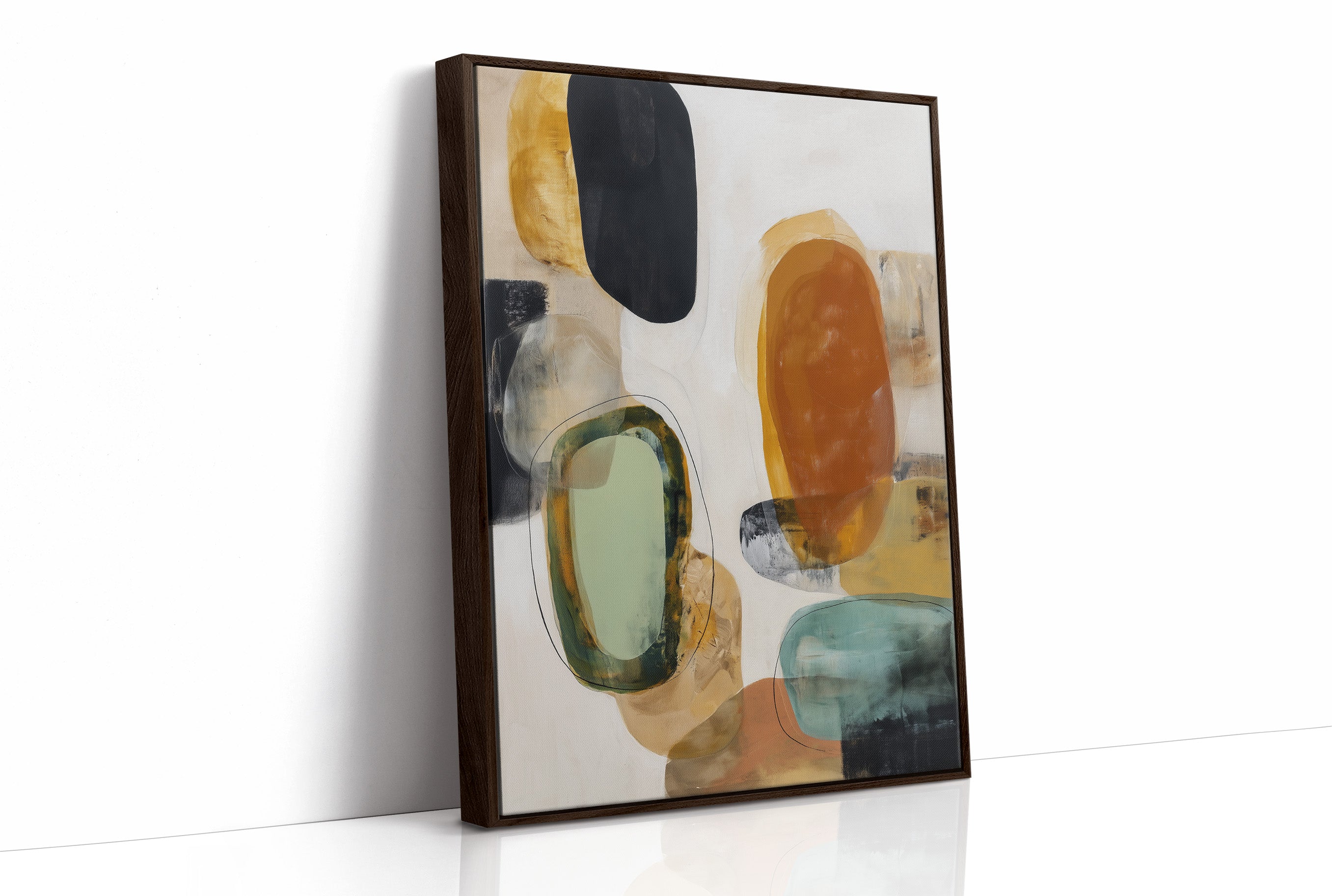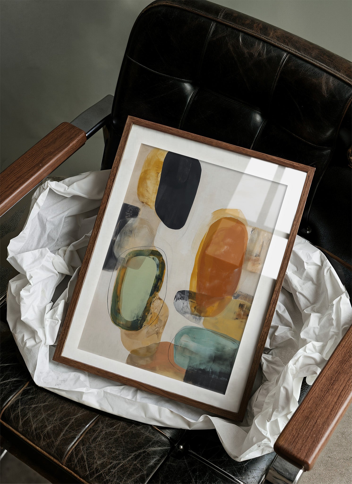 Soft sunlight streams through sheer curtains, casting warm highlights on an abstract composition of organic forms. Muted sage green, burnt orange, and deep navy shapes float weightlessly against a creamy canvas, their edges bleeding into one another like watercolors in motion. The wooden frame echoes the mid-century modern aesthetic of the leather chair beside it, creating a sophisticated dialogue between art and furniture. This piece would elevate a contemporary living room, home office, or meditation space where its calming presence can be fully appreciated.