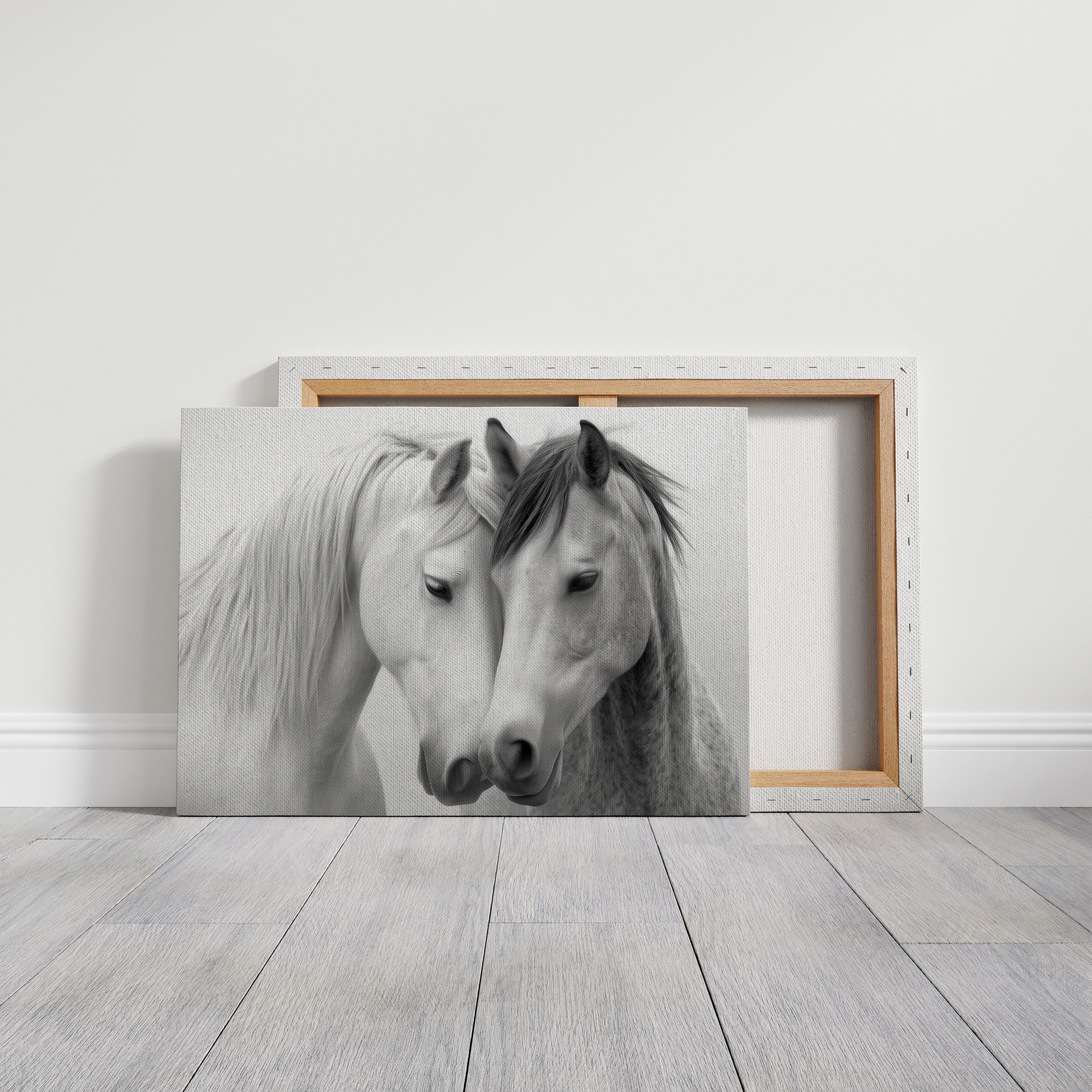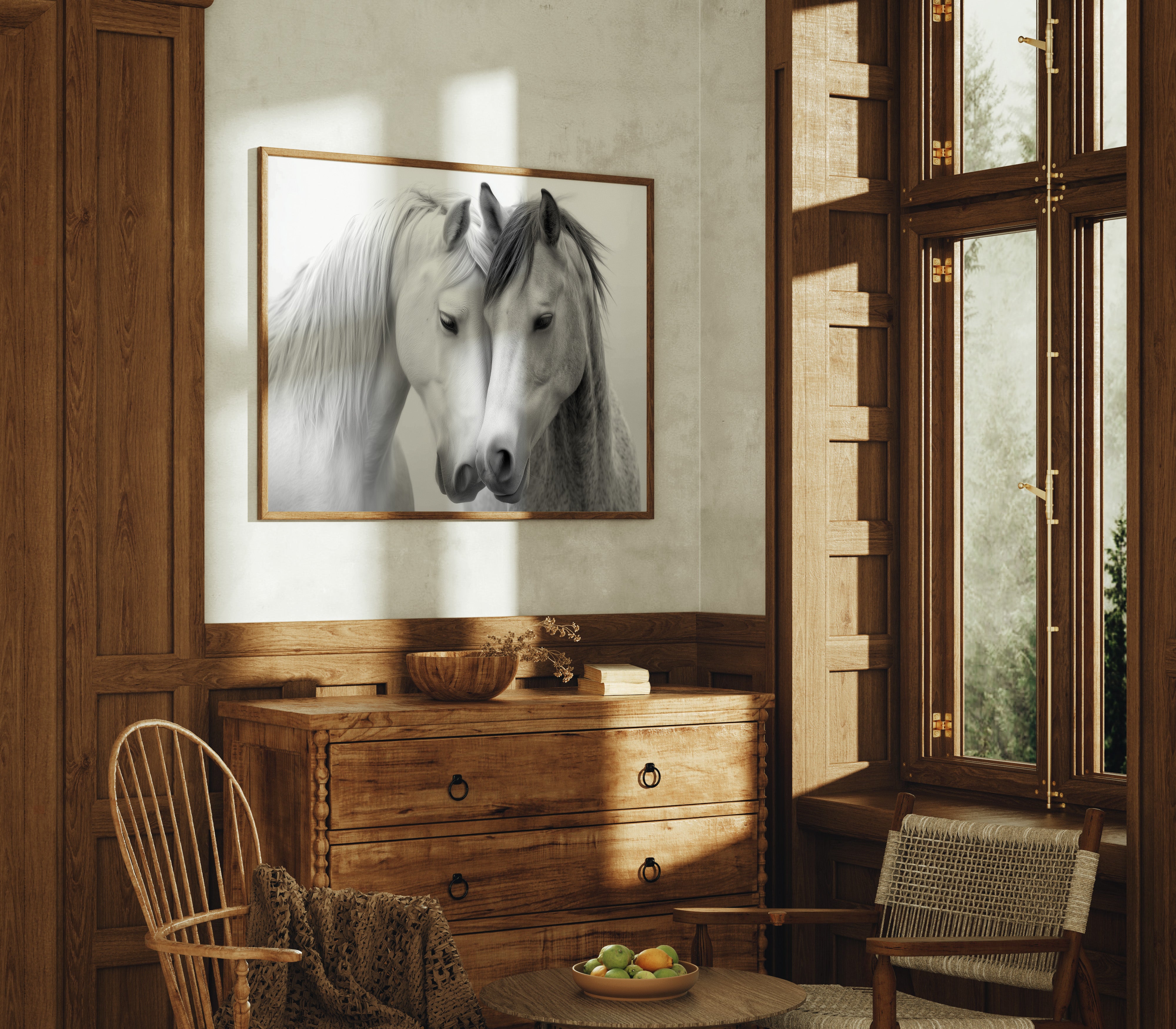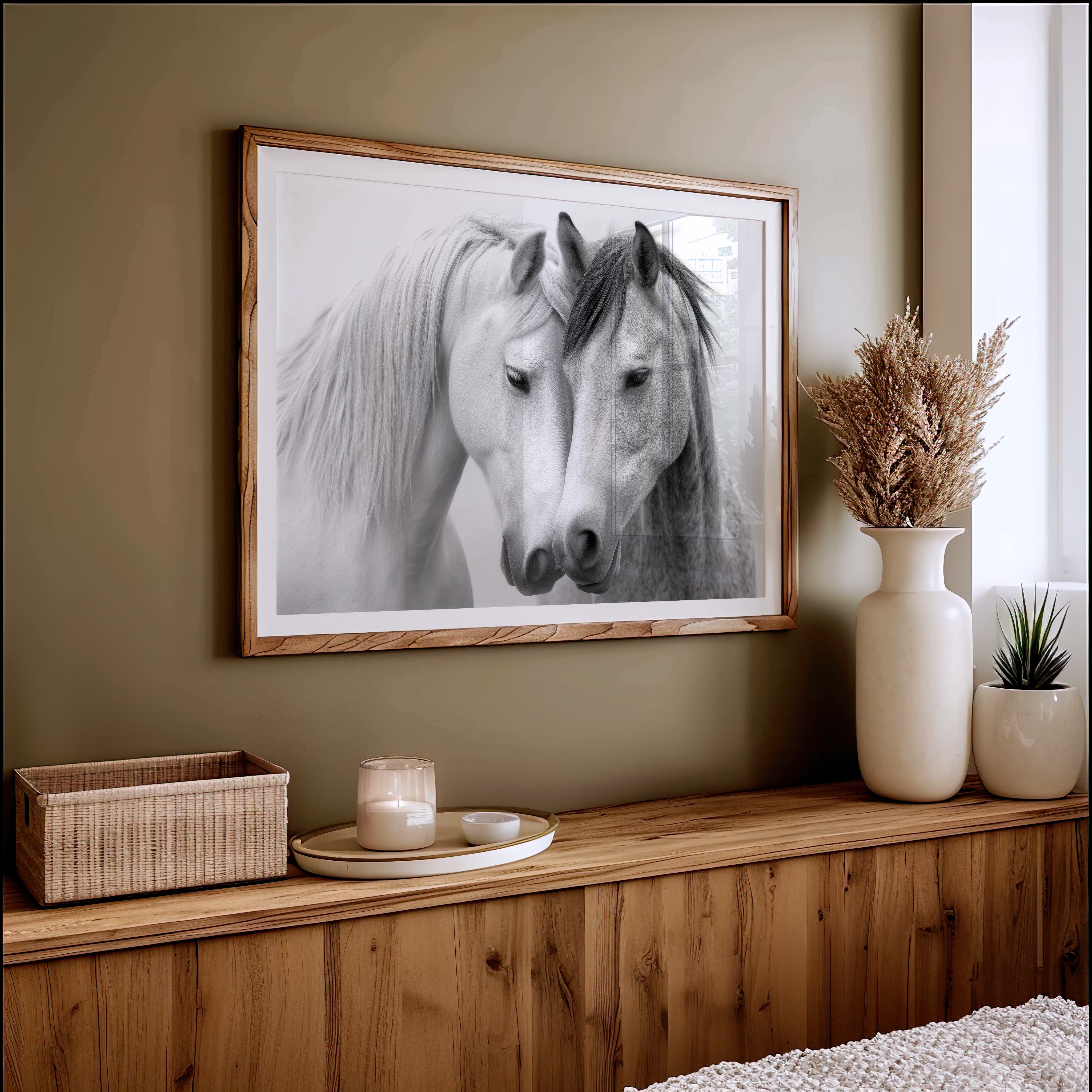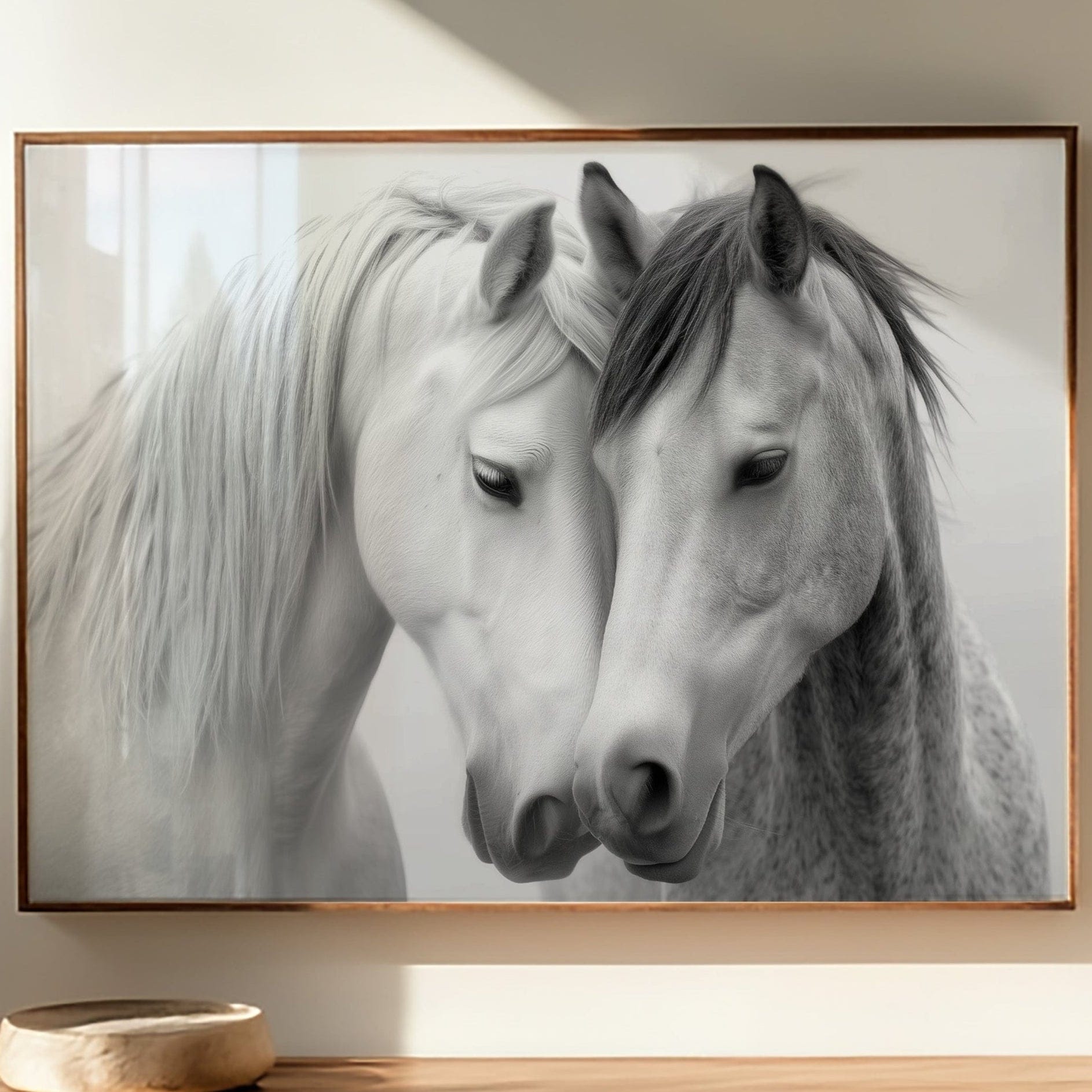Two horses touch foreheads in an intimate moment, their graceful profiles merging in ethereal black and white. This striking contemporary piece captures the essence of connection and quiet understanding. The contrast between light and shadow plays across their noble features, while flowing manes create organic lines that draw the eye through the composition. Their gentle expressions and tender positioning speak to themes of companionship and trust in nature's perfect simplicity. This piece brings a sense of serenity and refined elegance to any space, particularly suited for a bedroom or living area where its peaceful energy can be fully appreciated. The minimalist treatment allows the emotional depth of the moment to resonate deeply with viewers.