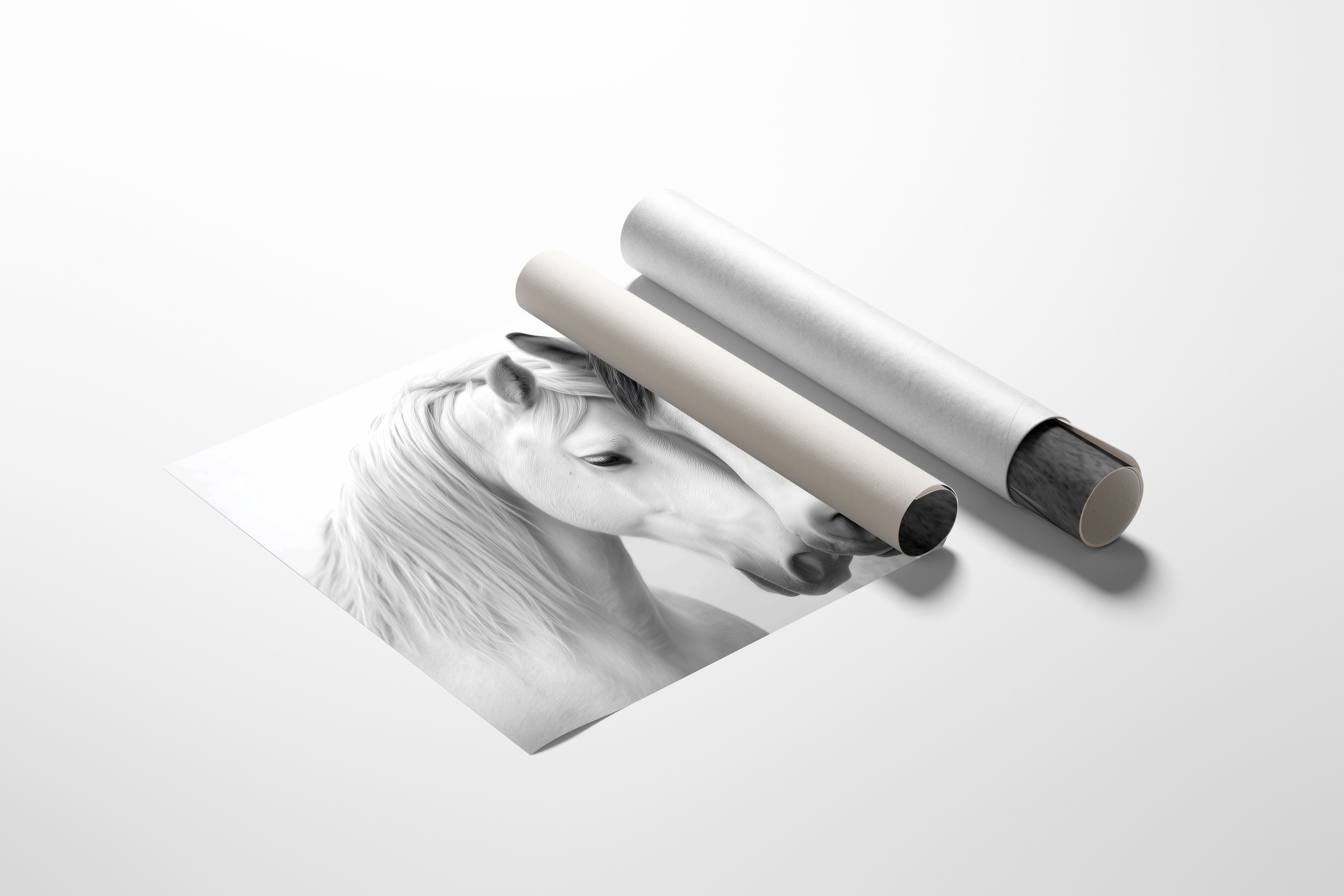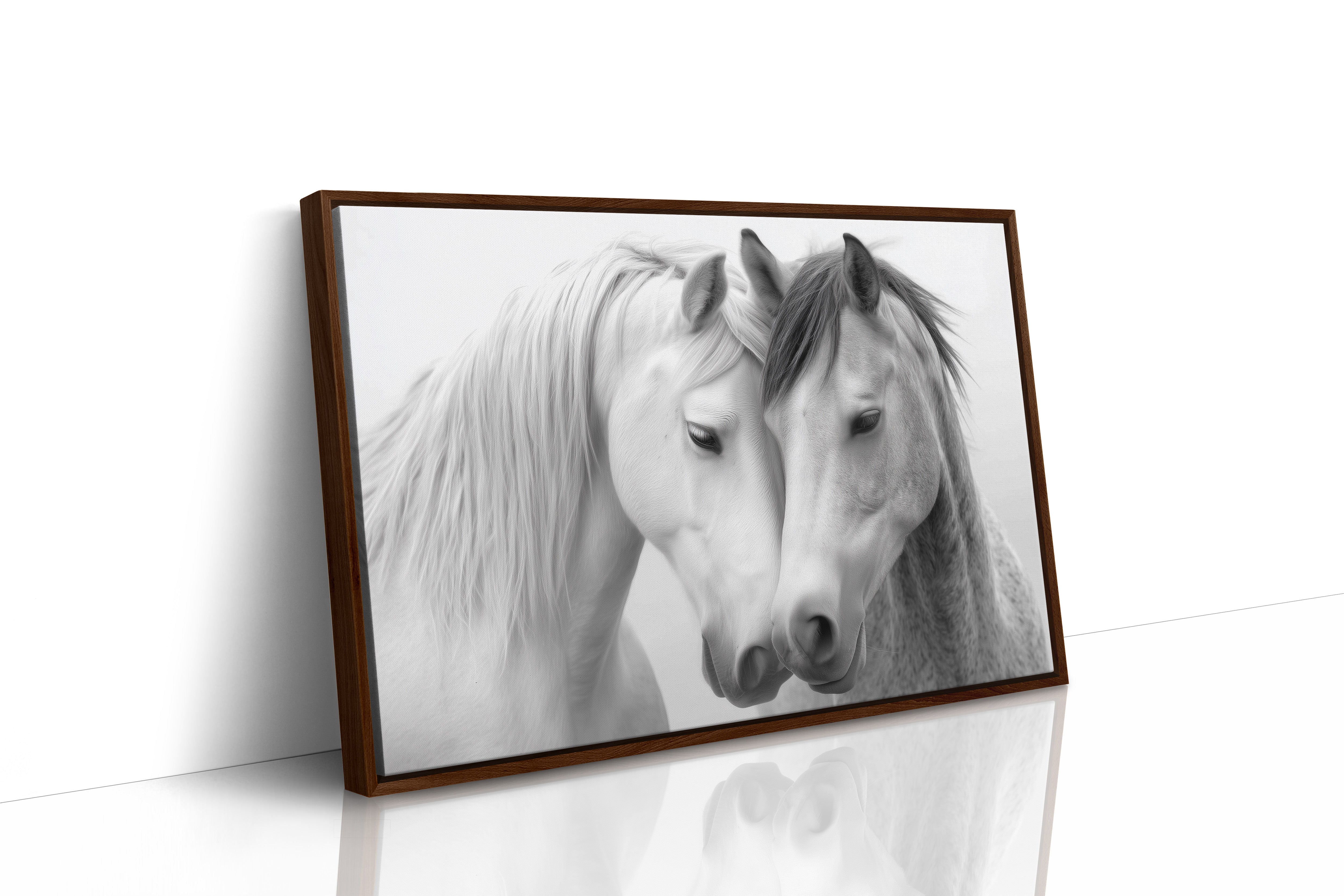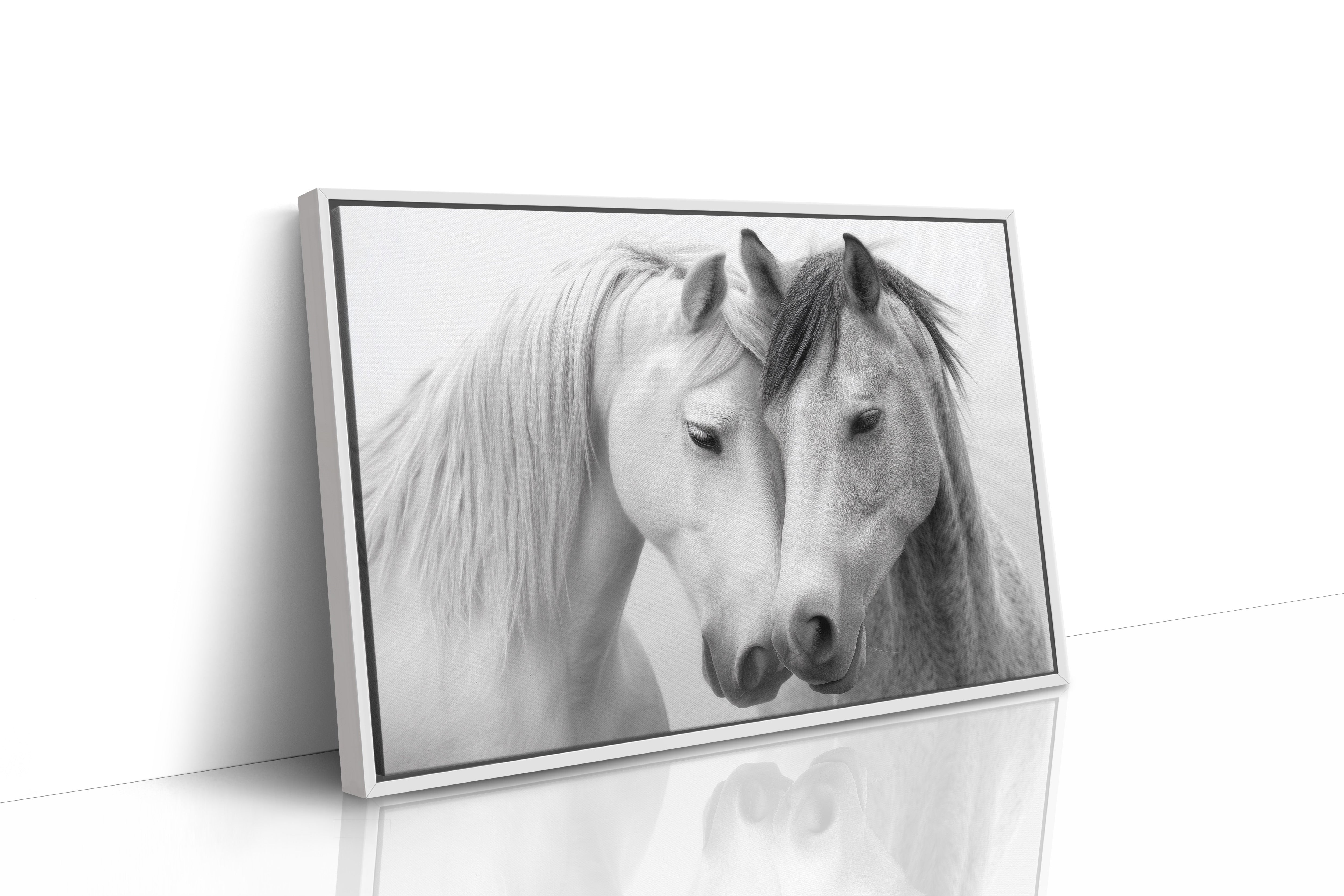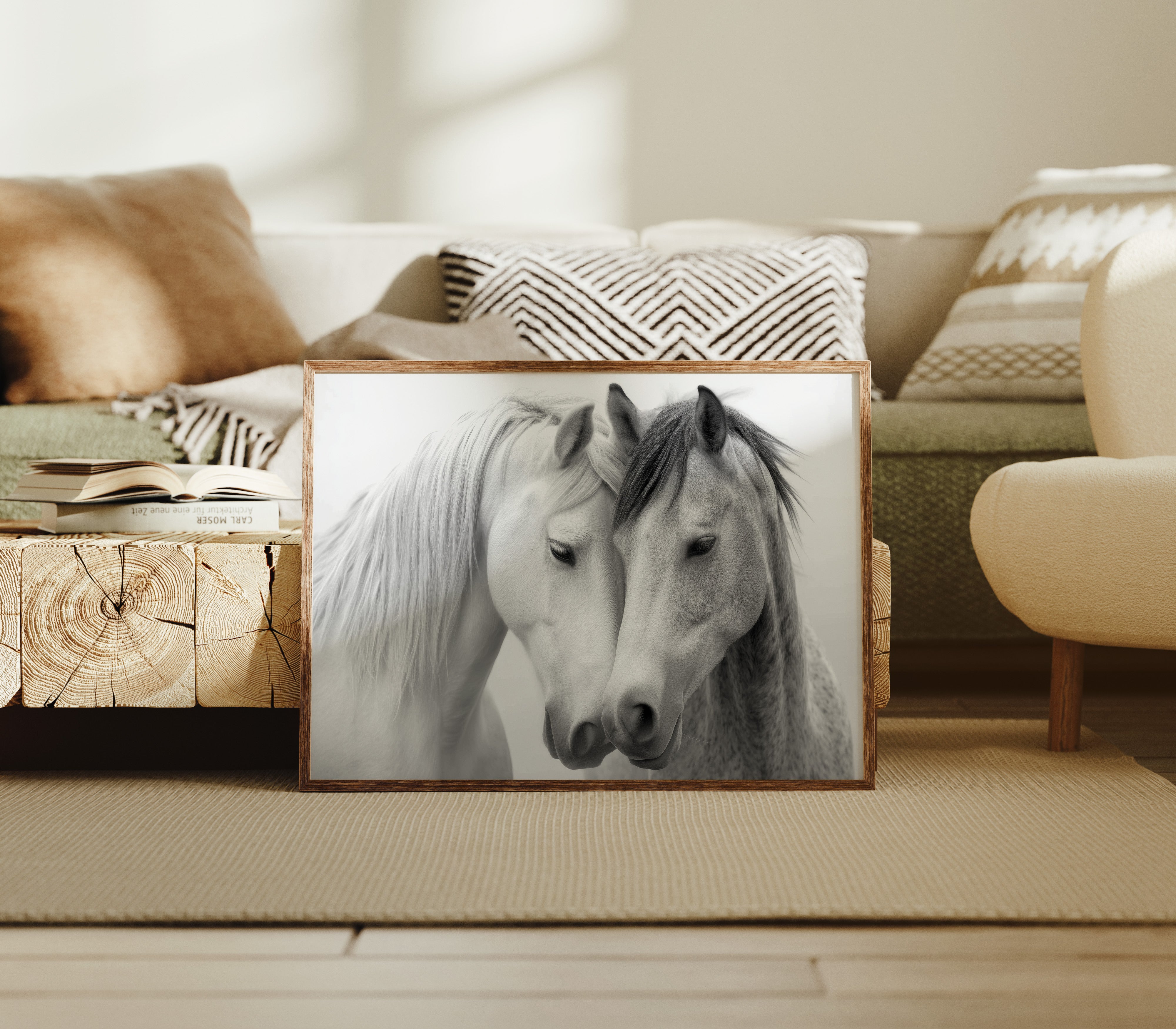 Two horses touch foreheads in an intimate moment, their graceful profiles merging in ethereal black and white. This striking contemporary piece captures the essence of connection and quiet understanding. The contrast between light and shadow plays across their noble features, while flowing manes create organic lines that draw the eye through the composition. Their gentle expressions and tender positioning speak to themes of companionship and trust in nature's perfect simplicity. This piece brings a sense of serenity and refined elegance to any space, particularly suited for a bedroom or living area where its peaceful energy can be fully appreciated. The minimalist treatment allows the emotional depth of the moment to resonate deeply with viewers.