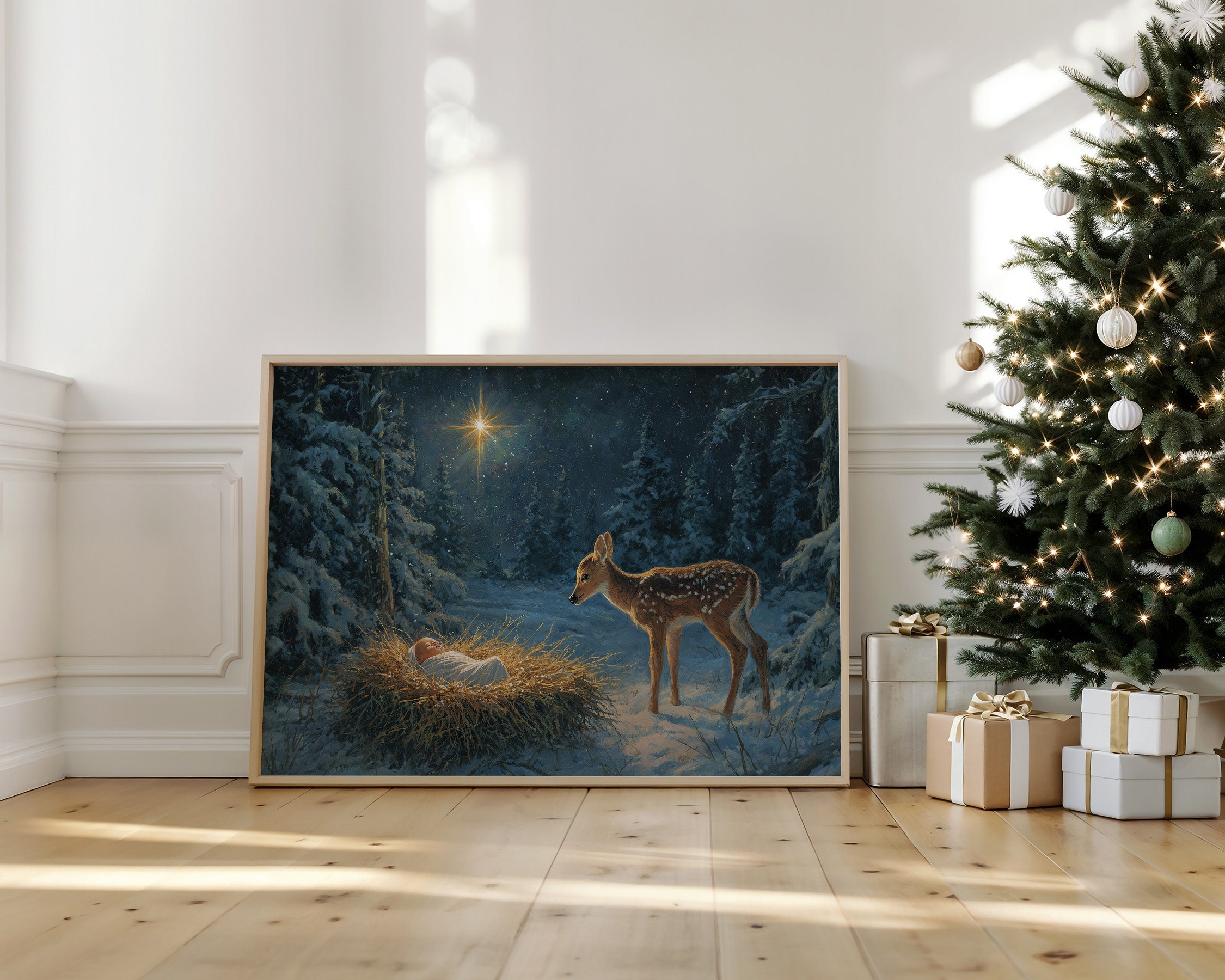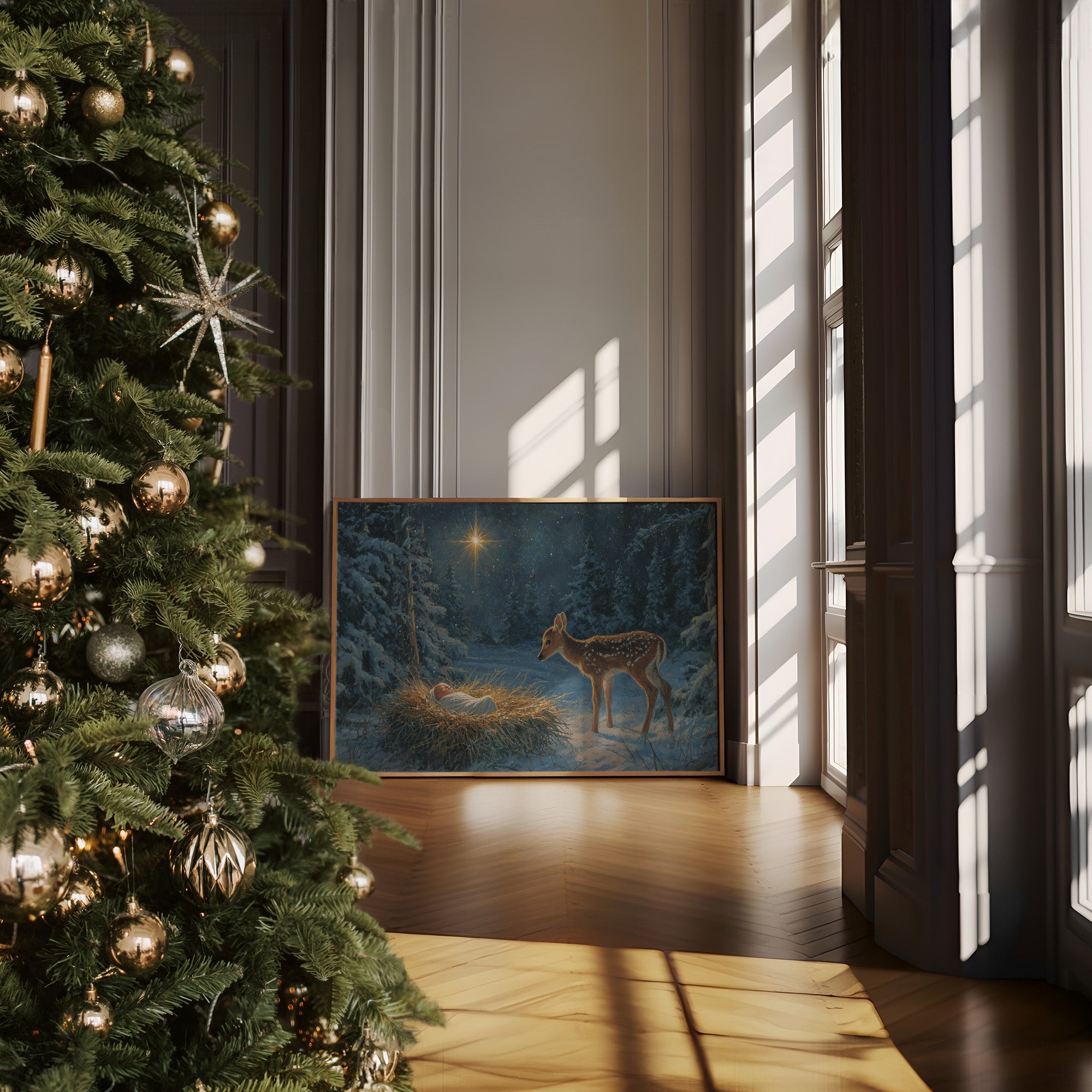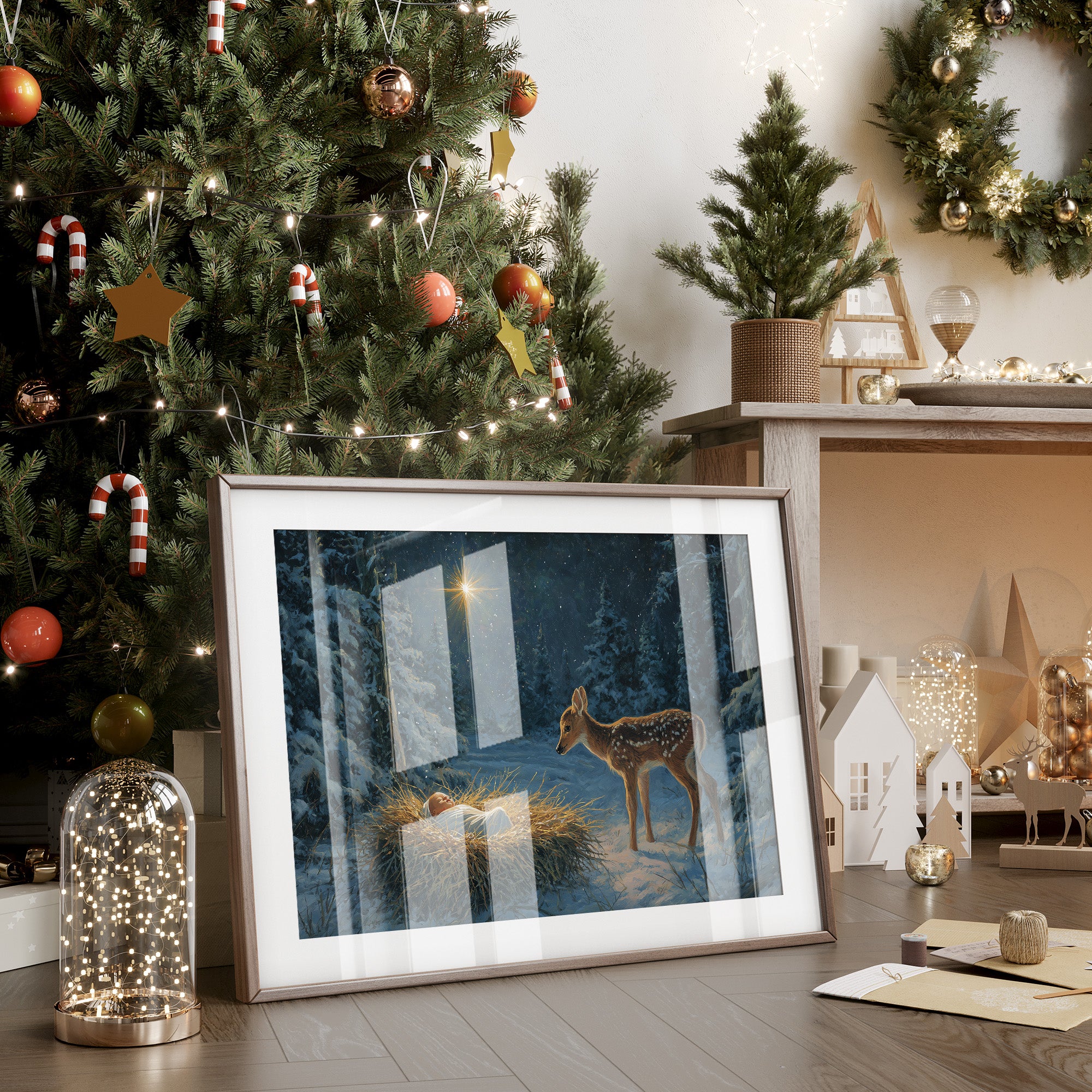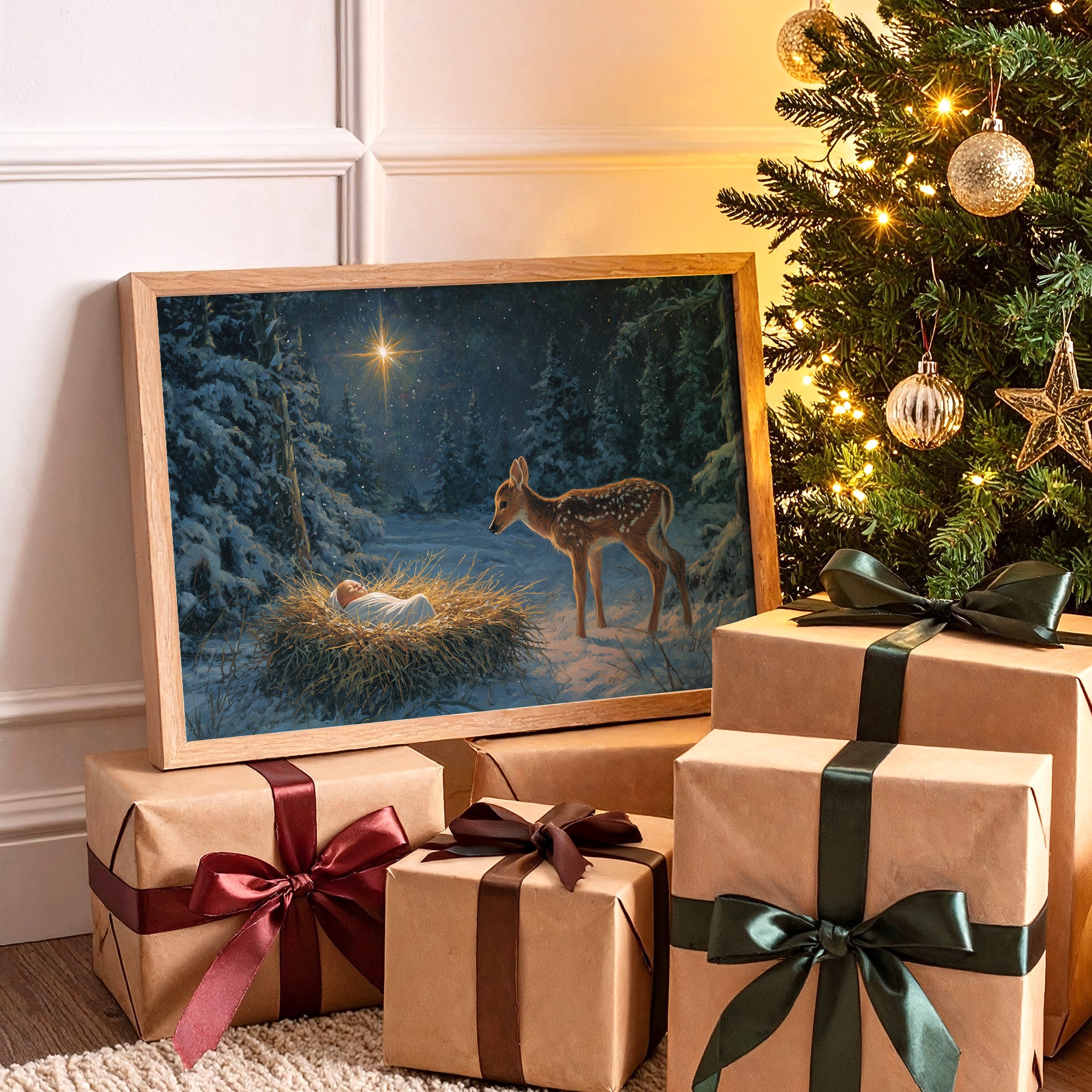 A mystical moment unfolds in the depths of a snow-laden forest, where starlight mingles with divine radiance. A young fawn pauses, entranced by an ethereal scene before it - a sleeping infant nestled in golden hay, while above, a brilliant star pierces the midnight blue sky. The deep evergreen forest stands sentinel, its branches heavy with pristine snow, creating a natural cathedral for this sacred encounter. The interplay of celestial light and earthly innocence evokes a timeless story of peace and wonder. This piece would bring a profound sense of seasonal reverence to a living room or family gathering space, especially during contemplative winter months.