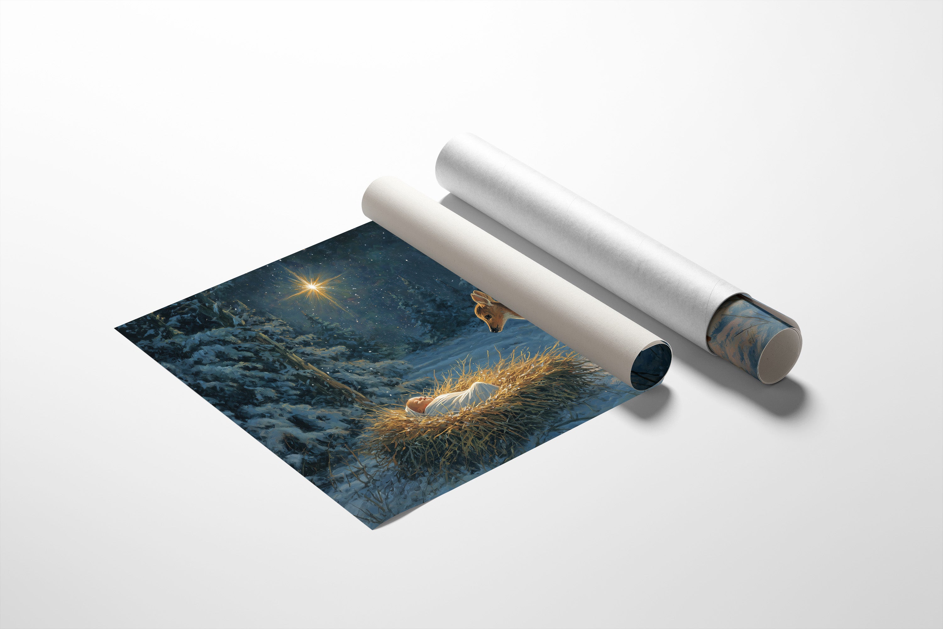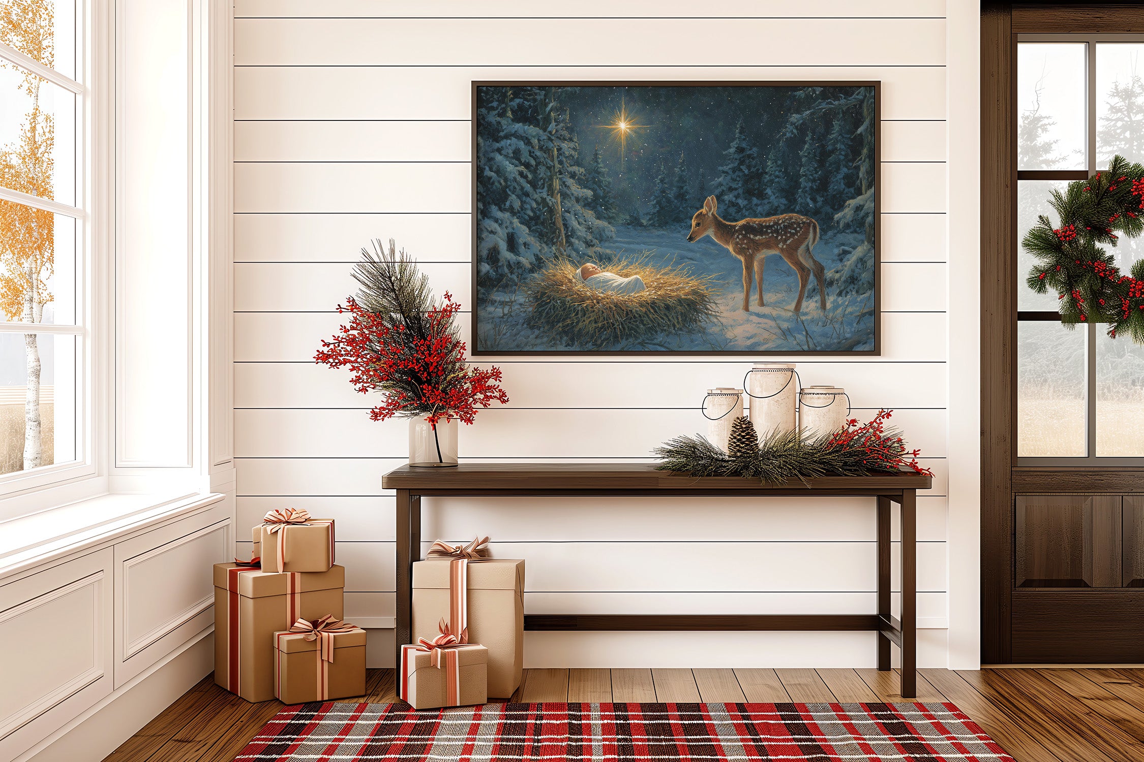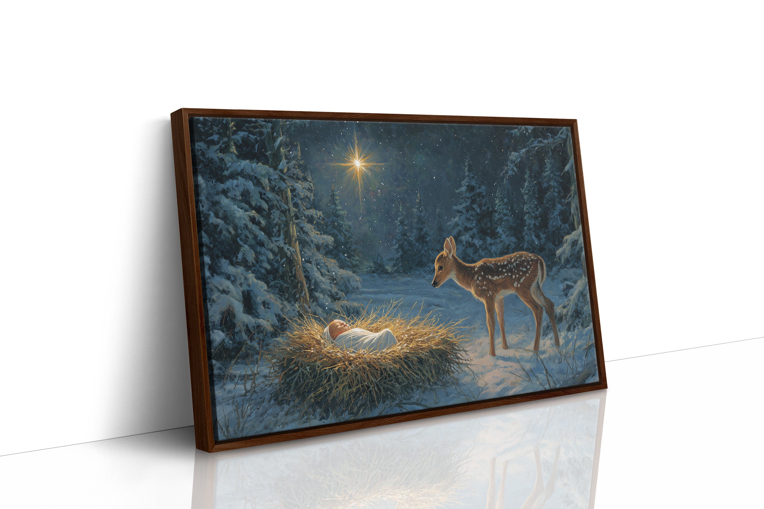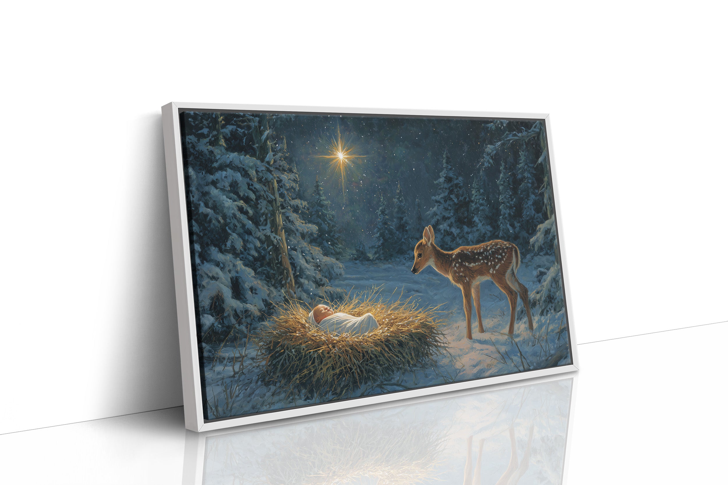 A mystical moment unfolds in the depths of a snow-laden forest, where starlight mingles with divine radiance. A young fawn pauses, entranced by an ethereal scene before it - a sleeping infant nestled in golden hay, while above, a brilliant star pierces the midnight blue sky. The deep evergreen forest stands sentinel, its branches heavy with pristine snow, creating a natural cathedral for this sacred encounter. The interplay of celestial light and earthly innocence evokes a timeless story of peace and wonder. This piece would bring a profound sense of seasonal reverence to a living room or family gathering space, especially during contemplative winter months.