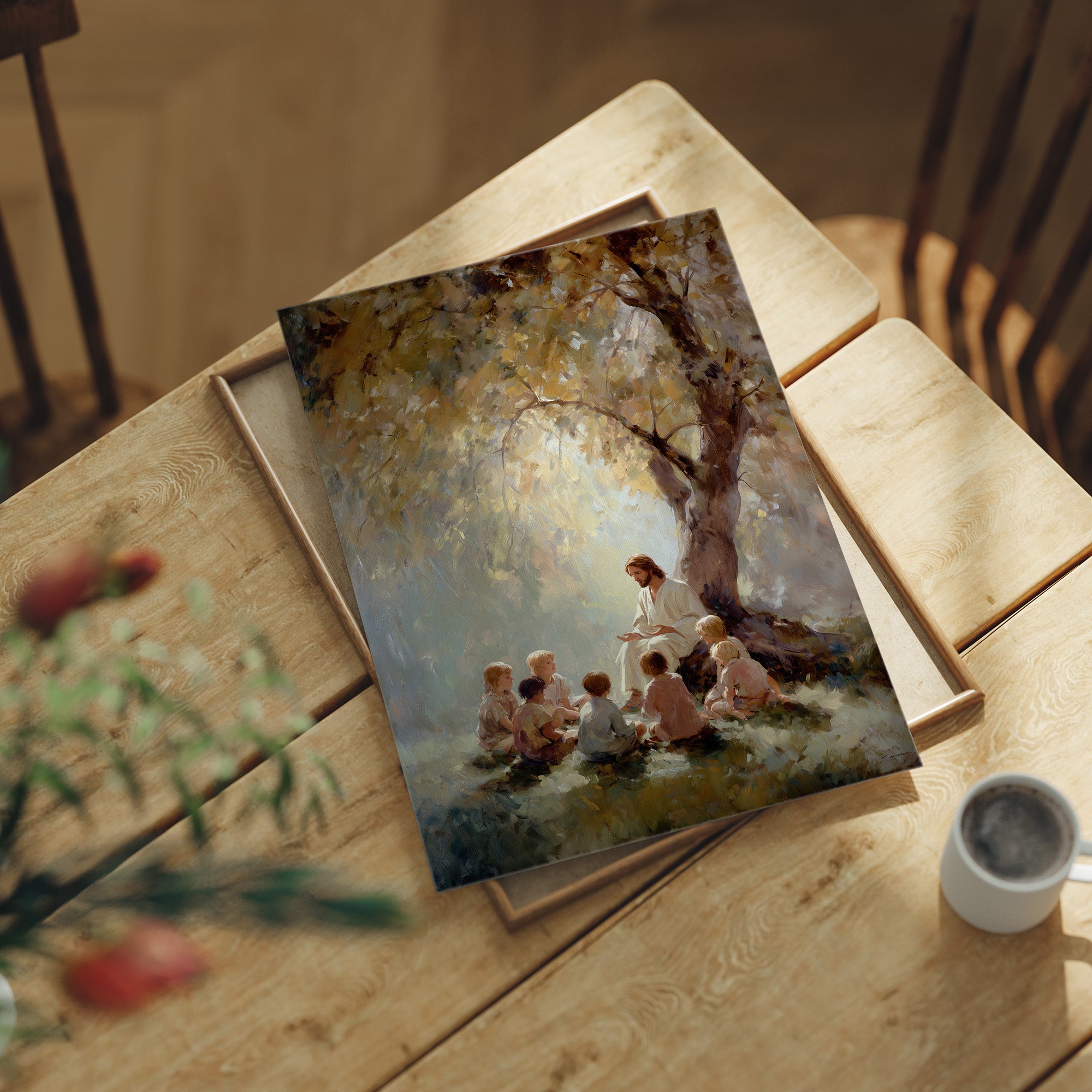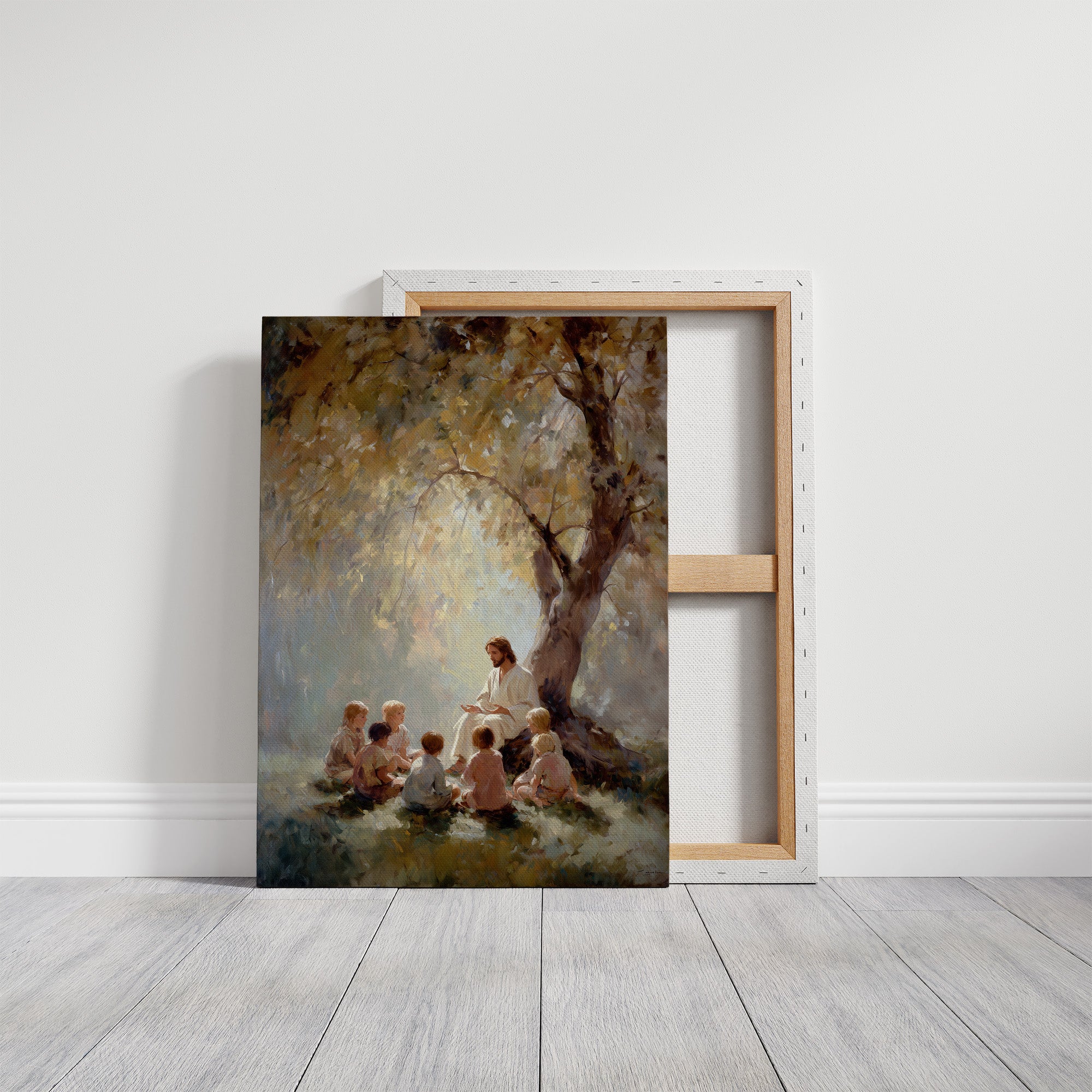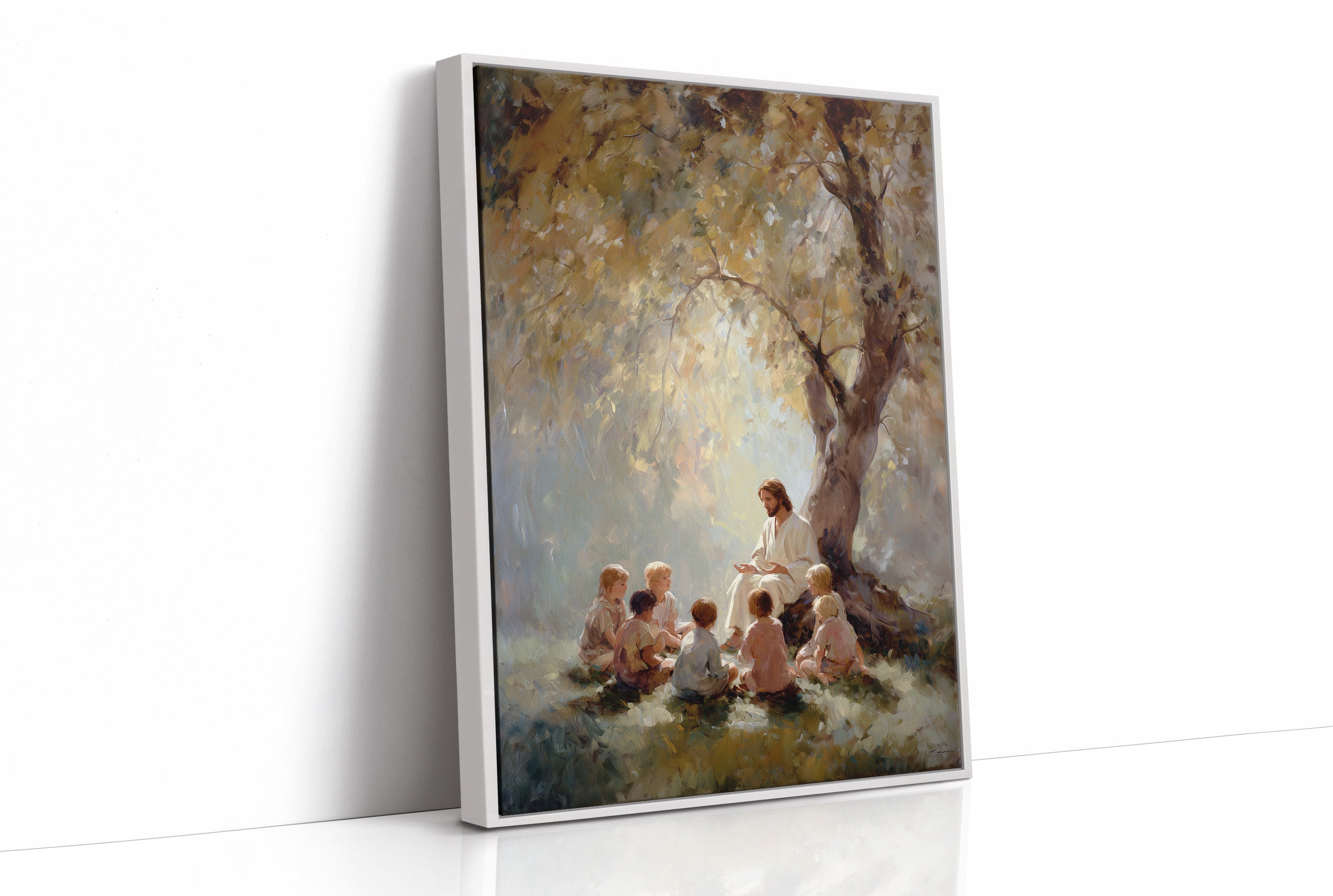 Morning light filters through golden leaves, creating a sanctuary of warmth and peace. A figure sits with children gathered close, their faces turned upward in rapt attention as stories unfold beneath the sheltering oak. The artist's brushstrokes blend soft yellows and misty blues, creating an ethereal atmosphere where wisdom and innocence meet in perfect harmony. This serene piece brings spiritual comfort to living rooms, reading nooks, or any space where quiet contemplation is valued.