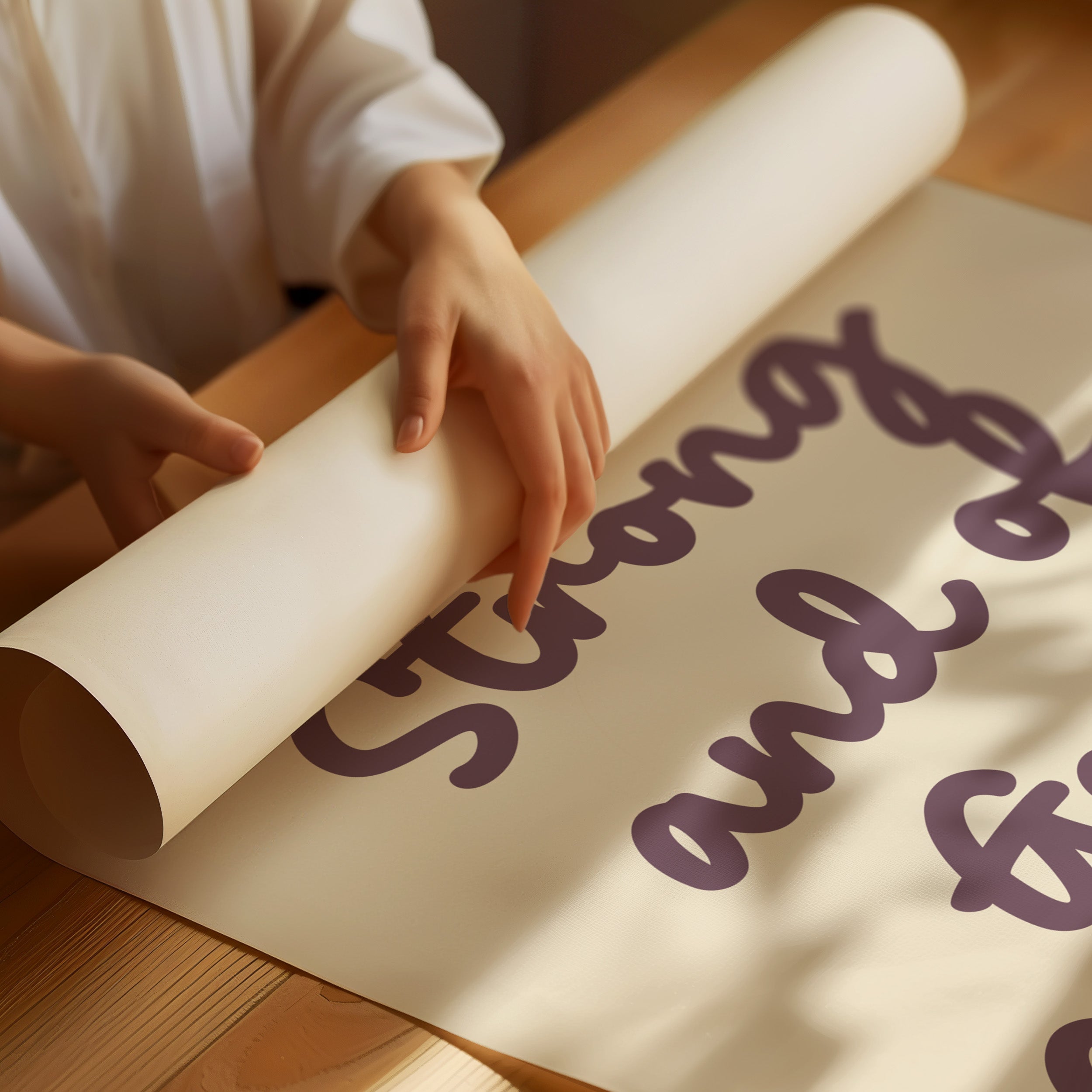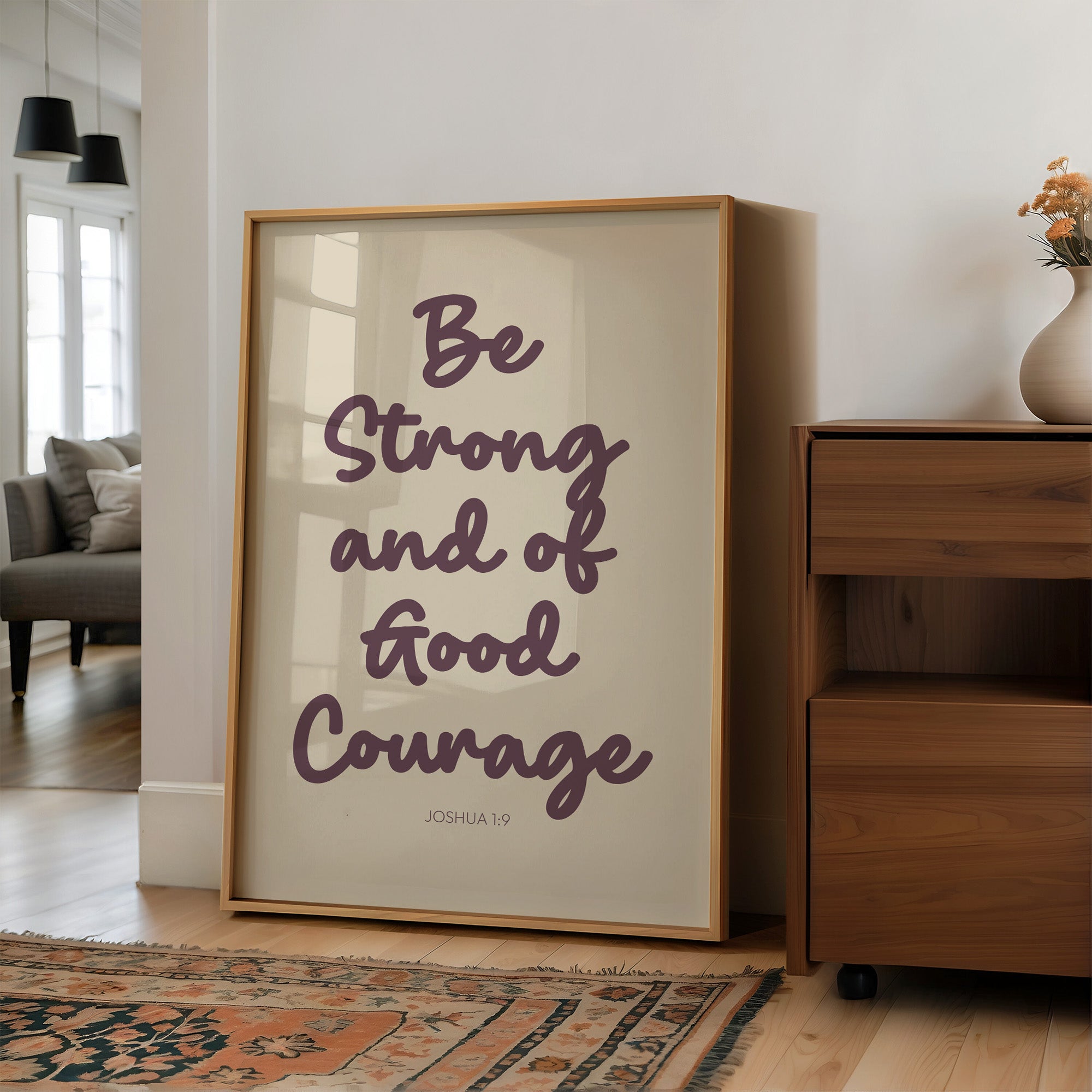 The soft beige backdrop cradles powerful words in a soothing plum script, creating a moment of quiet reassurance. Each flowing letter invites you to pause and absorb the timeless wisdom from Joshua 1:9, reminding us that strength comes in many forms. This contemporary typography transforms biblical encouragement into a visual meditation, perfect for those moments when resolve needs gentle reinforcement.