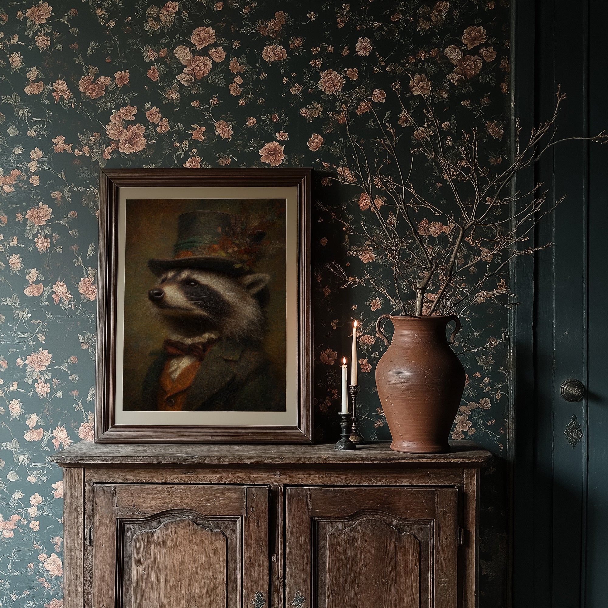 A distinguished raccoon gazes thoughtfully from within his portrait, adorned in Victorian finery and a top hat embellished with autumn feathers. The rich sepia tones and painterly texture create an atmosphere of nostalgic whimsy, blending animal charm with human-like sophistication. This playful yet elegant anthropomorphic portrait stands boldly against the dramatic black wall, creating a striking conversation piece for any space.