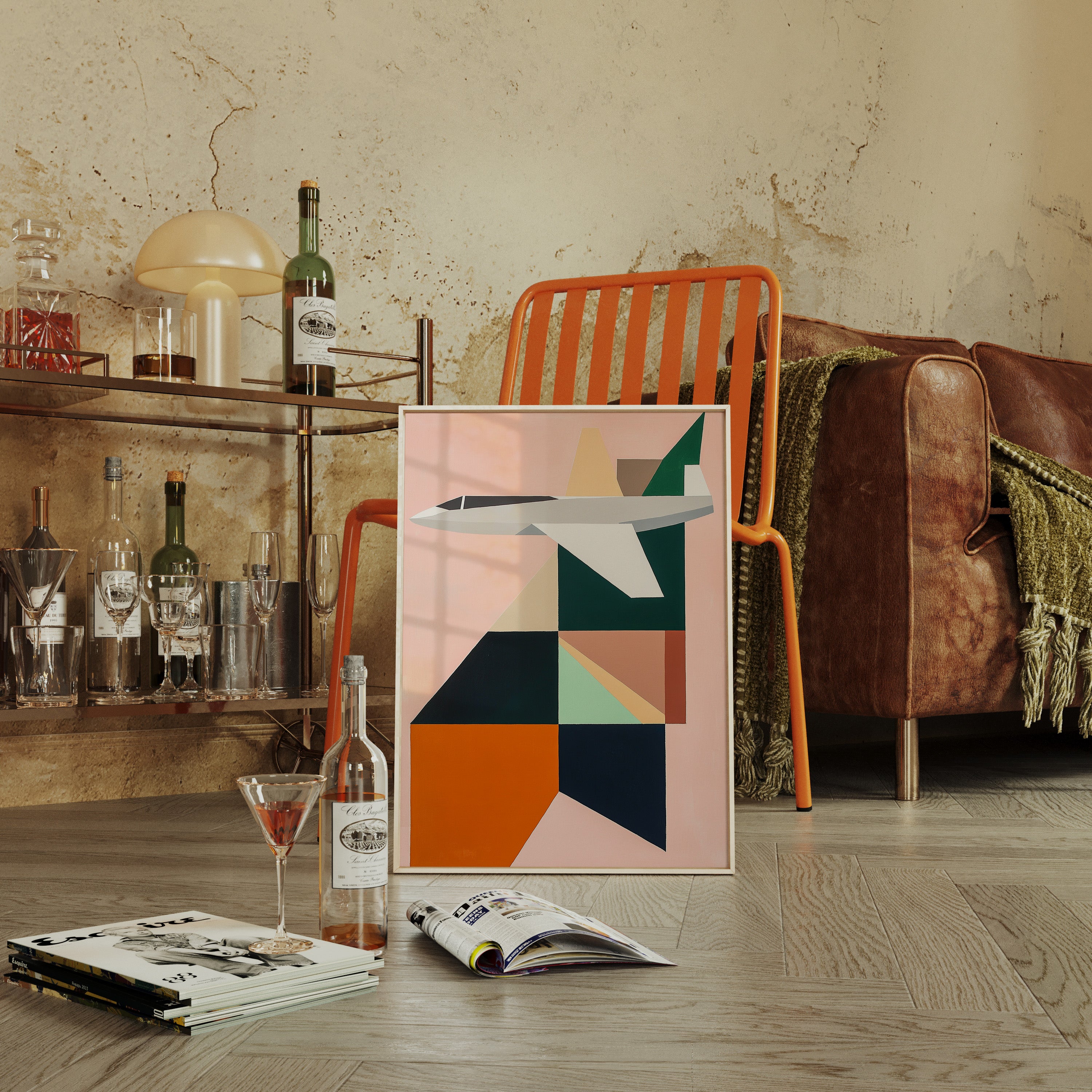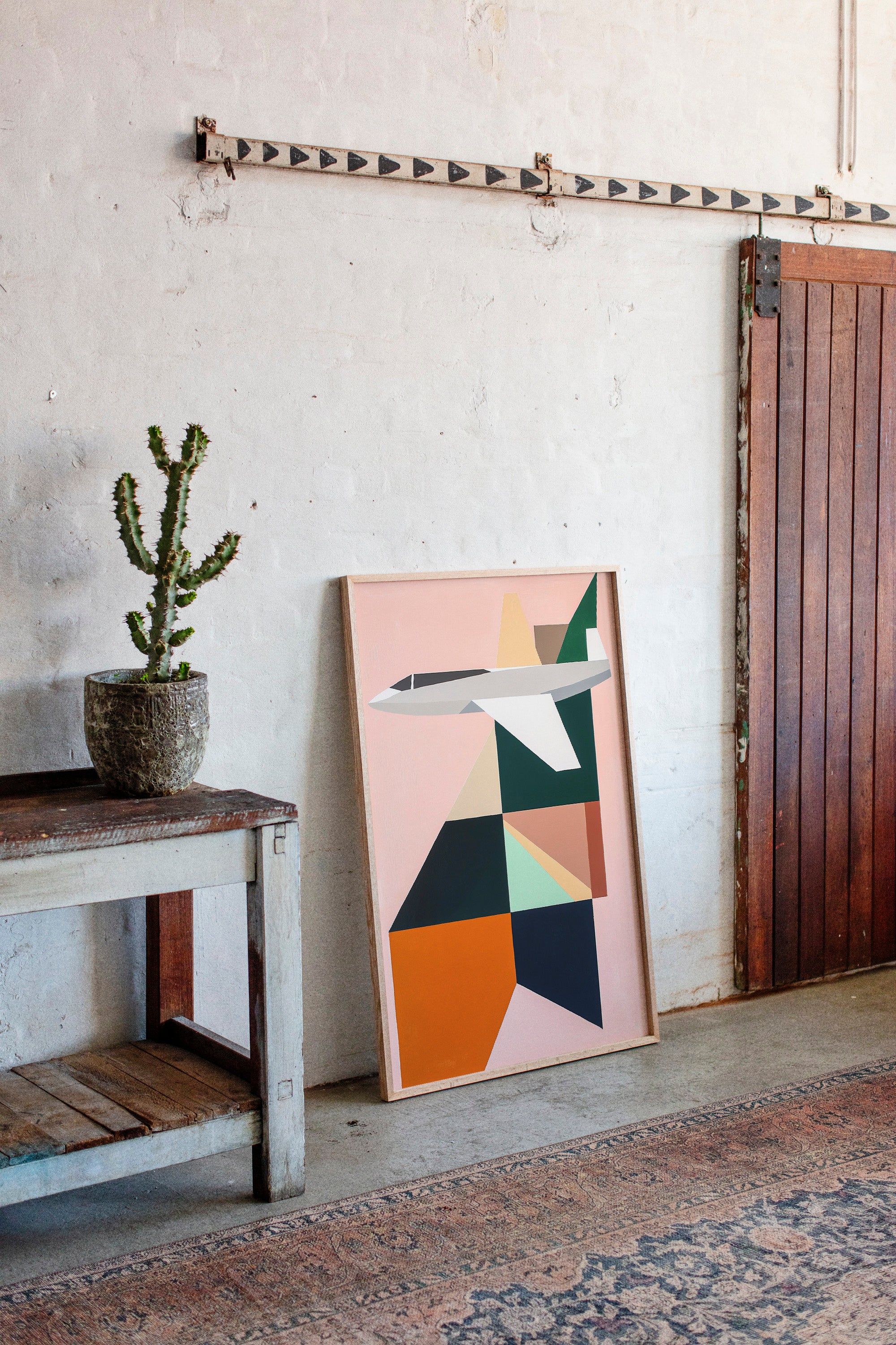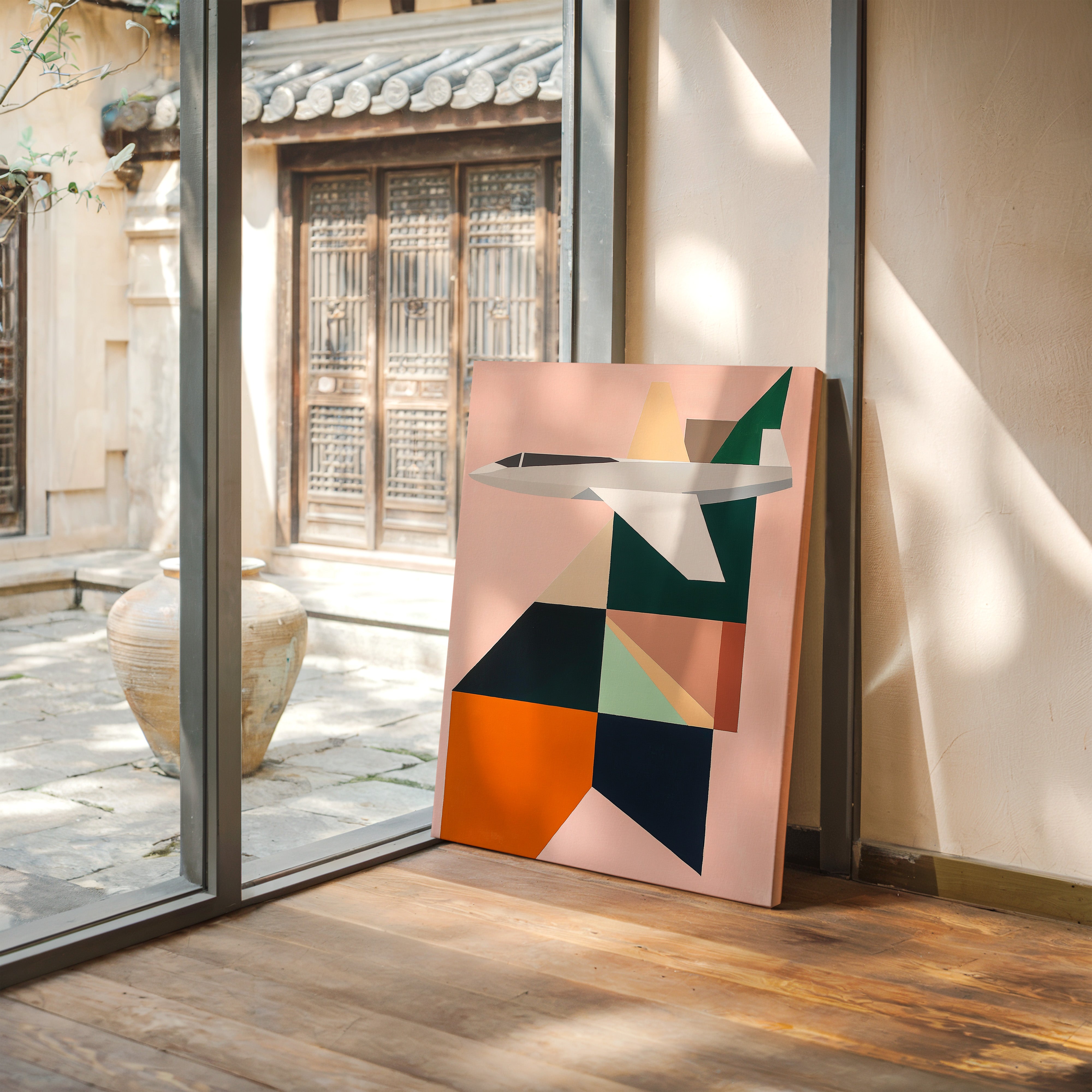 A sleek aircraft glides through a composition of bold geometric shapes, creating a striking contrast between mechanical precision and artistic abstraction. The interplay of angular forms in forest green, burnt orange, and soft pink builds a modernist landscape that challenges traditional perspective. Clean lines and color blocking evoke the aesthetic of mid-century design while maintaining contemporary sophistication. This piece would make a compelling statement in a modern home office or creative studio space, where its dynamic energy can inspire innovation and forward thinking.