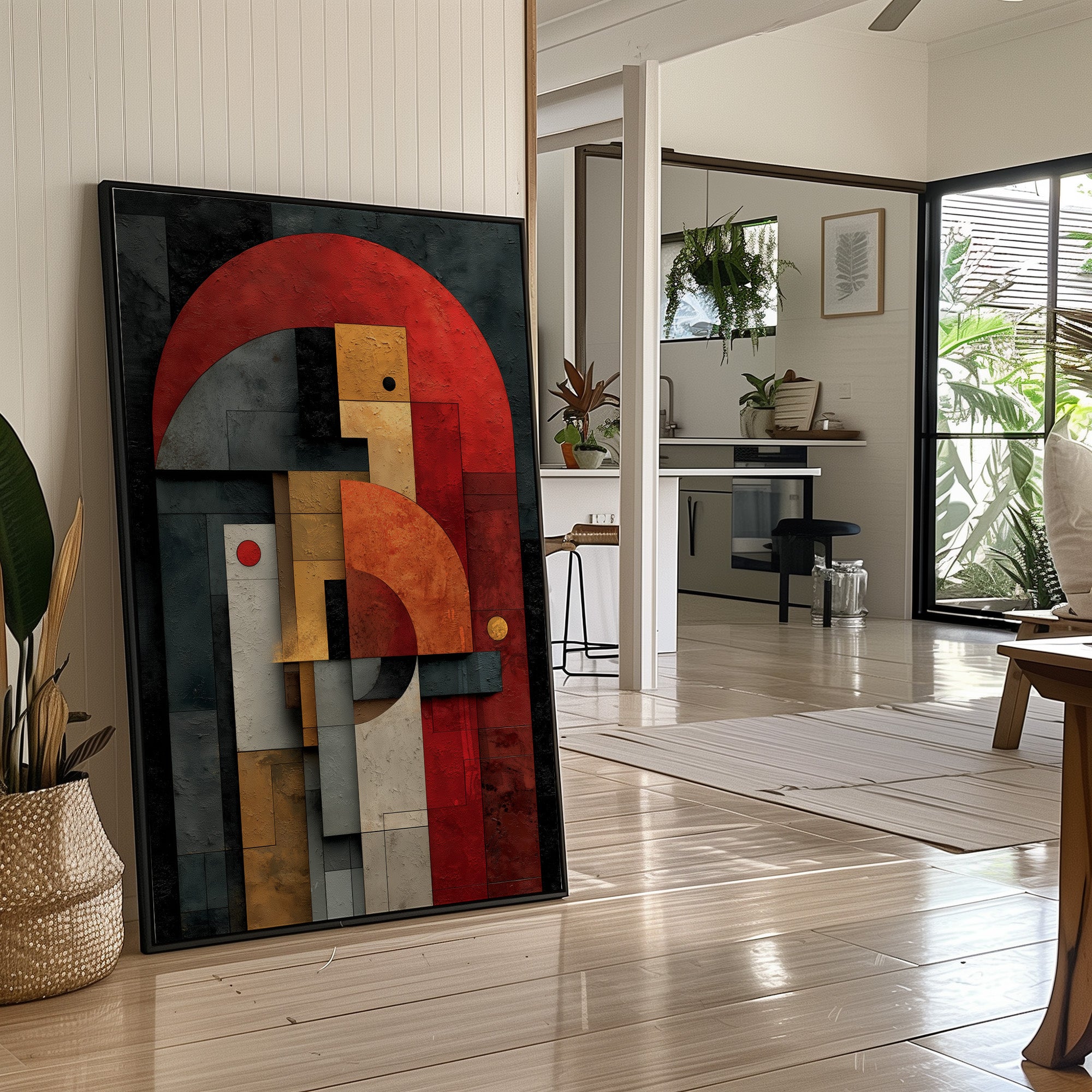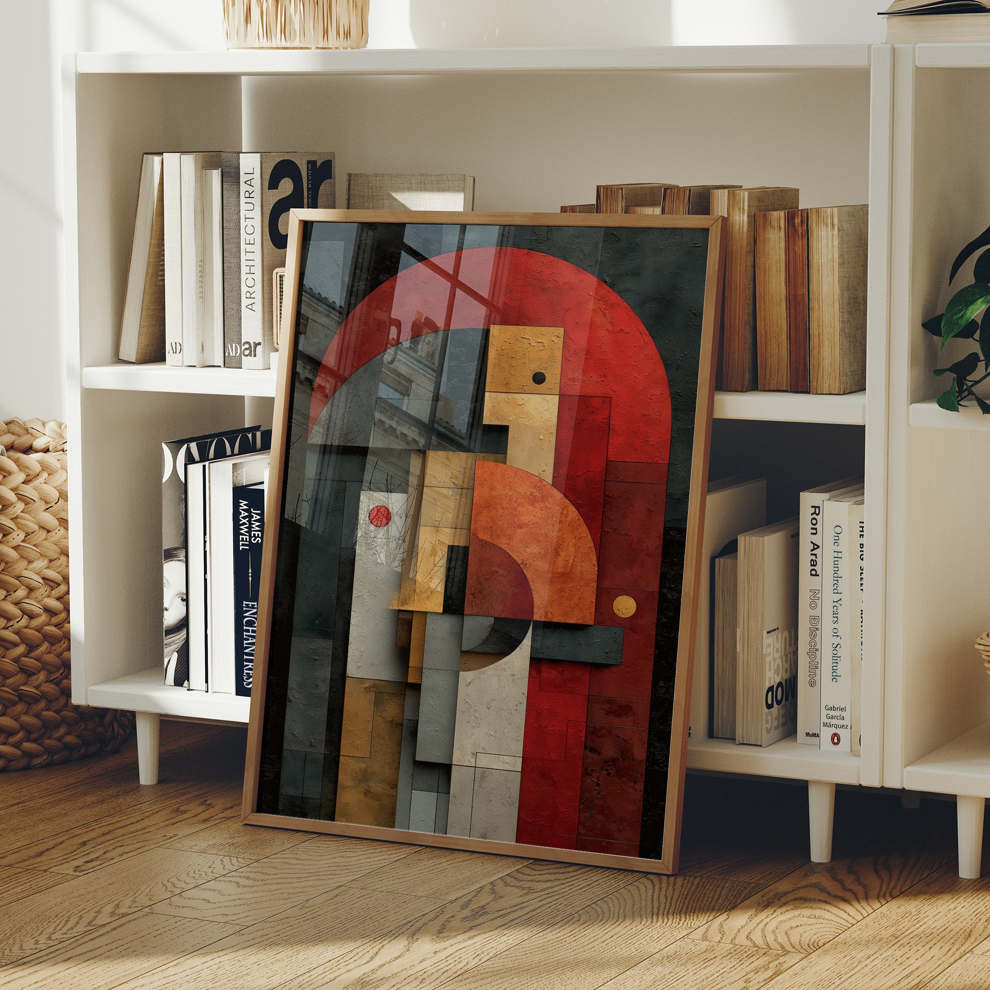 Angular forms dance across the canvas in a bold composition of crimson, ochre, and slate. Architectural elements merge with abstract shapes, creating a sophisticated interplay of industrial tones and modernist sensibility. The piece draws inspiration from constructivist design, with layered geometric forms suggesting both mechanical precision and artistic freedom. This statement piece would command attention in a contemporary office space or add sophisticated drama to a minimalist living room.