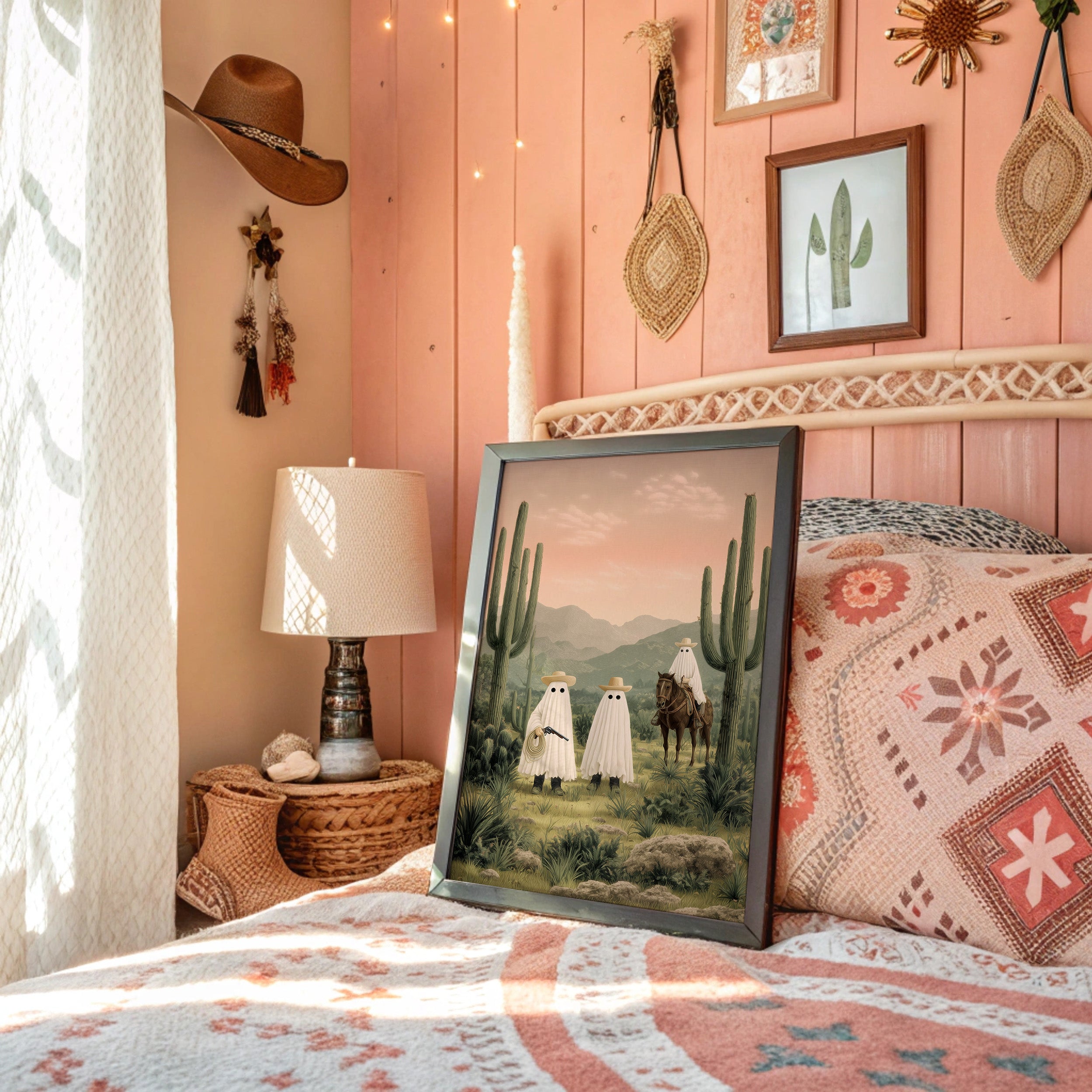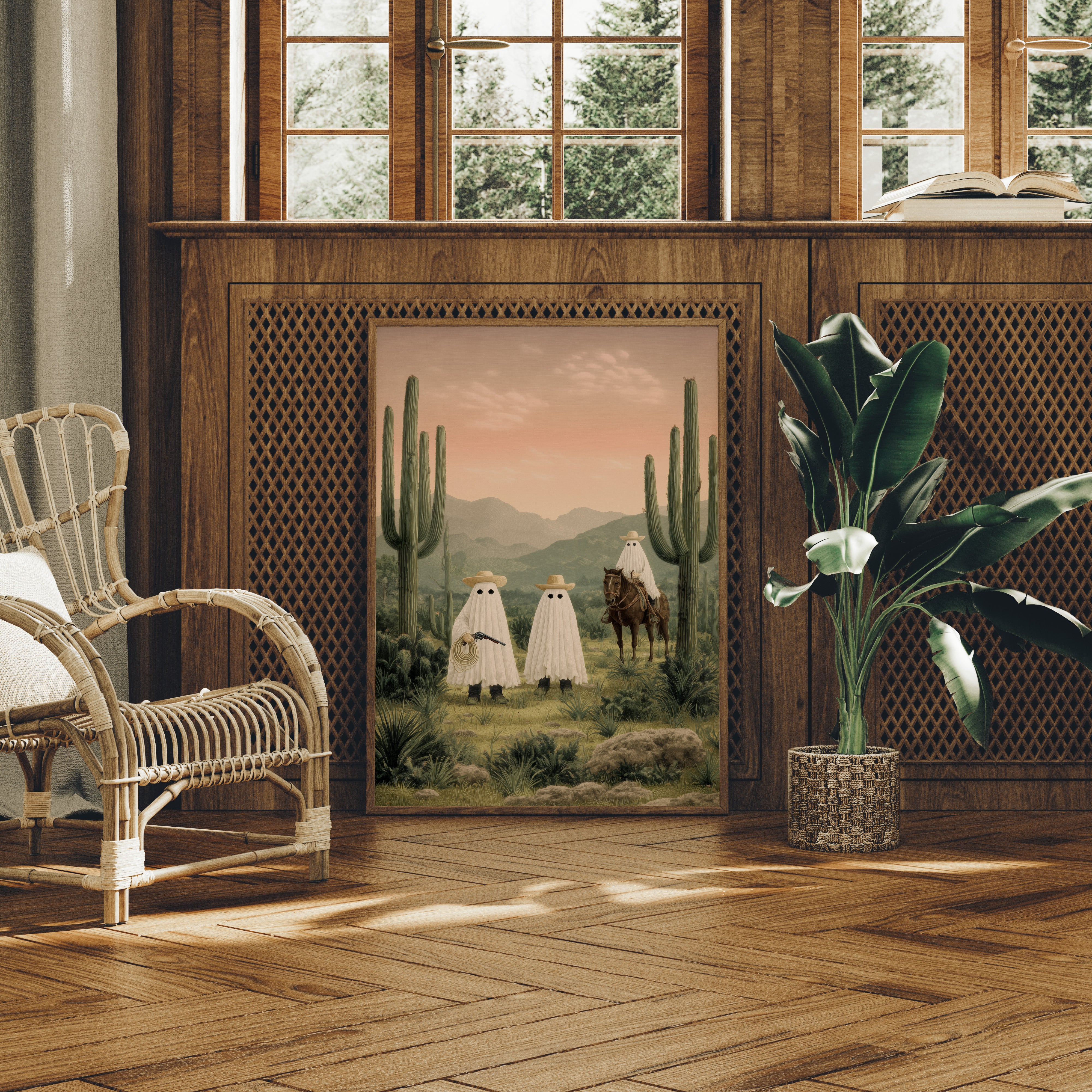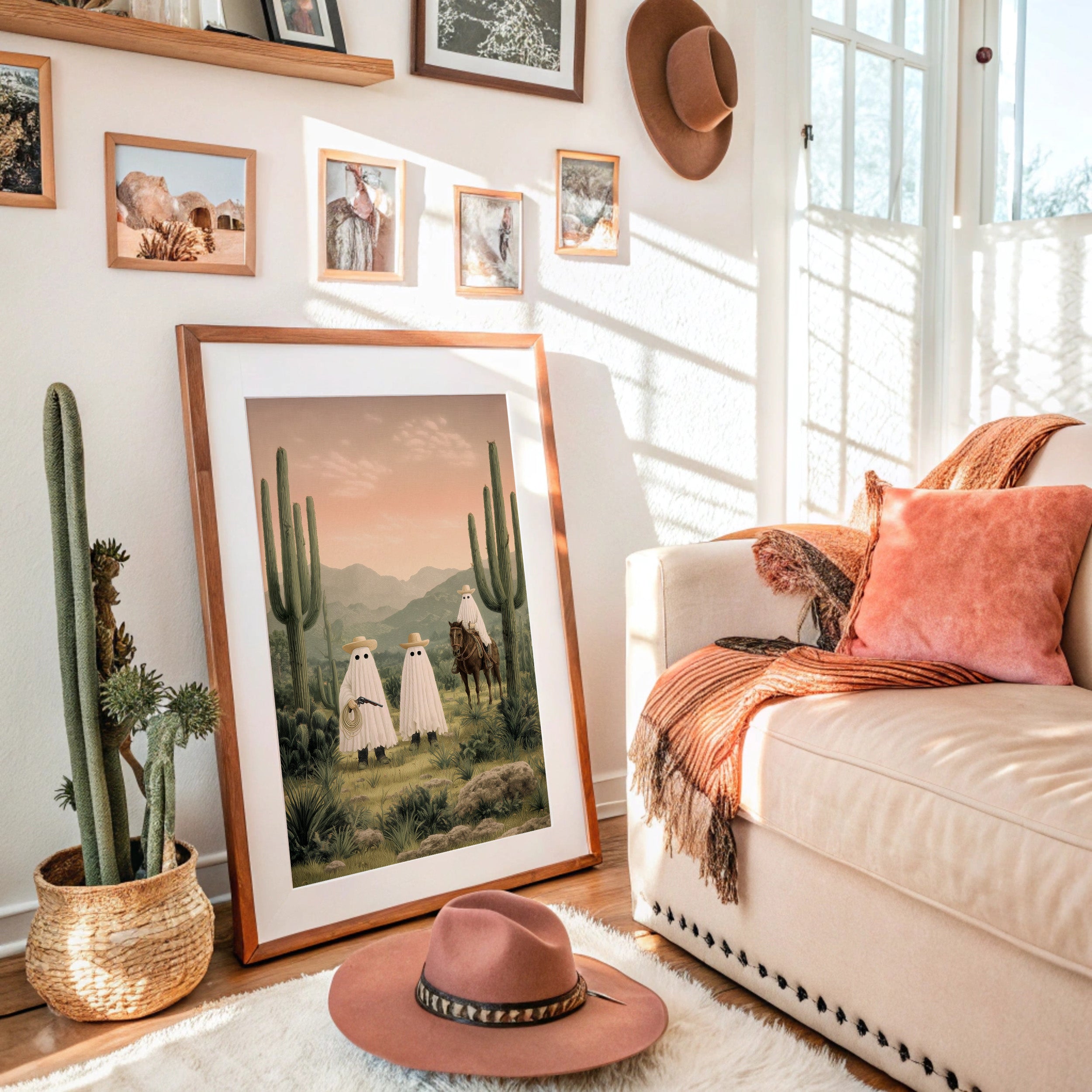 A whimsical scene unfolds in the dusty desert twilight, where spectral figures gather among towering saguaros. The soft pink sky bathes the landscape in ethereal light, casting long shadows across the rugged terrain while mysterious sheeted forms commune with a lone horseman. Rich desert hues blend with misty mountains in the distance, creating an enchanting narrative that balances humor with haunting beauty. Perfect for adding a touch of southwestern surrealism to a modern living room, home office, or any space that celebrates the quirky spirit of desert folklore.