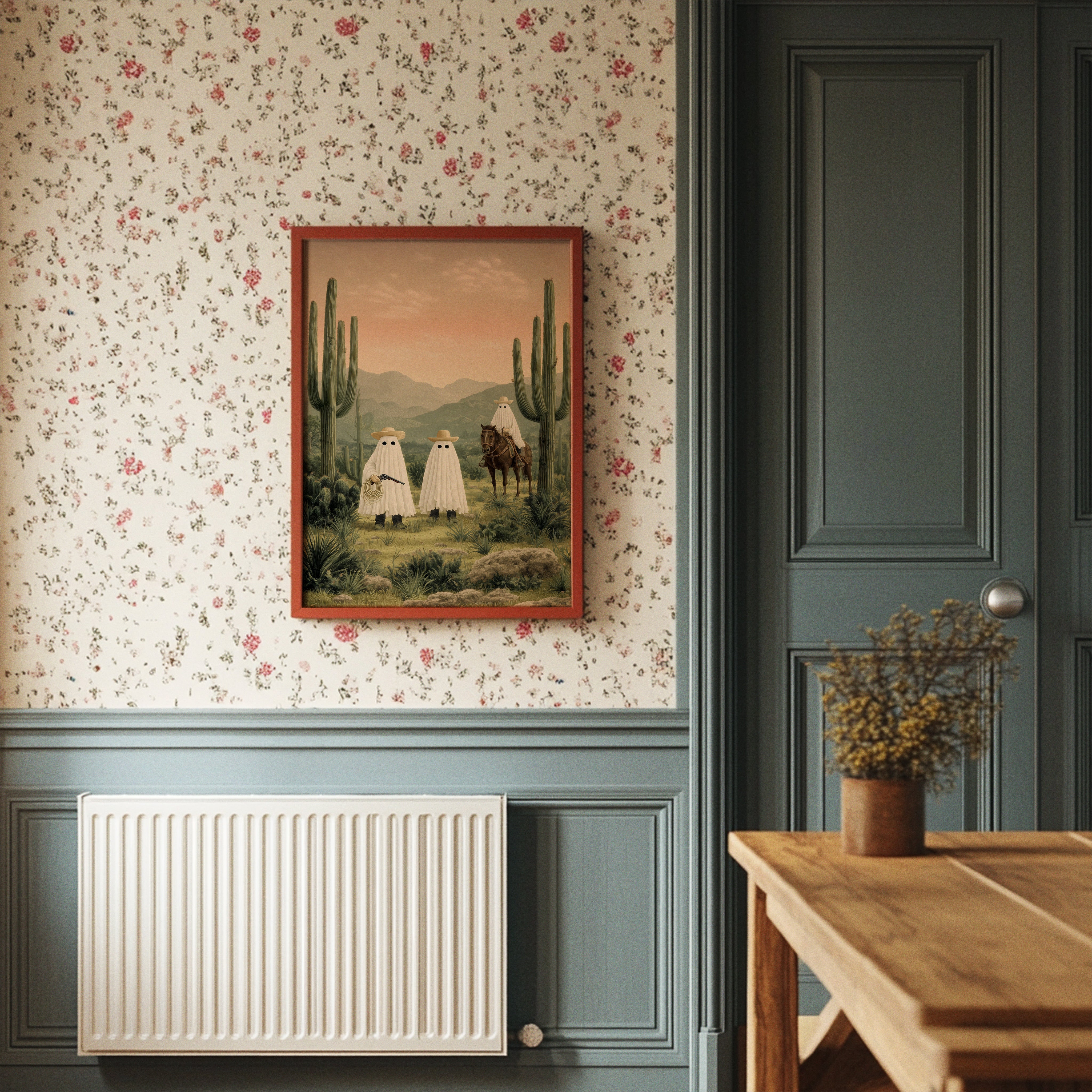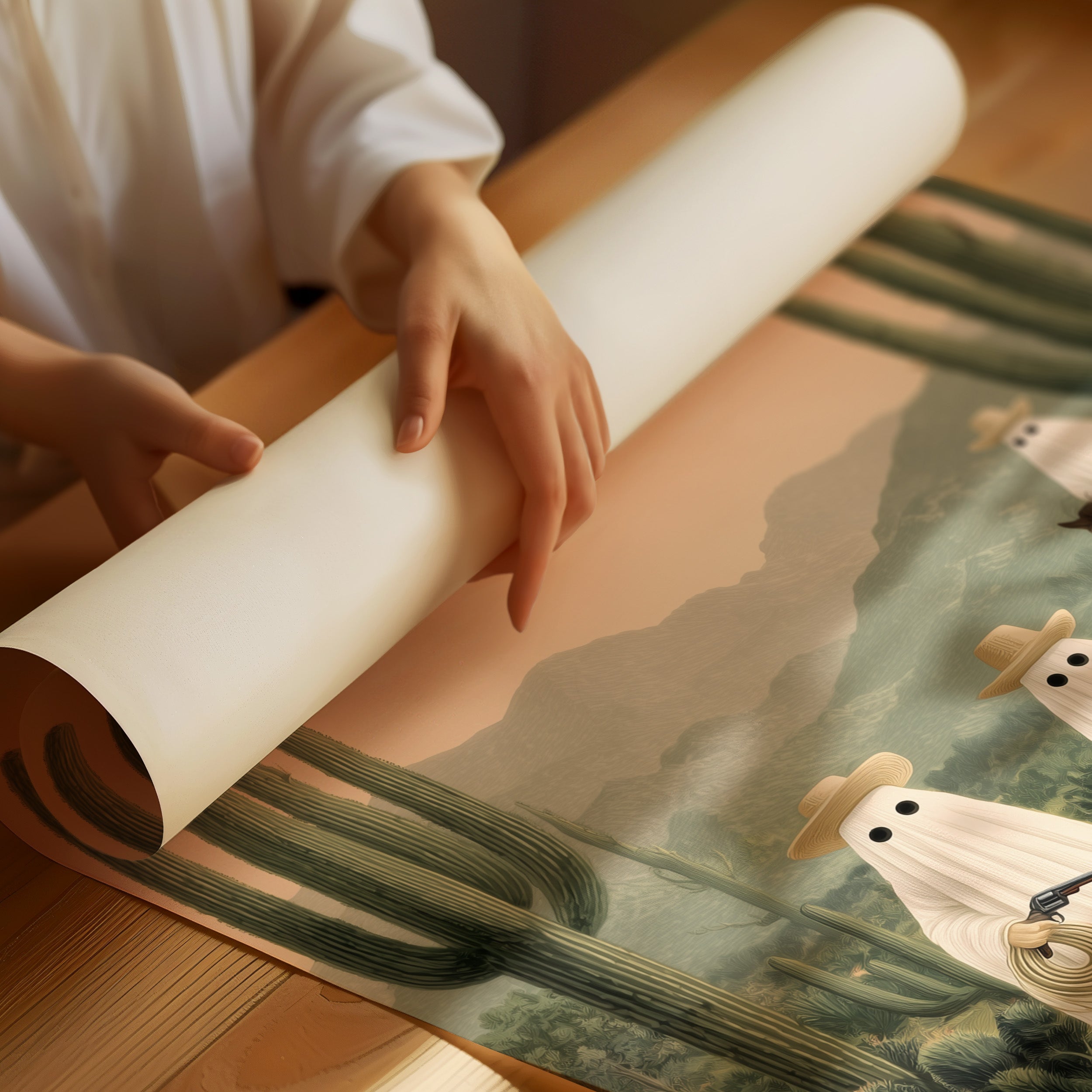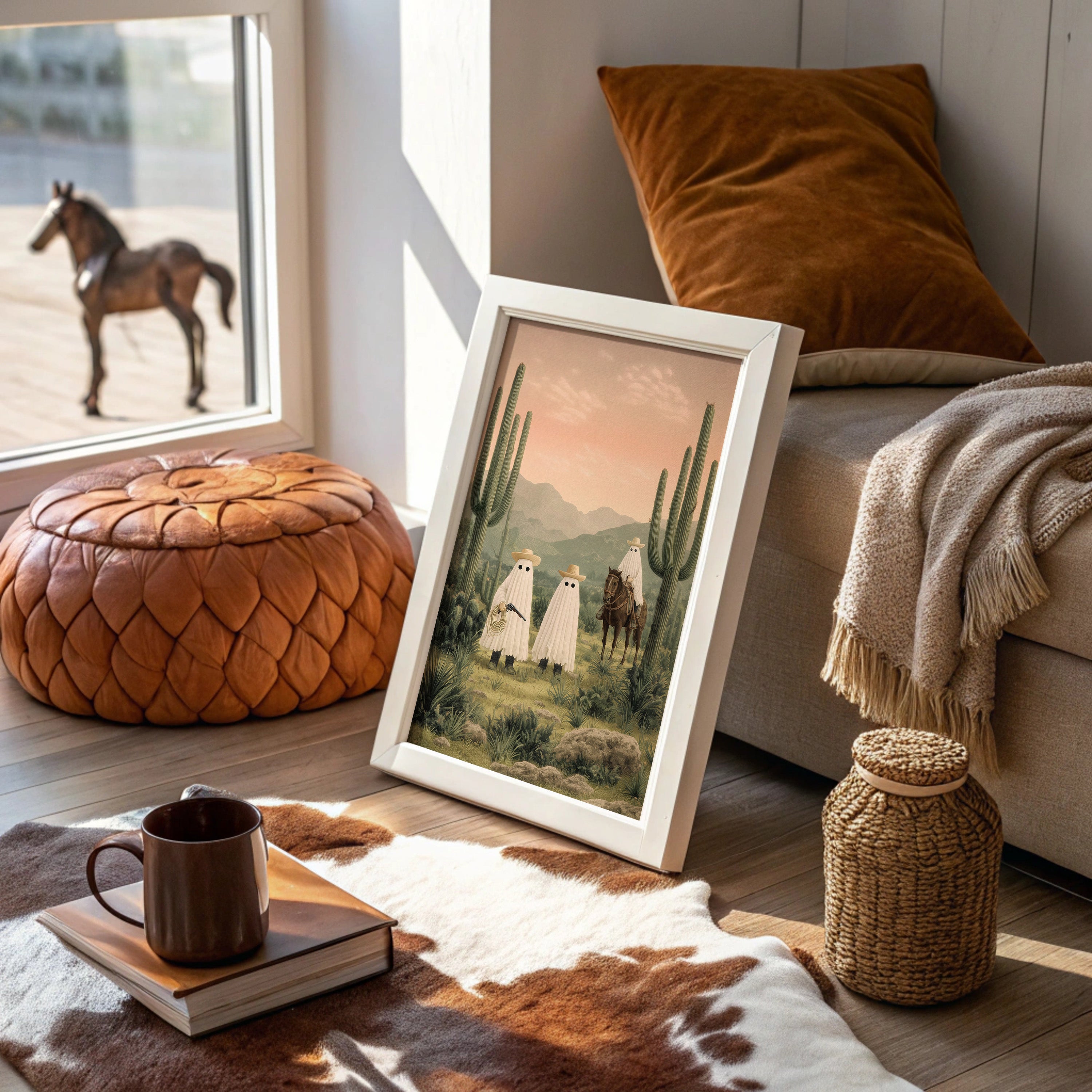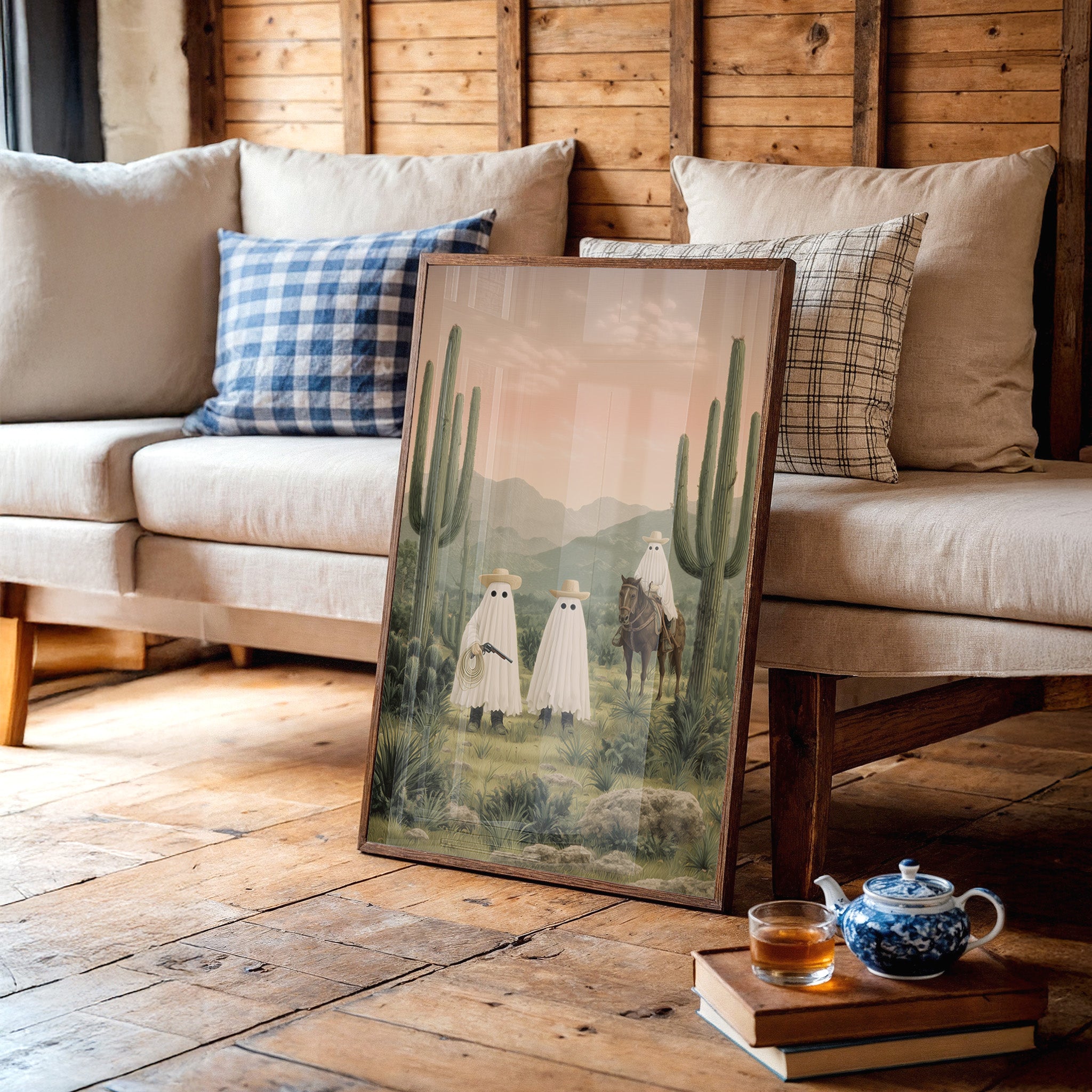 A whimsical scene unfolds in the dusty desert twilight, where spectral figures gather among towering saguaros. The soft pink sky bathes the landscape in ethereal light, casting long shadows across the rugged terrain while mysterious sheeted forms commune with a lone horseman. Rich desert hues blend with misty mountains in the distance, creating an enchanting narrative that balances humor with haunting beauty. Perfect for adding a touch of southwestern surrealism to a modern living room, home office, or any space that celebrates the quirky spirit of desert folklore.