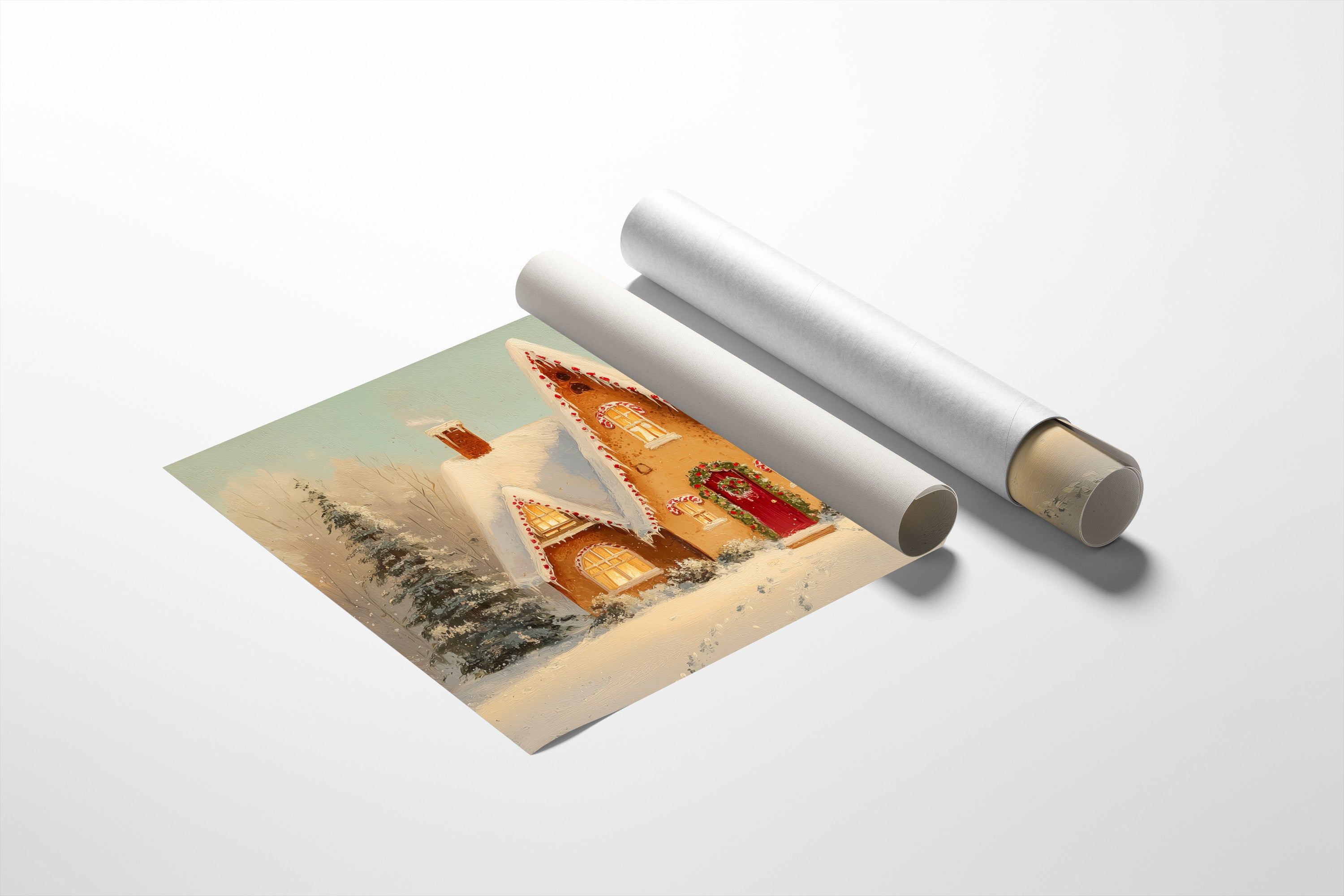 Golden light spills from frosted windows, warming the snowy evening air around a cluster of storybook cottages. The whimsical gingerbread houses, adorned with candy cane trim and powdered sugar snow, stand like sweet sentinels against a misty winter forest backdrop. Evergreen guardians and delicate snowflakes create an enchanted scene, while the welcoming red door beckons with promises of warmth and celebration within. This nostalgic piece brings classic holiday charm to modern living spaces, perfect for creating a cozy seasonal focal point in family rooms or entryways.