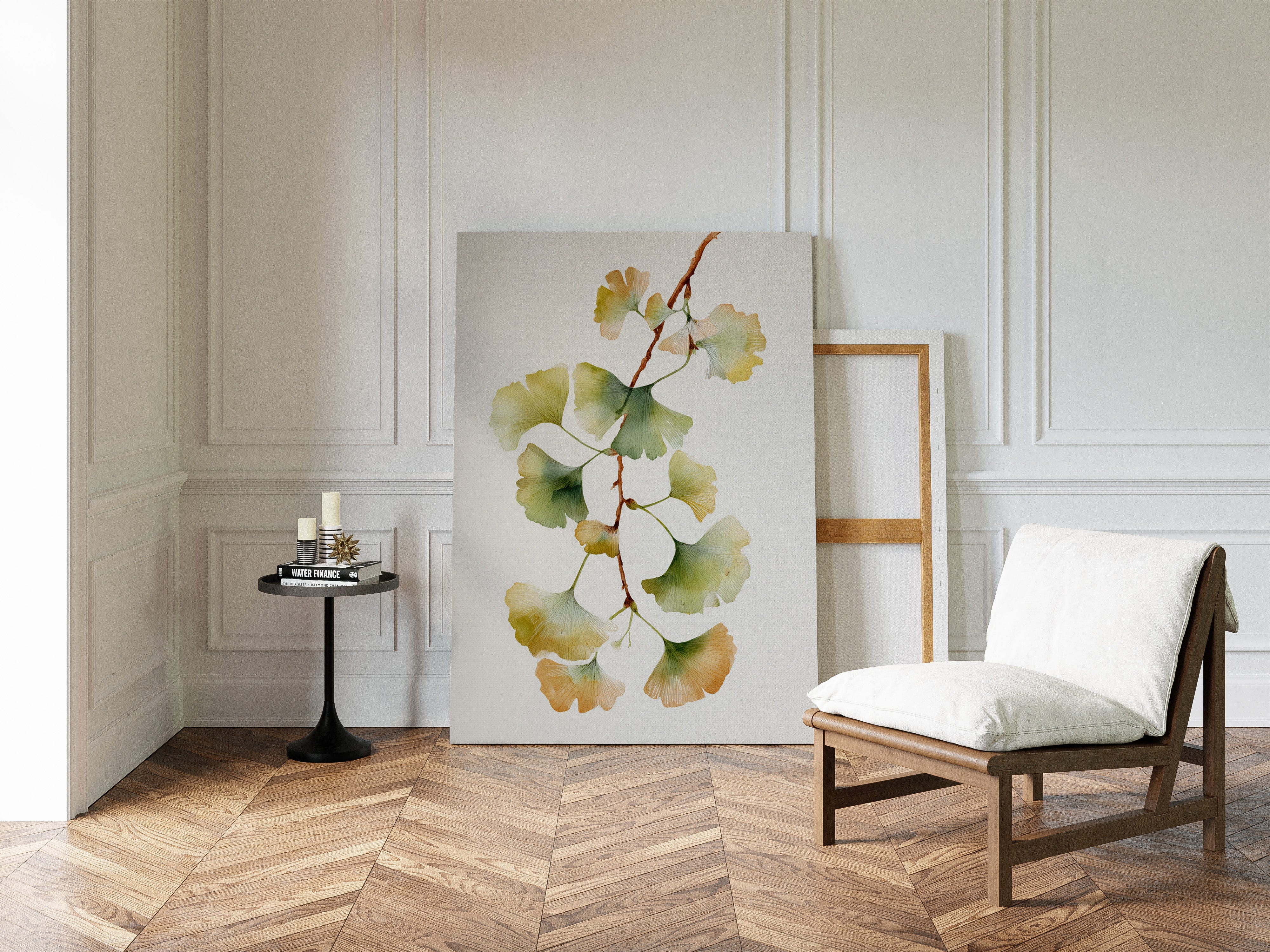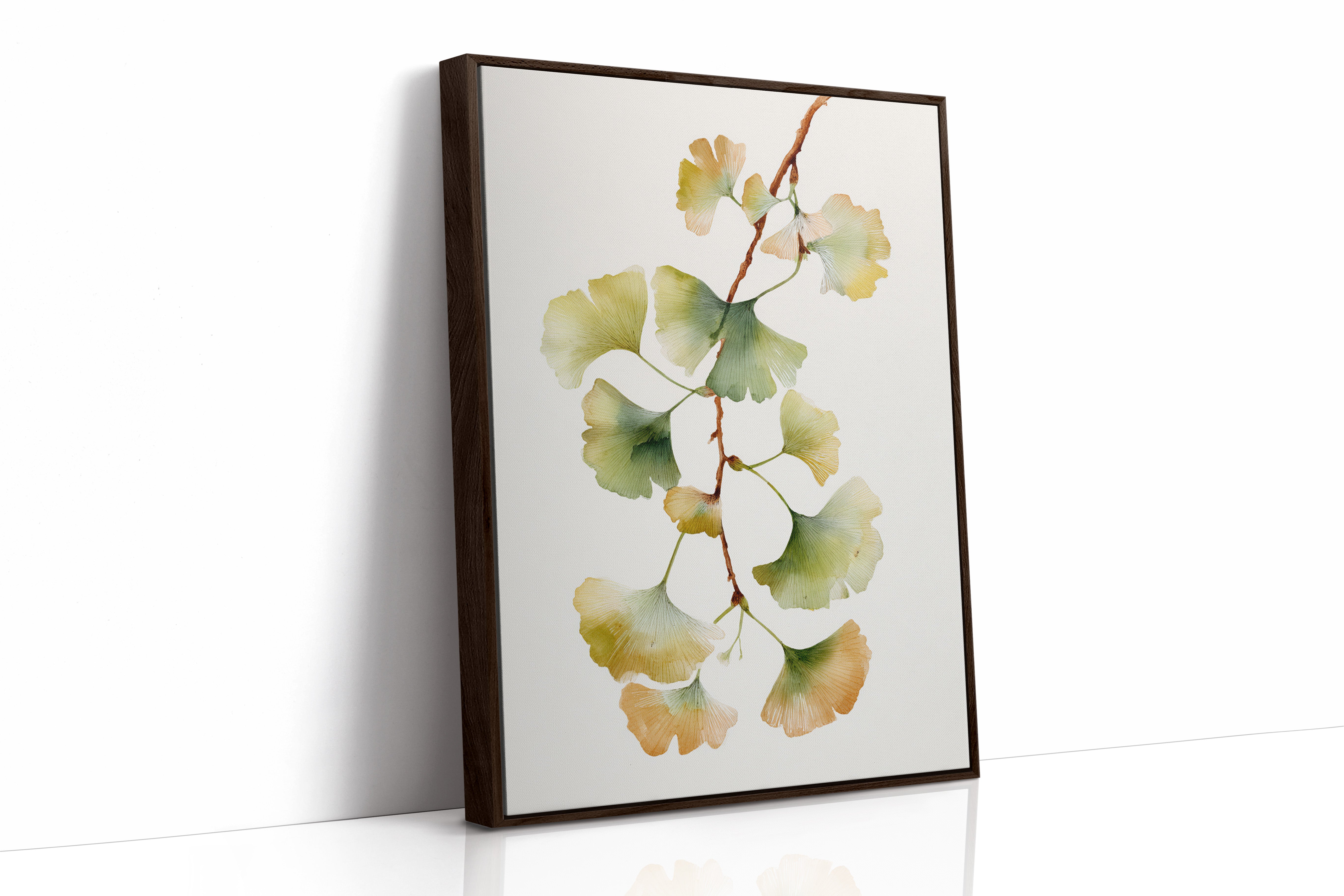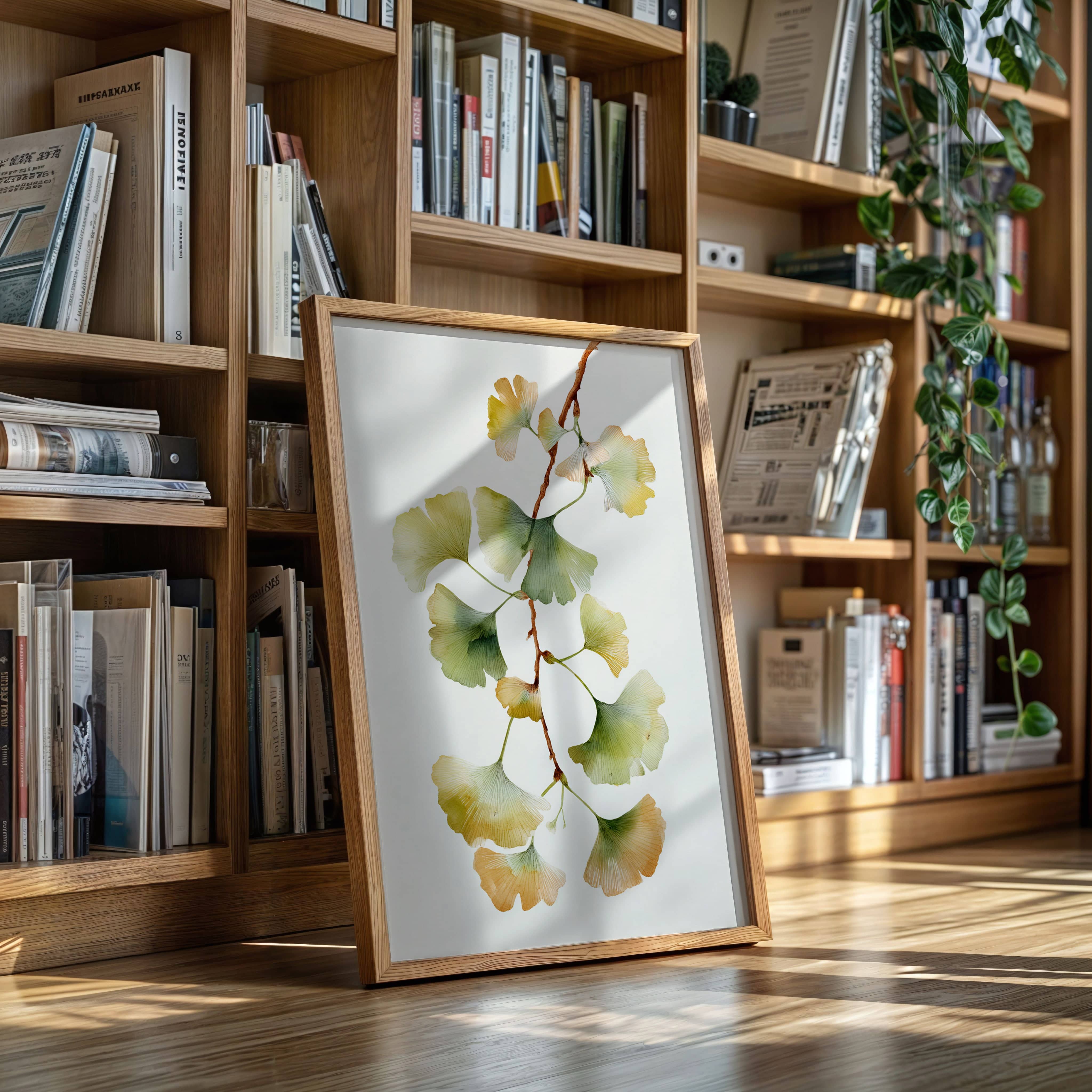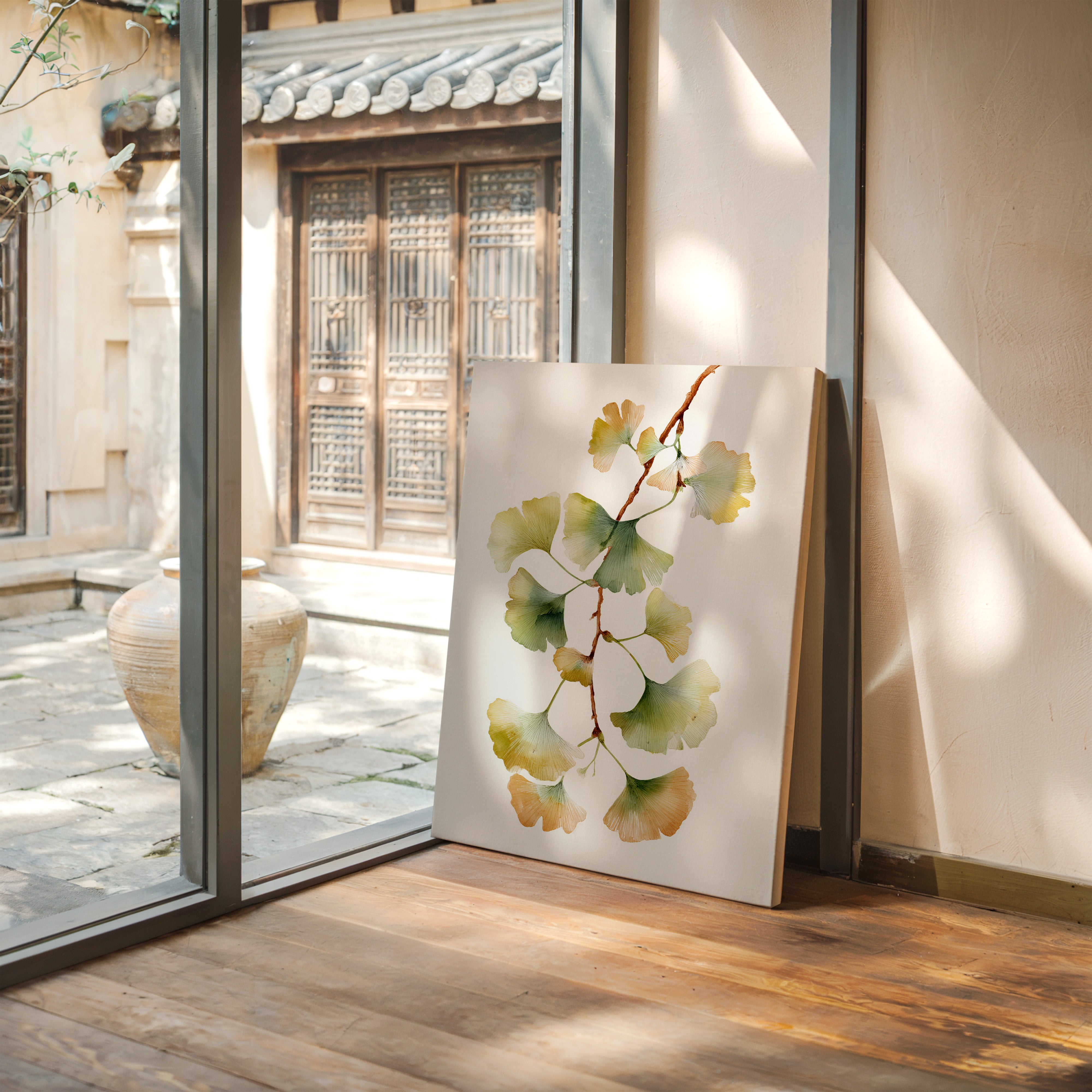 Delicate ginkgo leaves cascade like falling notes in a gentle melody, their fan-shaped forms dancing against pristine white. Each leaf tells a story through subtle gradients of sage green to warm honey gold, effect that captures the essence of changing seasons. The brown stem acts as an anchor, allowing the leaves to float with botanical grace while detailed veining adds intricate texture to each delicate form. This piece would bring a sense of organic serenity to a reading nook or meditation space, where its gentle color palette can inspire moments of peaceful contemplation.