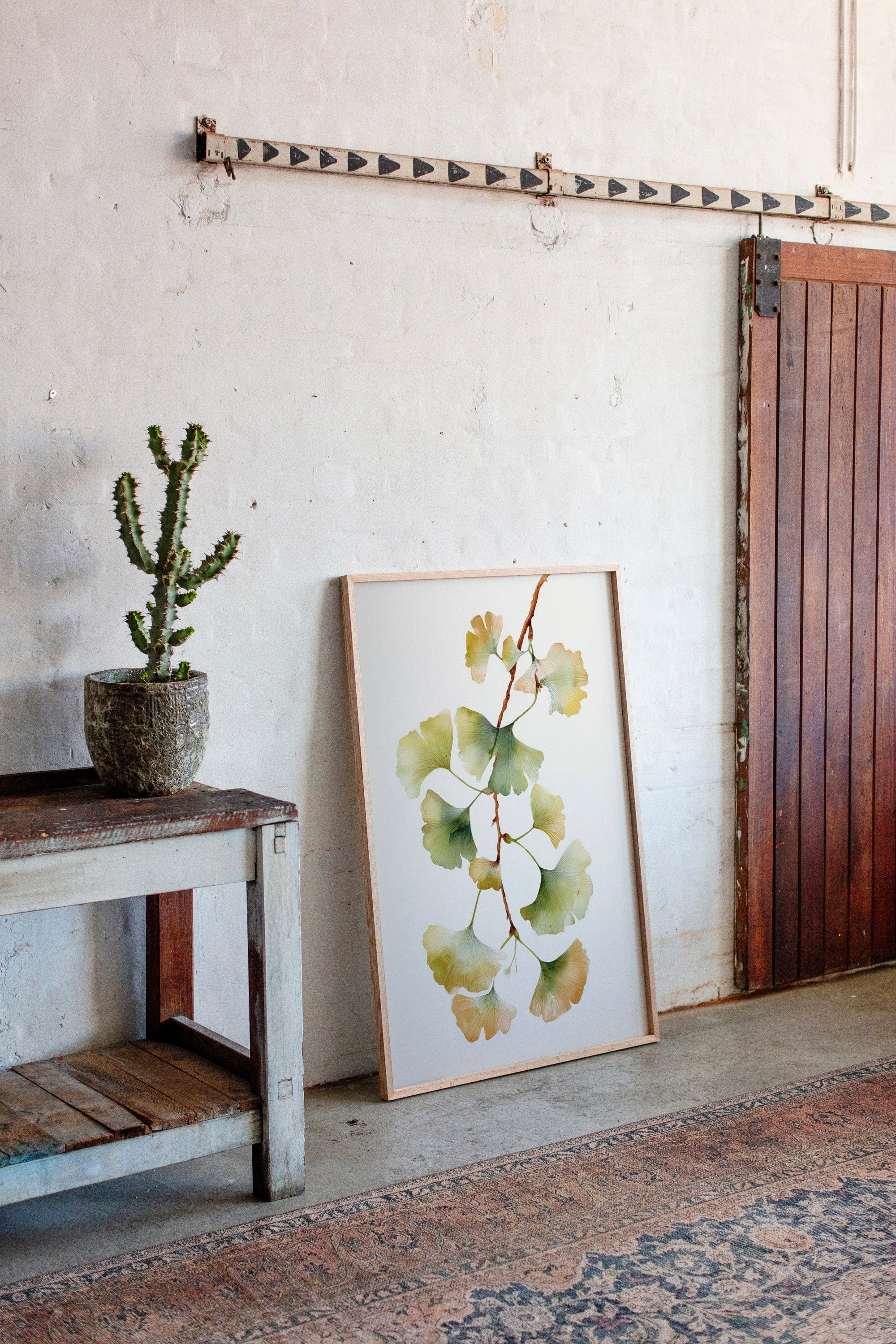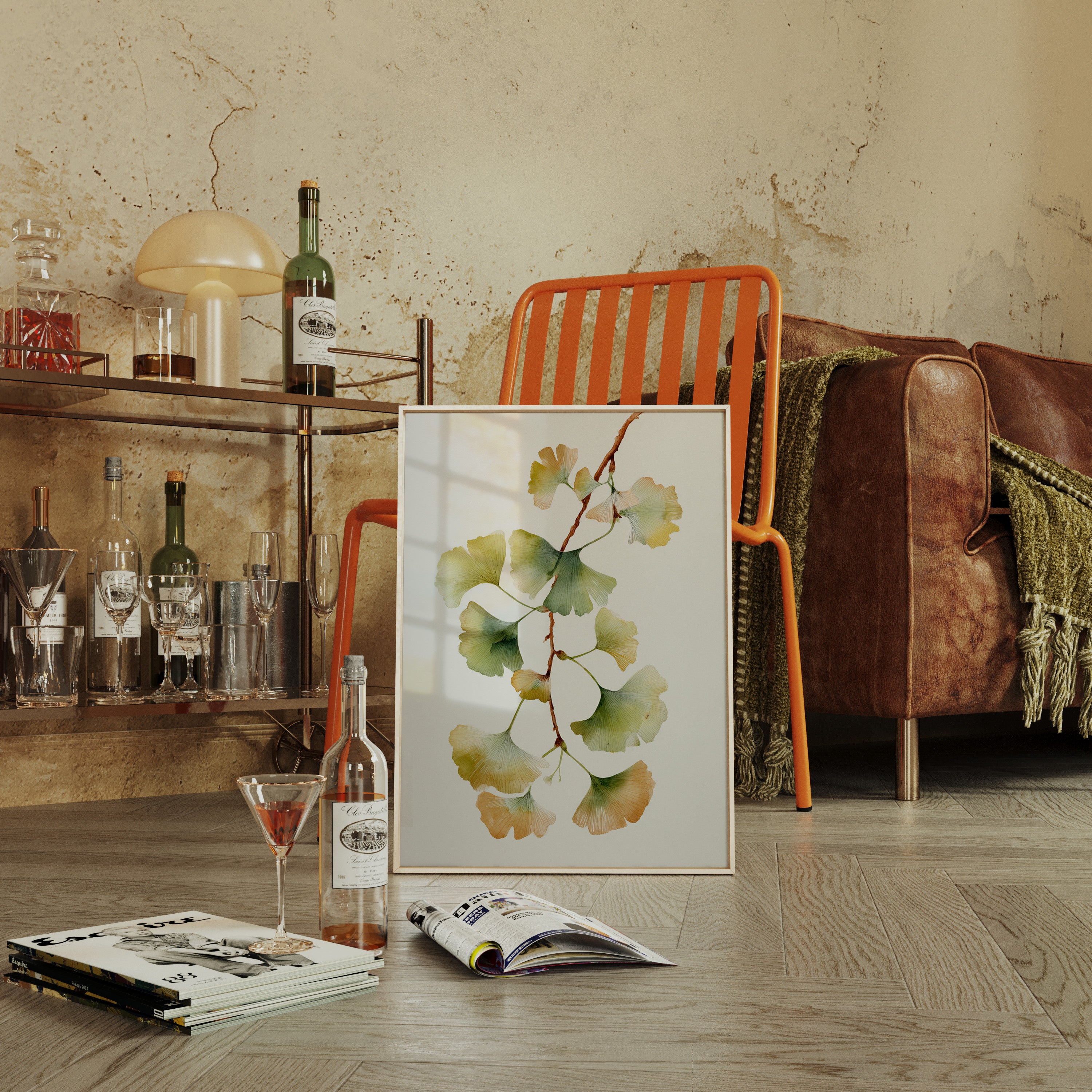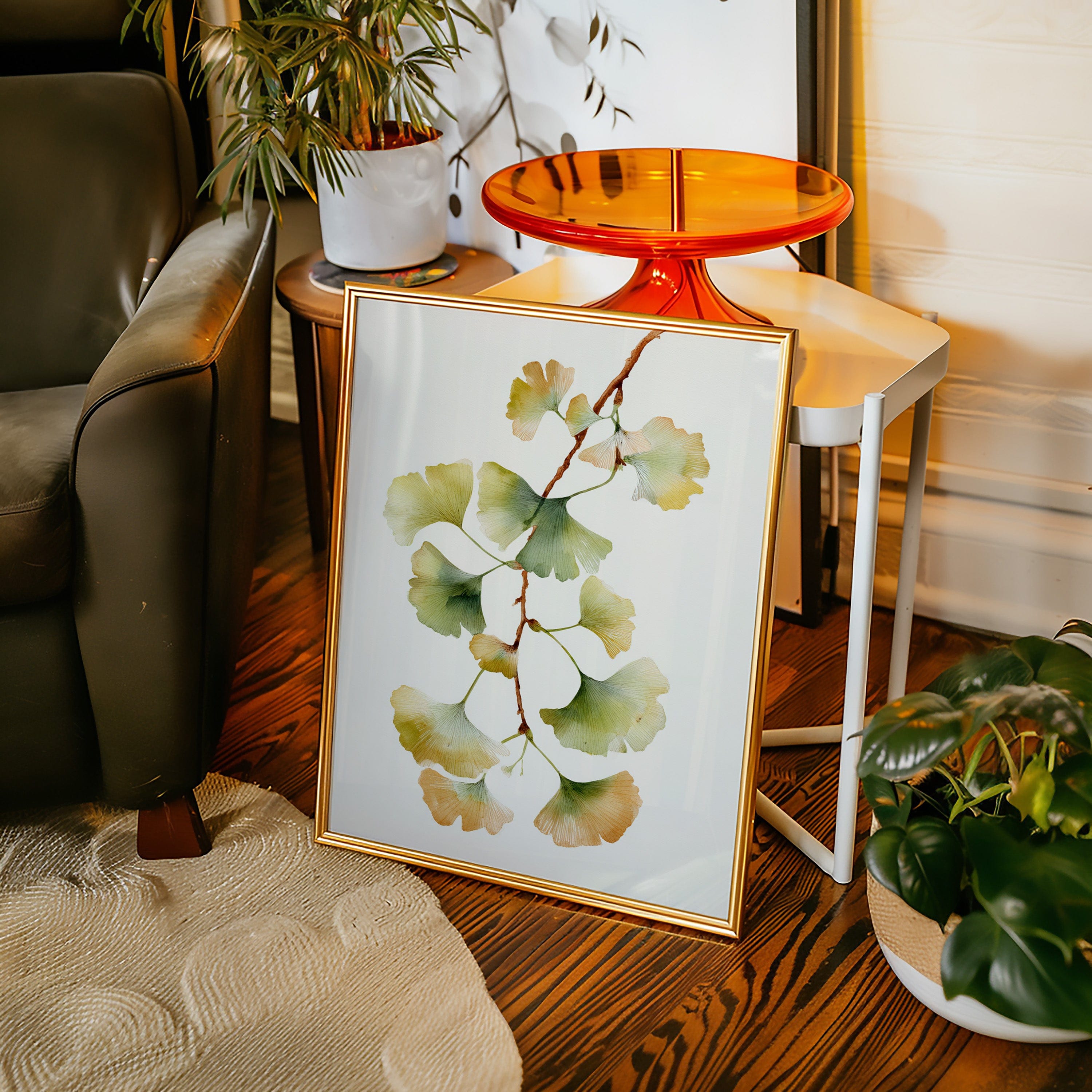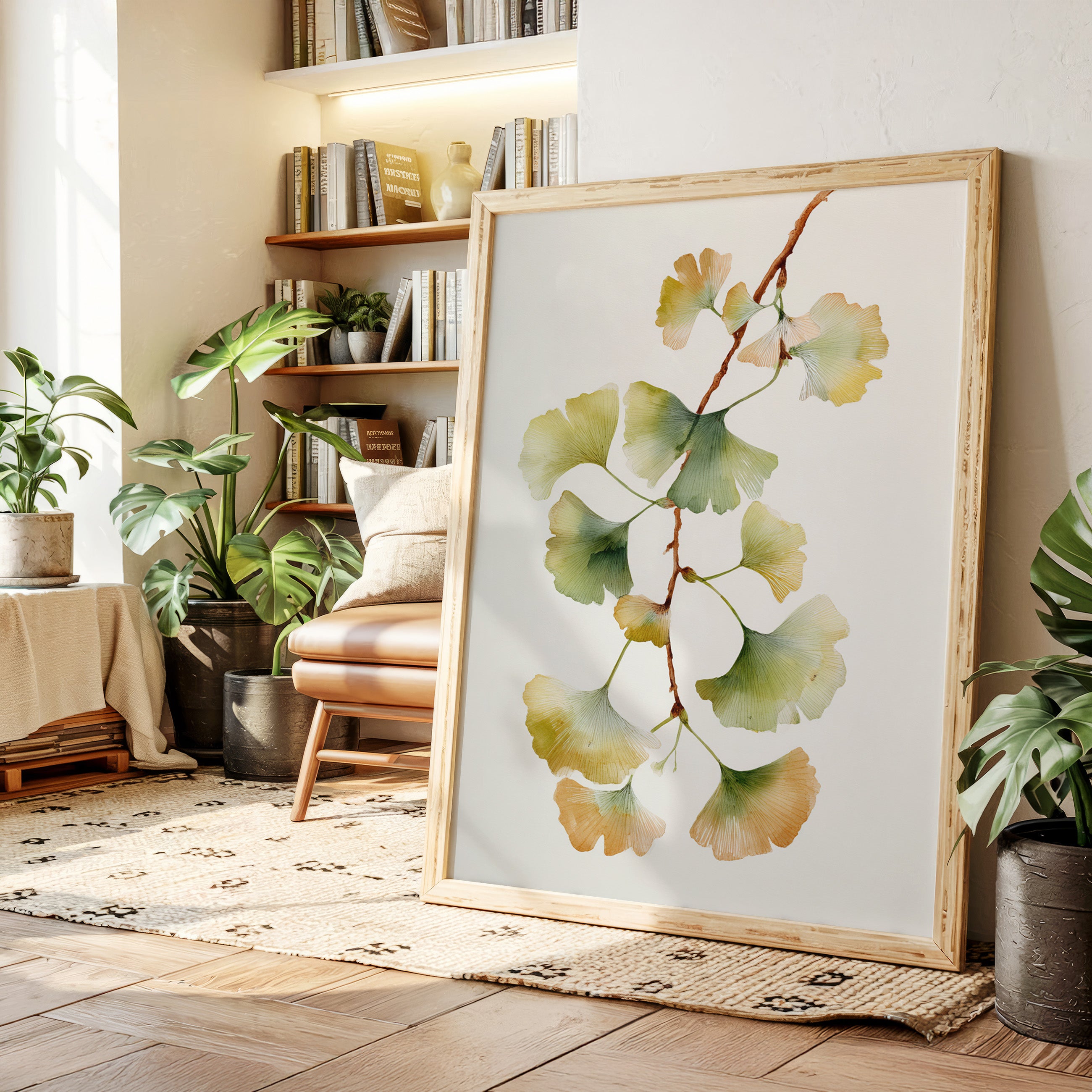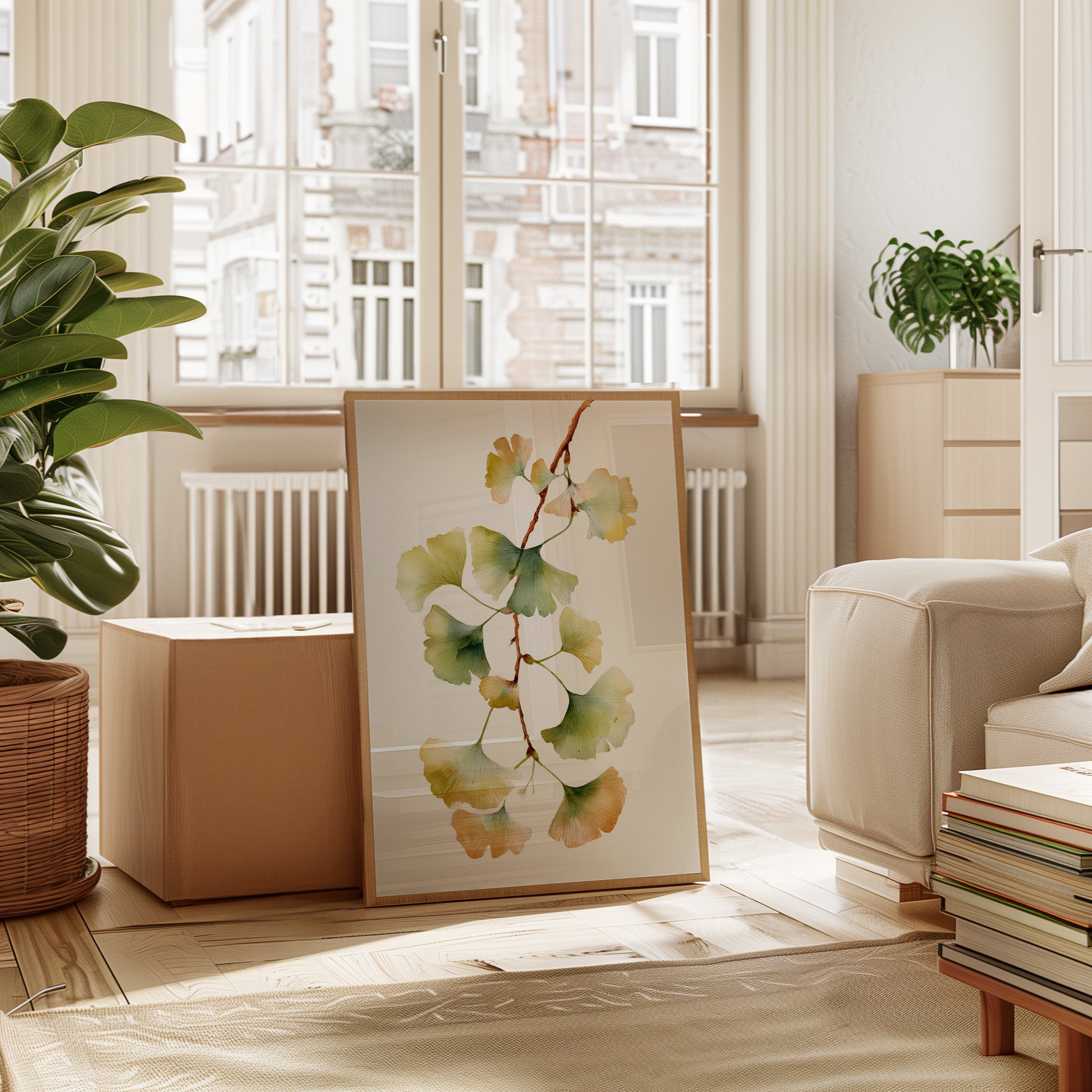 Delicate ginkgo leaves cascade like falling notes in a gentle melody, their fan-shaped forms dancing against pristine white. Each leaf tells a story through subtle gradients of sage green to warm honey gold, effect that captures the essence of changing seasons. The brown stem acts as an anchor, allowing the leaves to float with botanical grace while detailed veining adds intricate texture to each delicate form. This piece would bring a sense of organic serenity to a reading nook or meditation space, where its gentle color palette can inspire moments of peaceful contemplation.