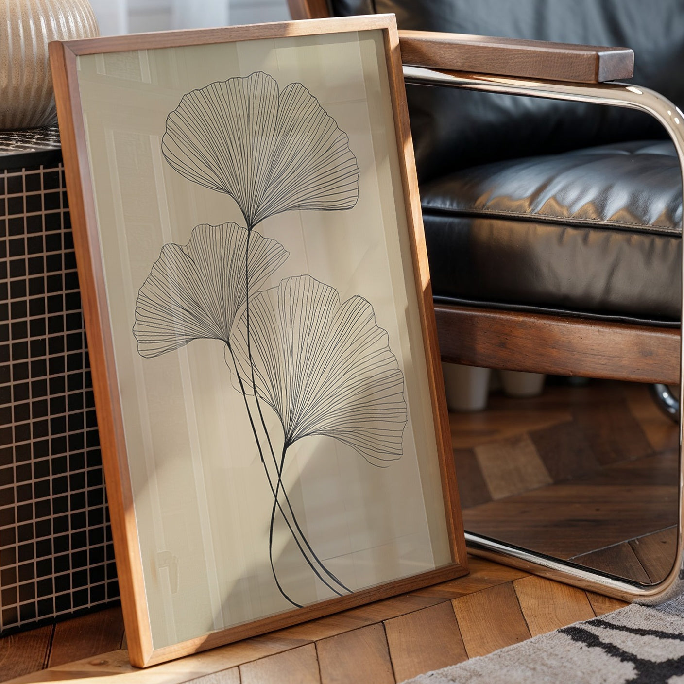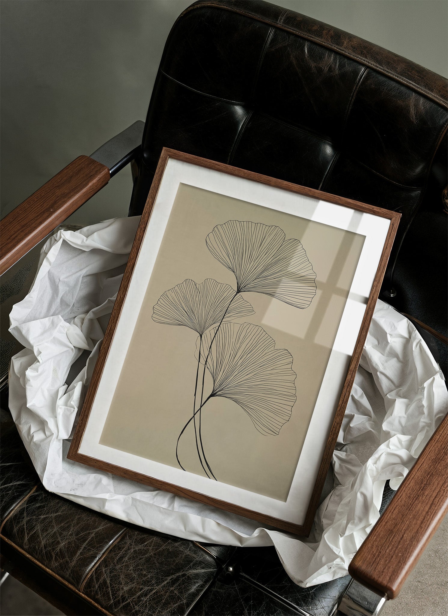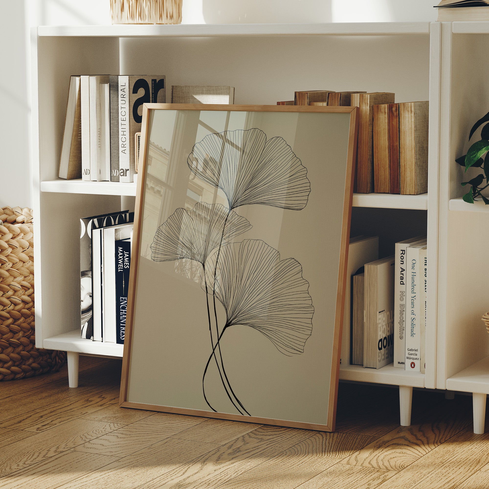 Delicate black lines trace the graceful arc of ginkgo leaves against a serene taupe background, capturing nature's elegant simplicity. The minimalist illustration showcases the fan-shaped leaves in a flowing, ascending composition that feels both botanical and abstract. Set within a warm wooden frame and nestled among curated bookshelves, the piece creates a harmonious dialogue between organic forms and modern design. This sophisticated botanical print would elevate any reading nook, home office, or living space where quiet contemplation meets artistic expression.