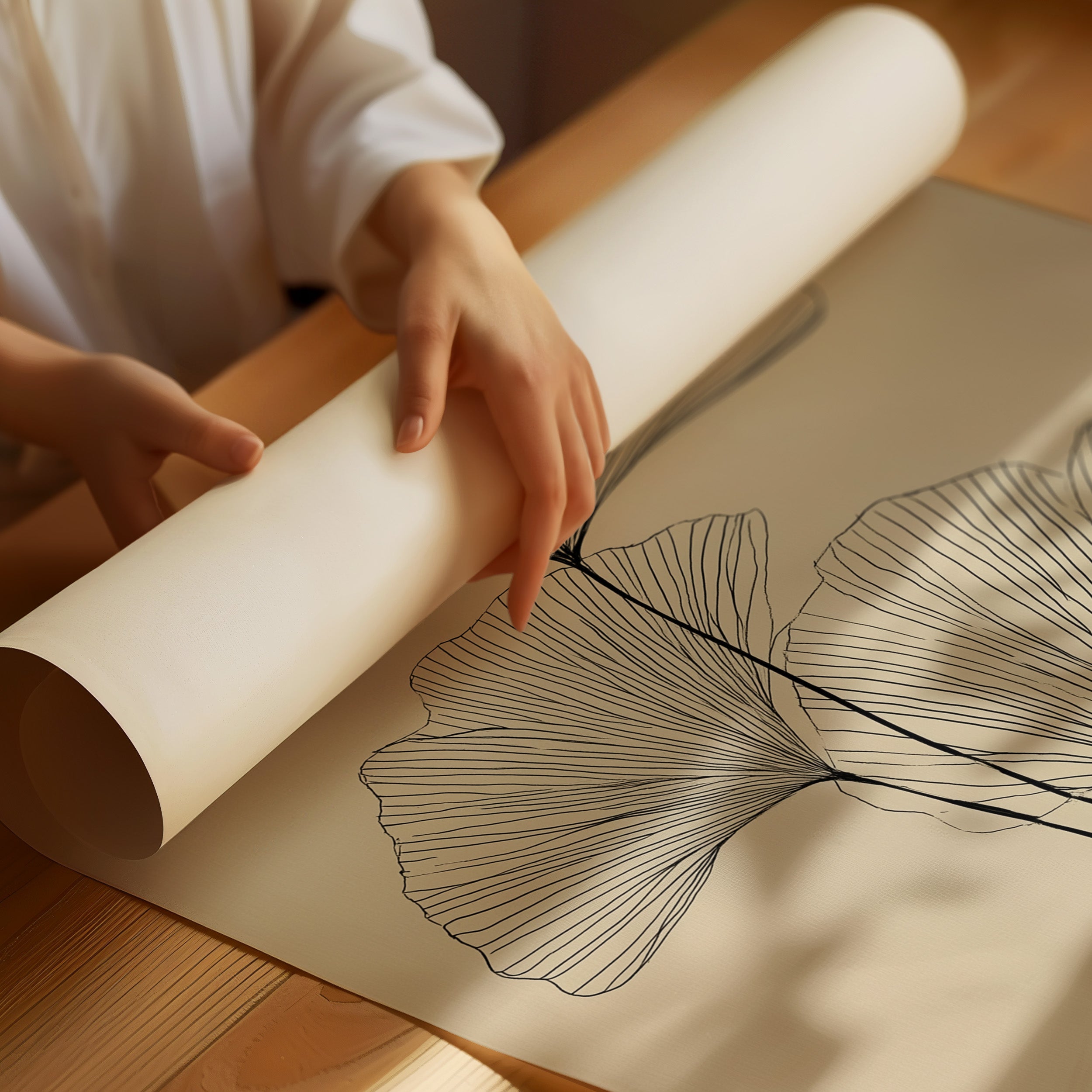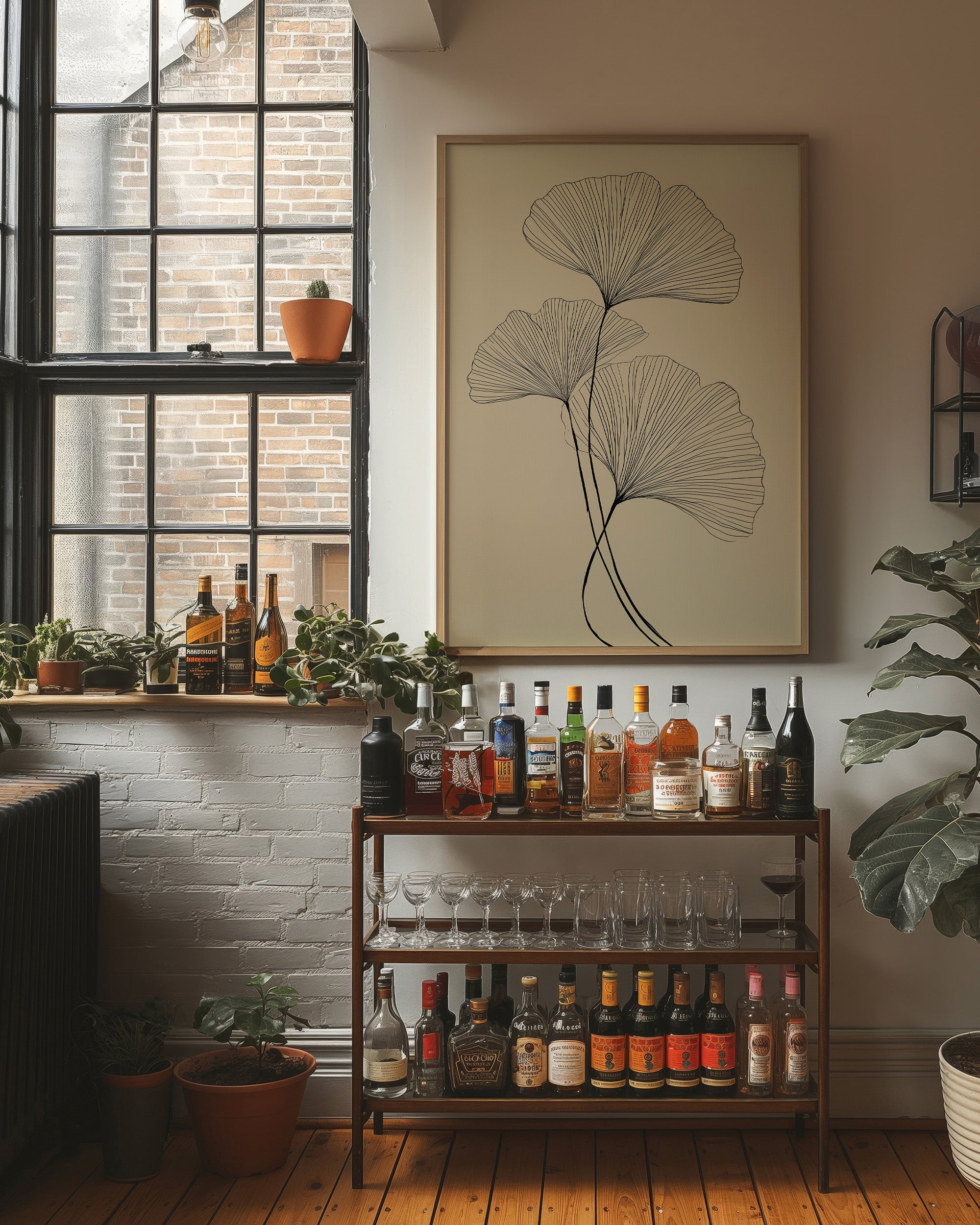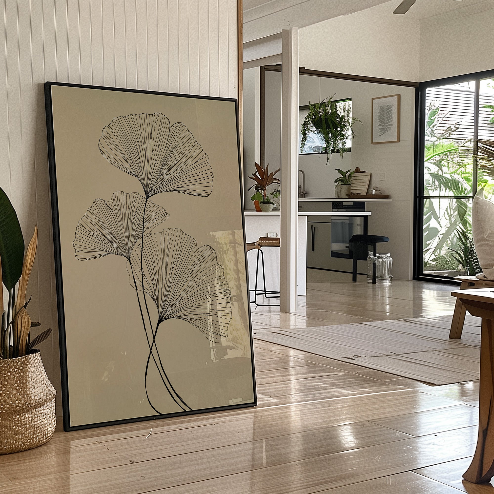 Delicate black lines trace the graceful arc of ginkgo leaves against a serene taupe background, capturing nature's elegant simplicity. The minimalist illustration showcases the fan-shaped leaves in a flowing, ascending composition that feels both botanical and abstract. Set within a warm wooden frame and nestled among curated bookshelves, the piece creates a harmonious dialogue between organic forms and modern design. This sophisticated botanical print would elevate any reading nook, home office, or living space where quiet contemplation meets artistic expression.