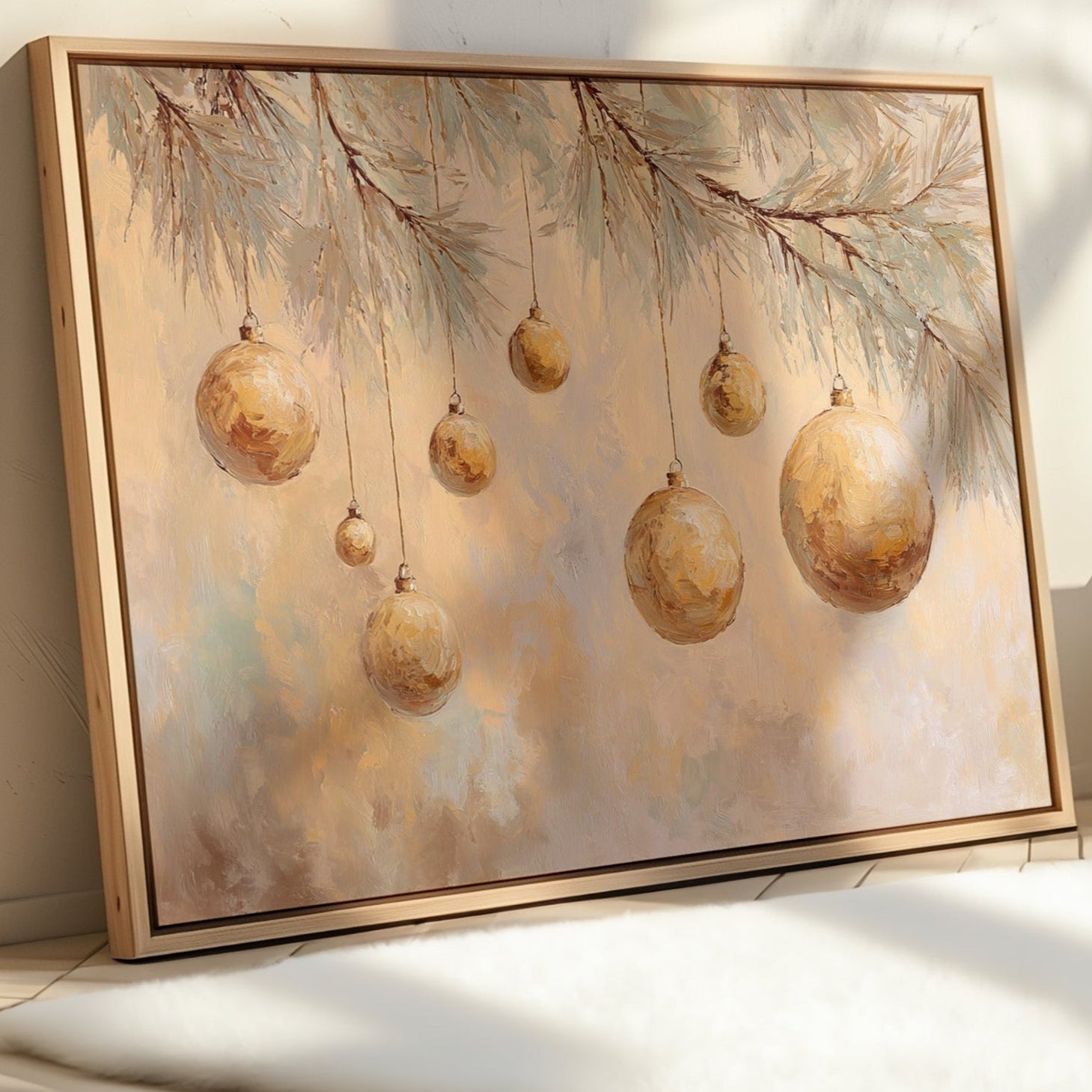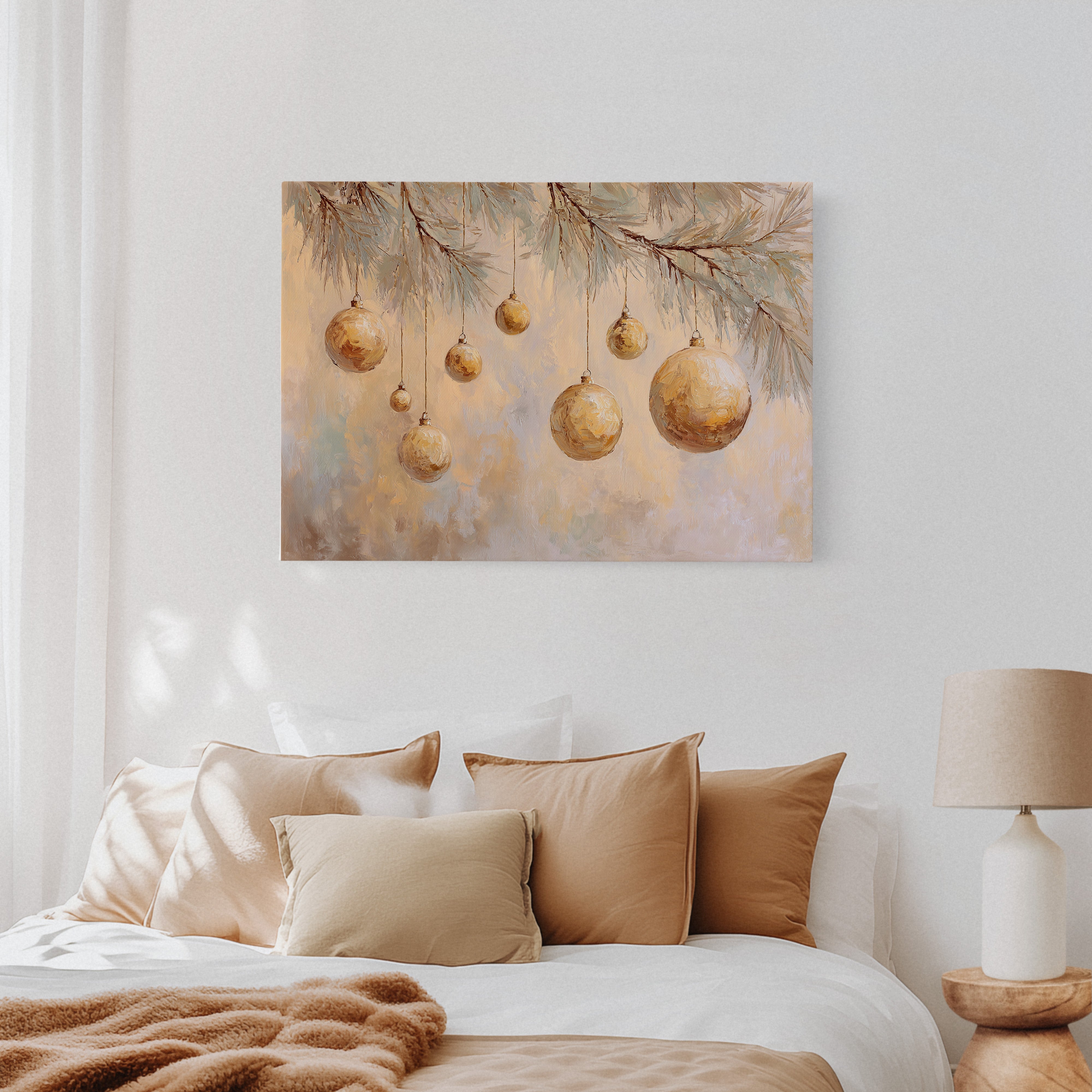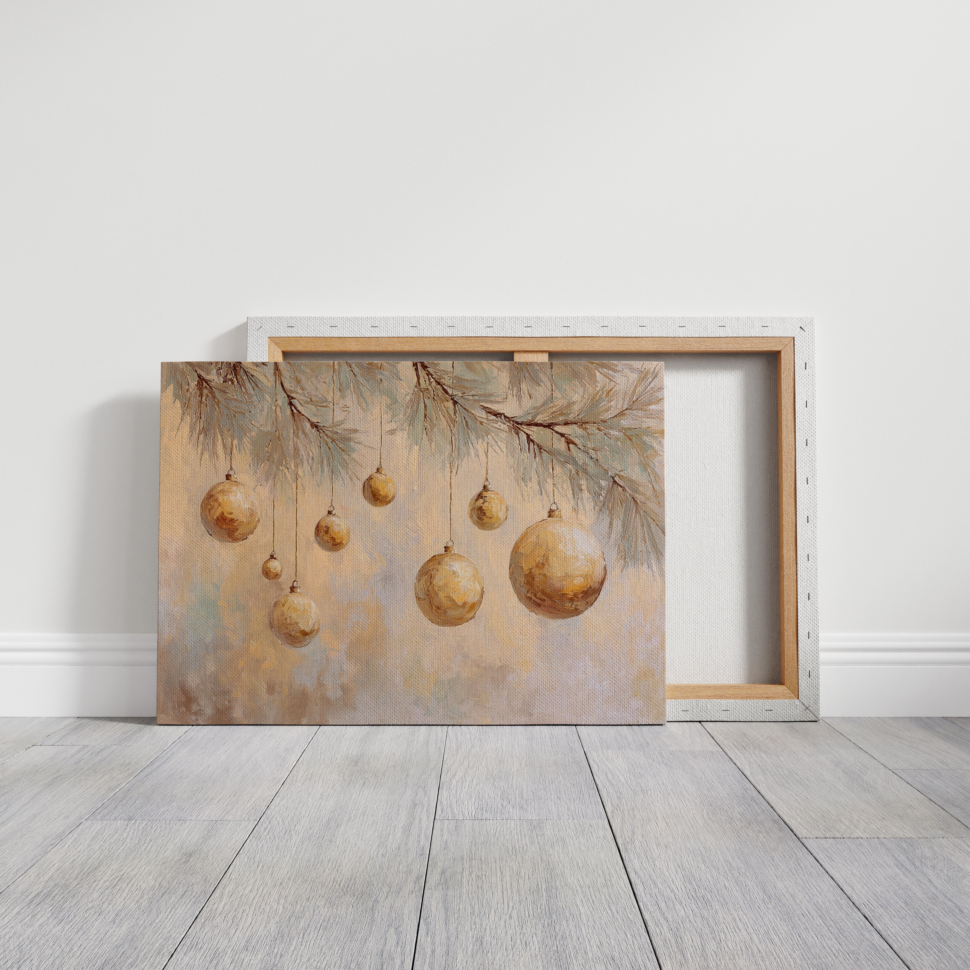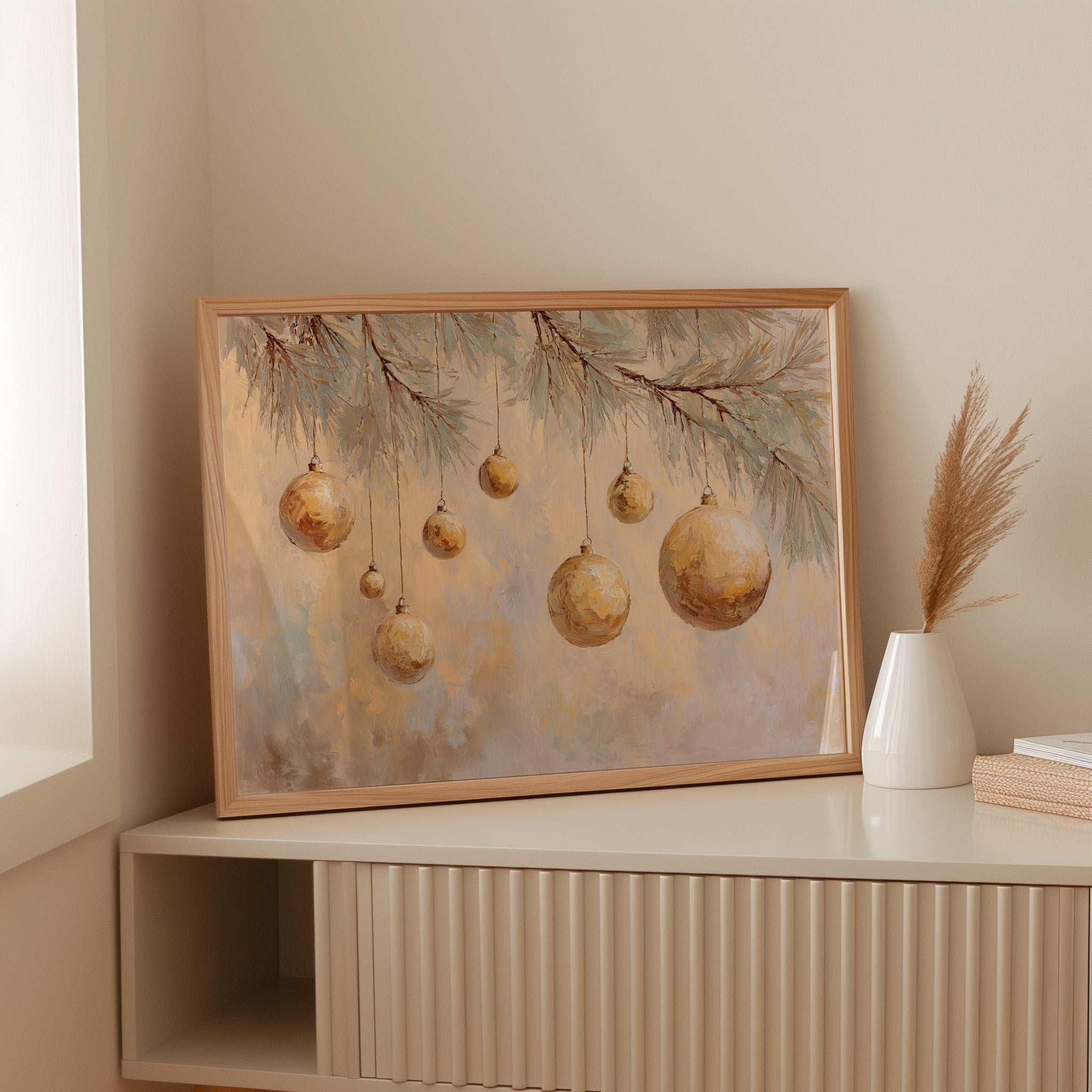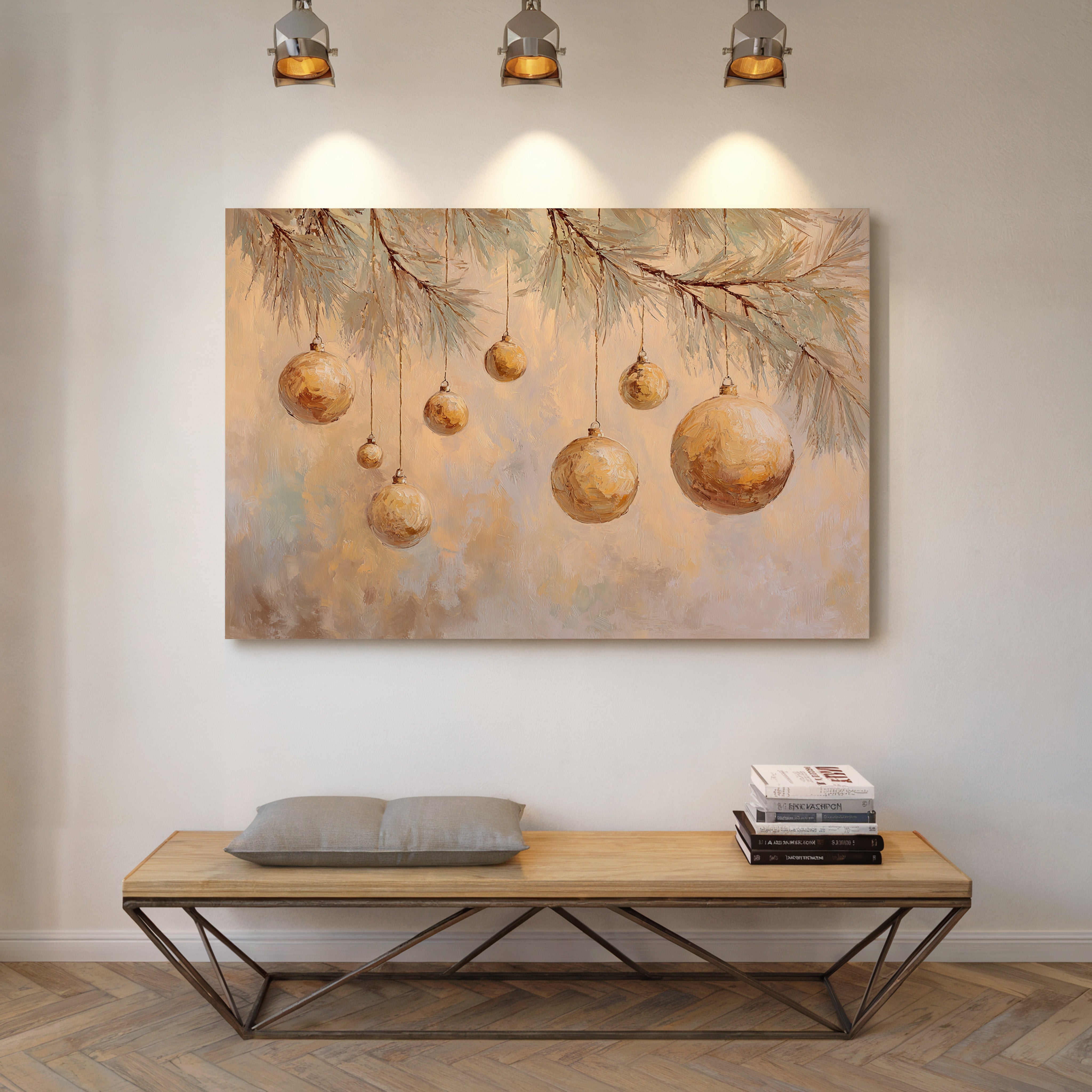 Golden ornaments sway gently, cradled by evergreen branches, inviting warmth into the chill of the season. This piece captures the essence of artisanal craftsmanship, celebrating the beauty of handcrafted holiday traditions. Each orb reflects soft light, evoking memories of laughter and togetherness, while textures of pine needles add a rustic touch. Perfect for a cozy living room or a festive dining space, this piece brings an air of nostalgia and joy to your home.