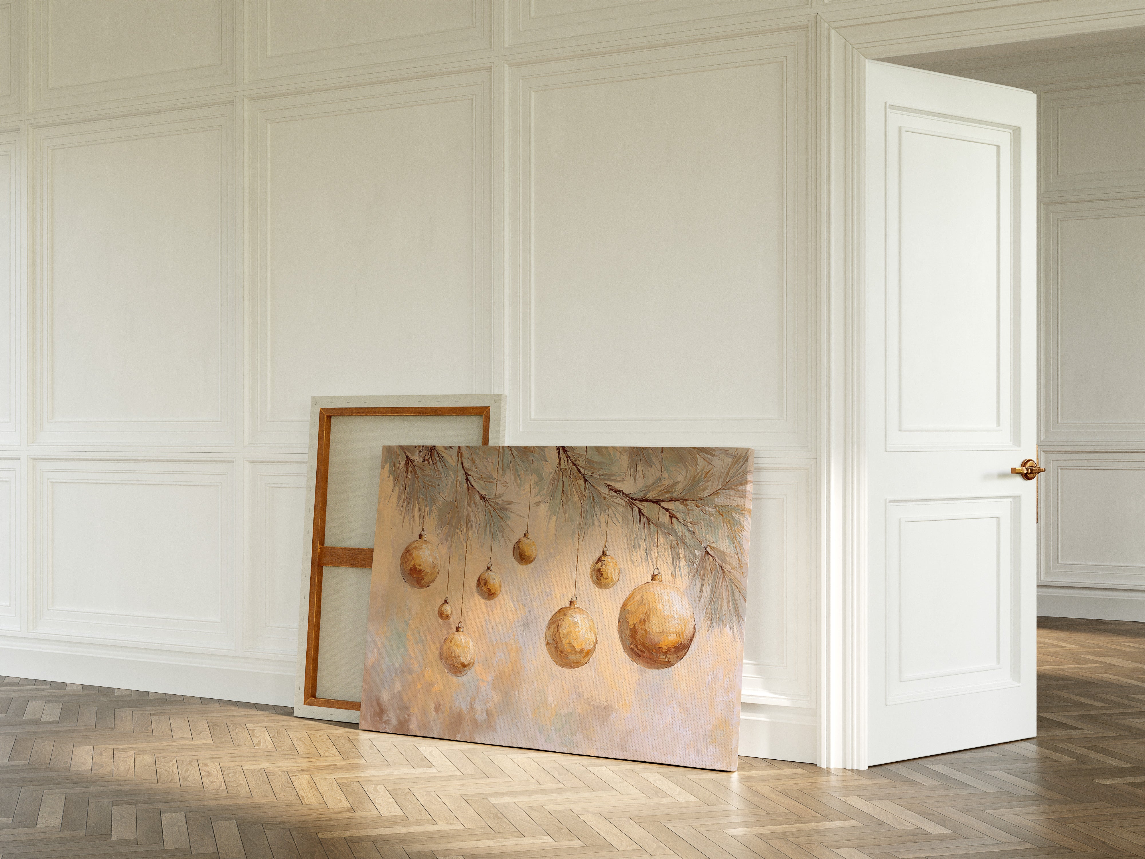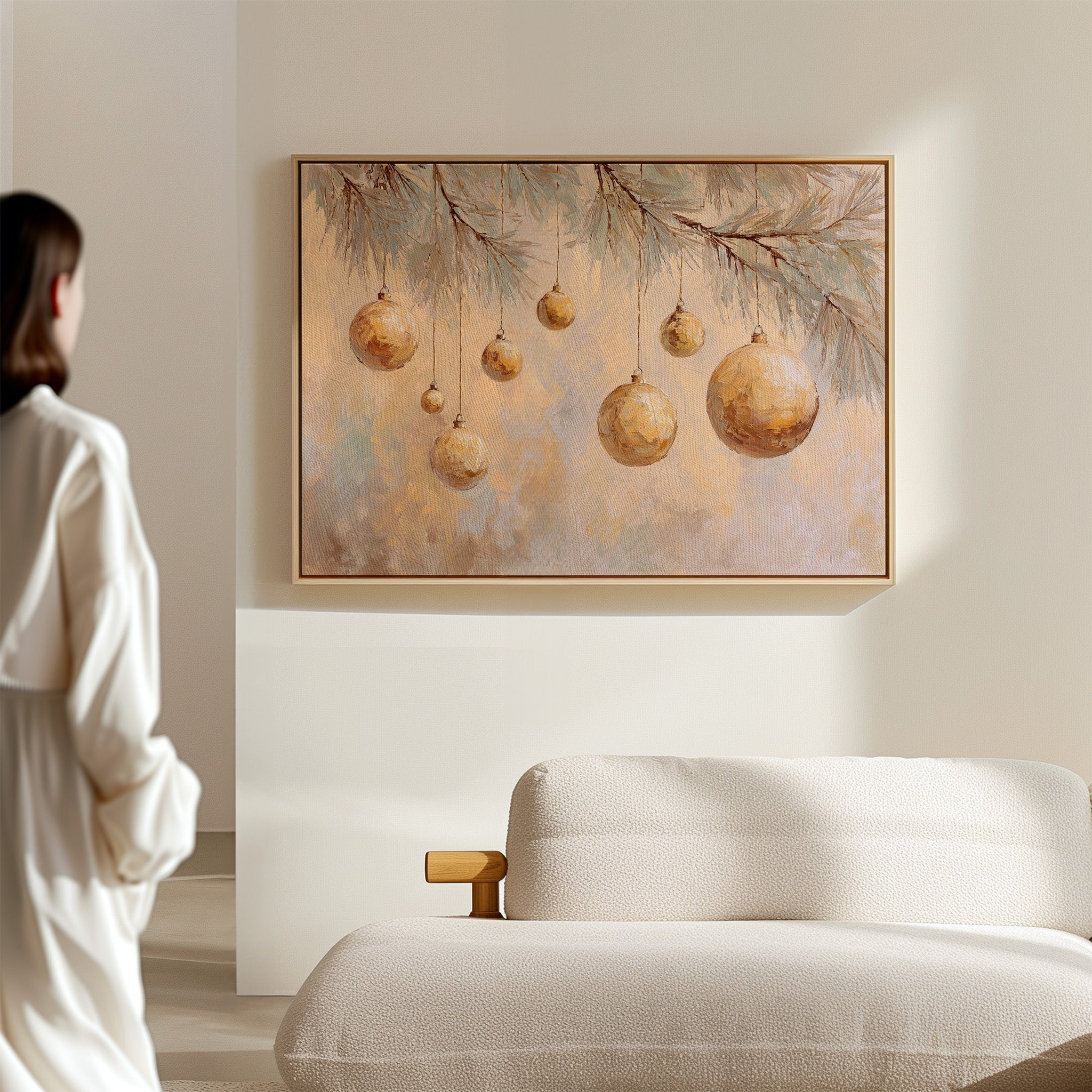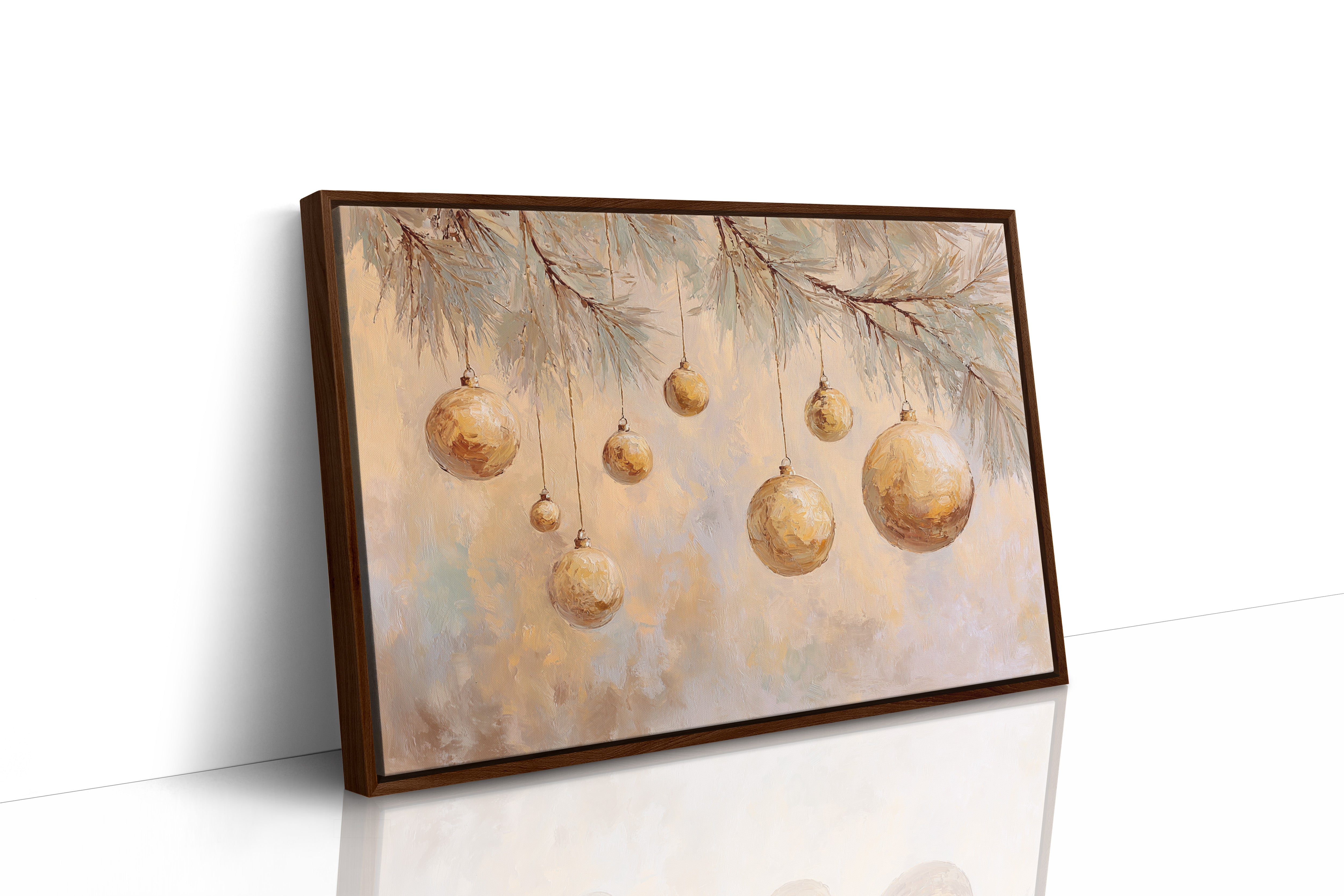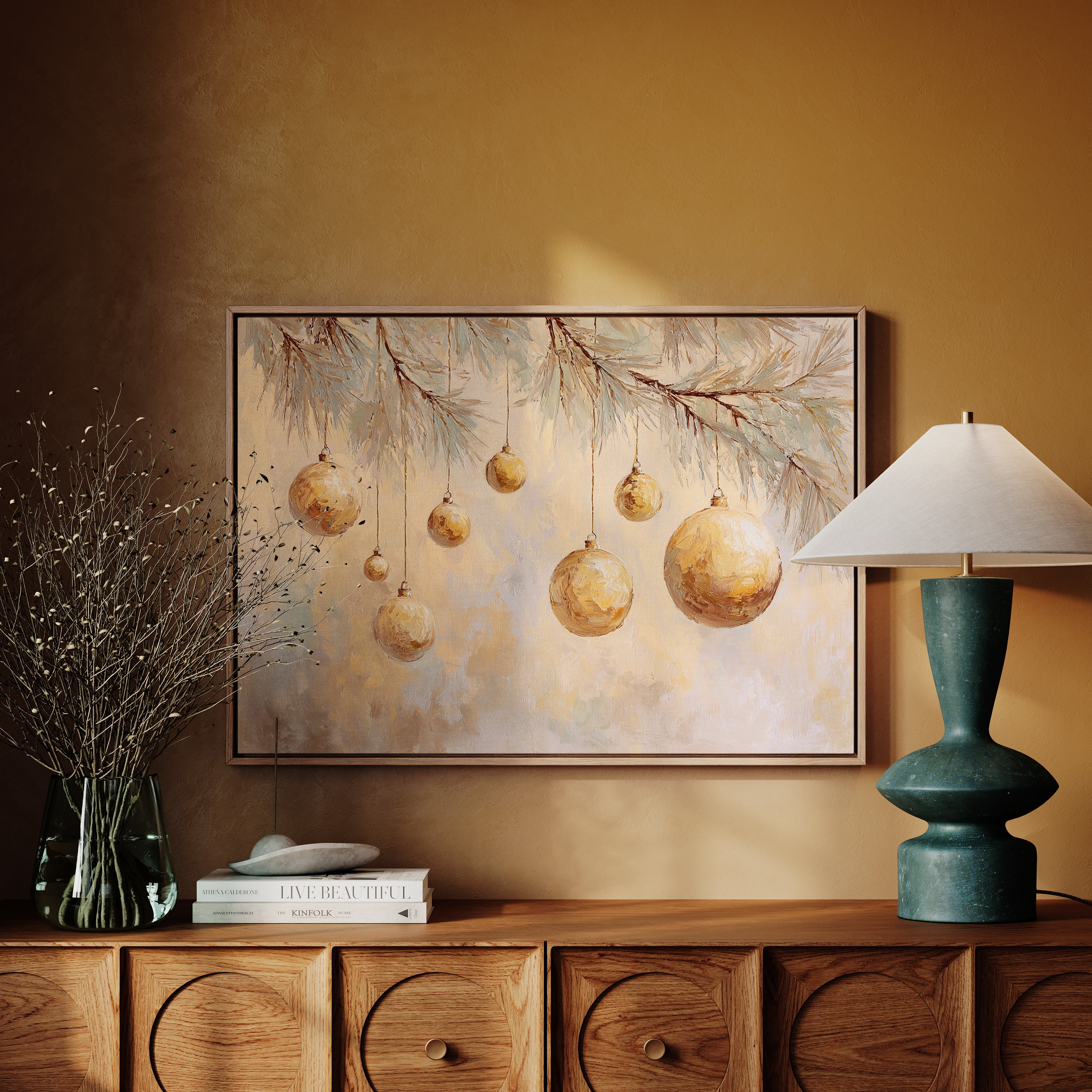 Golden ornaments sway gently, cradled by evergreen branches, inviting warmth into the chill of the season. This piece captures the essence of artisanal craftsmanship, celebrating the beauty of handcrafted holiday traditions. Each orb reflects soft light, evoking memories of laughter and togetherness, while textures of pine needles add a rustic touch. Perfect for a cozy living room or a festive dining space, this piece brings an air of nostalgia and joy to your home.