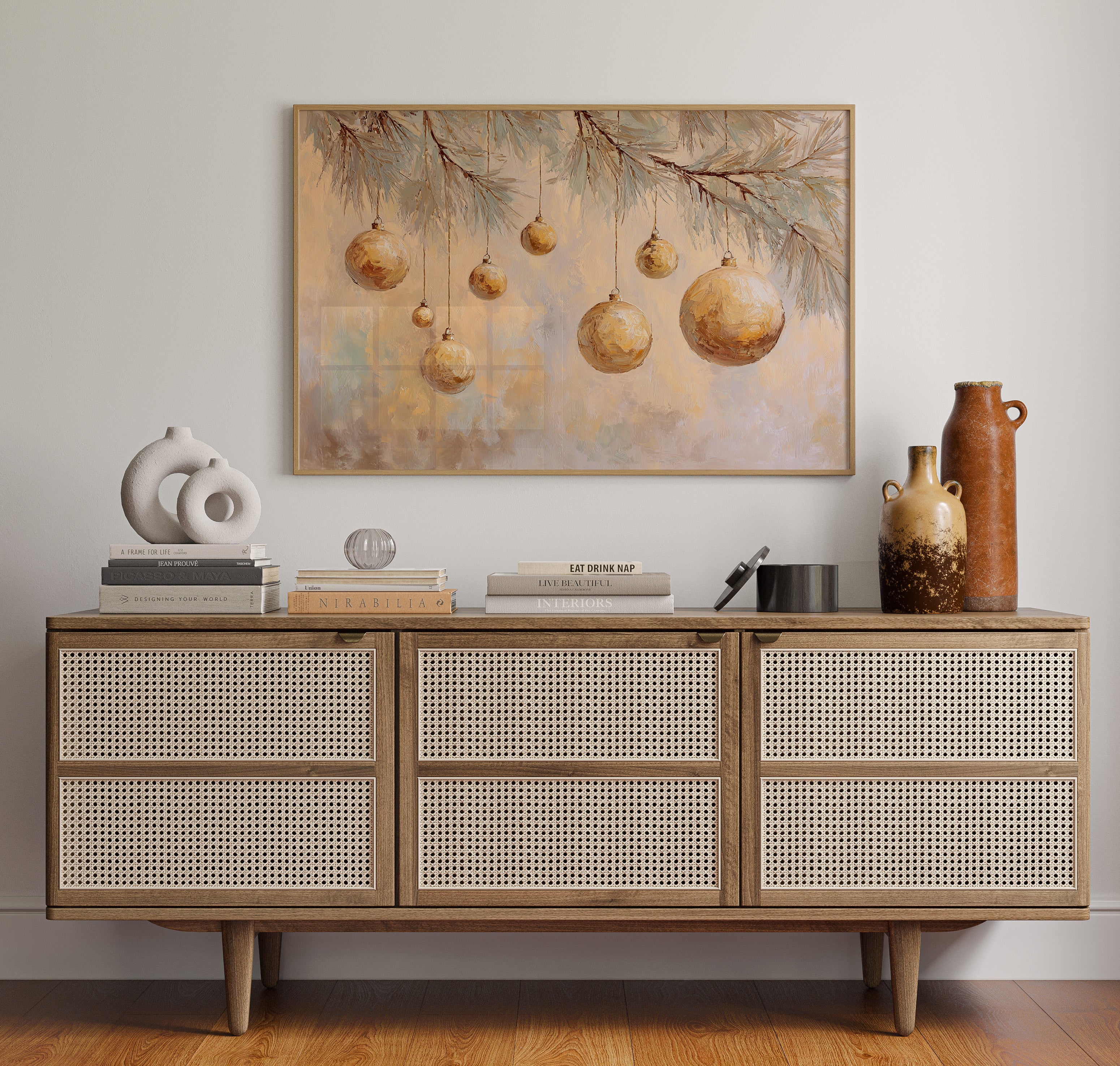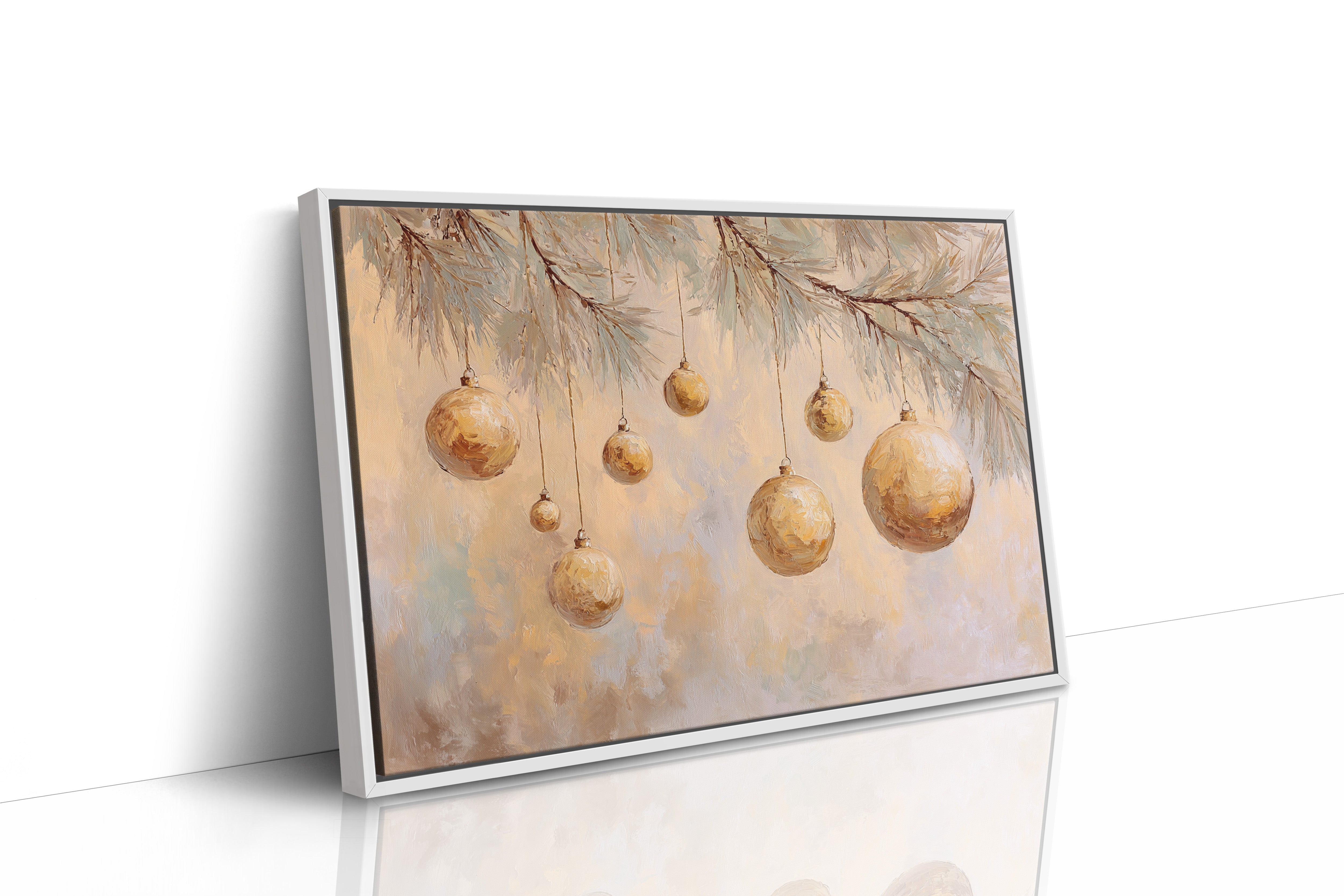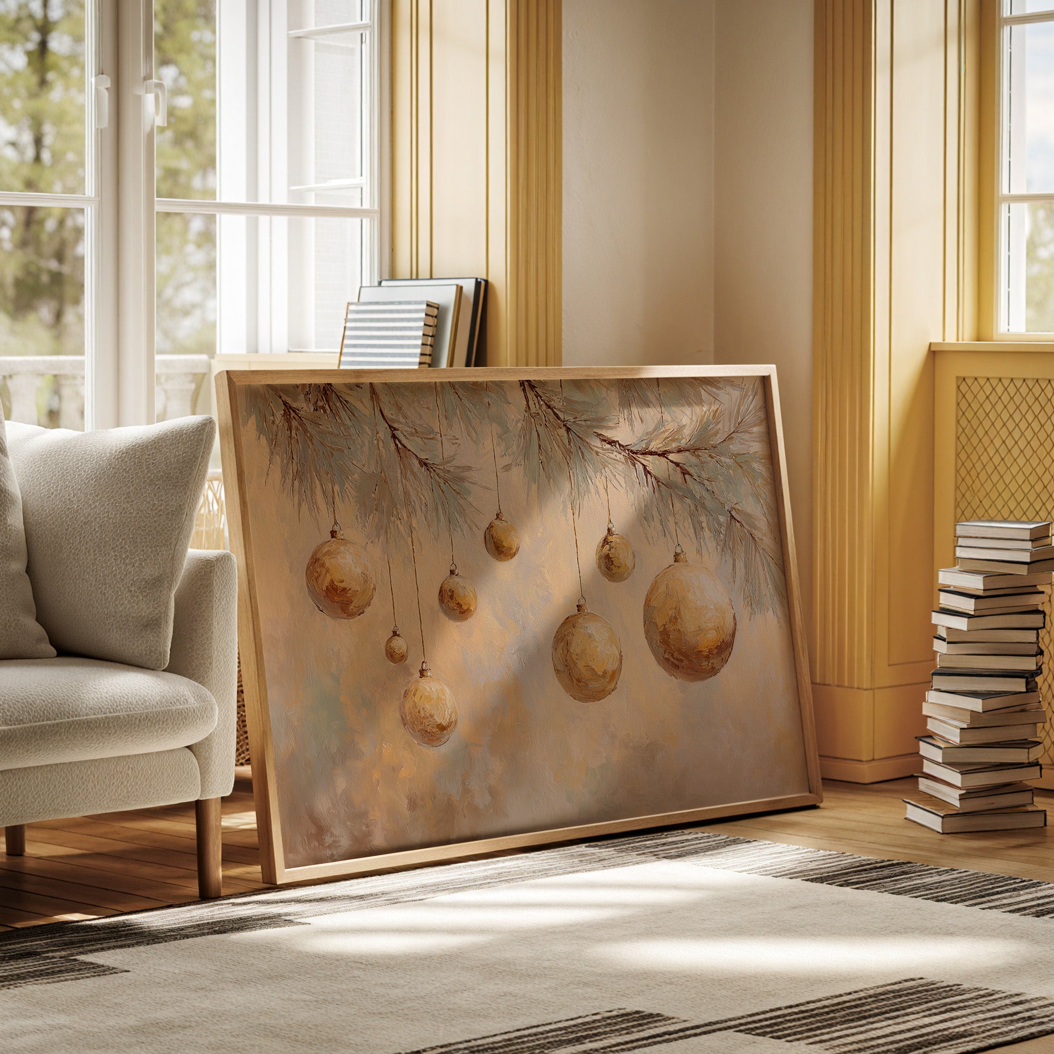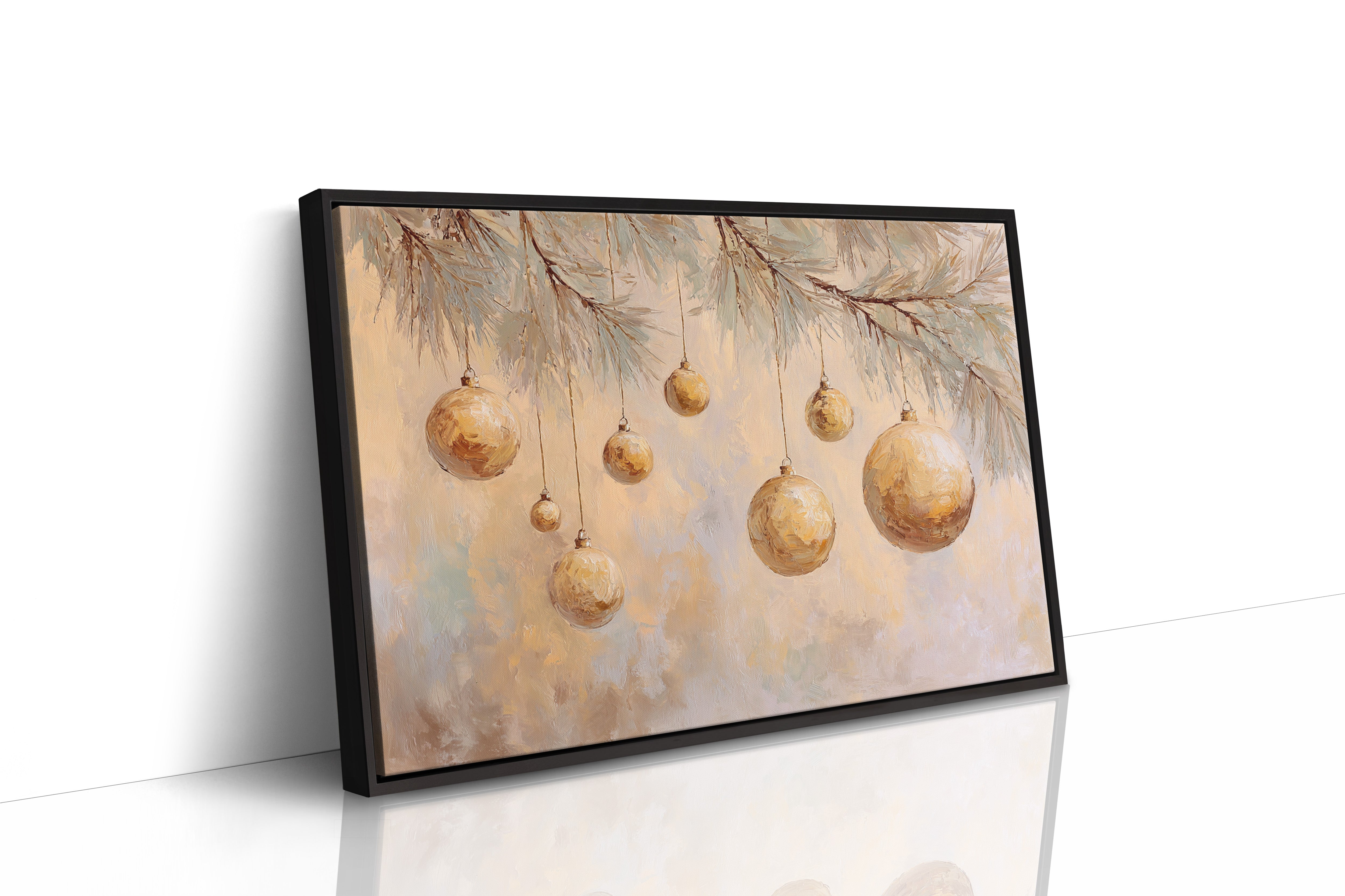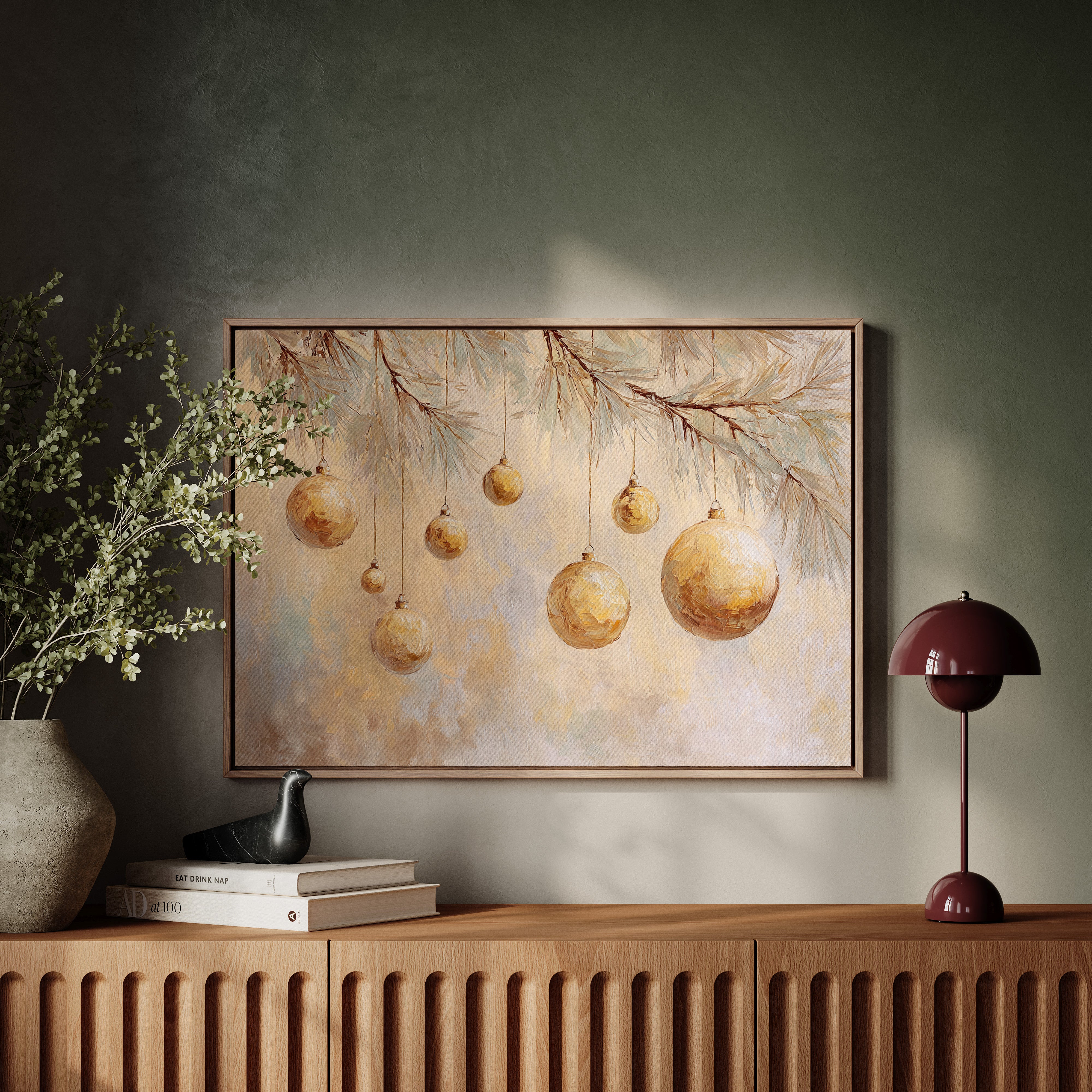 Golden ornaments sway gently, cradled by evergreen branches, inviting warmth into the chill of the season. This piece captures the essence of artisanal craftsmanship, celebrating the beauty of handcrafted holiday traditions. Each orb reflects soft light, evoking memories of laughter and togetherness, while textures of pine needles add a rustic touch. Perfect for a cozy living room or a festive dining space, this piece brings an air of nostalgia and joy to your home.