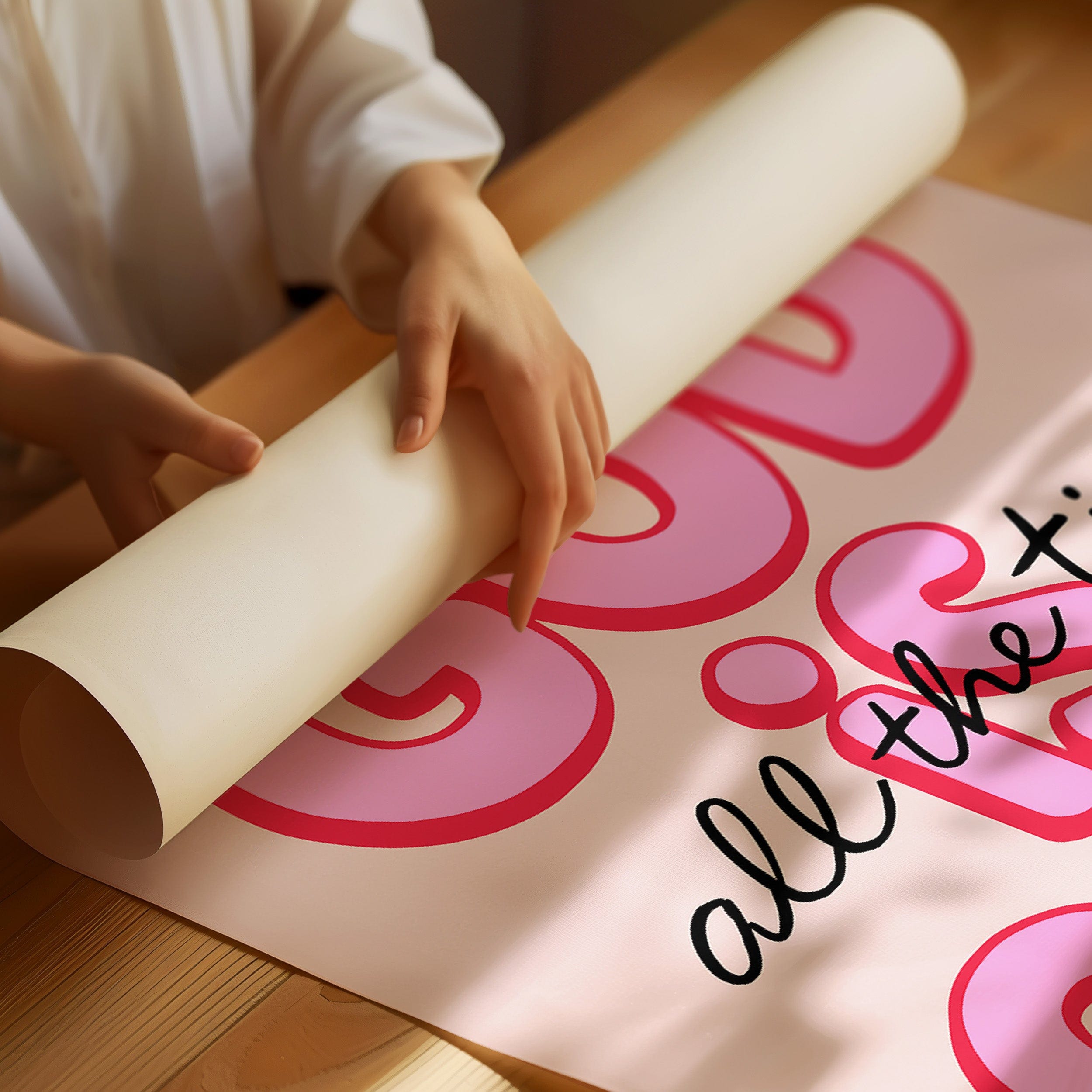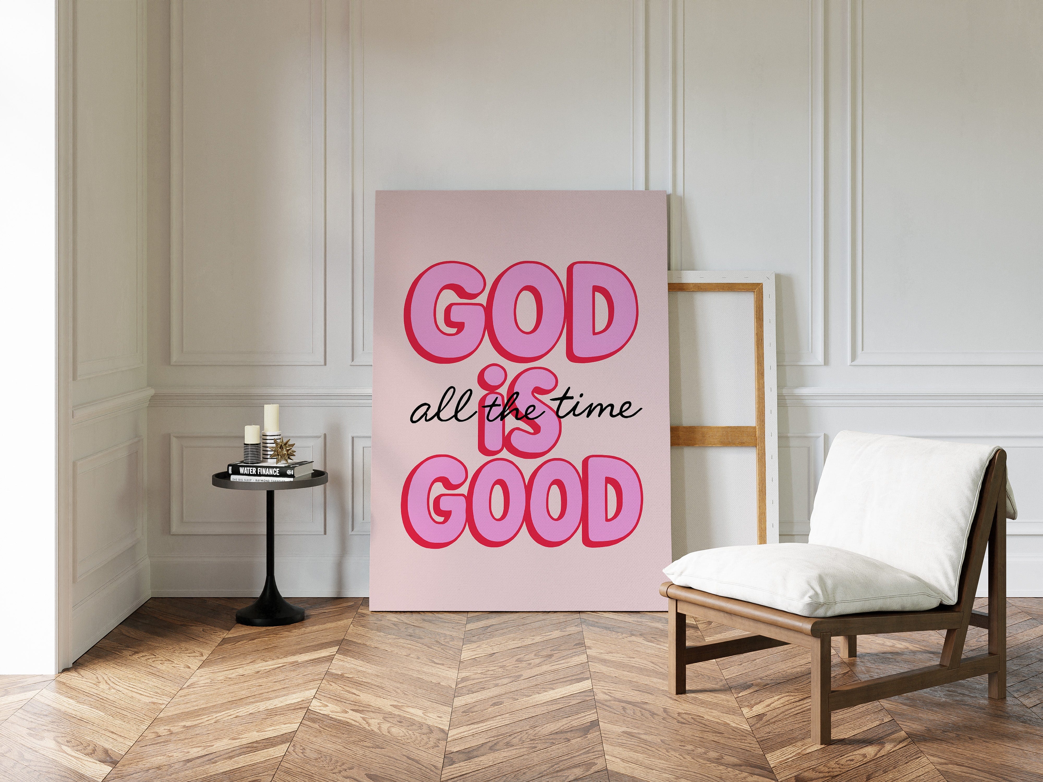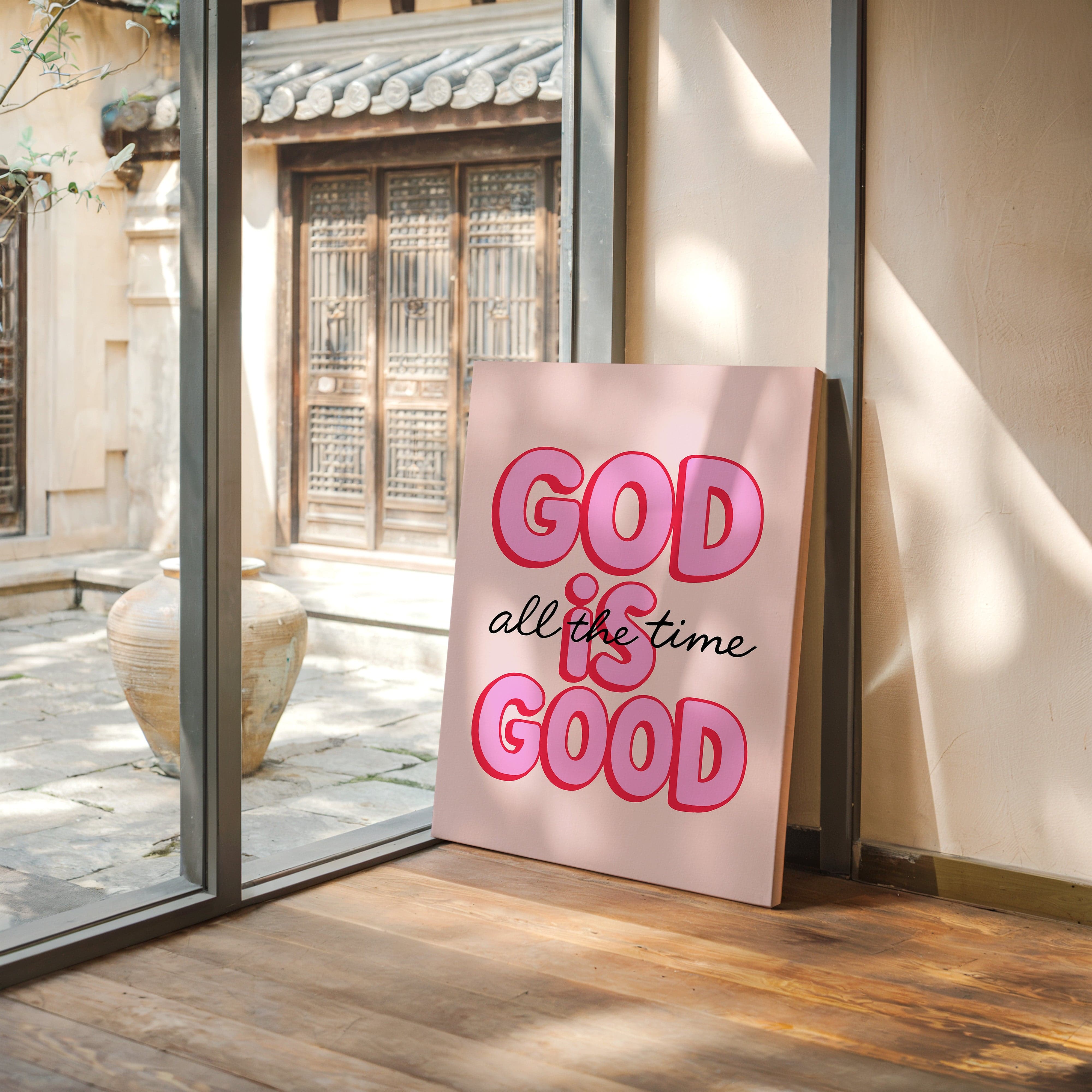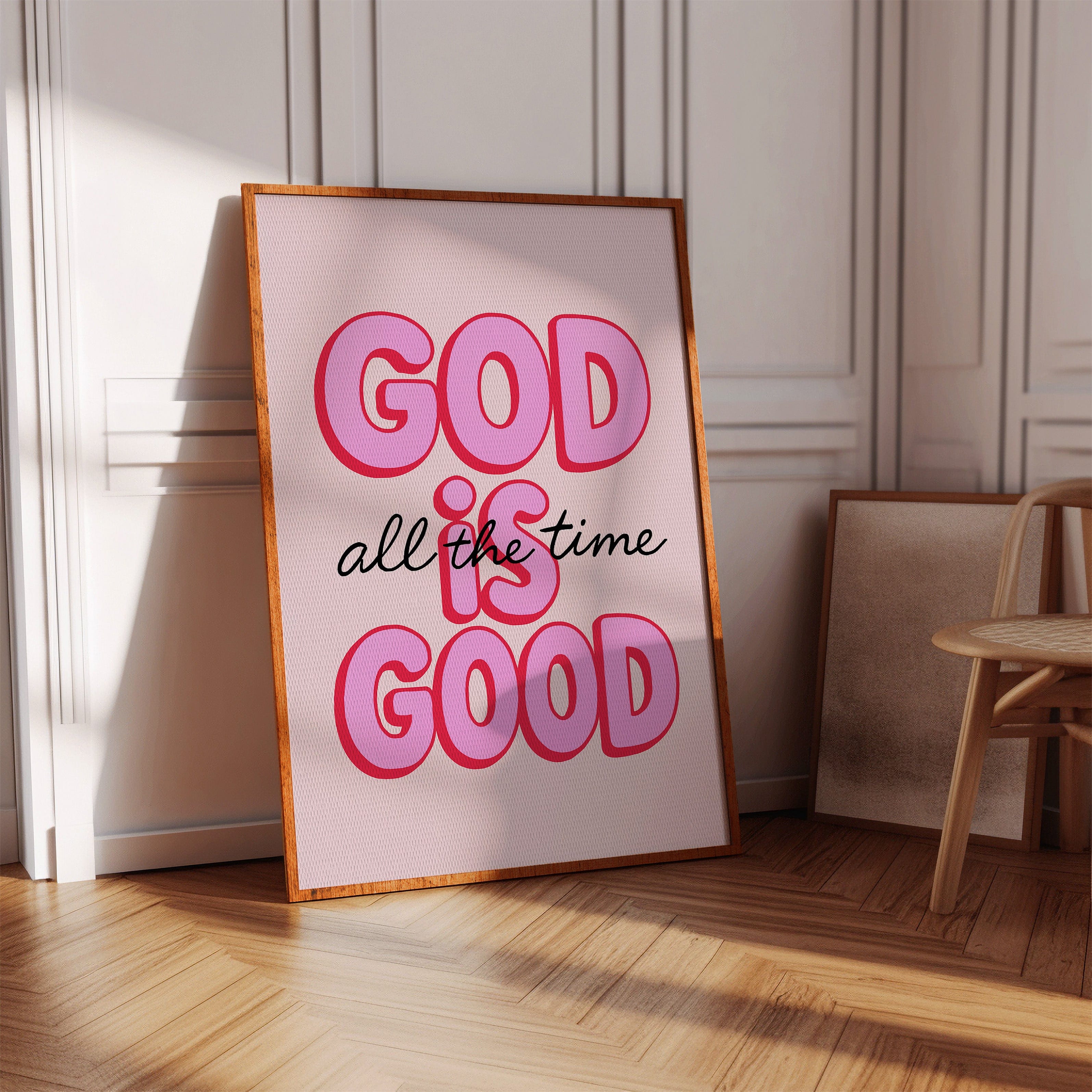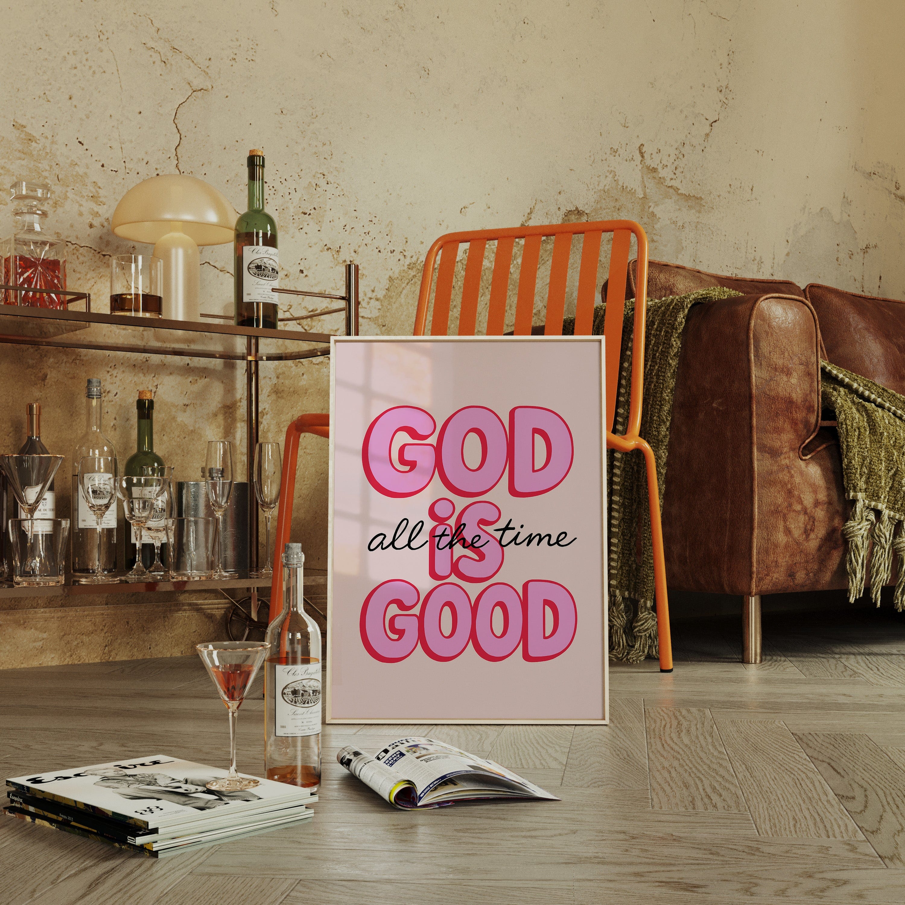 Bold retro lettering meets faith-filled vibes in this bright and uplifting "God is good all the time" print — perfect for daily encouragement.