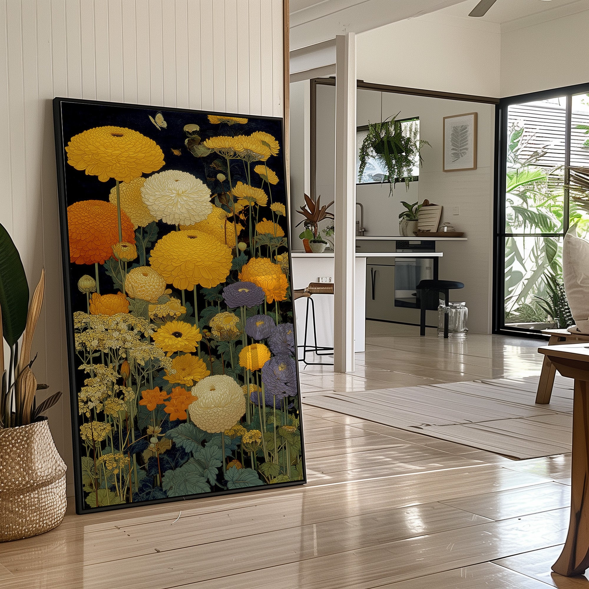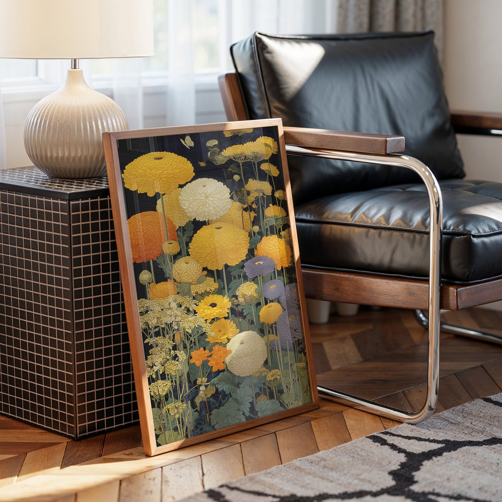 Delicate chrysanthemums and wildflowers stretch skyward against a mysterious dark background, their golden petals catching an ethereal light. The composition weaves together bold yellow blooms with subtle cream flowers and wispy Queen Anne's lace, creating a harmonious dance of texture and form. The modern botanical illustration balances Japanese artistic influence with contemporary styling, bringing nature's poetry indoors. This statement piece would transform a reading nook or home office into a contemplative sanctuary, where vintage-inspired florals meet modern sensibilities.