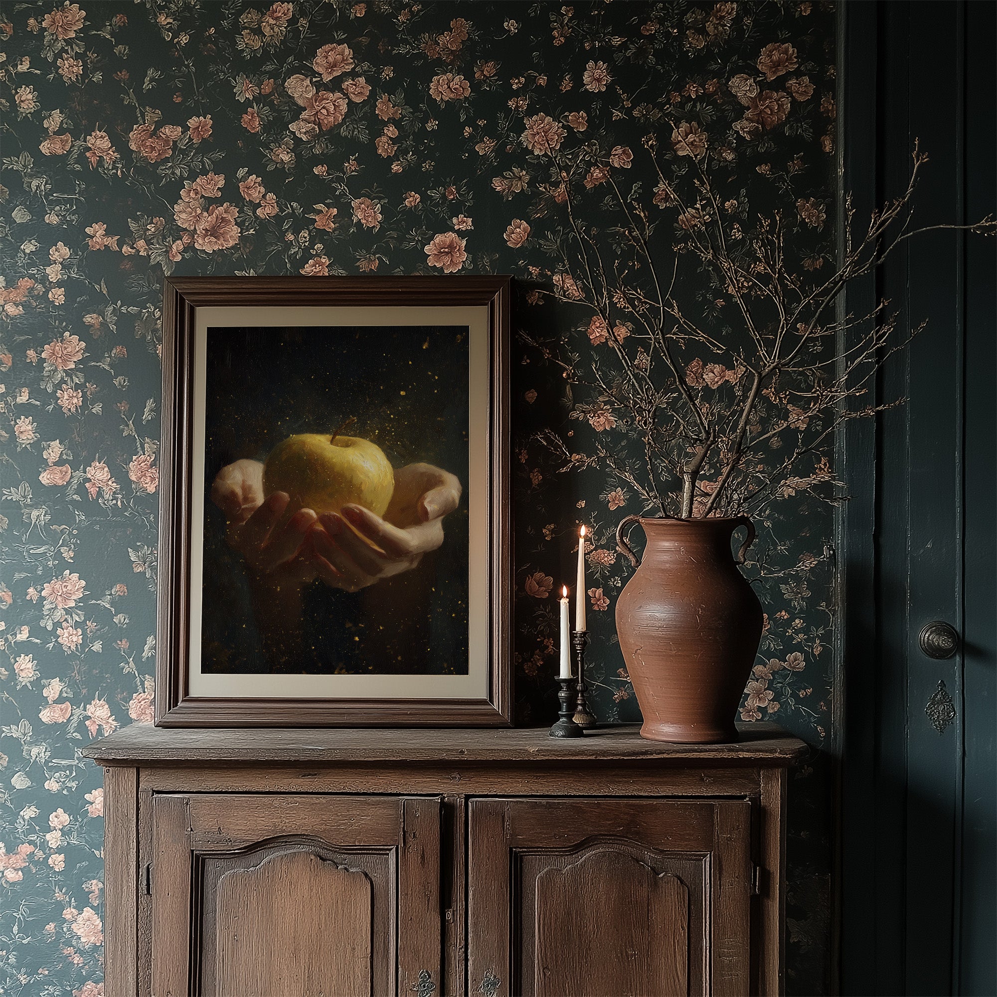 A luminous yellow apple rests in outstretched palms, glowing against a deep, mysterious backdrop. Tiny golden particles float around the fruit like suspended stardust, creating a mystical atmosphere where something ordinary becomes sacred. The delicate tension between the firm fruit and soft human touch speaks to our relationship with nature's gifts, capturing a moment of reverence and offering. This contemplative piece brings a touch of classical elegance to dining areas or studies where its rich symbolism can be appreciated in quiet moments.