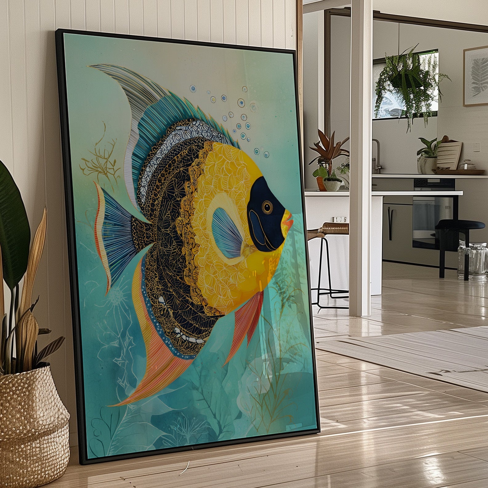A striking angelfish with a brilliant yellow body, dramatic black face, and elegant blue dorsal fin. Intricate patterns and textures adorn its scales, creating a mosaic-like effect against the tranquil turquoise background.
