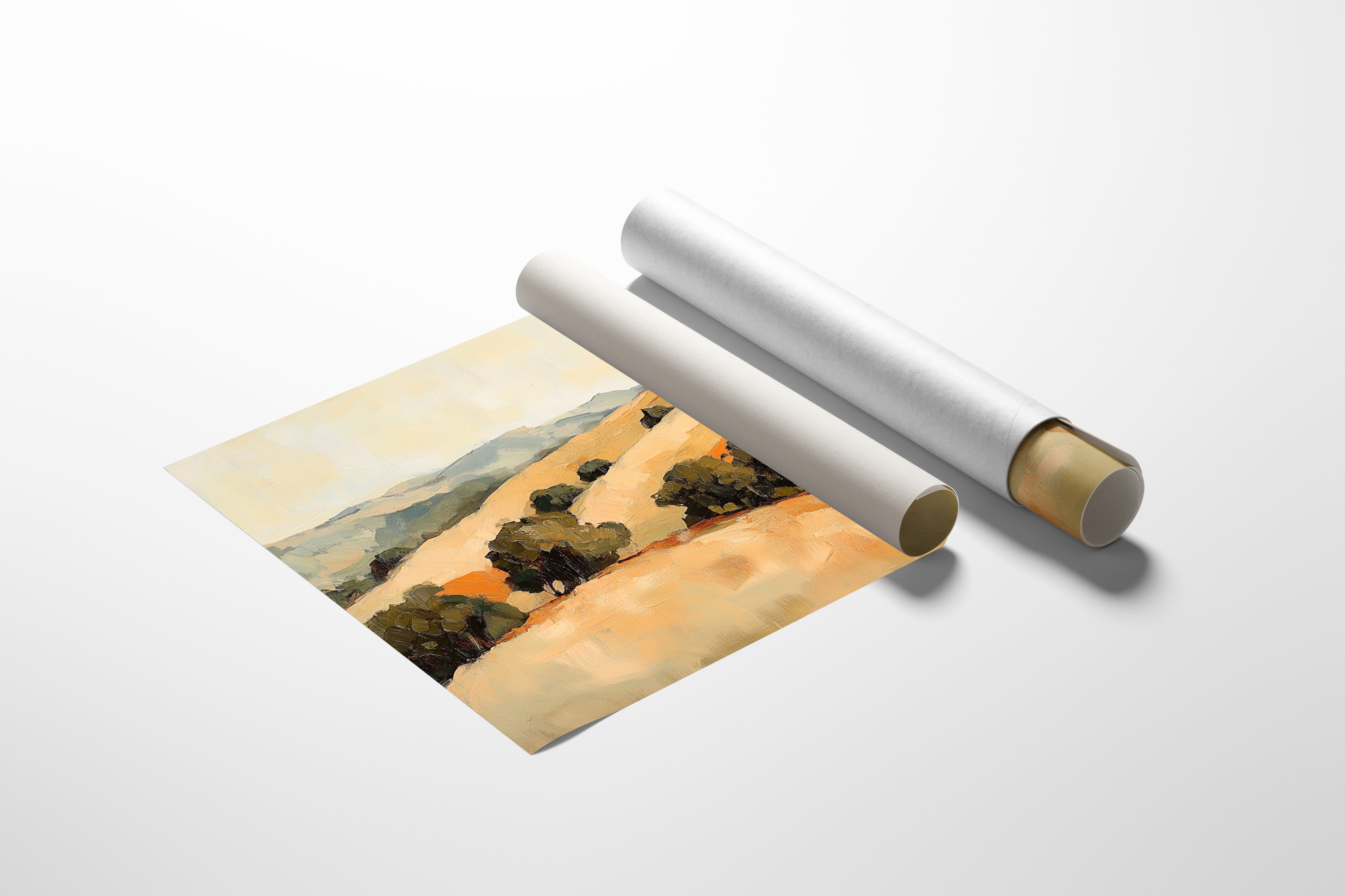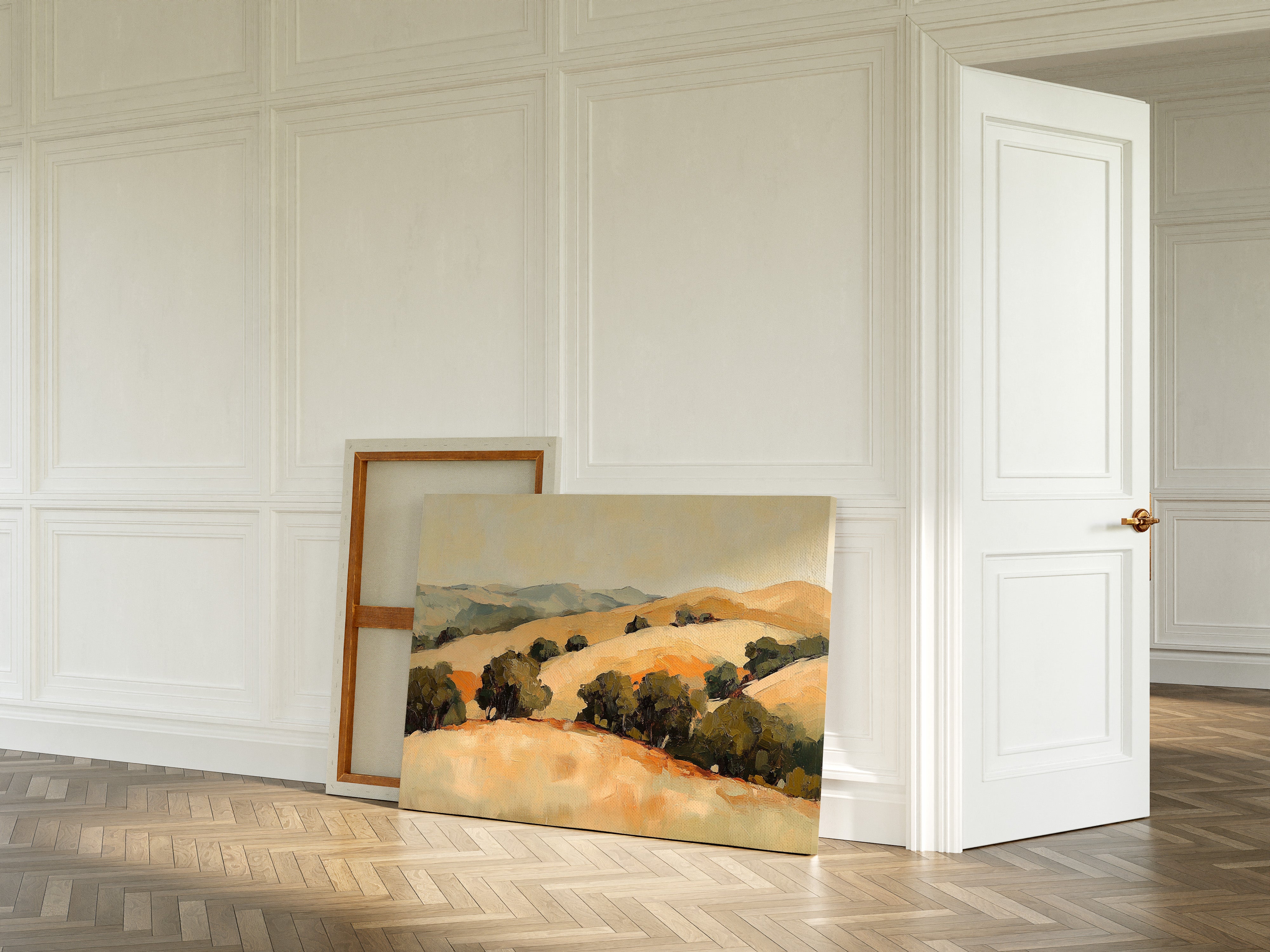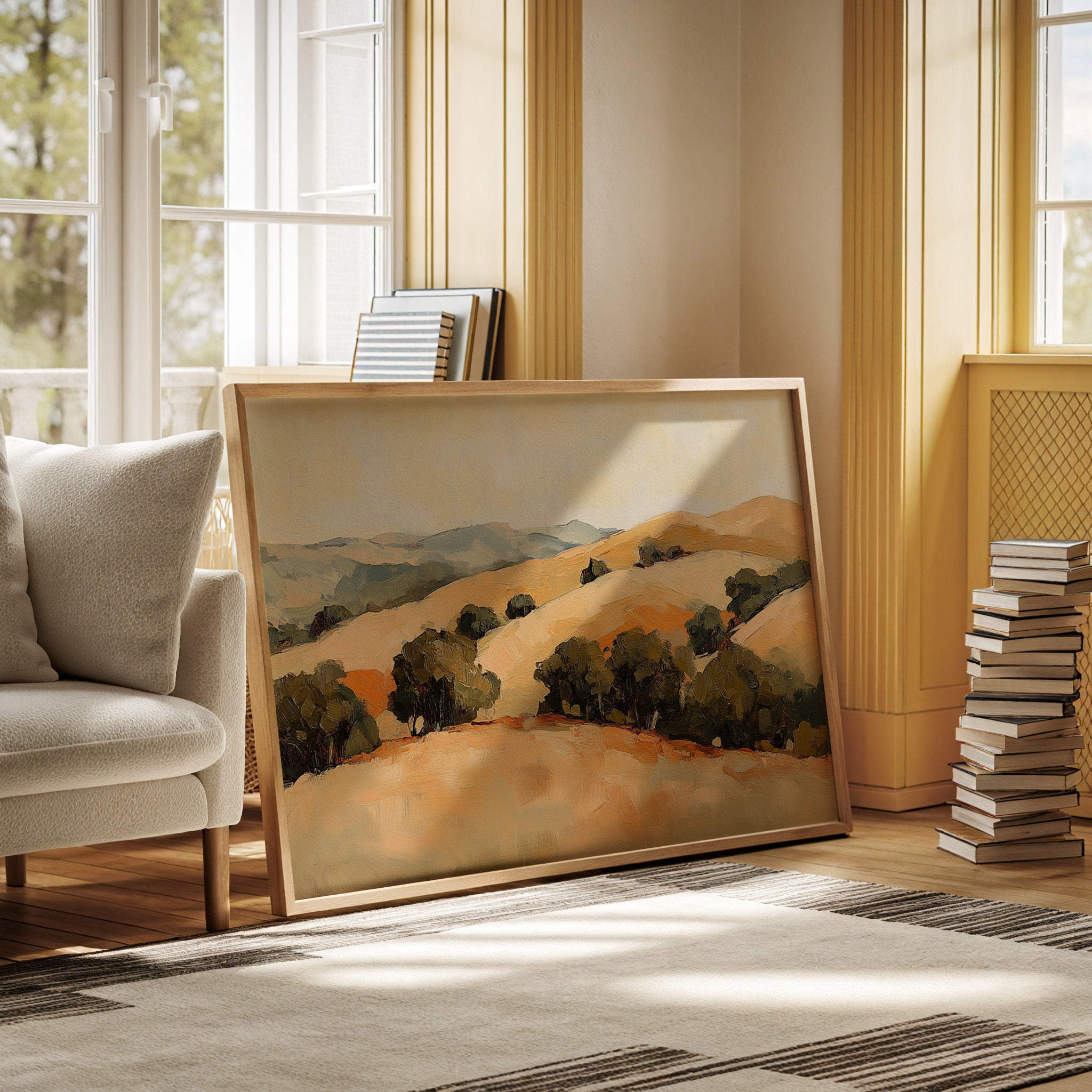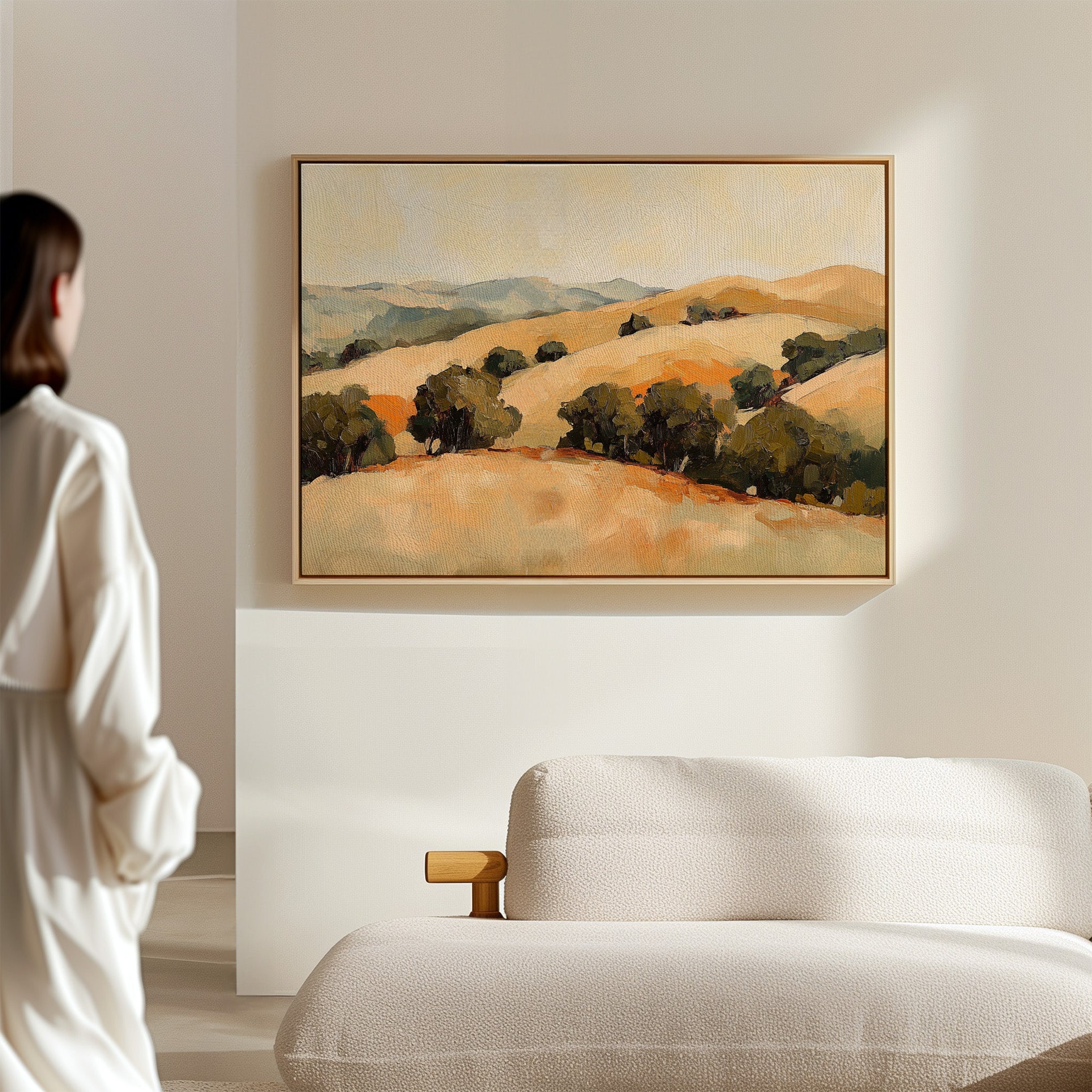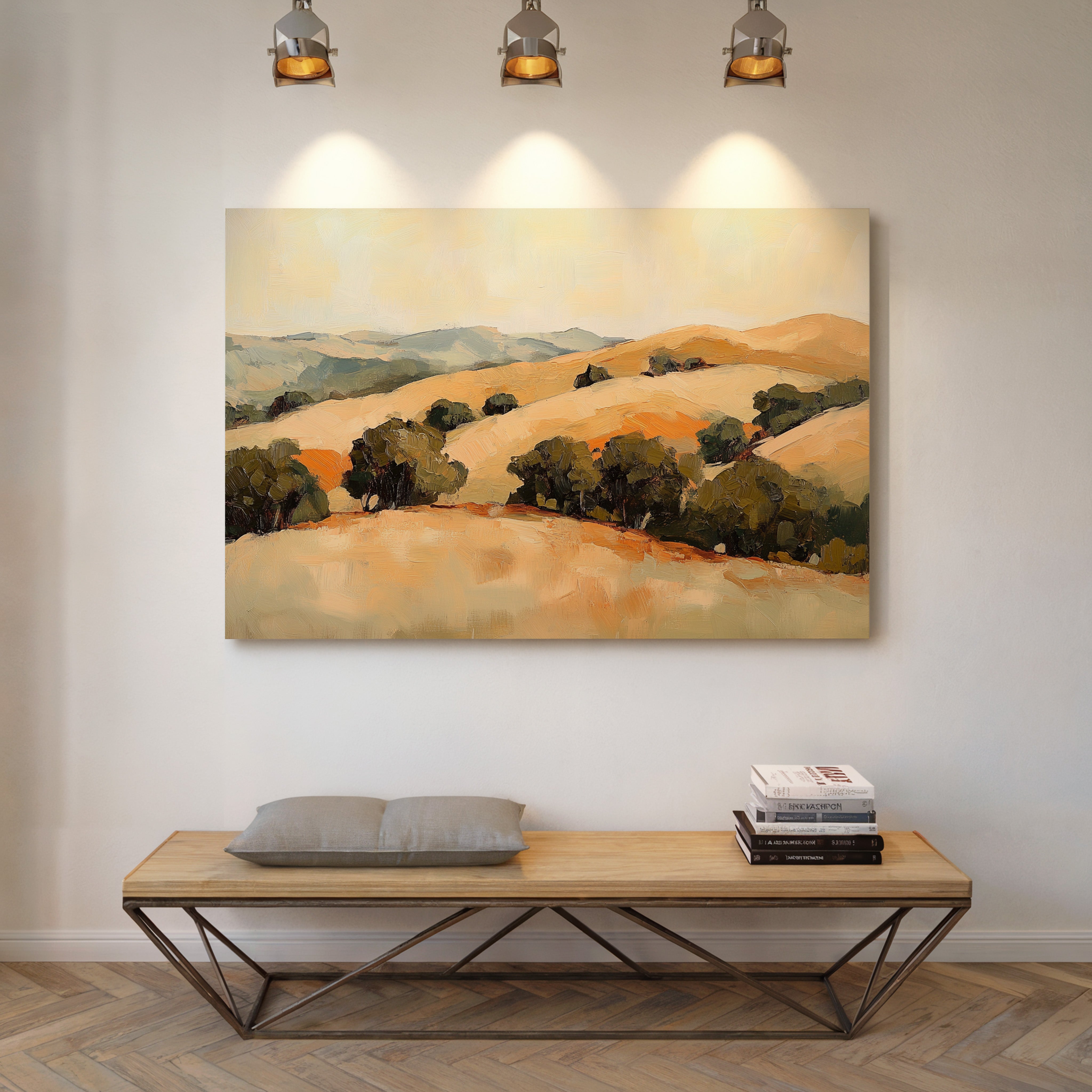 Rolling hills stretch lazily beneath a warm sky, their golden shoulders curved like sleeping giants. Olive-green oaks dot the landscape in perfect rhythm, casting deep shadows that anchor the ethereal scene. The brushstrokes capture the essence of late summer in California, where the hills have turned to honey and wheat tones, while distant ridges fade into cool blue-grays. This landscape speaks of quiet afternoons when the air stands still and time moves slowly. Perfect for creating a serene focal point in a living room or bringing natural warmth to a dining space where stories are shared over lingering meals.