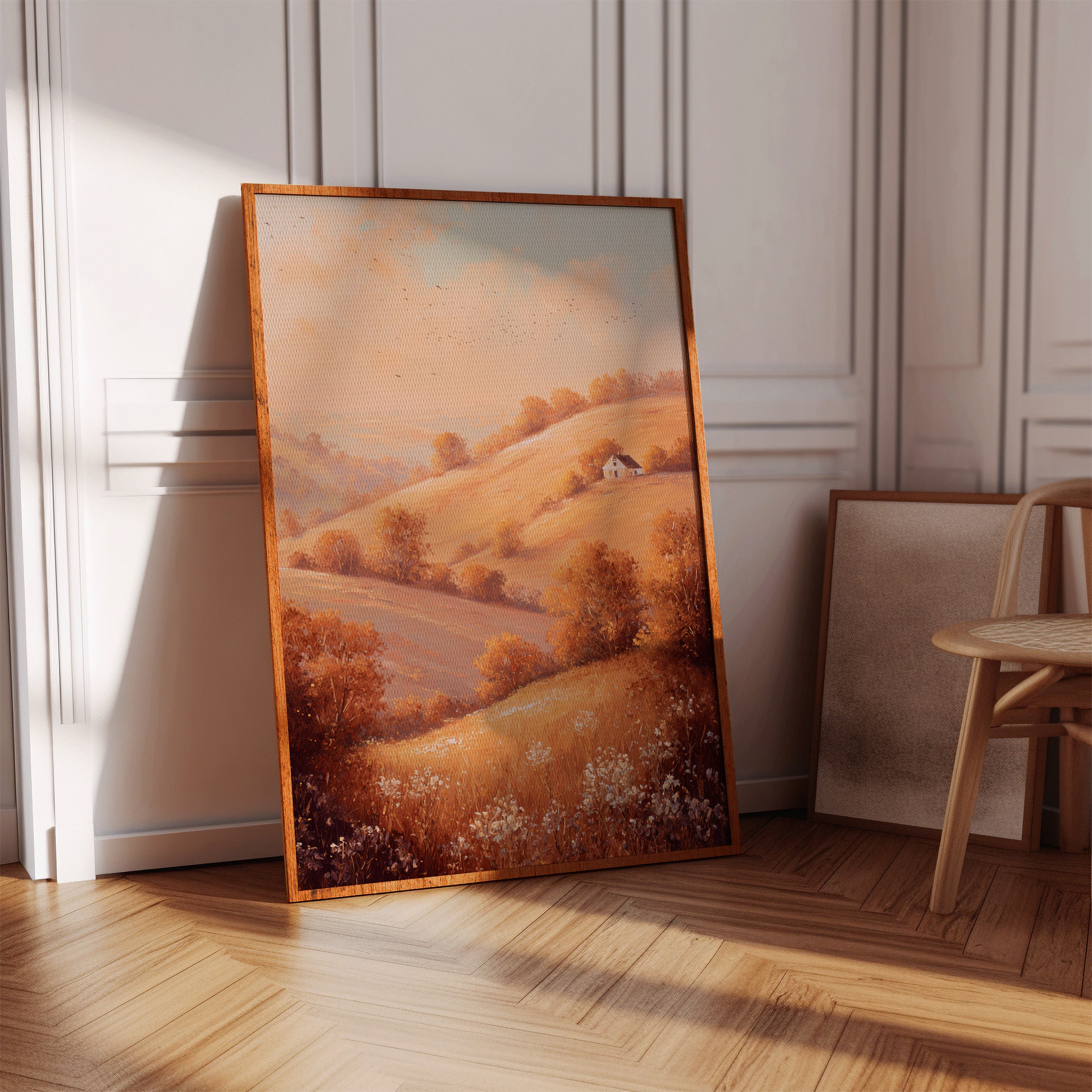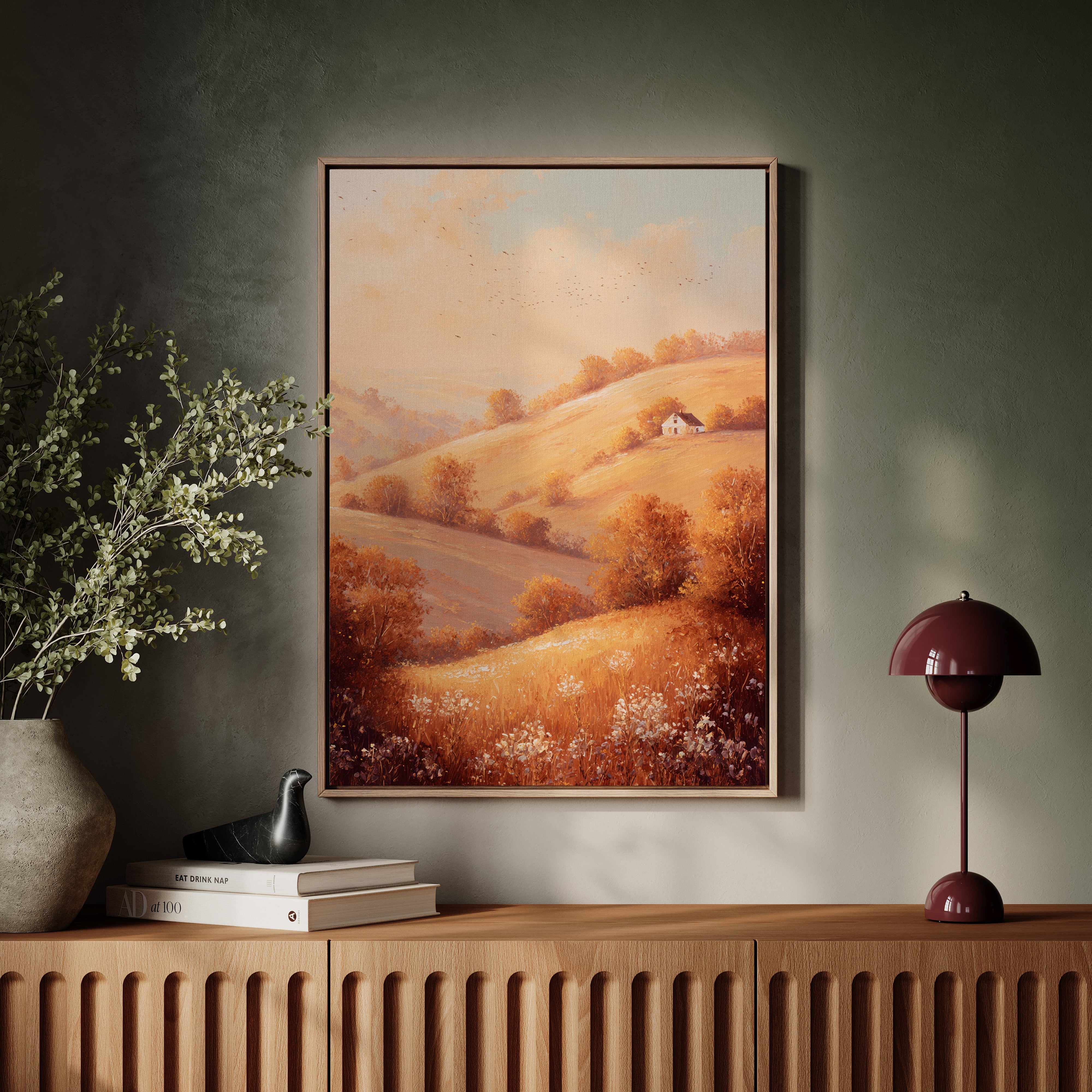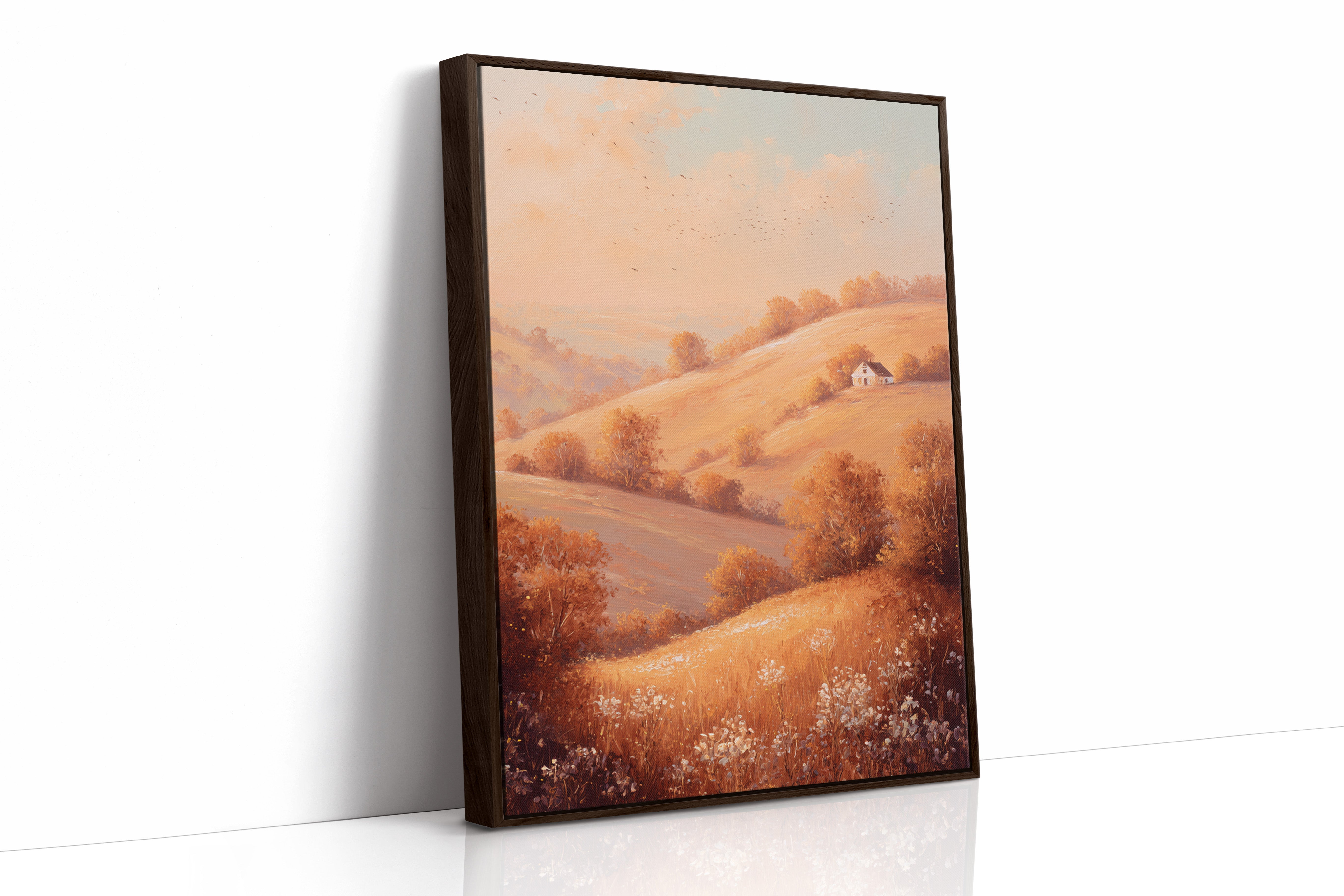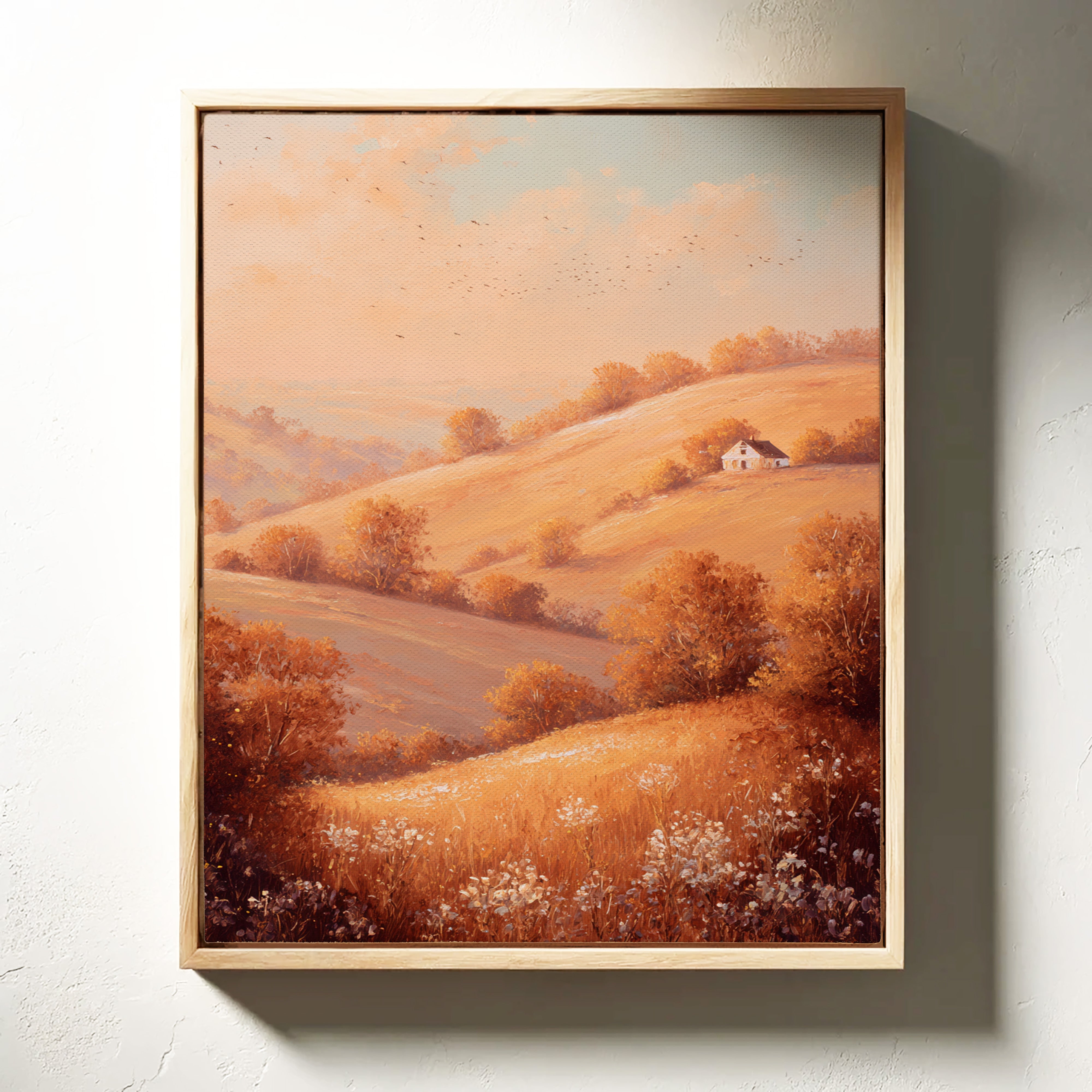 Bathed in honeyed light, rolling hills stretch toward a blushing horizon where birds trace paths across the coral sky. A solitary white cottage nestles into the curves of the landscape, surrounded by autumn-touched trees and wild grasses swaying in the afternoon breeze. The scene unfolds in layers of amber and rose, with delicate wildflowers dotting the foreground like scattered pearls across golden velvet. This tranquil countryside moment captures the essence of pastoral solitude and natural harmony. Perfect for creating a sense of peaceful escape in a living room or bringing warmth to a reading nook where one can dream of simpler times.