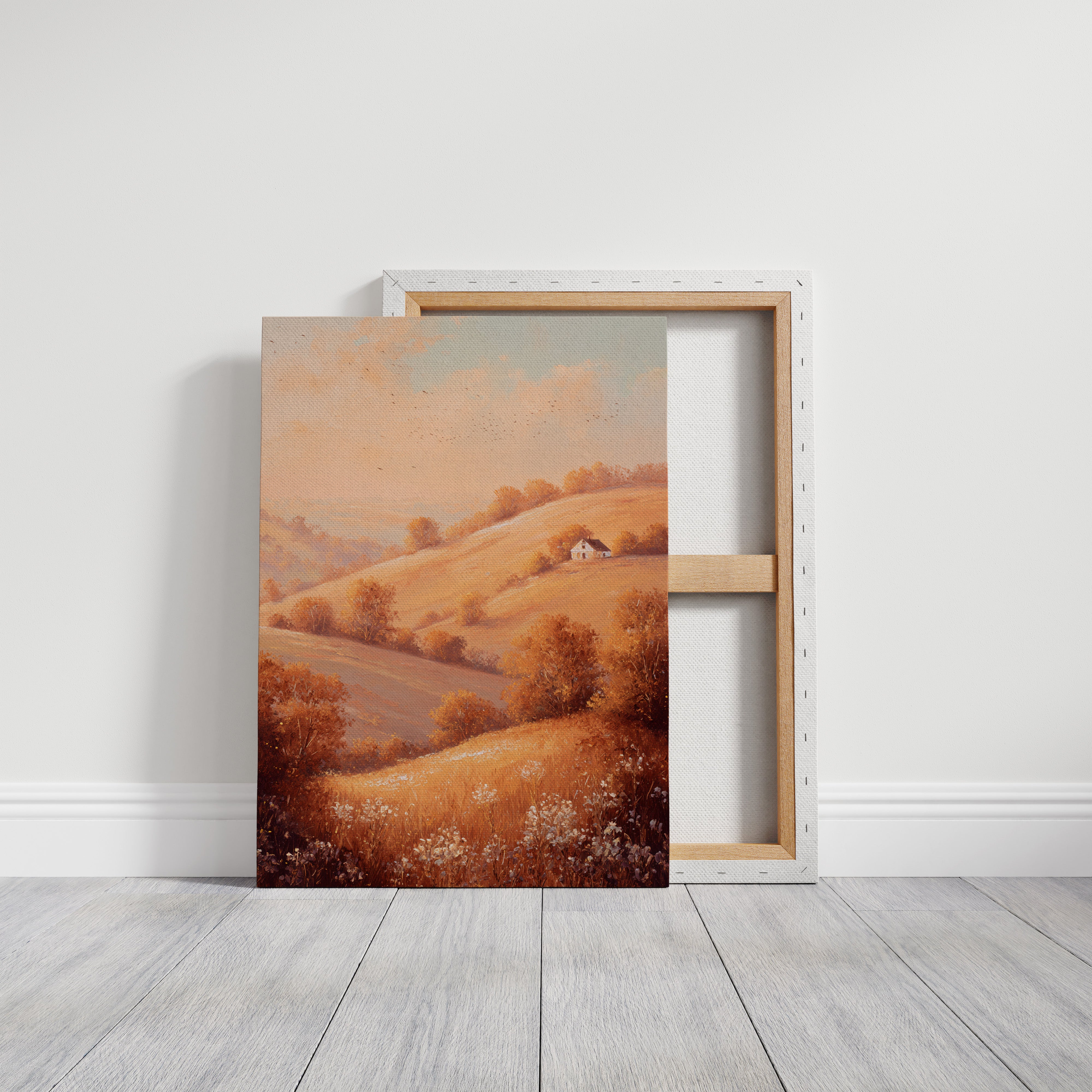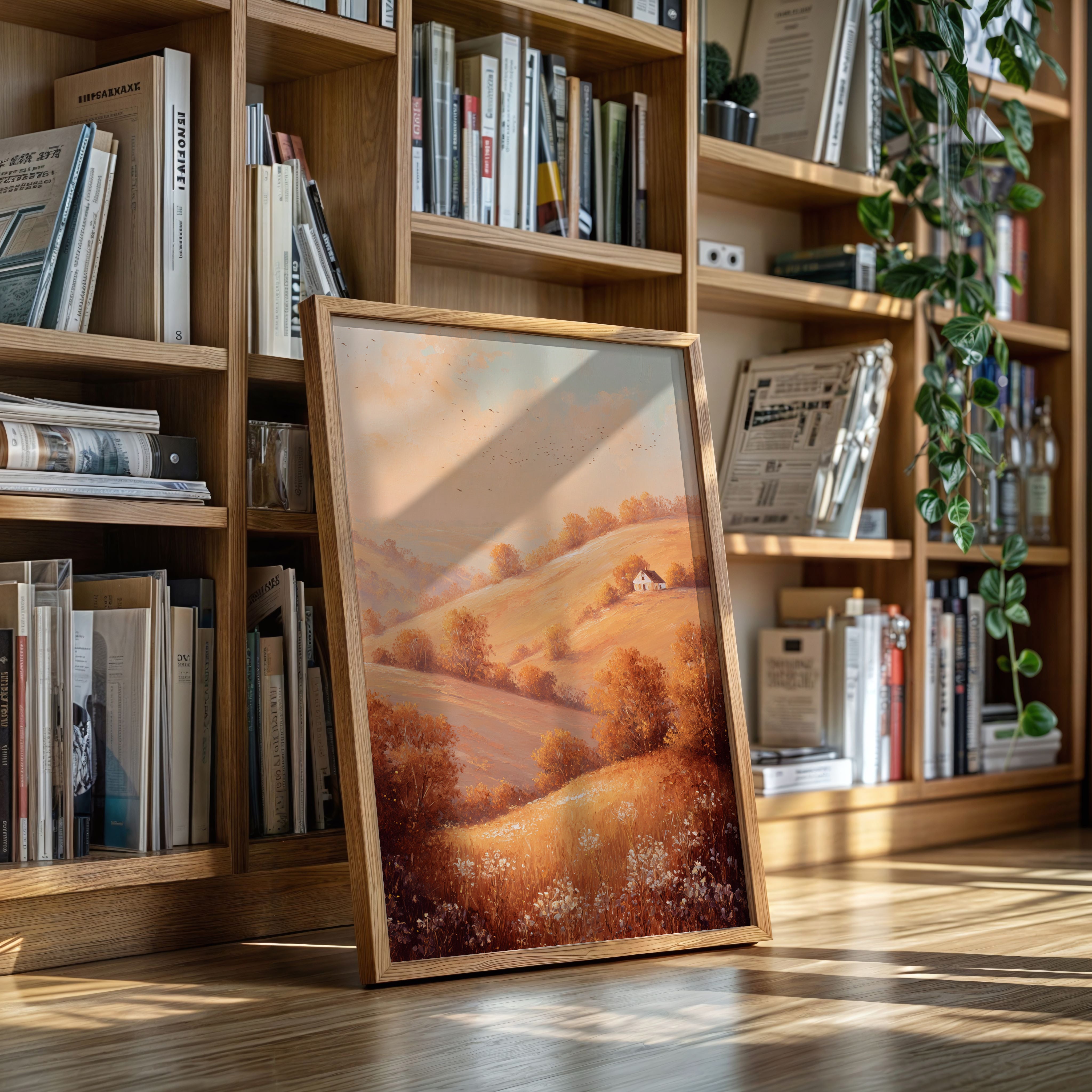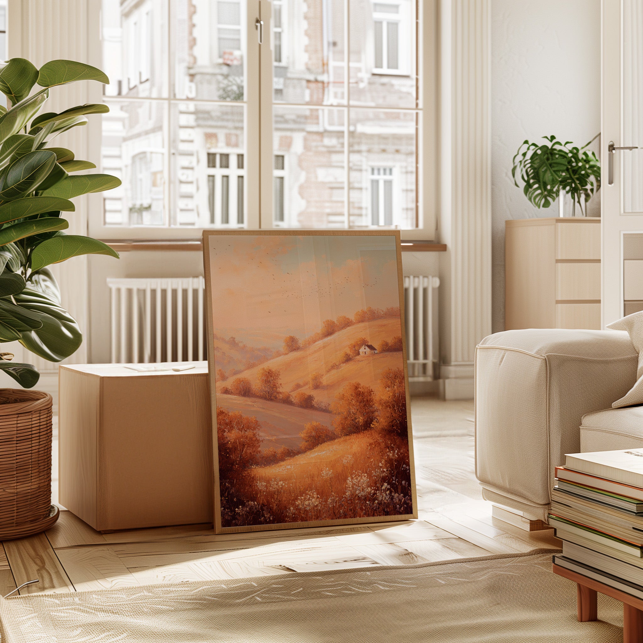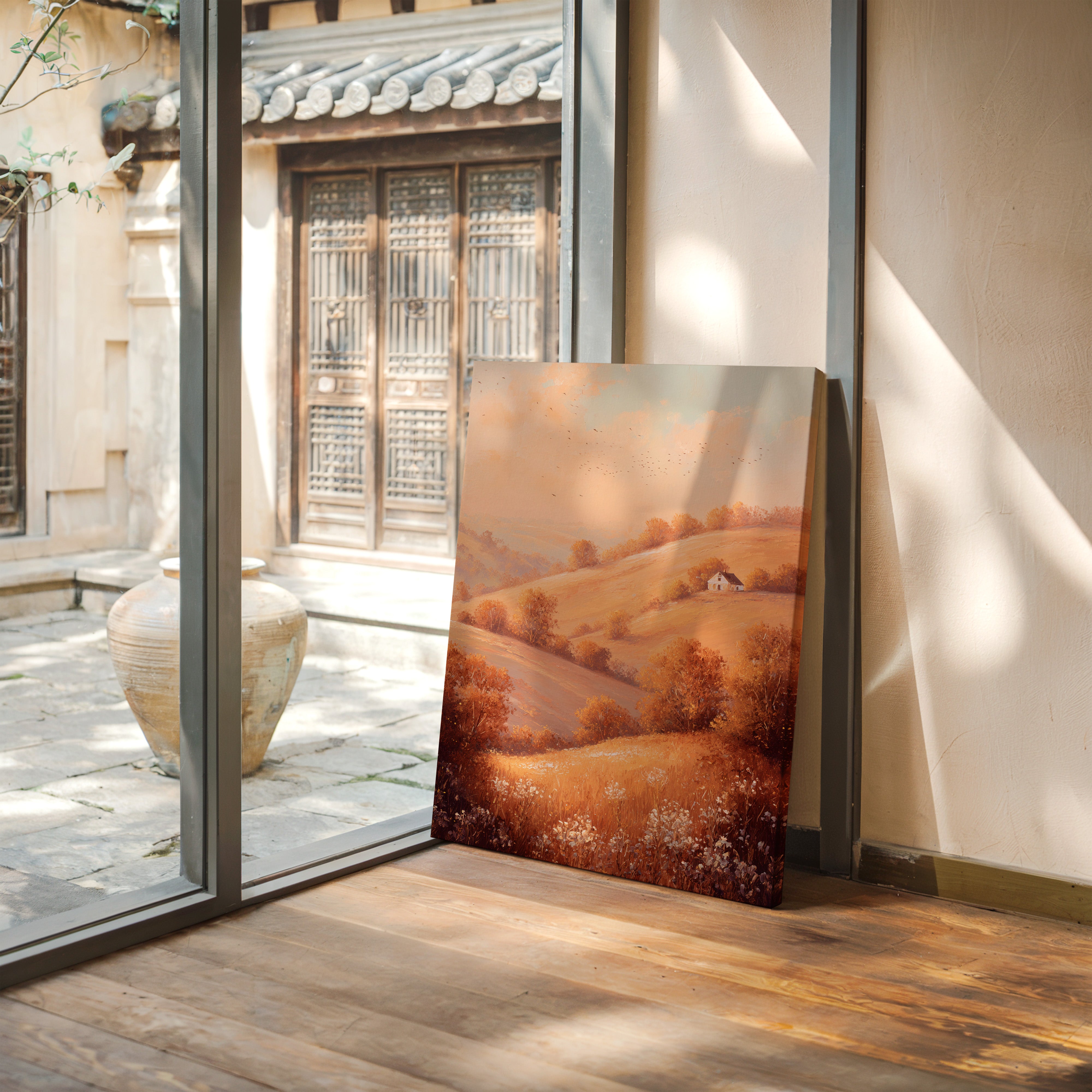 Bathed in honeyed light, rolling hills stretch toward a blushing horizon where birds trace paths across the coral sky. A solitary white cottage nestles into the curves of the landscape, surrounded by autumn-touched trees and wild grasses swaying in the afternoon breeze. The scene unfolds in layers of amber and rose, with delicate wildflowers dotting the foreground like scattered pearls across golden velvet. This tranquil countryside moment captures the essence of pastoral solitude and natural harmony. Perfect for creating a sense of peaceful escape in a living room or bringing warmth to a reading nook where one can dream of simpler times.