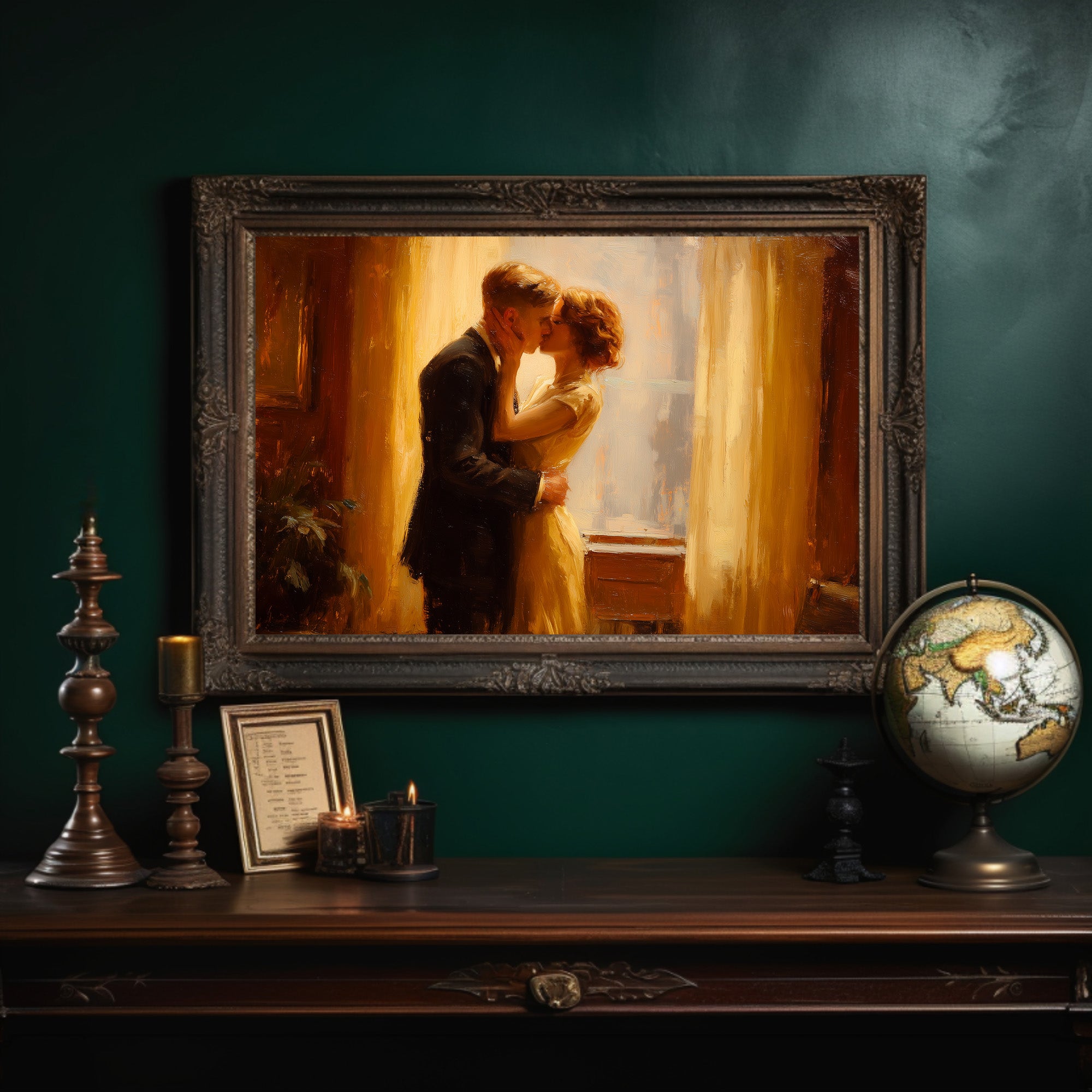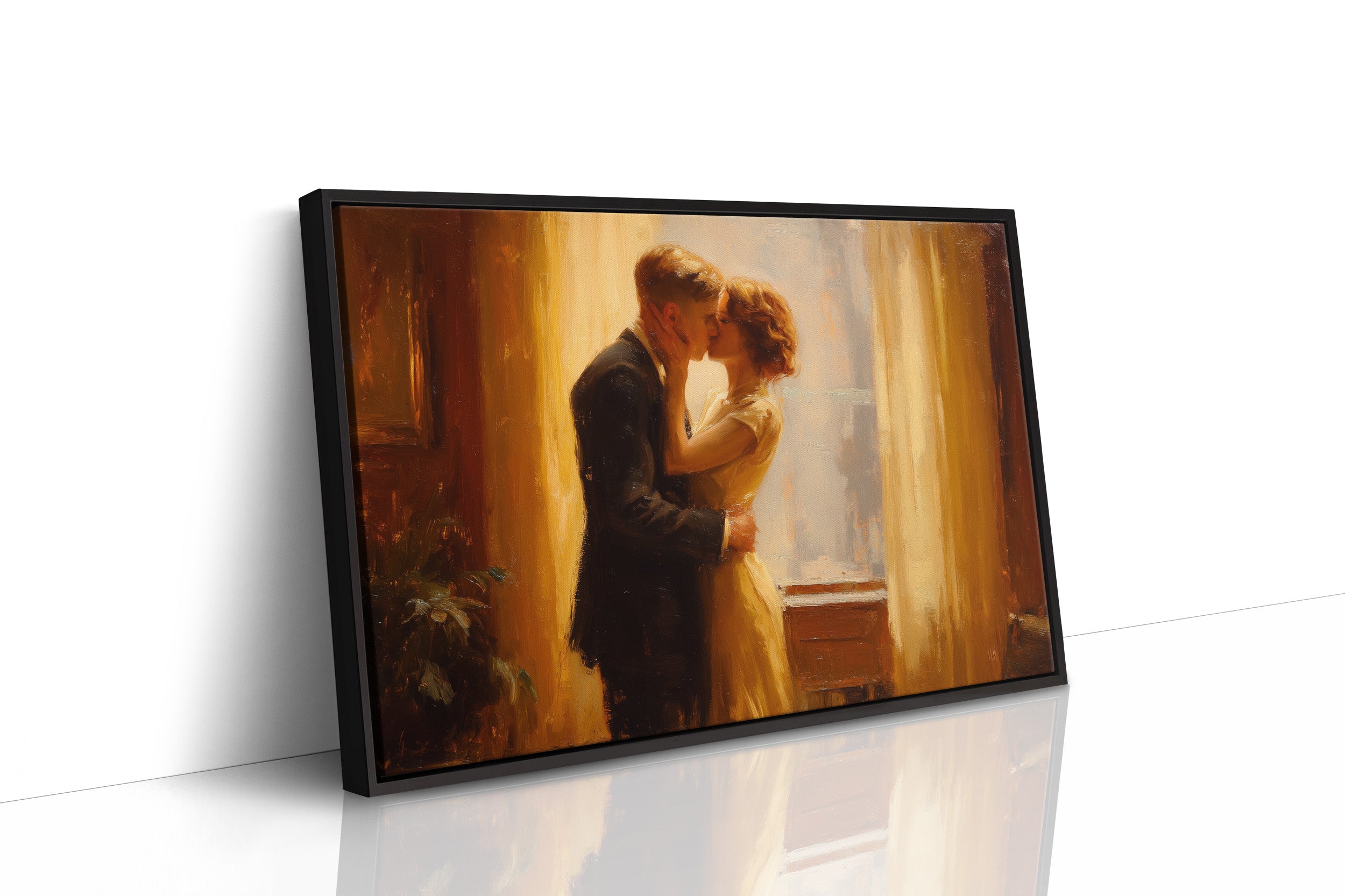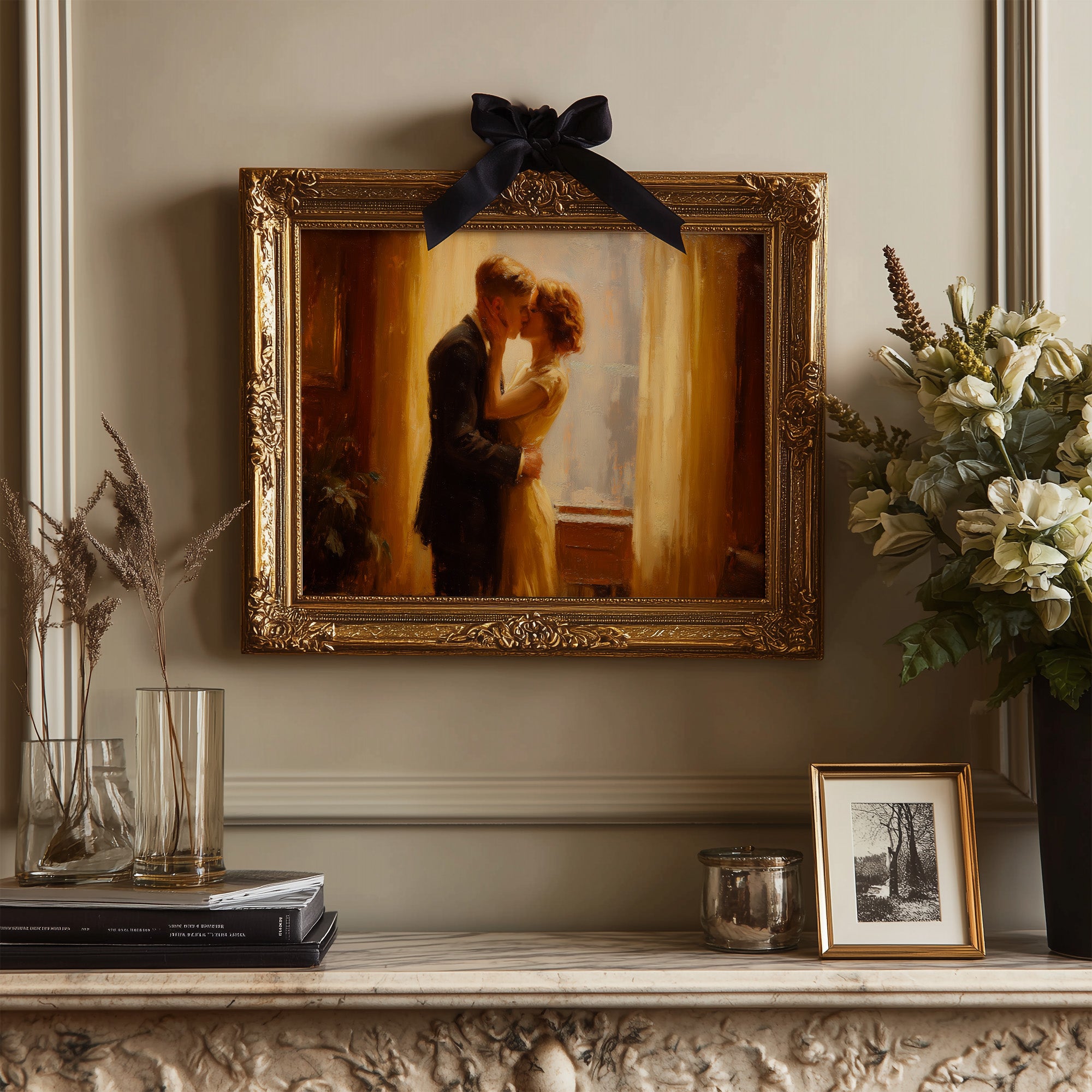 Warm amber light bathes the intimate moment, suspended in time against a backdrop of honeyed hues. The classic painting captures an eternal connection, framed in rich wood that echoes the depth of feeling within. Soft brushstrokes blend golden yellows with earthy browns, creating a sanctuary of emotion amid the glow of afternoon sun. This sophisticated piece brings romantic nostalgia to a home library, study, or reading nook, creating a contemplative focal point among cherished books.